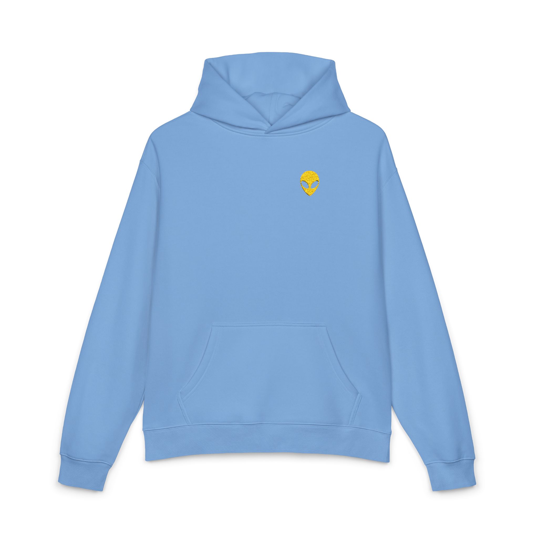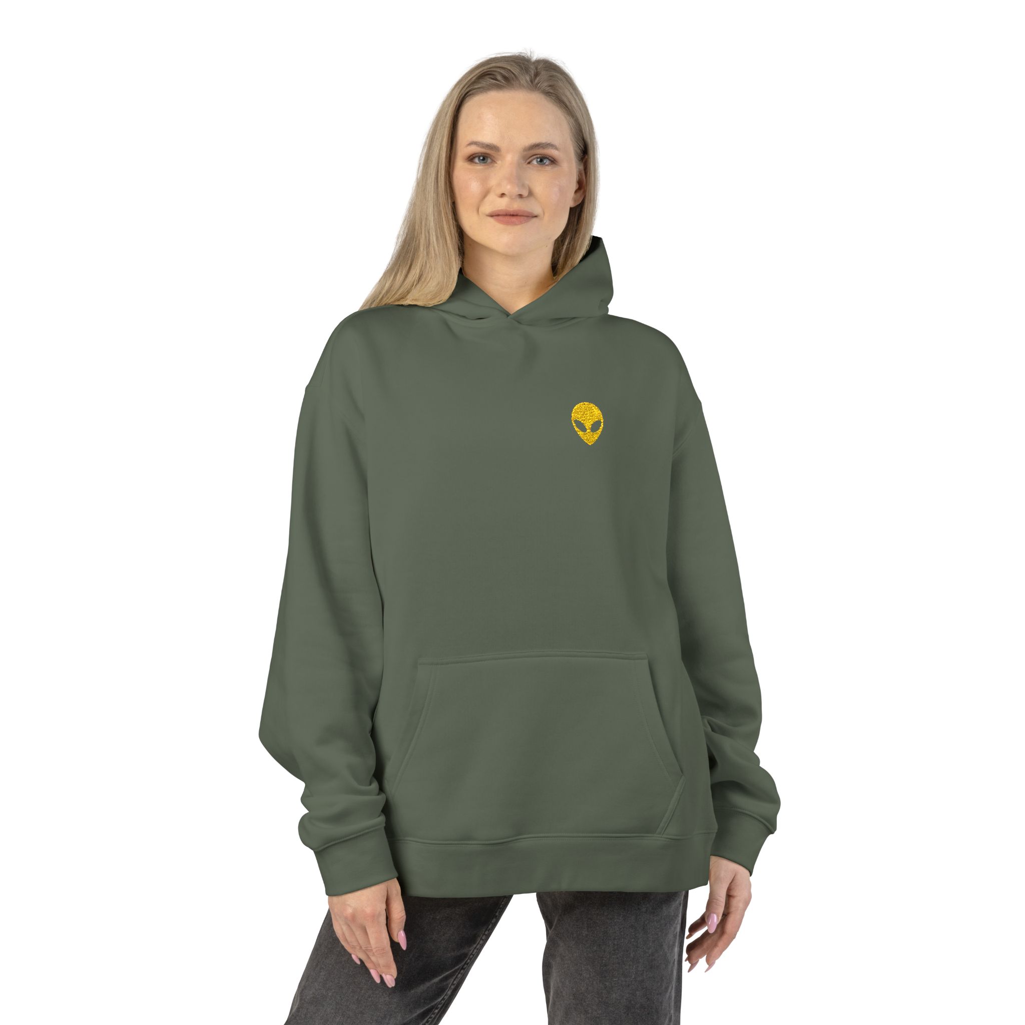 This relaxed hoodie wraps you in quiet confidence. The soft 80/20 cotton-poly blend and medium-heavy weight give it a lived-in warmth without feeling bulky. A small, bright alien motif on the chest adds a playful, slightly rebellious note—like a secret signal only your crew notices. Drop shoulders and a roomy kangaroo pocket make it effortless to layer and move in, whether you’re walking city streets after dark, sketching in a café, or camping under unfamiliar constellations. The muted brown canvas keeps the look grounded while that pop of yellow lifts it, making it easy to pair with worn denim or joggers for slow, deliberate days.