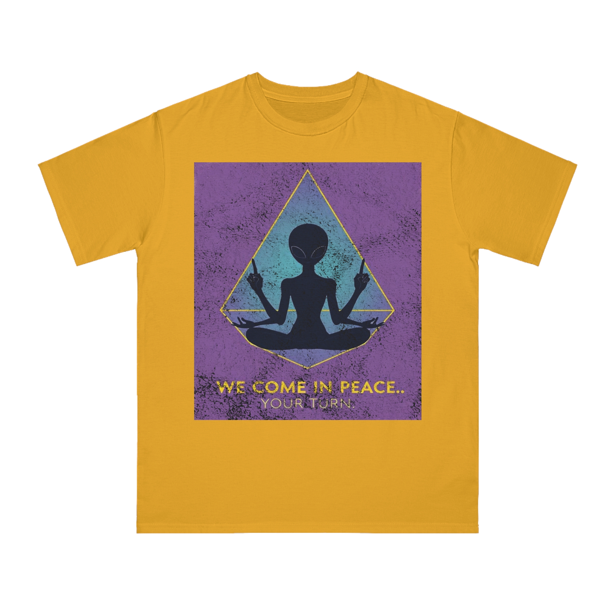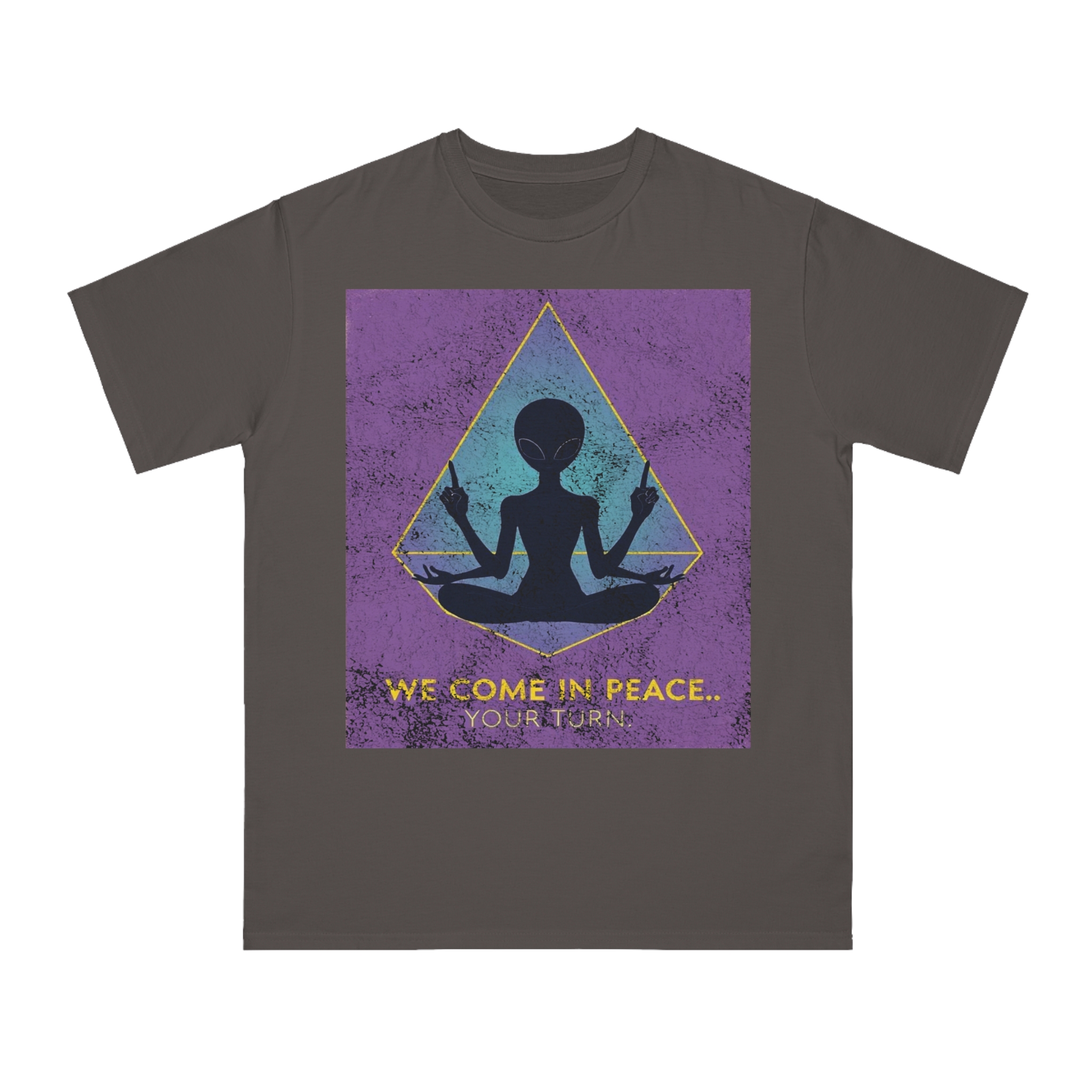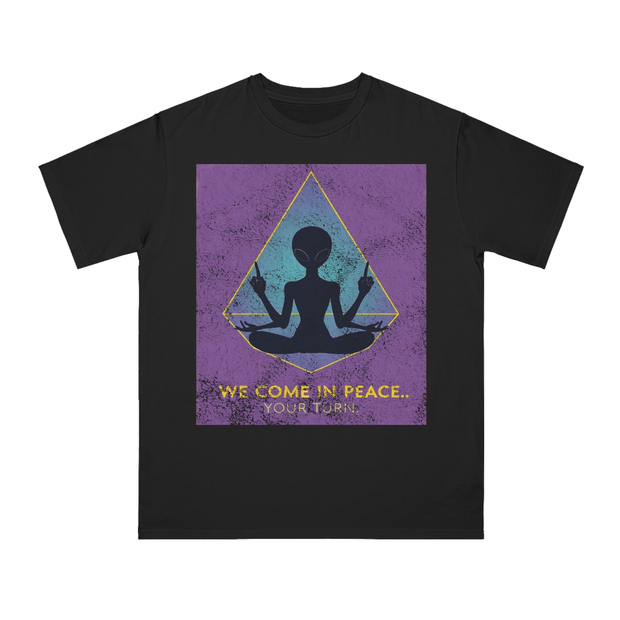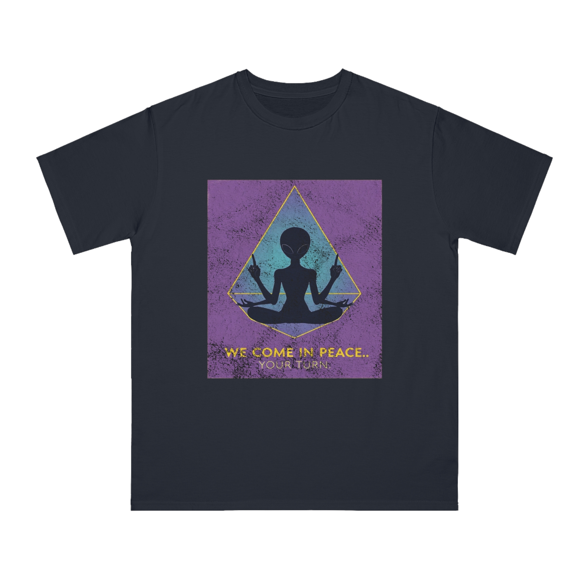This striking graphic depicts a stylized alien figure in a meditative yoga pose, seated within a geometric yellow-lined triangle against a purple and blue textured background. The alien, rendered in deep navy blue, has the classic large-eyed silhouette and is positioned in a lotus meditation posture with hands in various symbolic gestures. The image has a vintage, slightly distressed poster aesthetic with a grungy, textured overlay that gives it an artistic screenprint quality. Below the image, text reads “WE COME IN PEACE…” followed by “YOUR TURN” in yellow distressed lettering, suggesting a humorous and ironic twist on the classic alien encounter narrative. The design blends science fiction imagery with spiritual meditation symbolism, creating a unique and thought-provoking visual that plays with themes of extraterrestrial contact and inner peace.