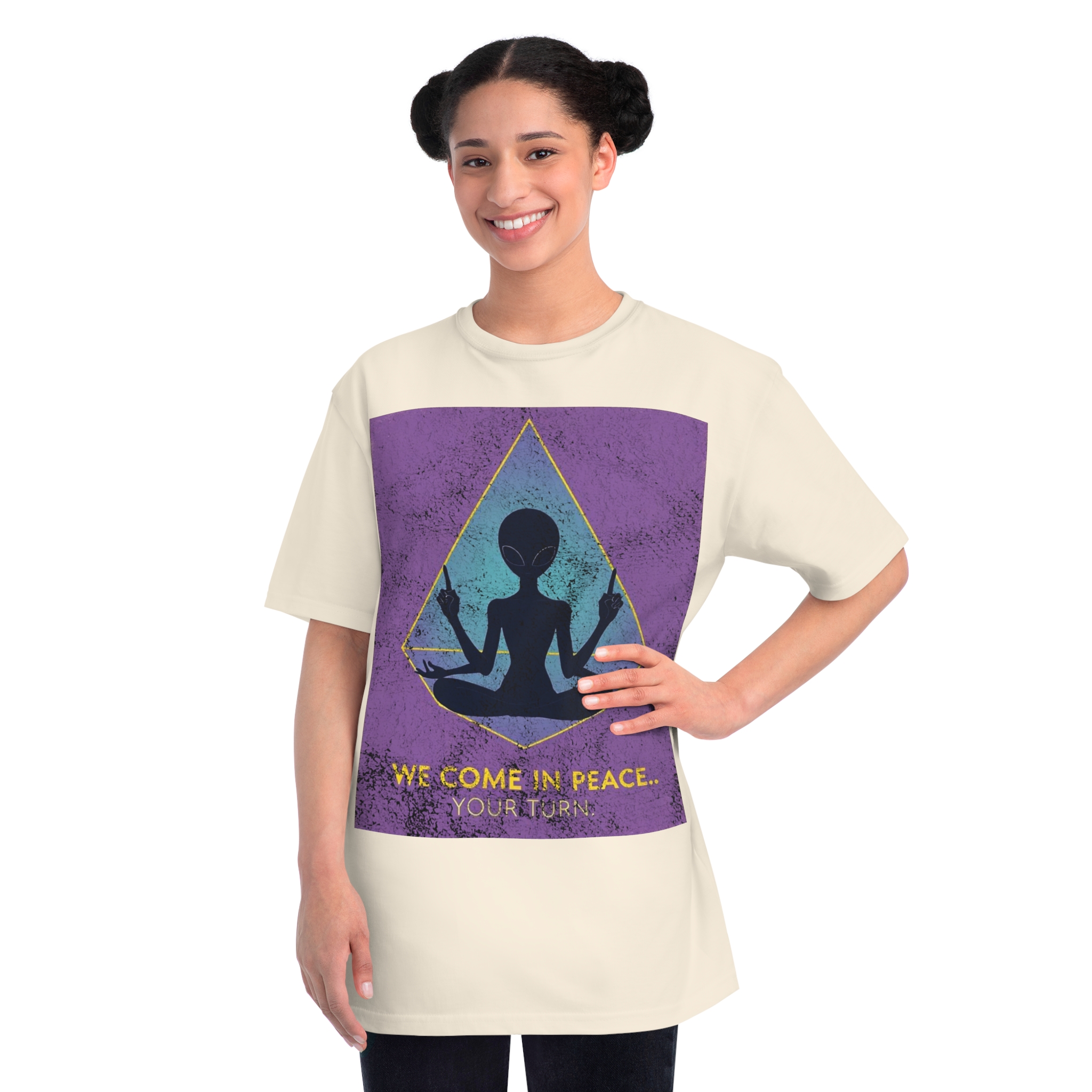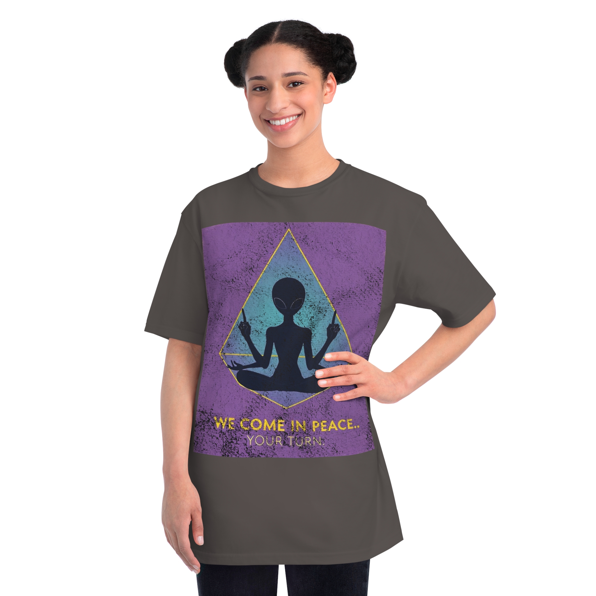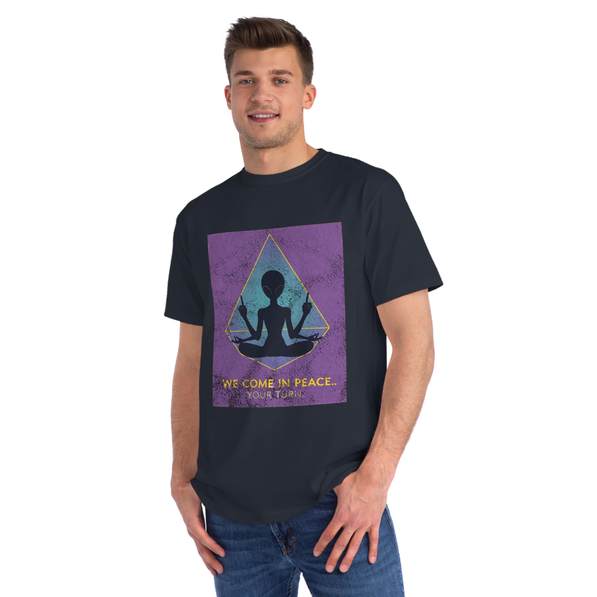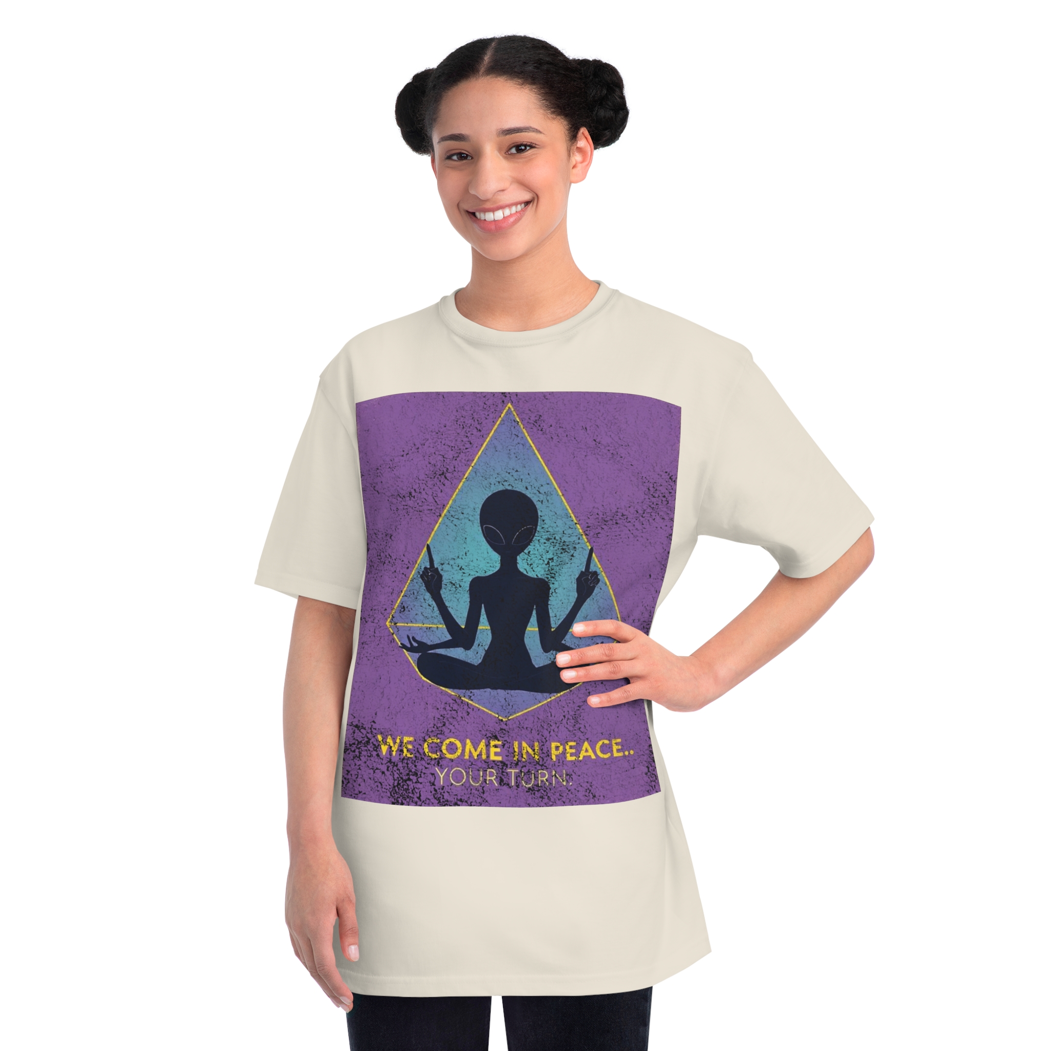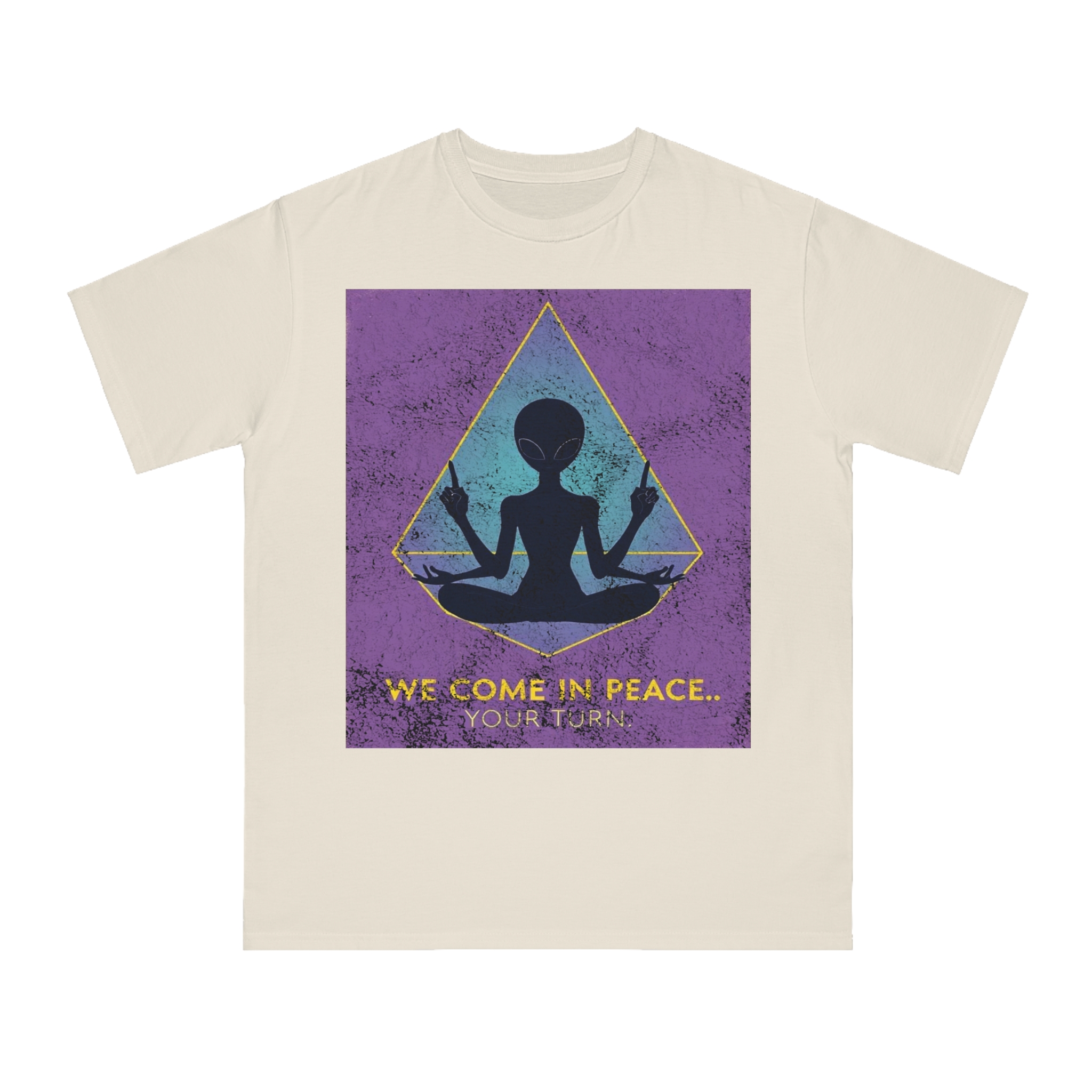 This striking graphic depicts a stylized alien figure in a meditative yoga pose, seated within a geometric yellow-lined triangle against a purple and blue textured background. The alien, rendered in deep navy blue, has the classic large-eyed silhouette and is positioned in a lotus meditation posture with hands in various symbolic gestures. The image has a vintage, slightly distressed poster aesthetic with a grungy, textured overlay that gives it an artistic screenprint quality. Below the image, text reads “WE COME IN PEACE…” followed by “YOUR TURN” in yellow distressed lettering, suggesting a humorous and ironic twist on the classic alien encounter narrative. The design blends science fiction imagery with spiritual meditation symbolism, creating a unique and thought-provoking visual that plays with themes of extraterrestrial contact and inner peace.