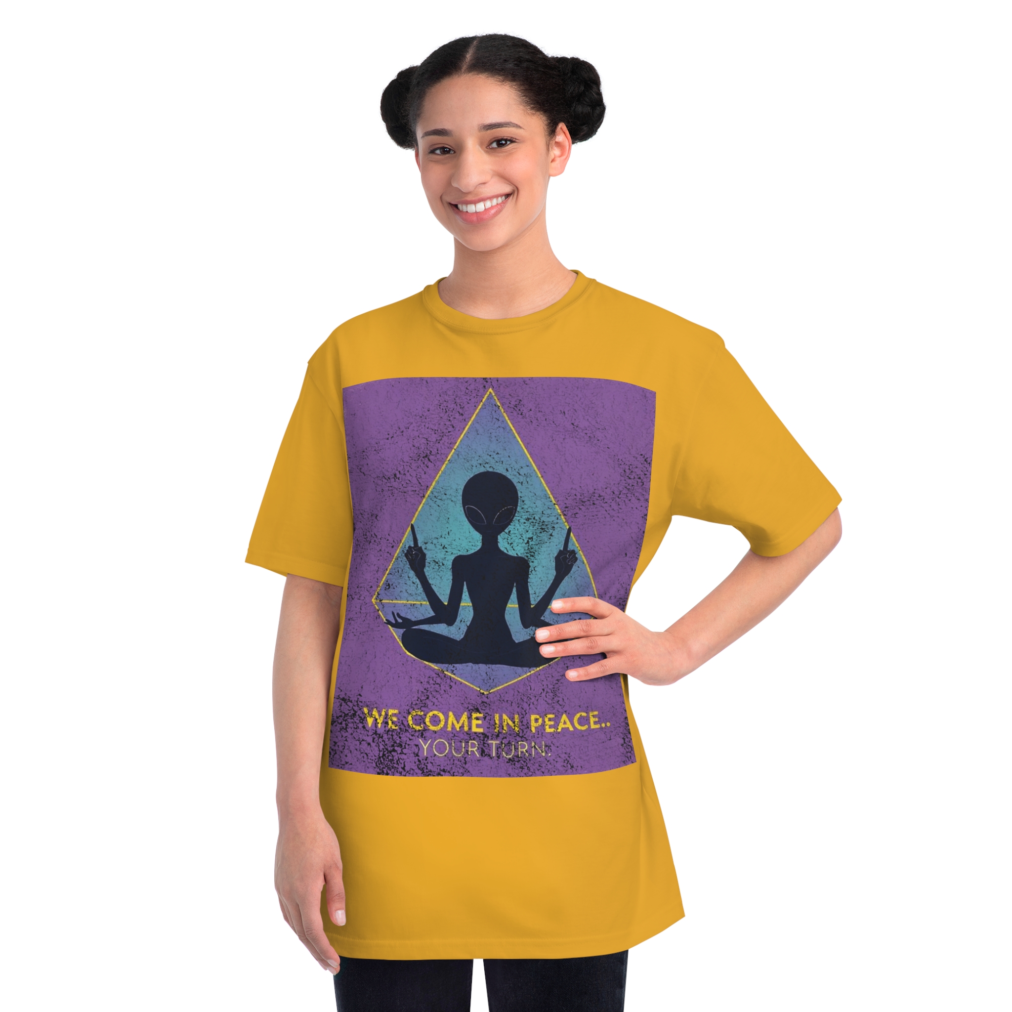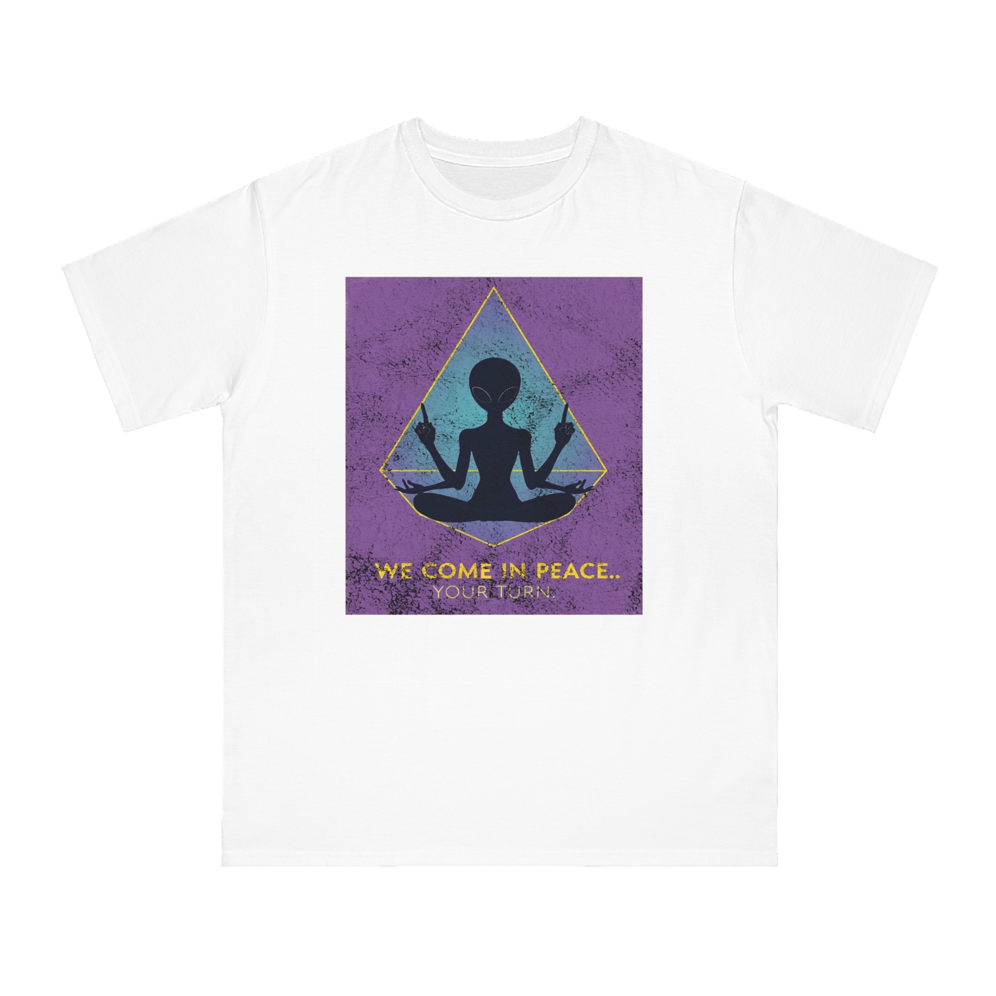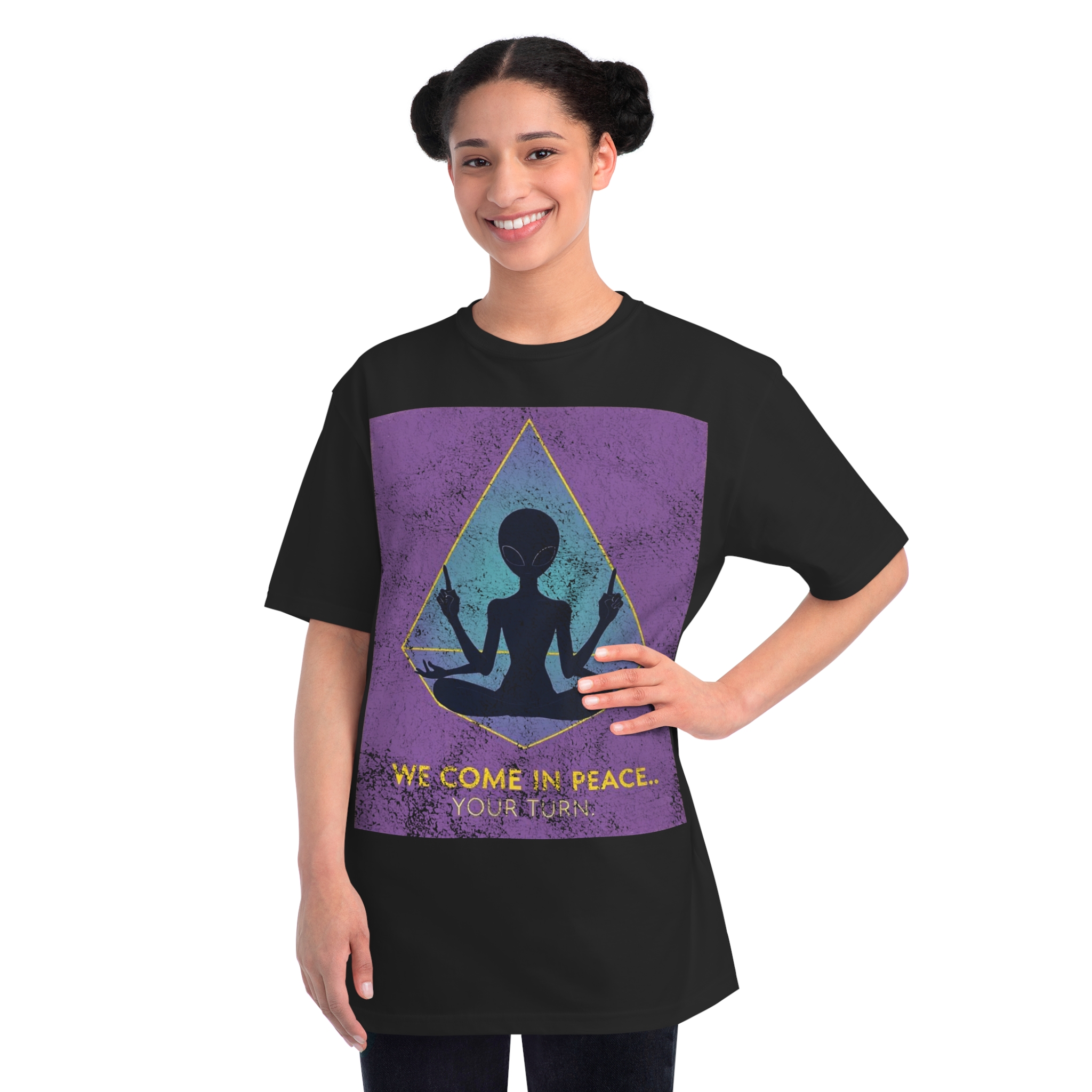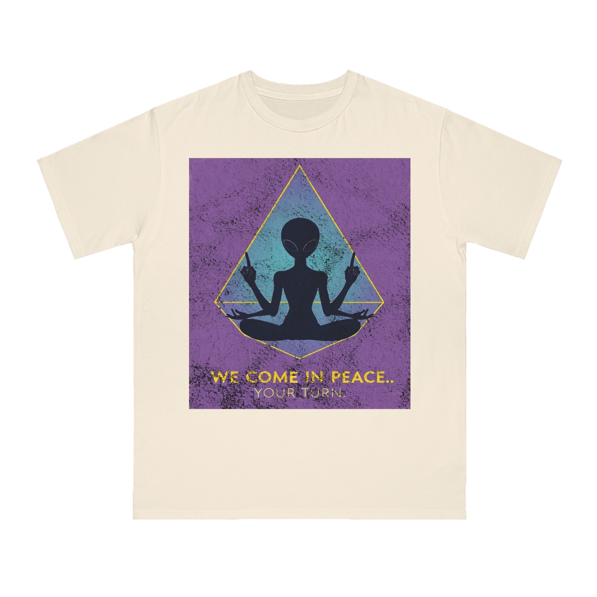 This striking graphic depicts a stylized alien figure in a meditative yoga pose, seated within a geometric yellow-lined triangle against a purple and blue textured background. The alien, rendered in deep navy blue, has the classic large-eyed silhouette and is positioned in a lotus meditation posture with hands in various symbolic gestures. The image has a vintage, slightly distressed poster aesthetic with a grungy, textured overlay that gives it an artistic screenprint quality. Below the image, text reads “WE COME IN PEACE…” followed by “YOUR TURN” in yellow distressed lettering, suggesting a humorous and ironic twist on the classic alien encounter narrative. The design blends science fiction imagery with spiritual meditation symbolism, creating a unique and thought-provoking visual that plays with themes of extraterrestrial contact and inner peace.