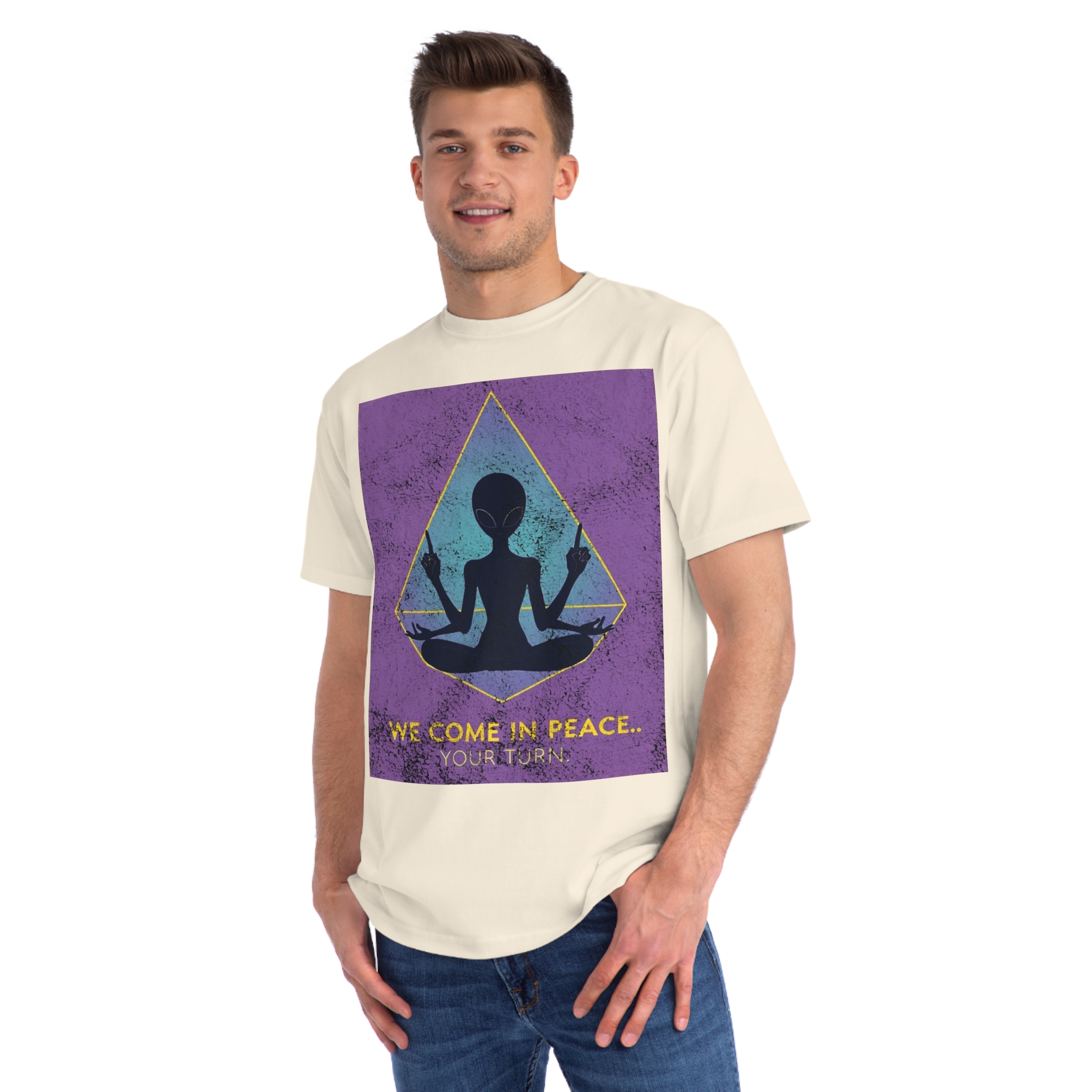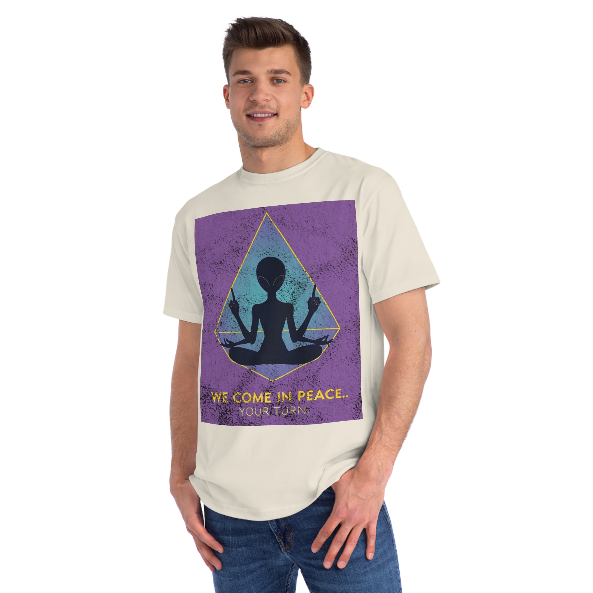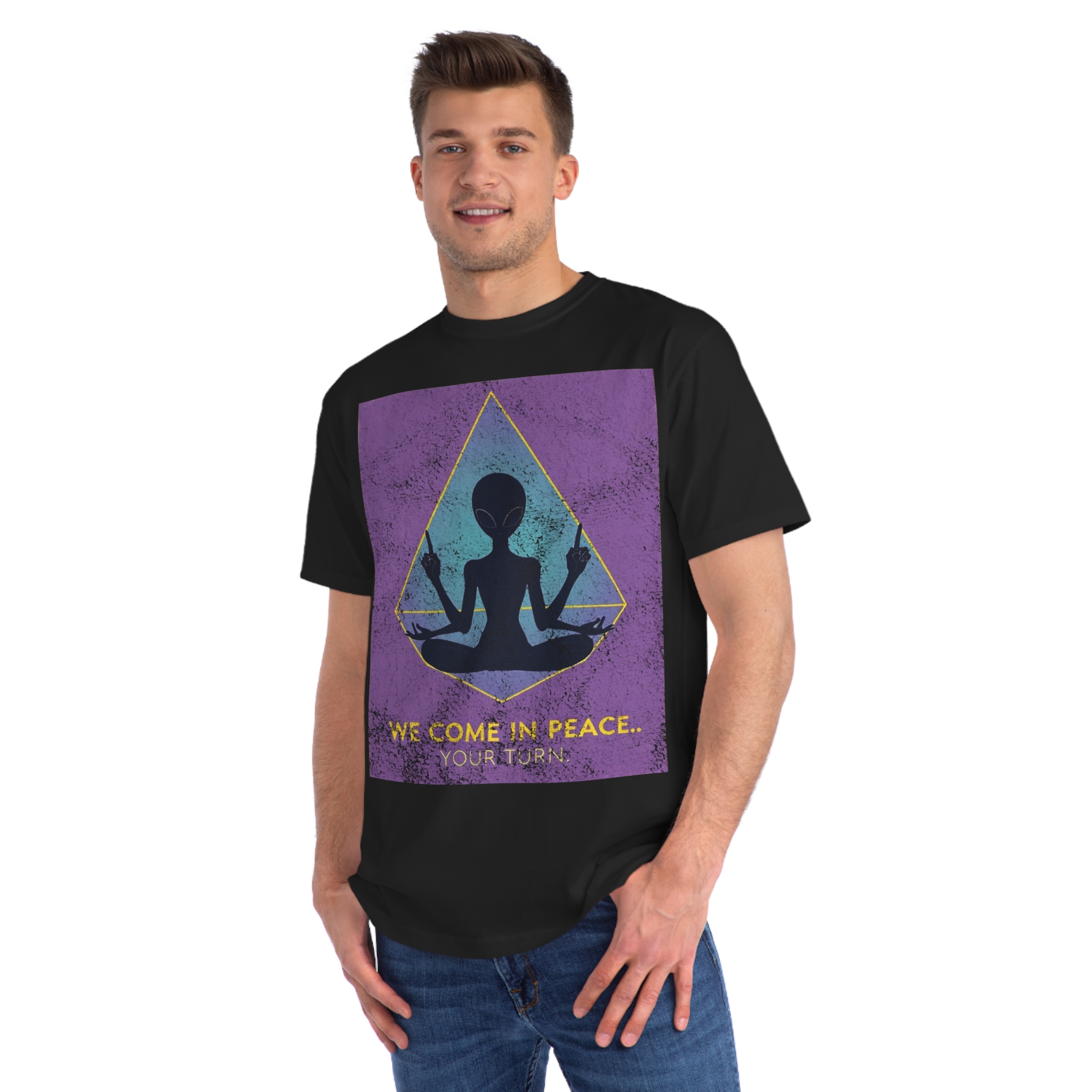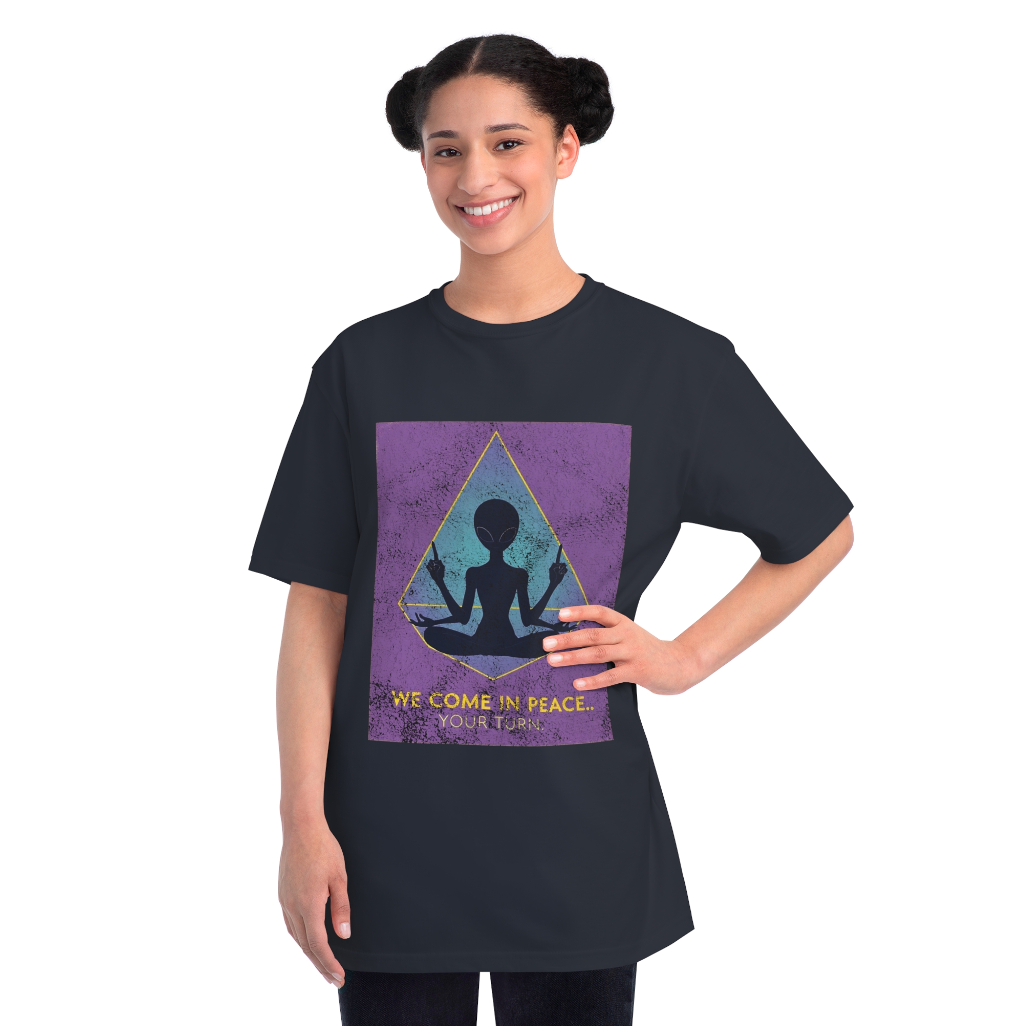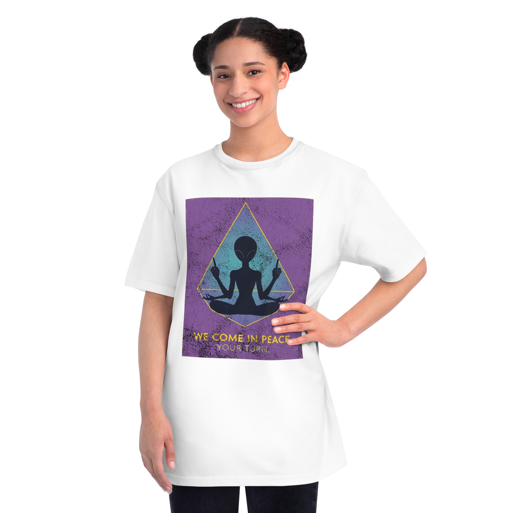 This striking graphic depicts a stylized alien figure in a meditative yoga pose, seated within a geometric yellow-lined triangle against a purple and blue textured background. The alien, rendered in deep navy blue, has the classic large-eyed silhouette and is positioned in a lotus meditation posture with hands in various symbolic gestures. The image has a vintage, slightly distressed poster aesthetic with a grungy, textured overlay that gives it an artistic screenprint quality. Below the image, text reads “WE COME IN PEACE…” followed by “YOUR TURN” in yellow distressed lettering, suggesting a humorous and ironic twist on the classic alien encounter narrative. The design blends science fiction imagery with spiritual meditation symbolism, creating a unique and thought-provoking visual that plays with themes of extraterrestrial contact and inner peace.
