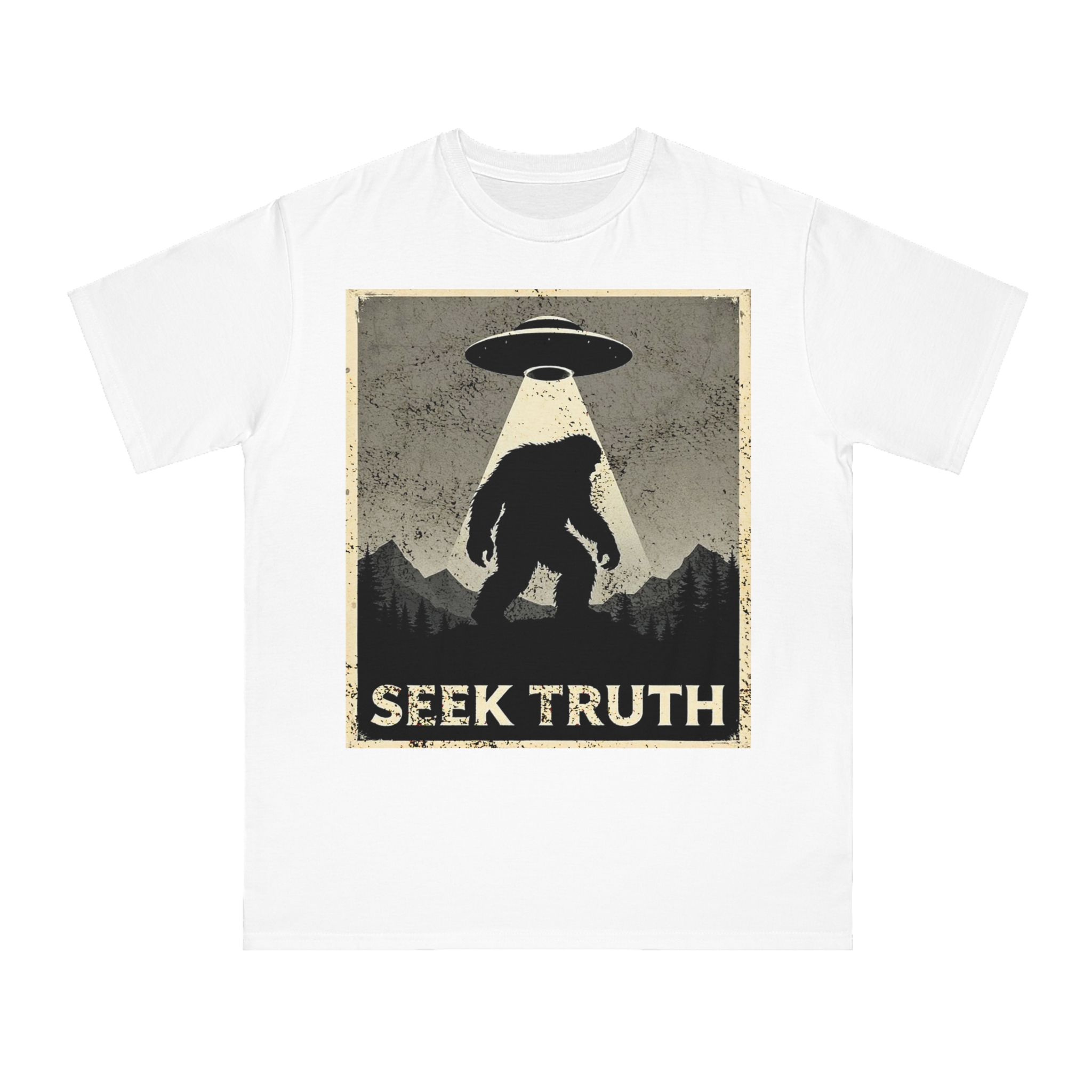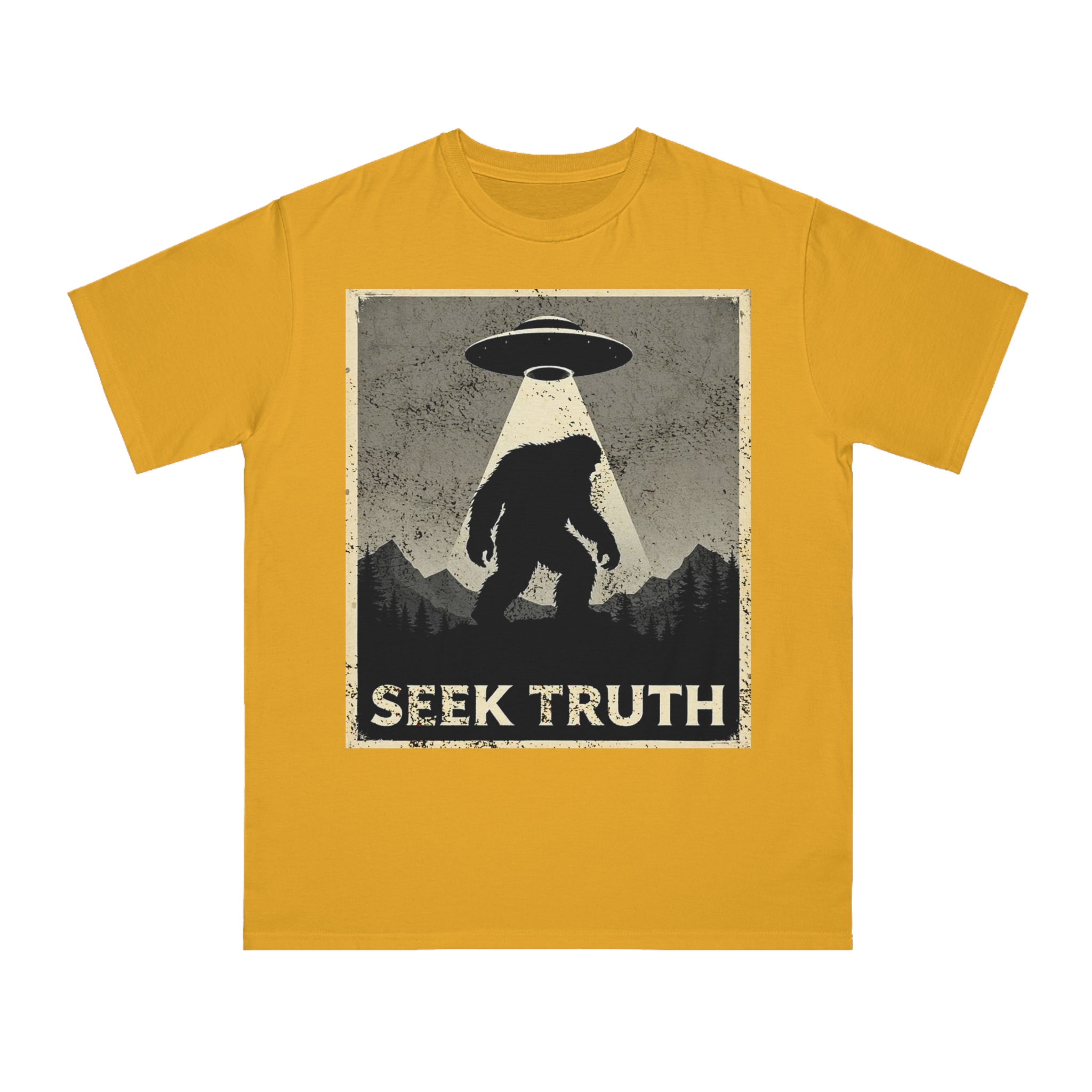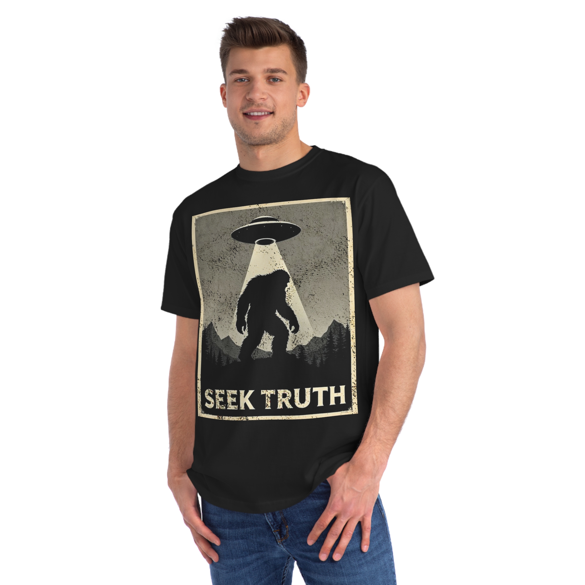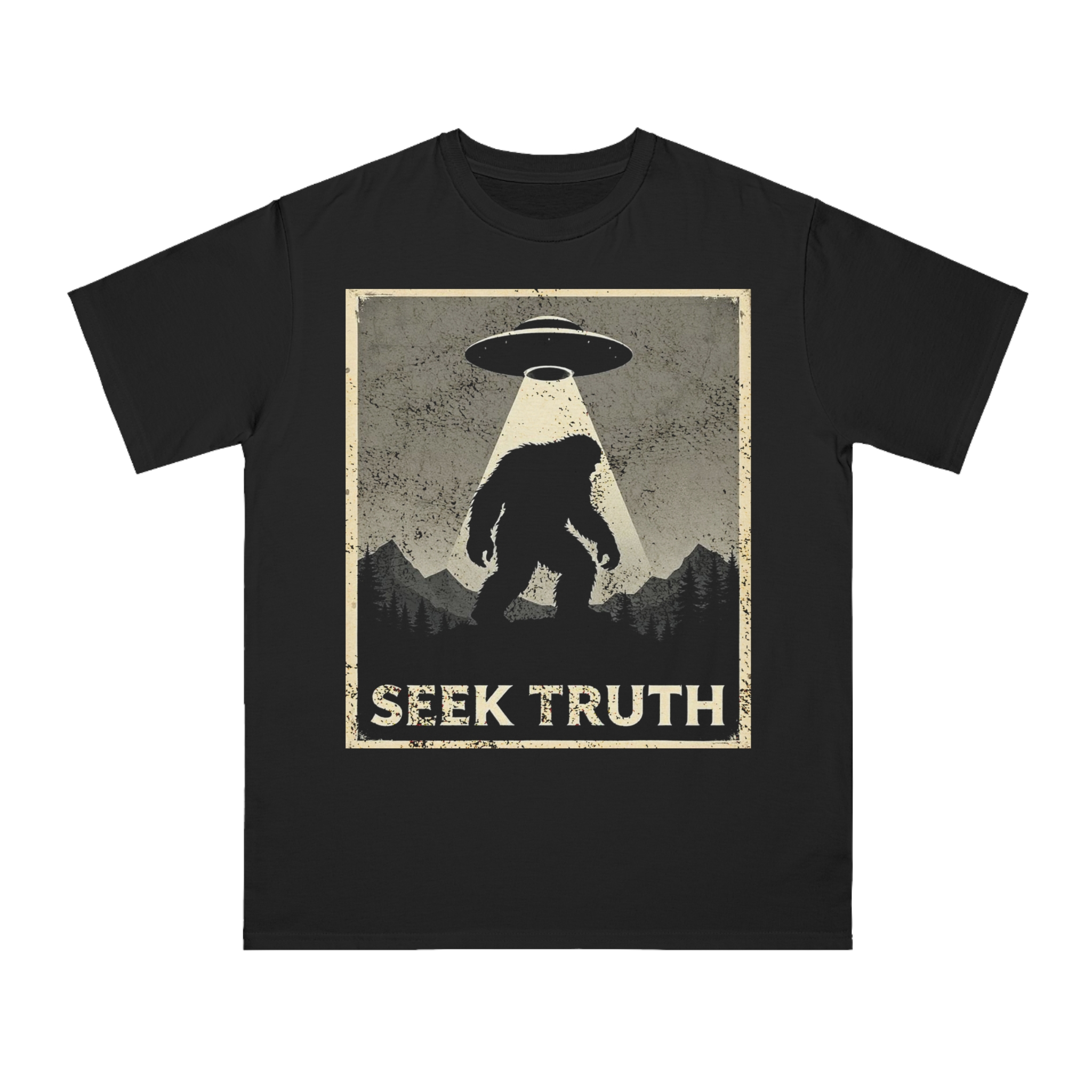 This vintage-style graphic depicts a mysterious silhouette of a large, furry creature reminiscent of Bigfoot standing beneath a UFO in a mountainous forest landscape. The image is rendered in a monochromatic grayscale palette with a textured, weathered appearance that evokes an old poster or newspaper print. A classic flying saucer hovers above the creature, projecting a bright beam of light downward, creating a dramatic and enigmatic scene. The foreground features a silhouetted forest of pine trees and mountain peaks, while the background has a gritty, distressed texture that adds to the vintage aesthetic. At the bottom of the image, the words “SEEK TRUTH” are prominently displayed in bold, worn lettering, suggesting a call to investigate unexplained phenomena and uncover hidden mysteries.