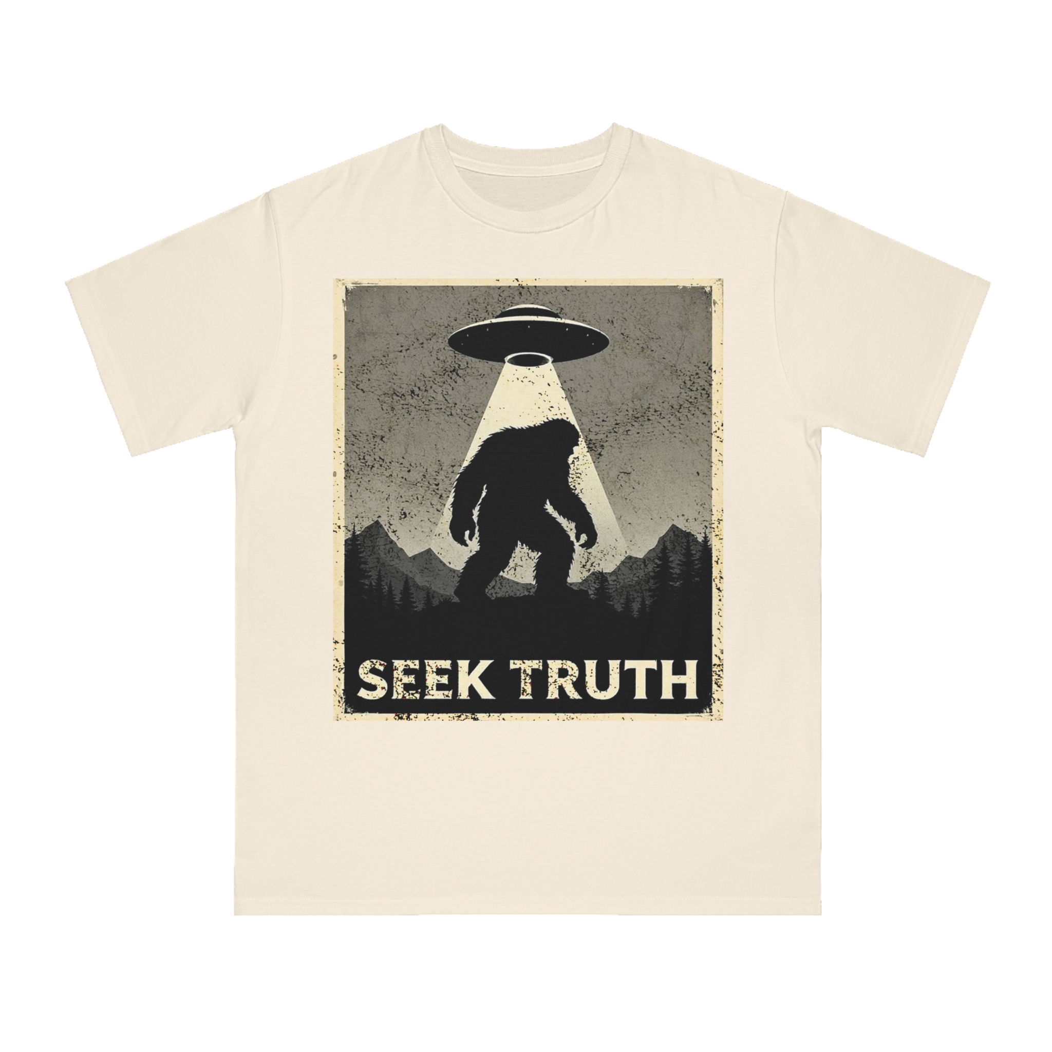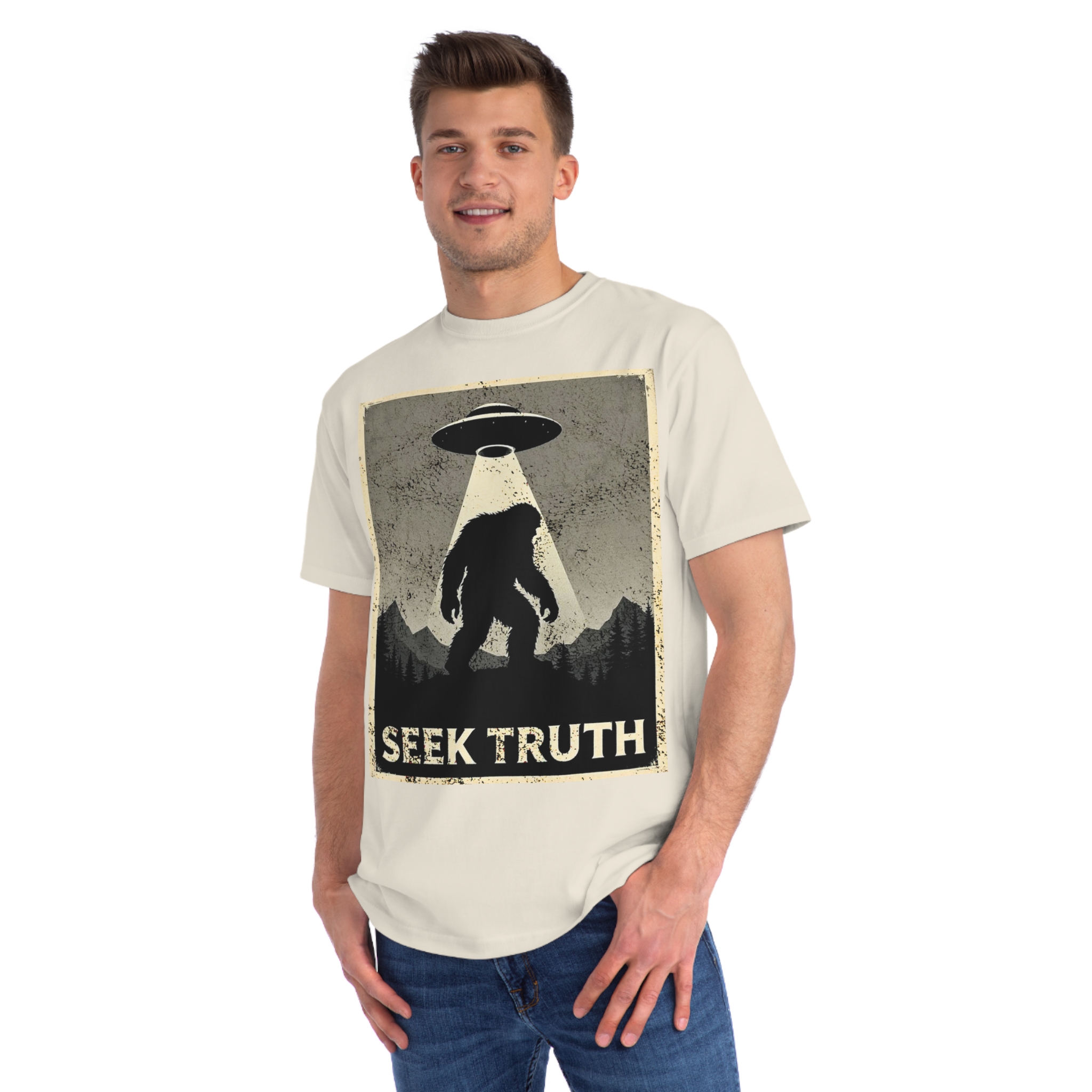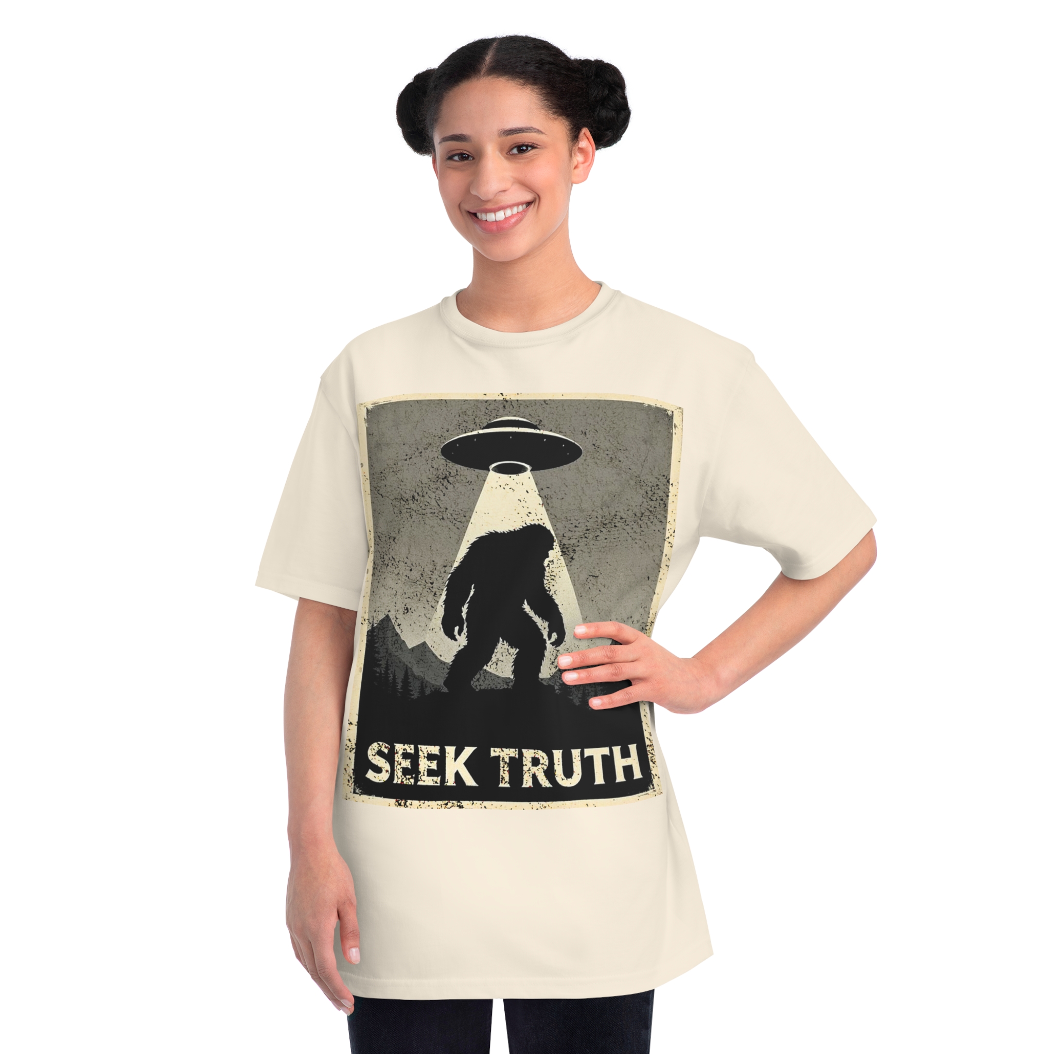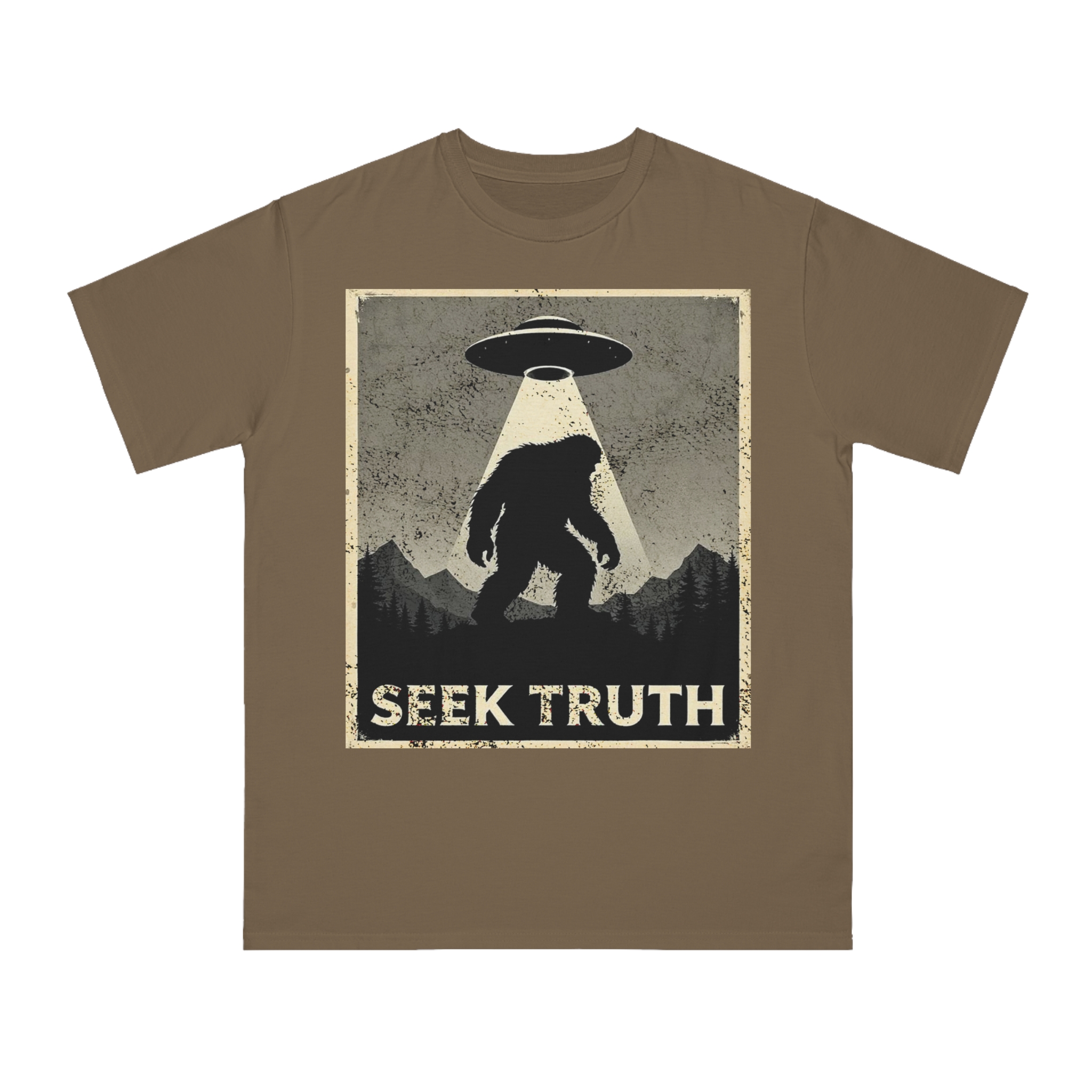 This vintage-style graphic depicts a mysterious silhouette of a large, furry creature reminiscent of Bigfoot standing beneath a UFO in a mountainous forest landscape. The image is rendered in a monochromatic grayscale palette with a textured, weathered appearance that evokes an old poster or newspaper print. A classic flying saucer hovers above the creature, projecting a bright beam of light downward, creating a dramatic and enigmatic scene. The foreground features a silhouetted forest of pine trees and mountain peaks, while the background has a gritty, distressed texture that adds to the vintage aesthetic. At the bottom of the image, the words “SEEK TRUTH” are prominently displayed in bold, worn lettering, suggesting a call to investigate unexplained phenomena and uncover hidden mysteries.