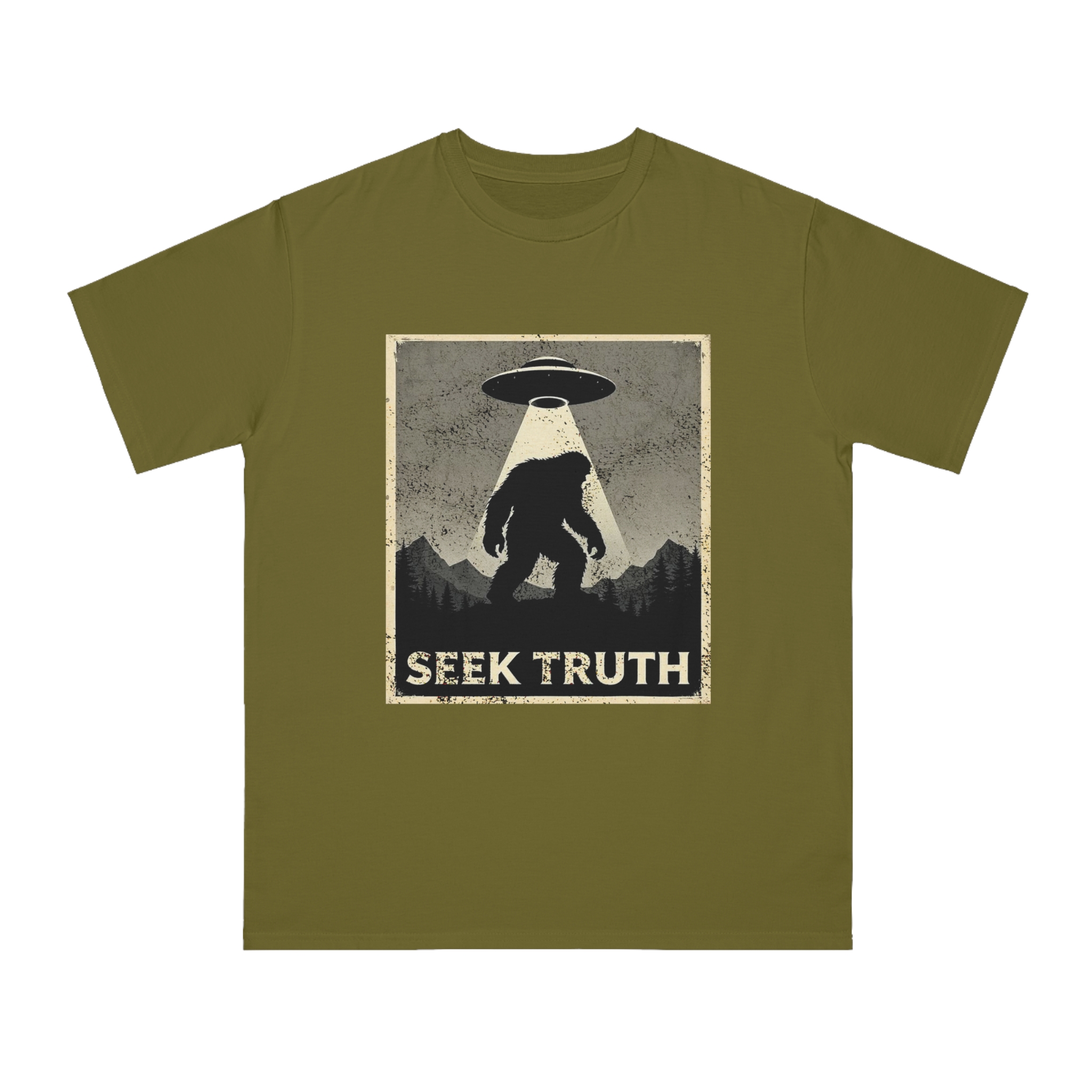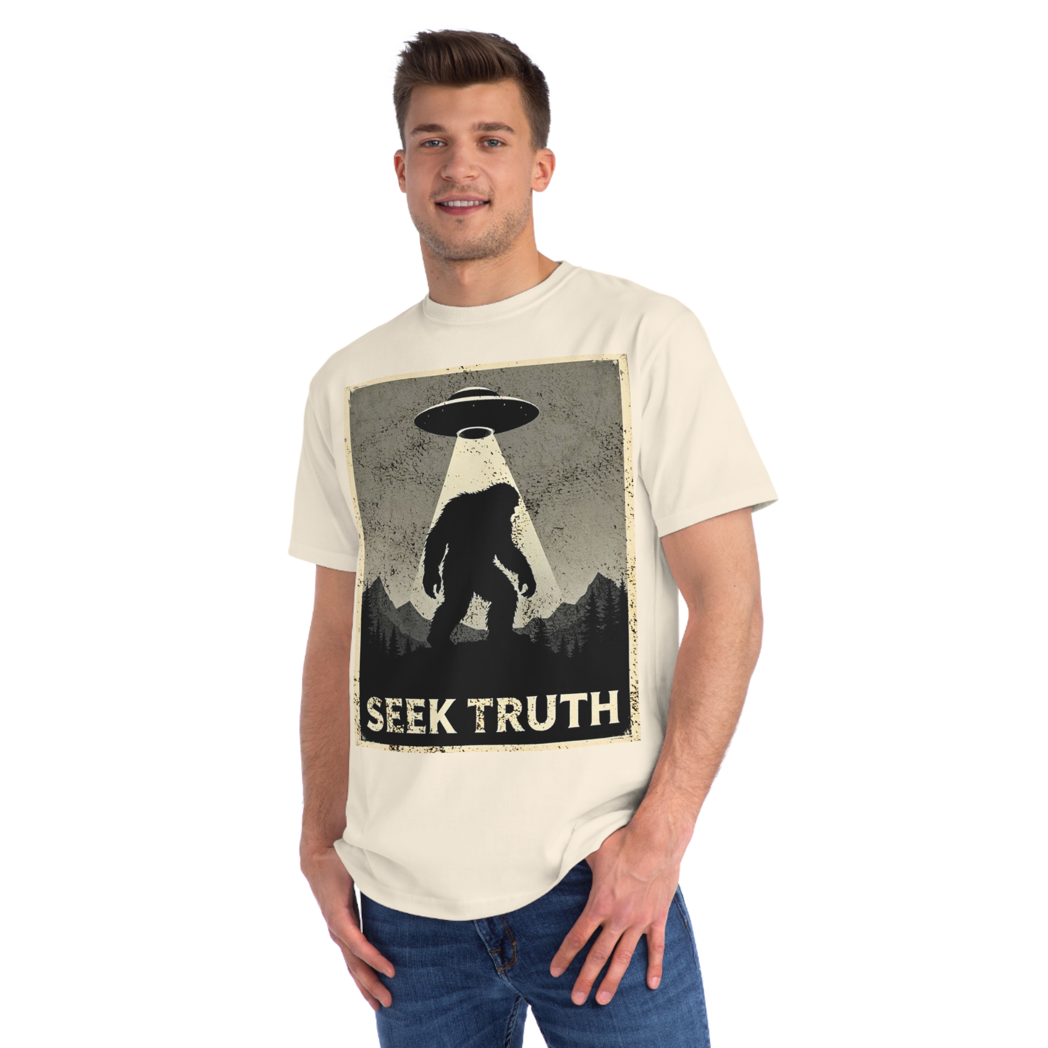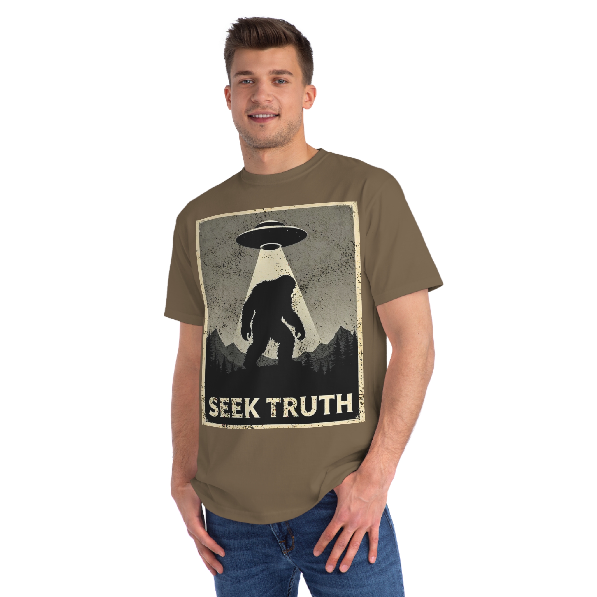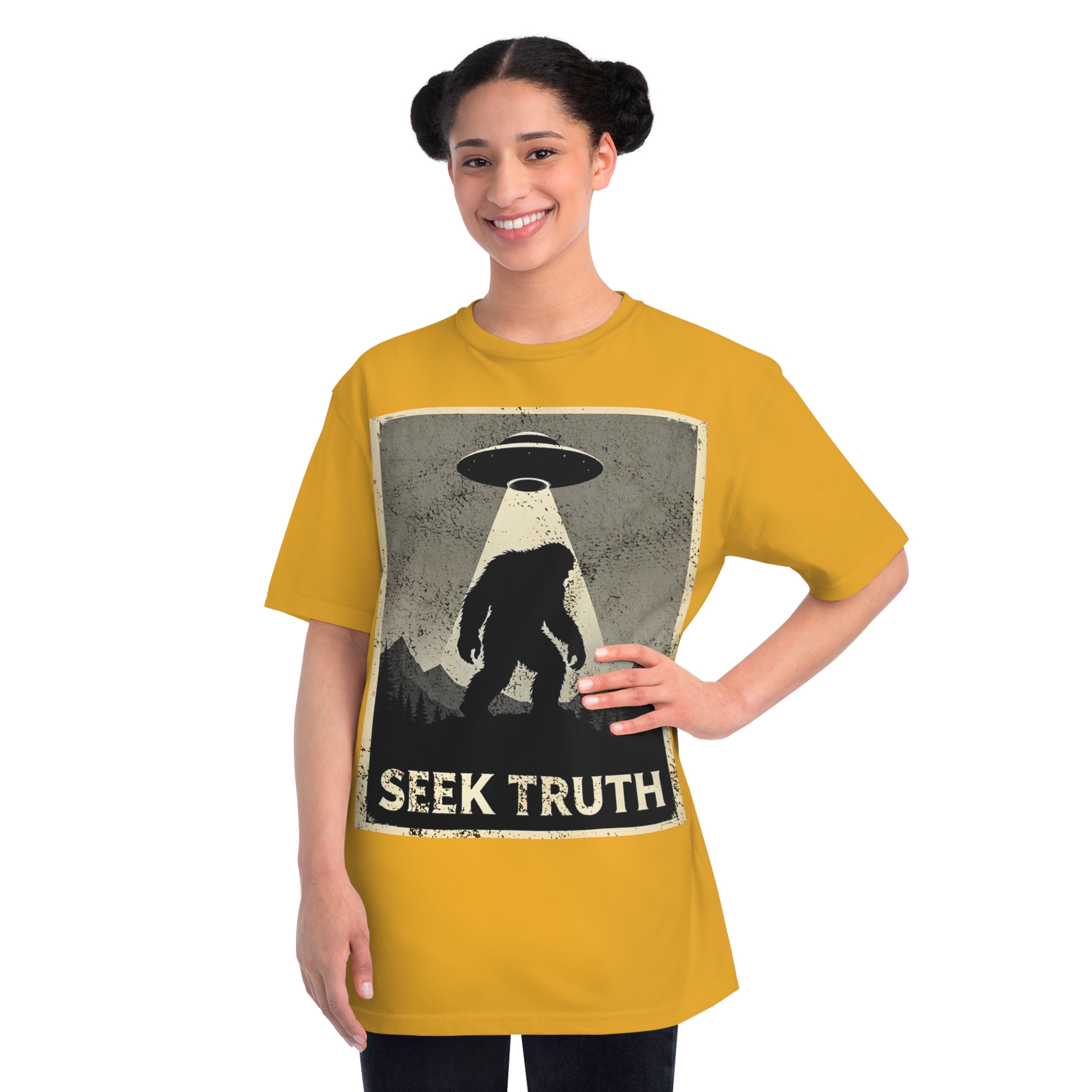 This vintage-style graphic depicts a mysterious silhouette of a large, furry creature reminiscent of Bigfoot standing beneath a UFO in a mountainous forest landscape. The image is rendered in a monochromatic grayscale palette with a textured, weathered appearance that evokes an old poster or newspaper print. A classic flying saucer hovers above the creature, projecting a bright beam of light downward, creating a dramatic and enigmatic scene. The foreground features a silhouetted forest of pine trees and mountain peaks, while the background has a gritty, distressed texture that adds to the vintage aesthetic. At the bottom of the image, the words “SEEK TRUTH” are prominently displayed in bold, worn lettering, suggesting a call to investigate unexplained phenomena and uncover hidden mysteries.