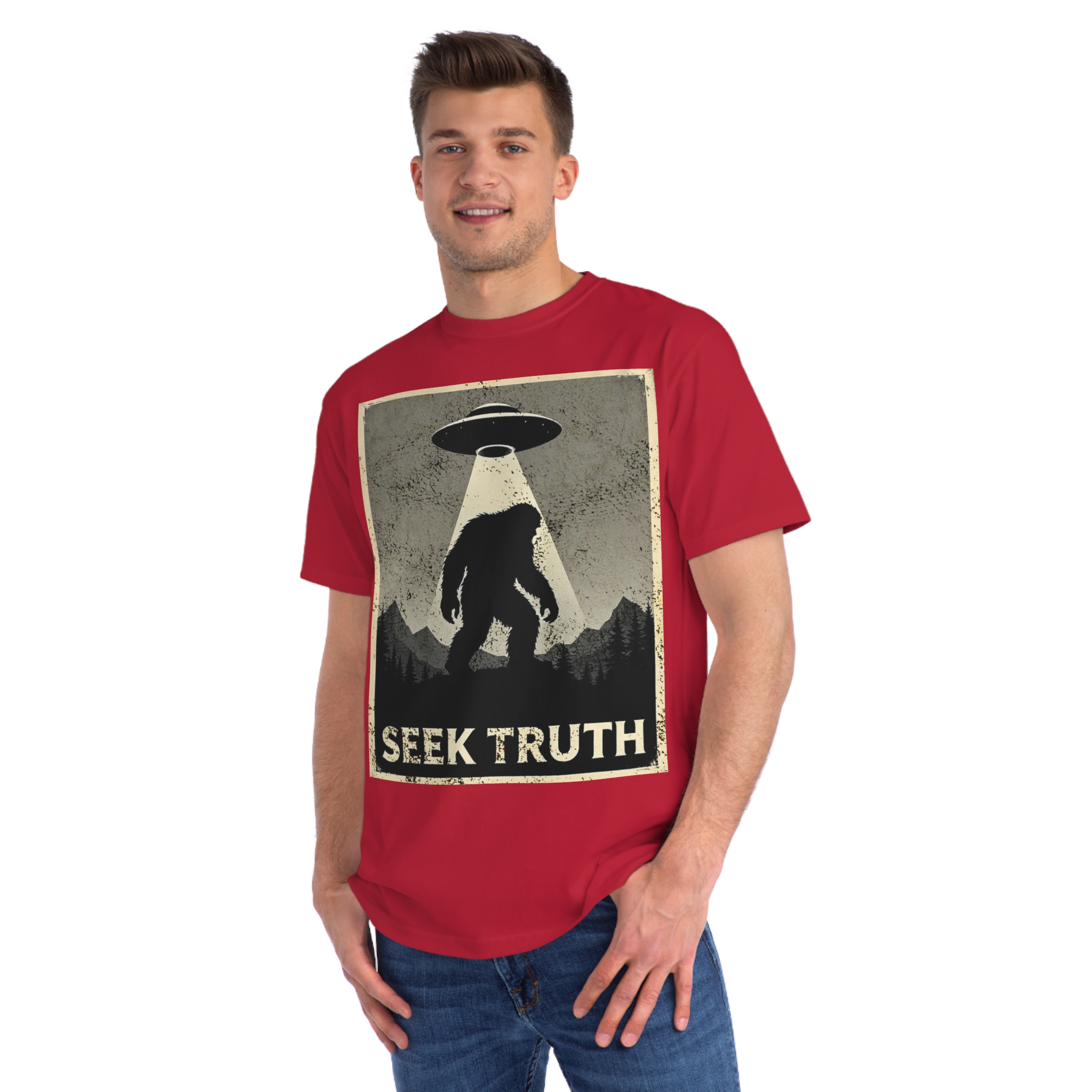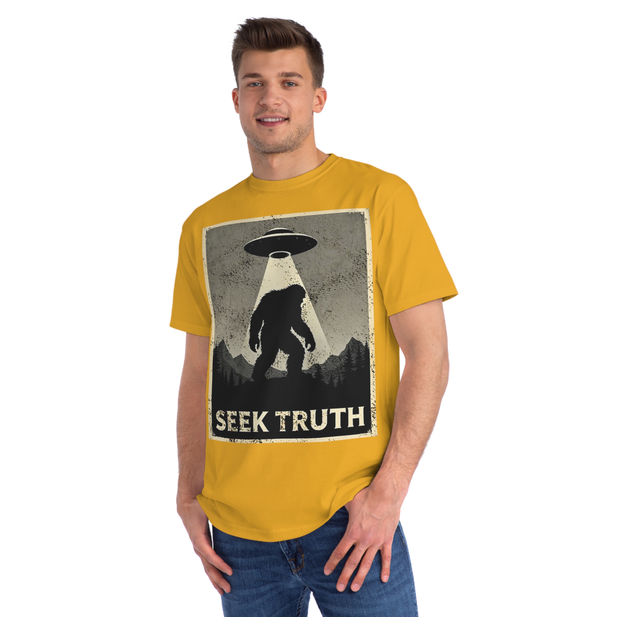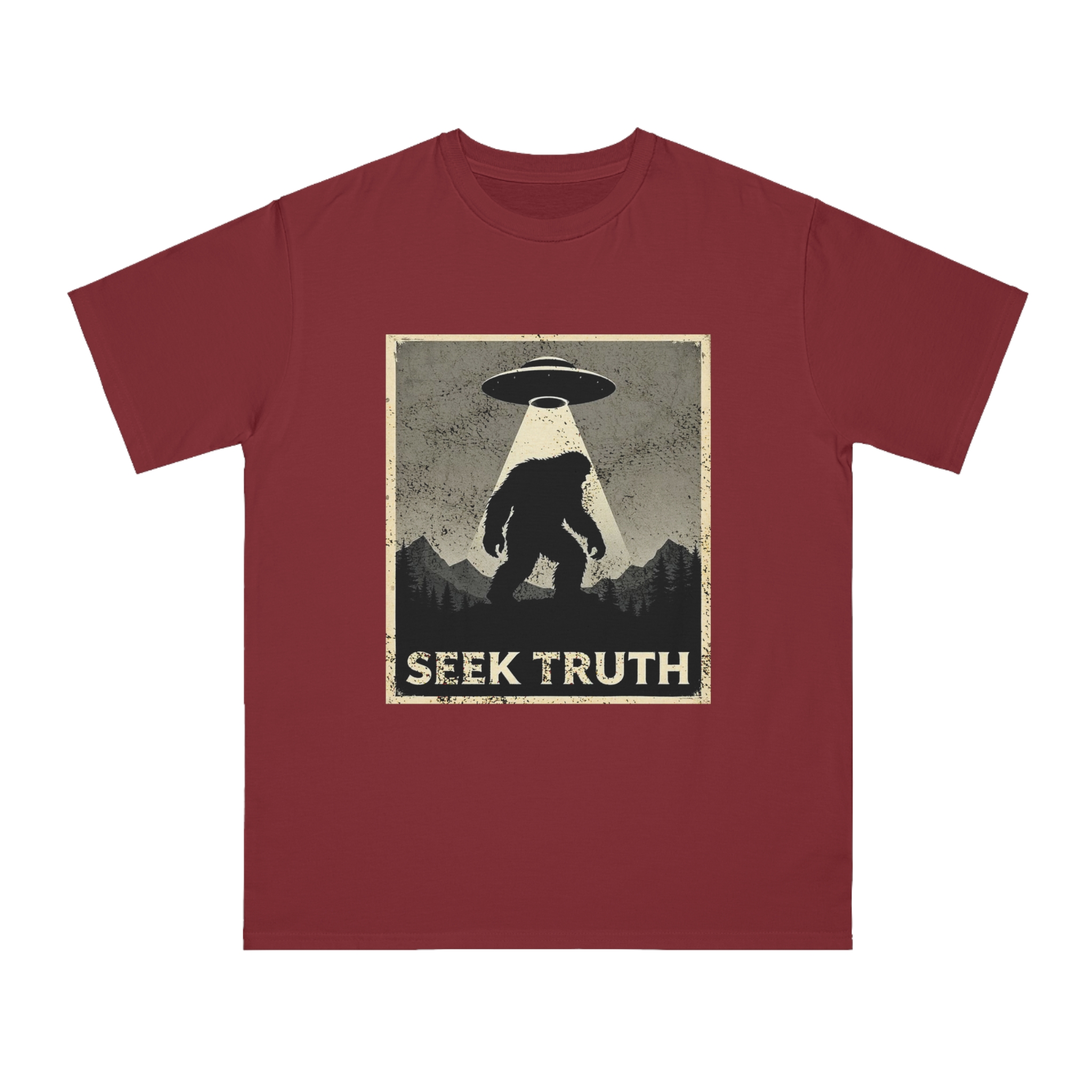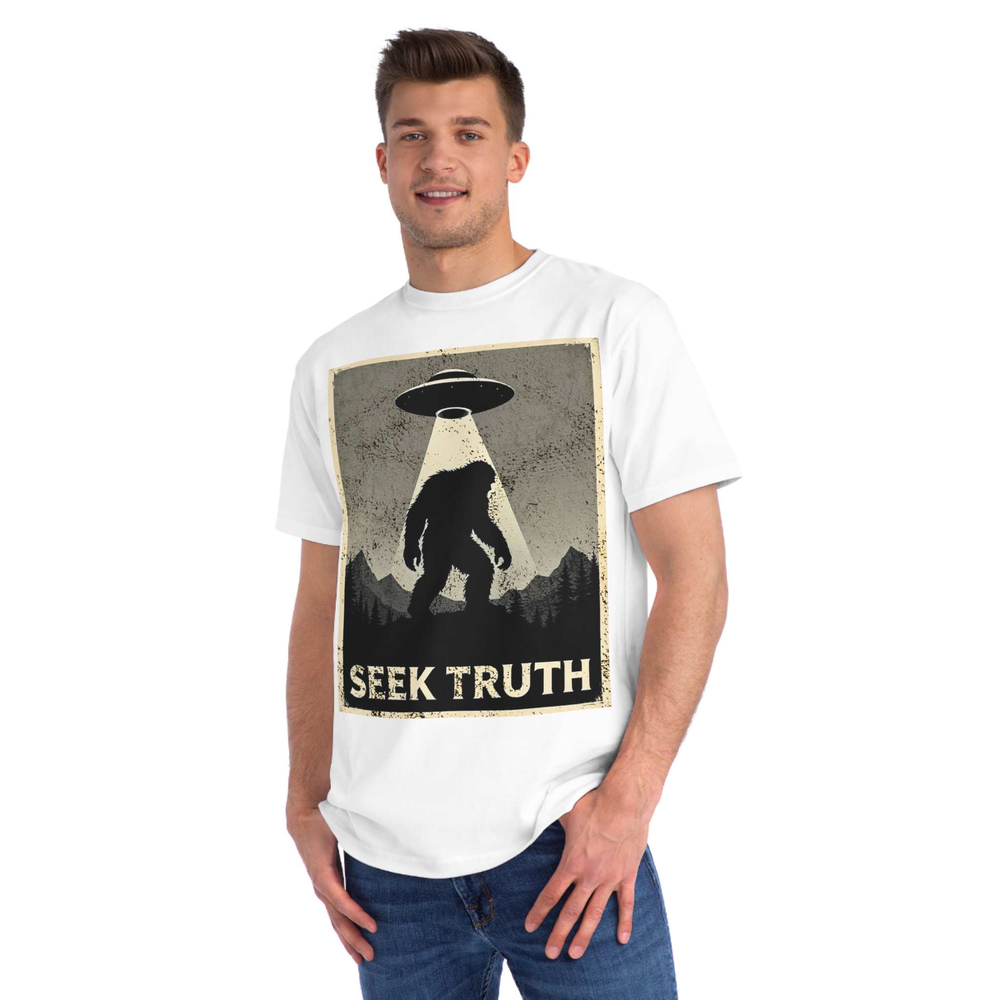 This vintage-style graphic depicts a mysterious silhouette of a large, furry creature reminiscent of Bigfoot standing beneath a UFO in a mountainous forest landscape. The image is rendered in a monochromatic grayscale palette with a textured, weathered appearance that evokes an old poster or newspaper print. A classic flying saucer hovers above the creature, projecting a bright beam of light downward, creating a dramatic and enigmatic scene. The foreground features a silhouetted forest of pine trees and mountain peaks, while the background has a gritty, distressed texture that adds to the vintage aesthetic. At the bottom of the image, the words “SEEK TRUTH” are prominently displayed in bold, worn lettering, suggesting a call to investigate unexplained phenomena and uncover hidden mysteries.