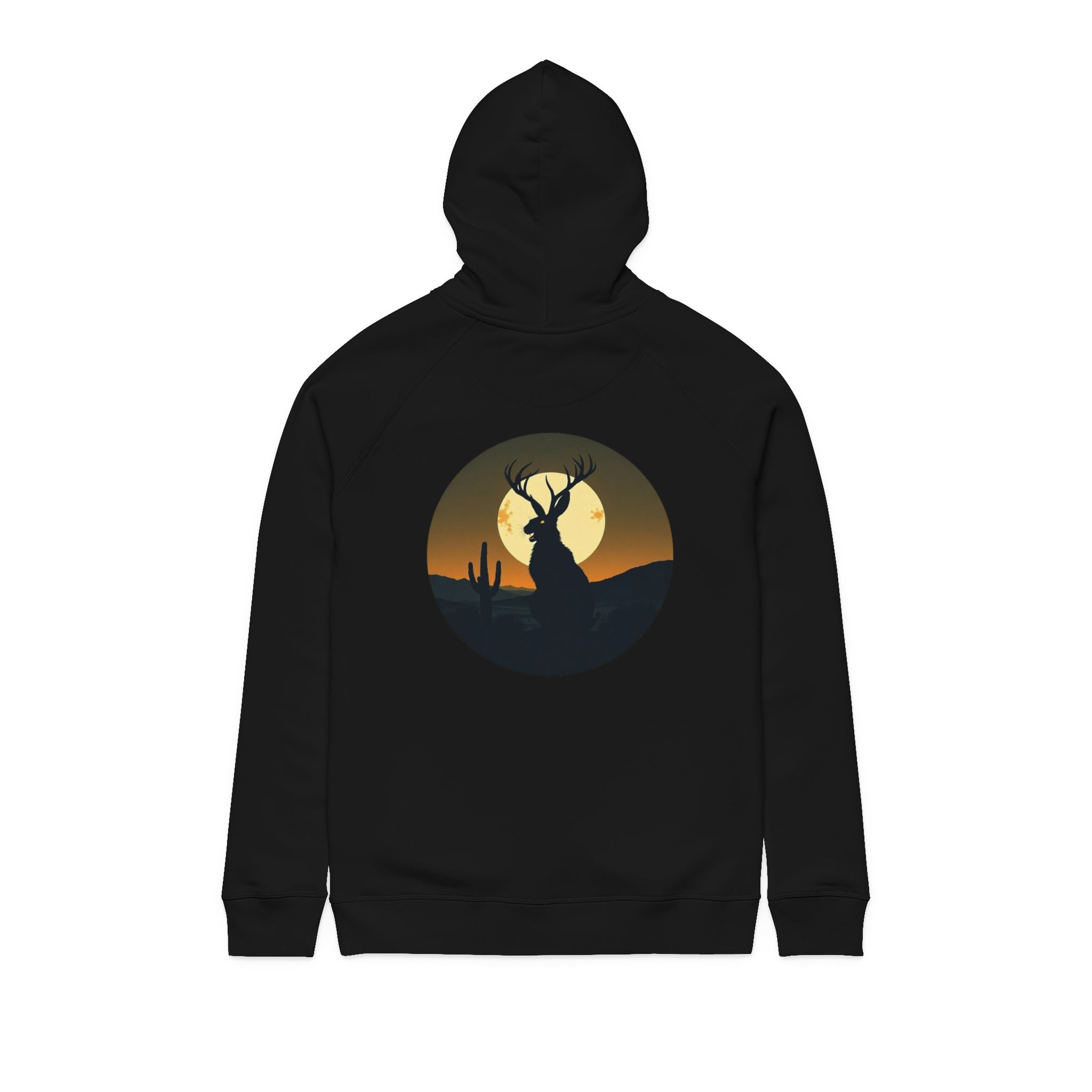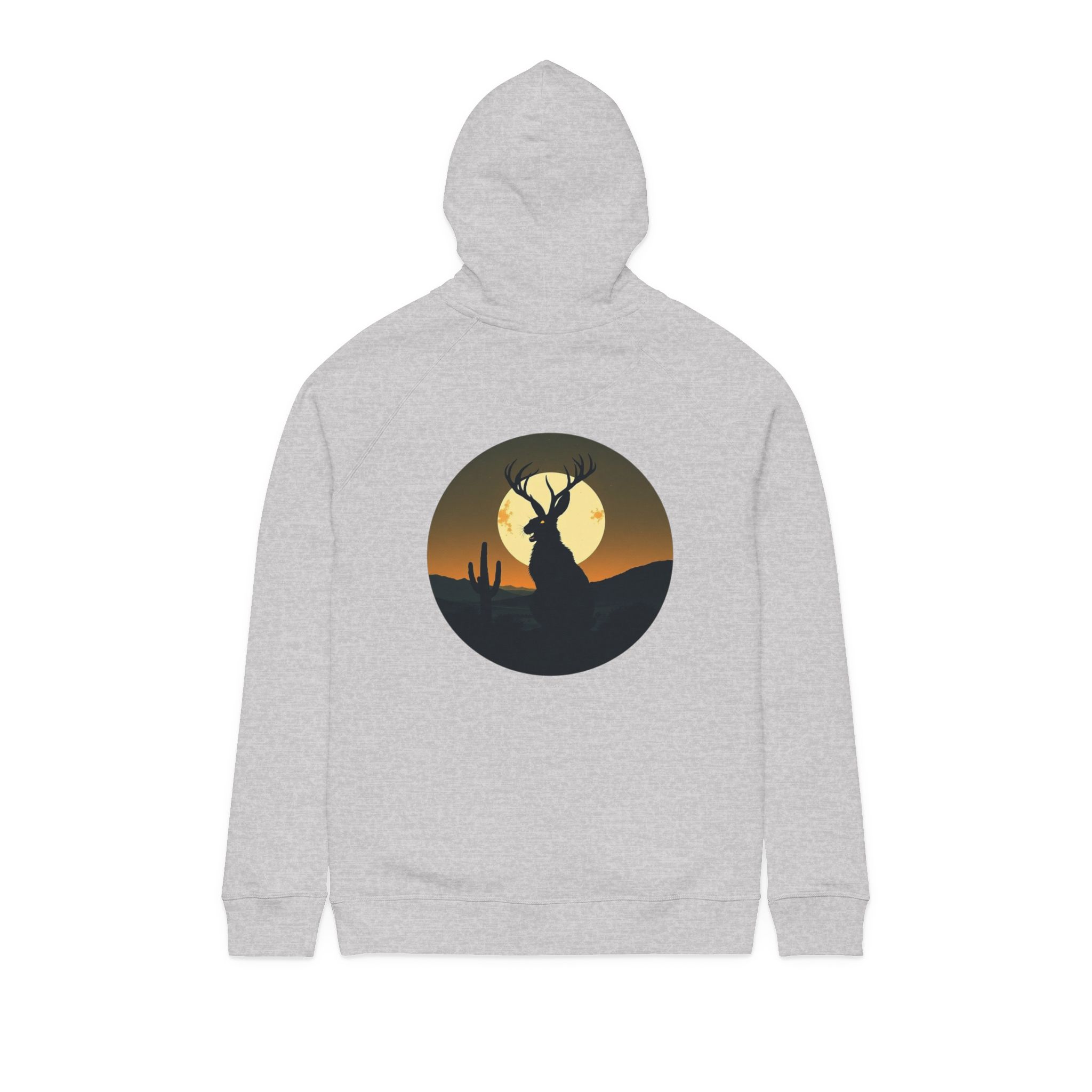 This organic hoodie carries a quiet, desert-night story. Soft, medium-weight fabric drapes easily over shoulders while a warm moonlit silhouette—a lone stag against cacti and a low orange sun—sits over the chest, bringing calm and a subtle wildness to everyday wear. The double-layered hood and flat drawcords frame the face for extra warmth, while the slanted side pockets keep hands tucked and small essentials close. Breathable but substantial, it moves with you on cool dawn walks, late-night drives, or slow mornings with coffee on the porch. It feels responsibly made and looks considered—an elevated basics piece for those who lean toward nature, quiet adventure, and thoughtfully made clothing.