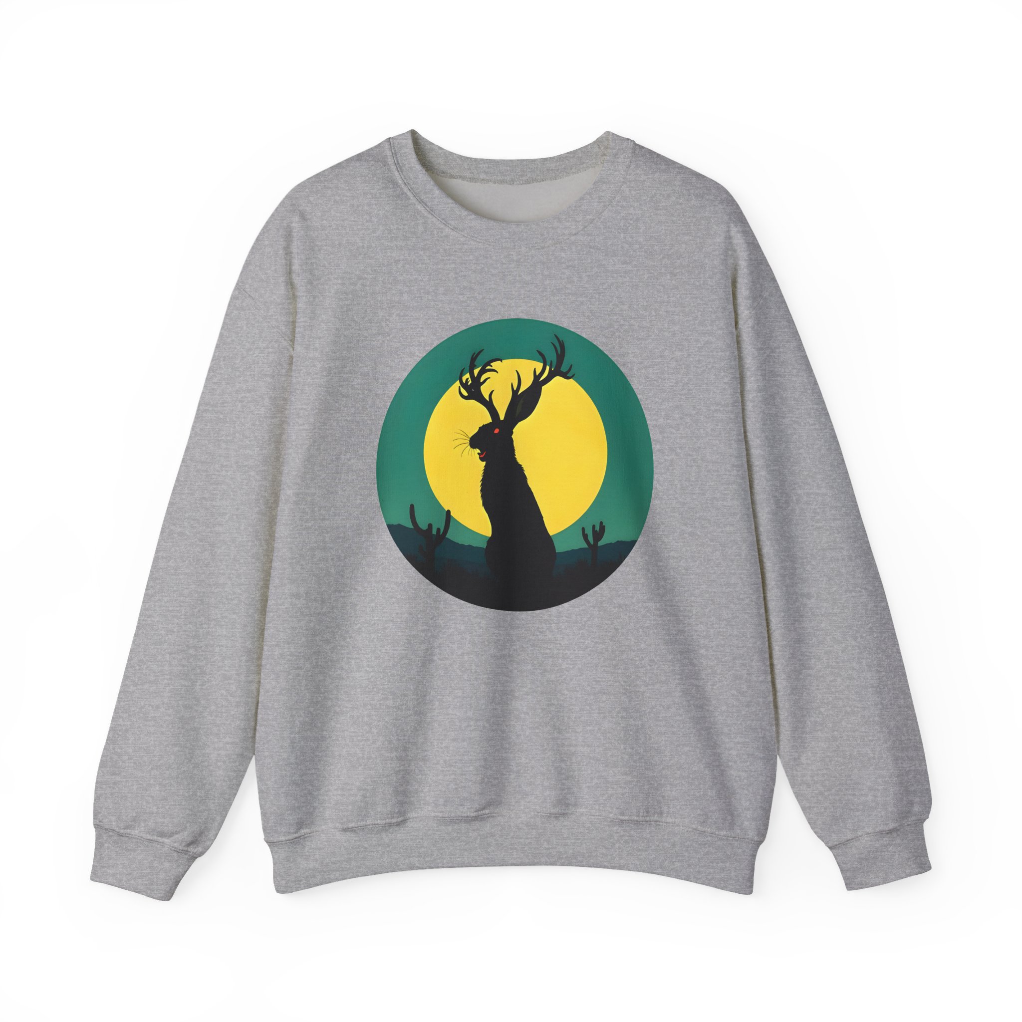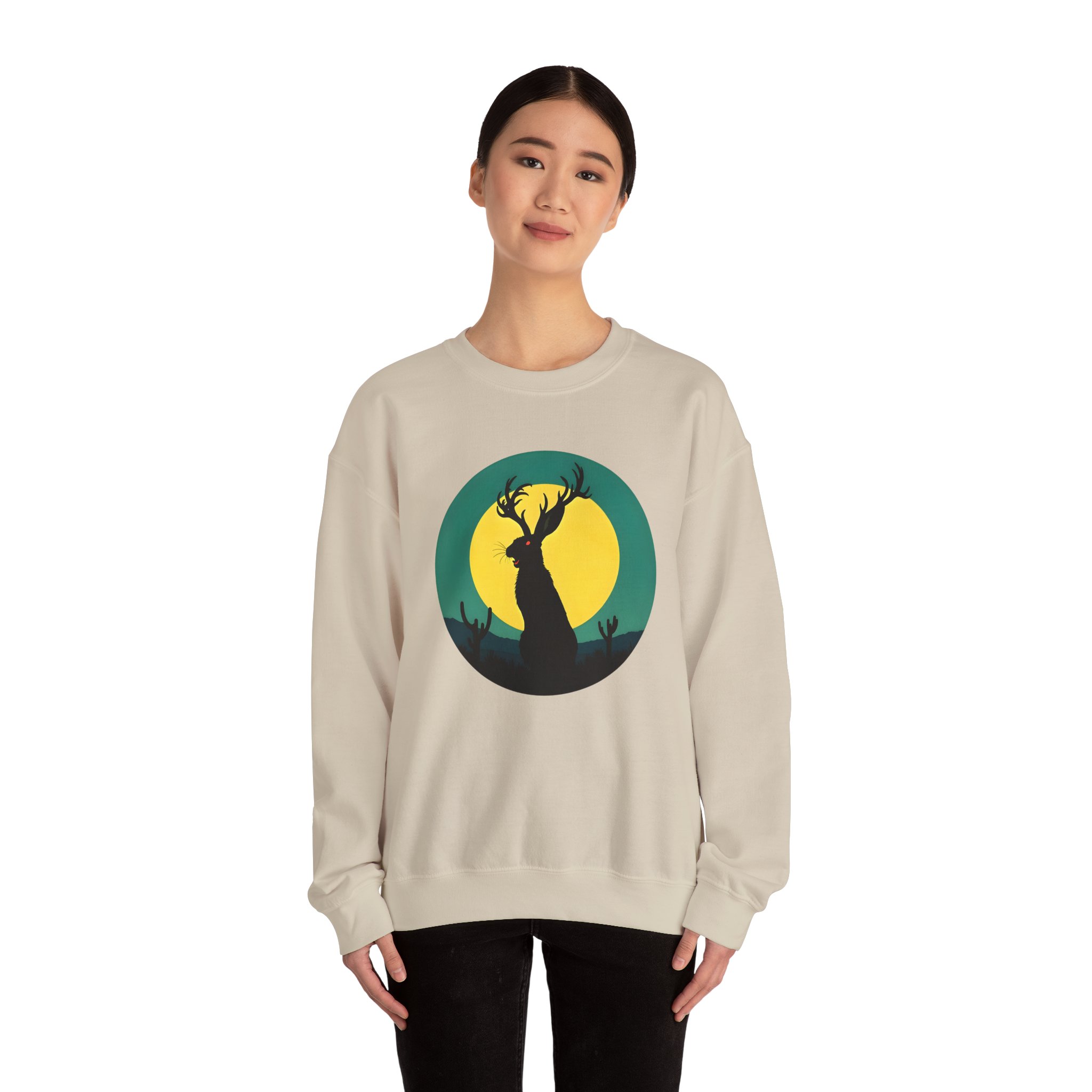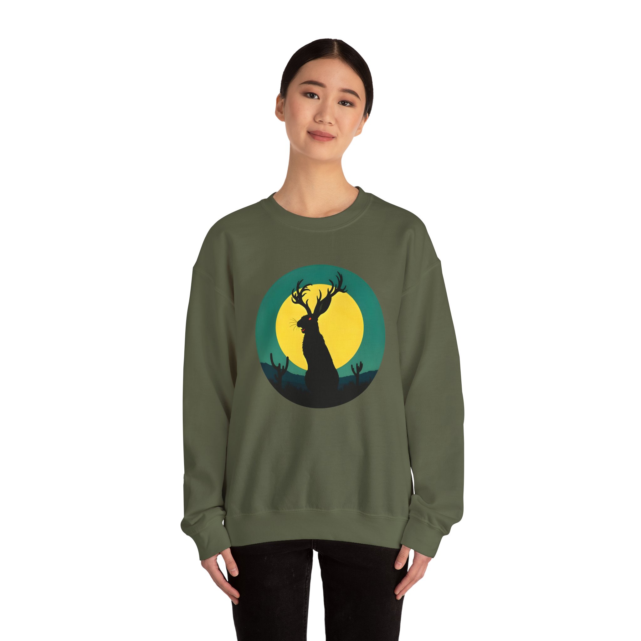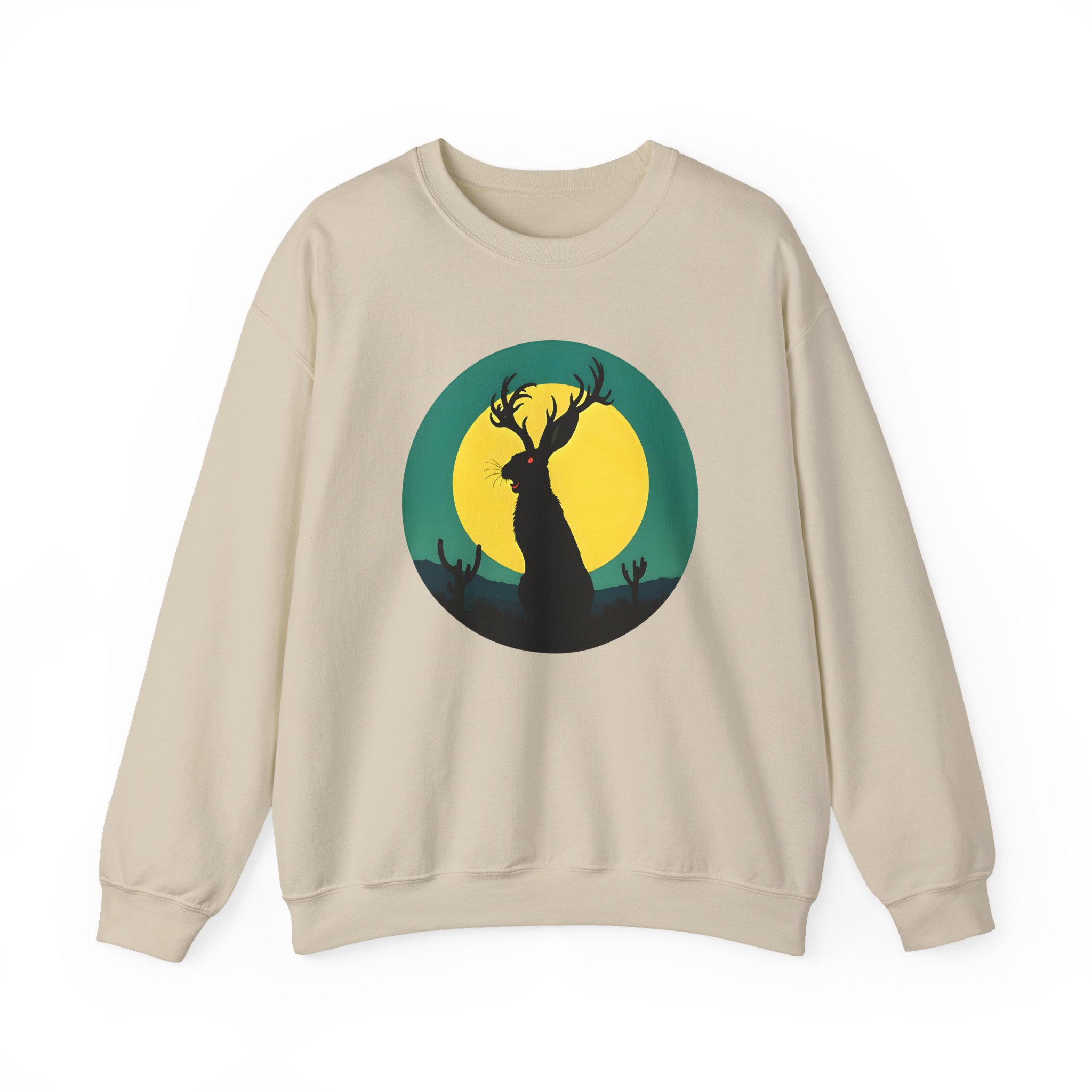 This striking graphic depicts a surreal jackalope-like creature silhouetted against a vibrant yellow full moon and teal-green desert landscape. The creature appears to be a rabbit or hare with large, elaborate deer antlers, standing upright and casting a bold black outline against the bright circular background. Two saguaro cacti frame the scene on either side, adding to the distinctly southwestern desert atmosphere. The image is rendered in a minimalist, high-contrast style with sharp color delineations between the black creature, yellow moon, and green background. The artwork creates a mysterious and slightly mythical mood, blending animal imagery with a stylized, almost graphic novel-like visual approach.