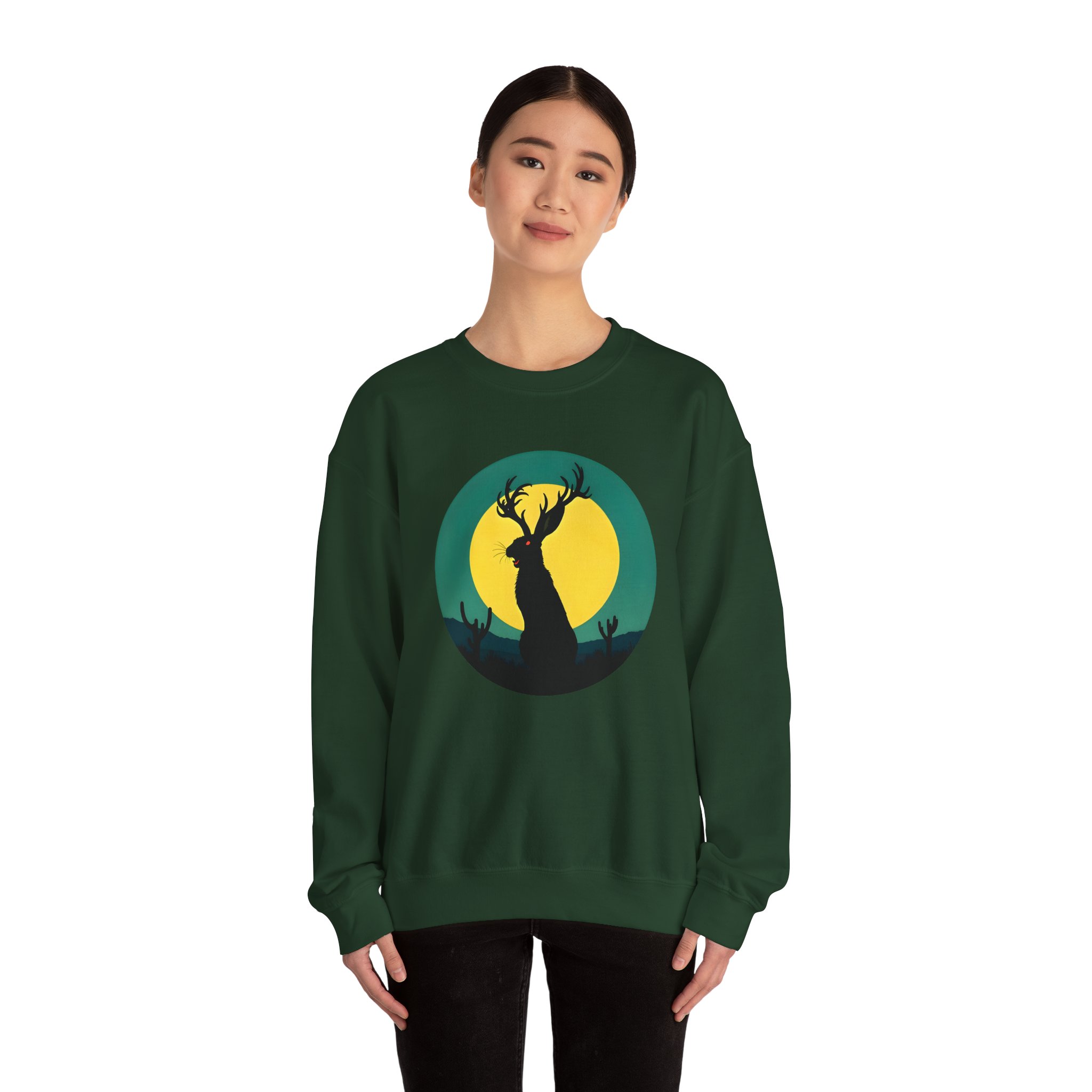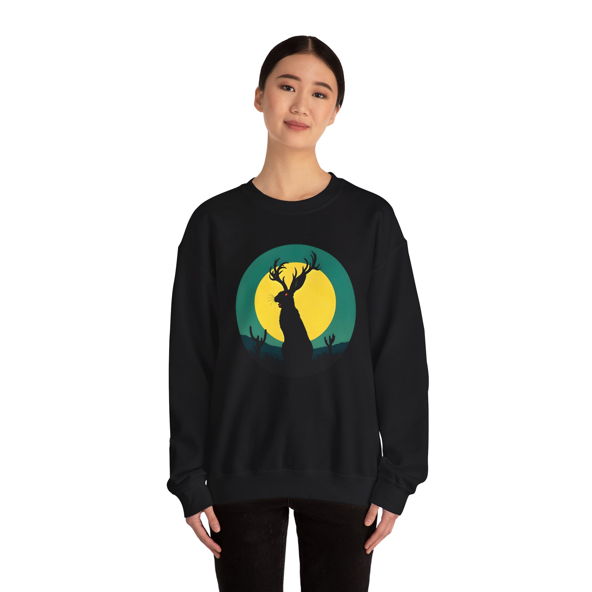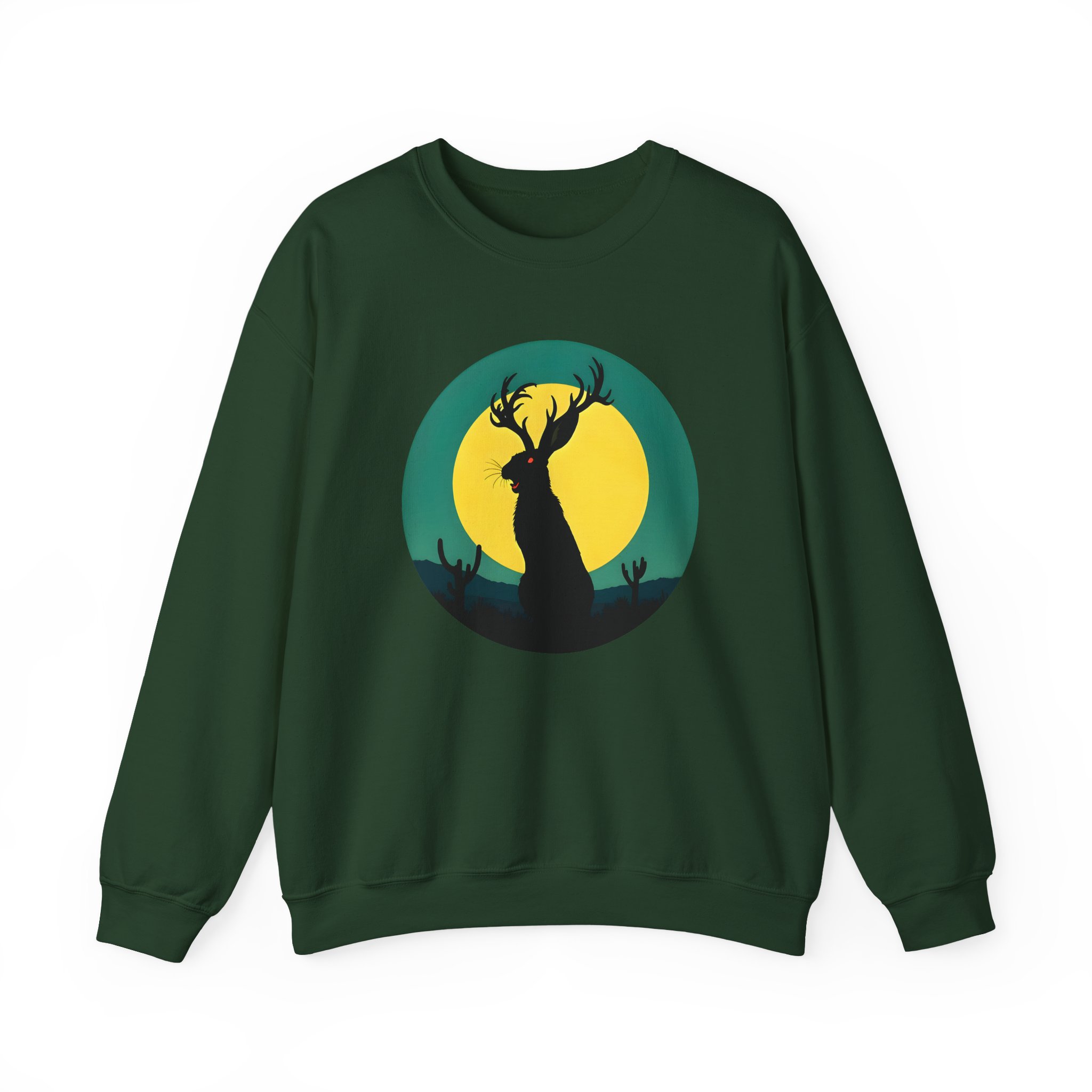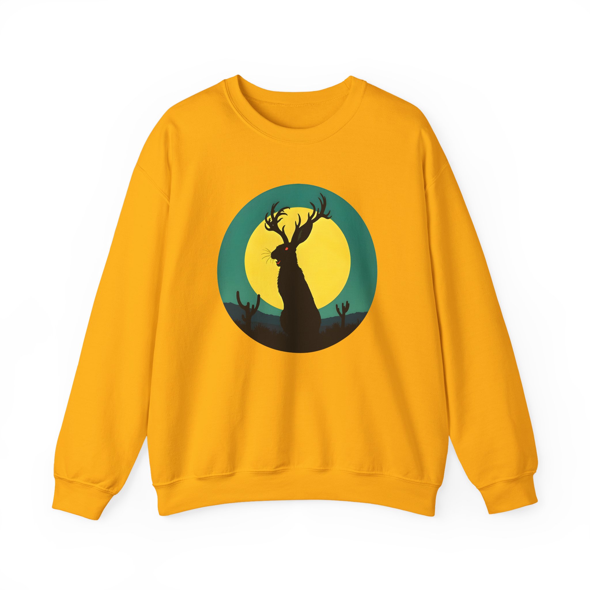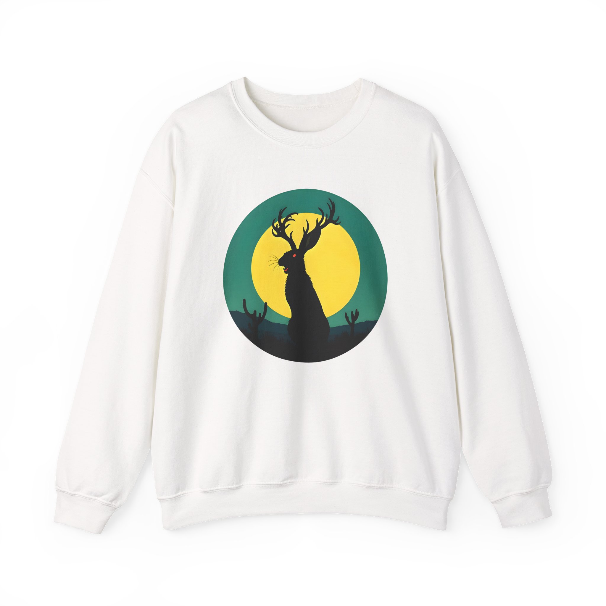 This striking graphic depicts a surreal jackalope-like creature silhouetted against a vibrant yellow full moon and teal-green desert landscape. The creature appears to be a rabbit or hare with large, elaborate deer antlers, standing upright and casting a bold black outline against the bright circular background. Two saguaro cacti frame the scene on either side, adding to the distinctly southwestern desert atmosphere. The image is rendered in a minimalist, high-contrast style with sharp color delineations between the black creature, yellow moon, and green background. The artwork creates a mysterious and slightly mythical mood, blending animal imagery with a stylized, almost graphic novel-like visual approach.