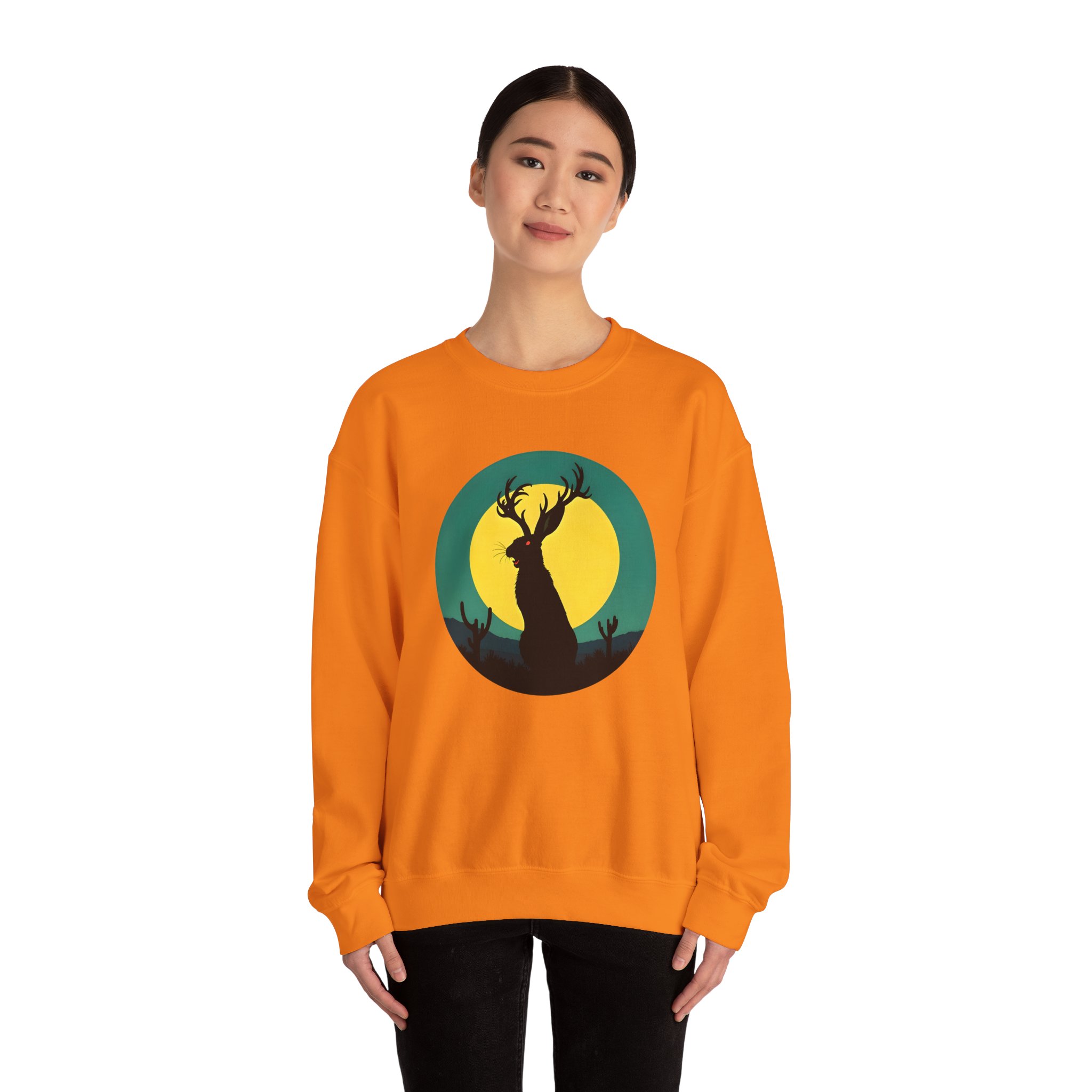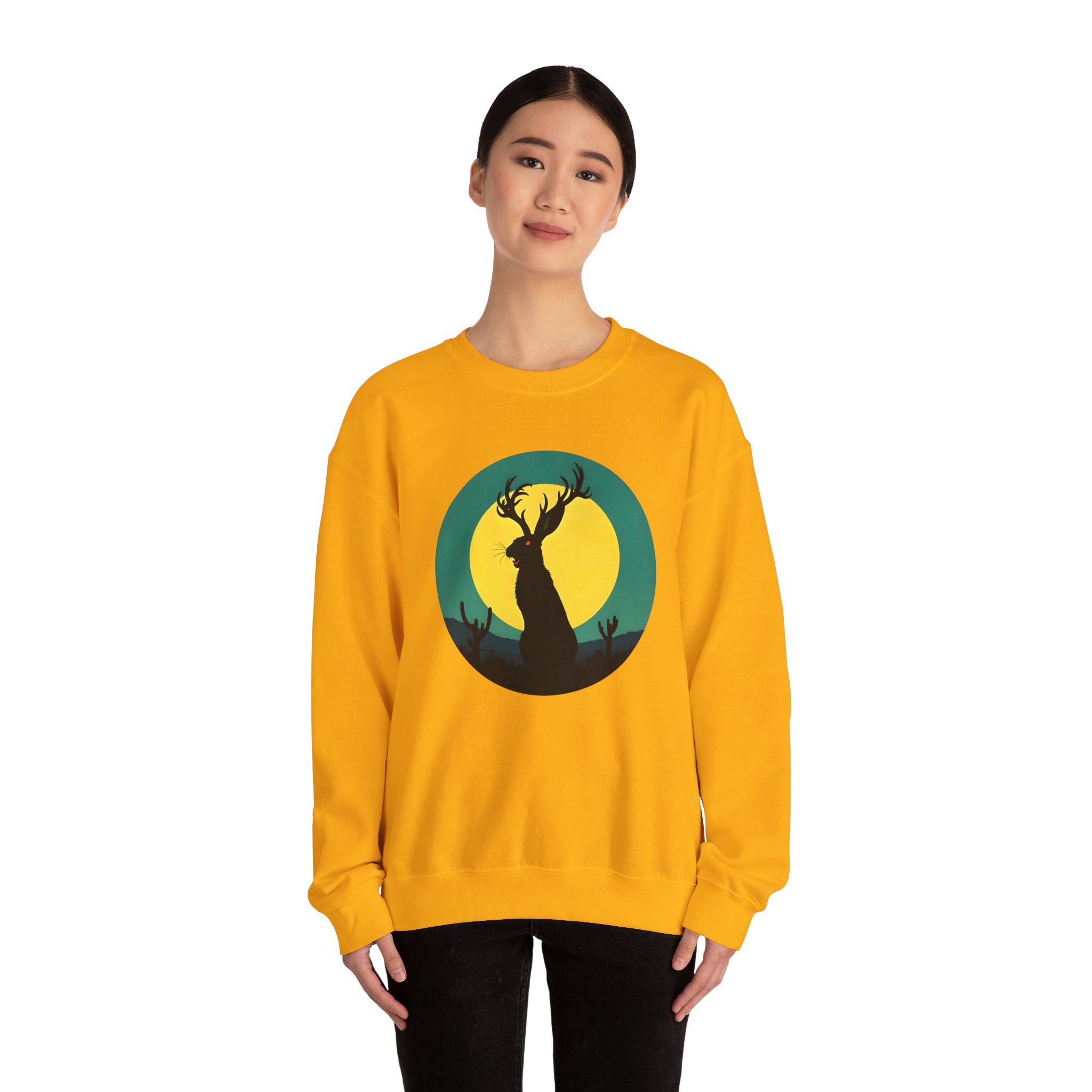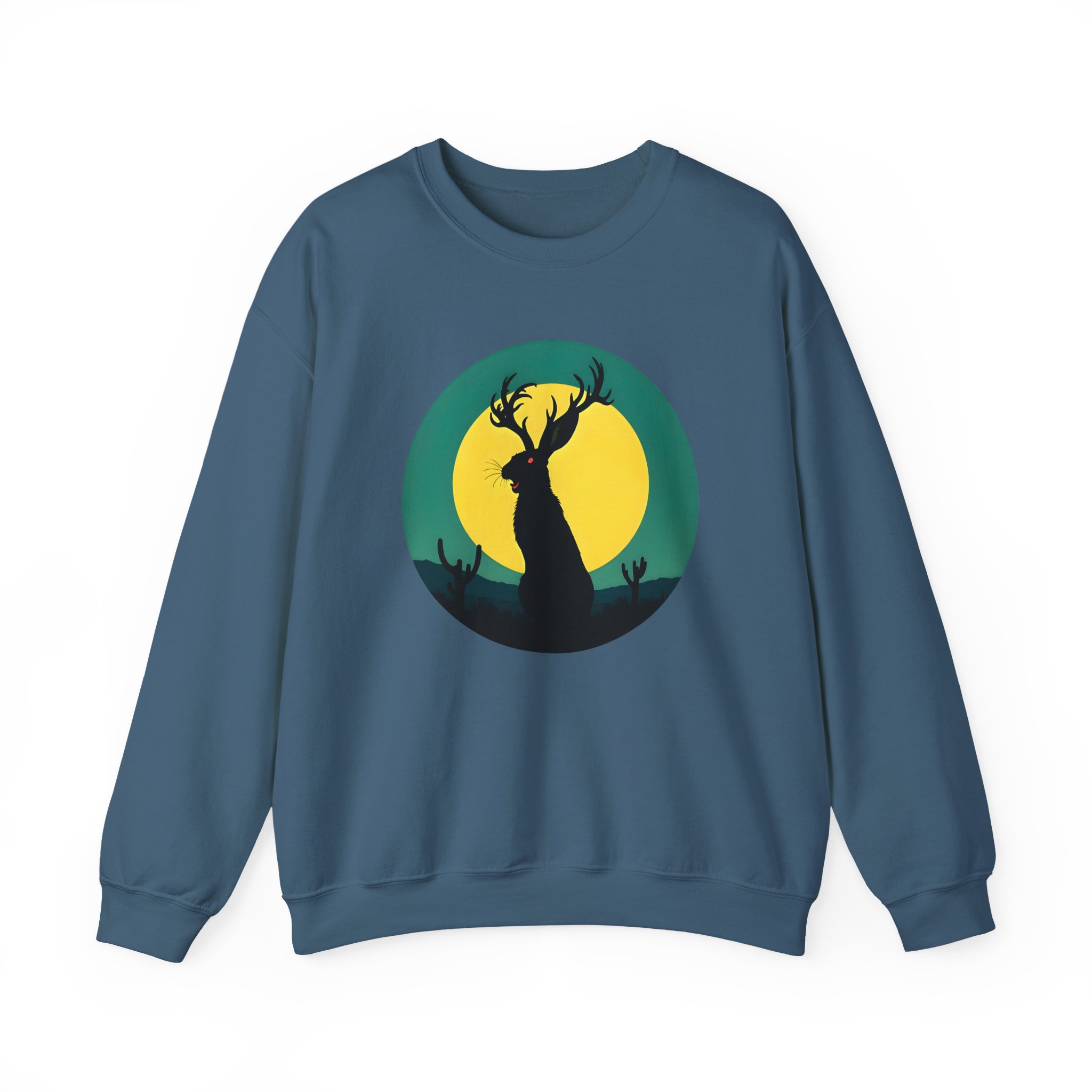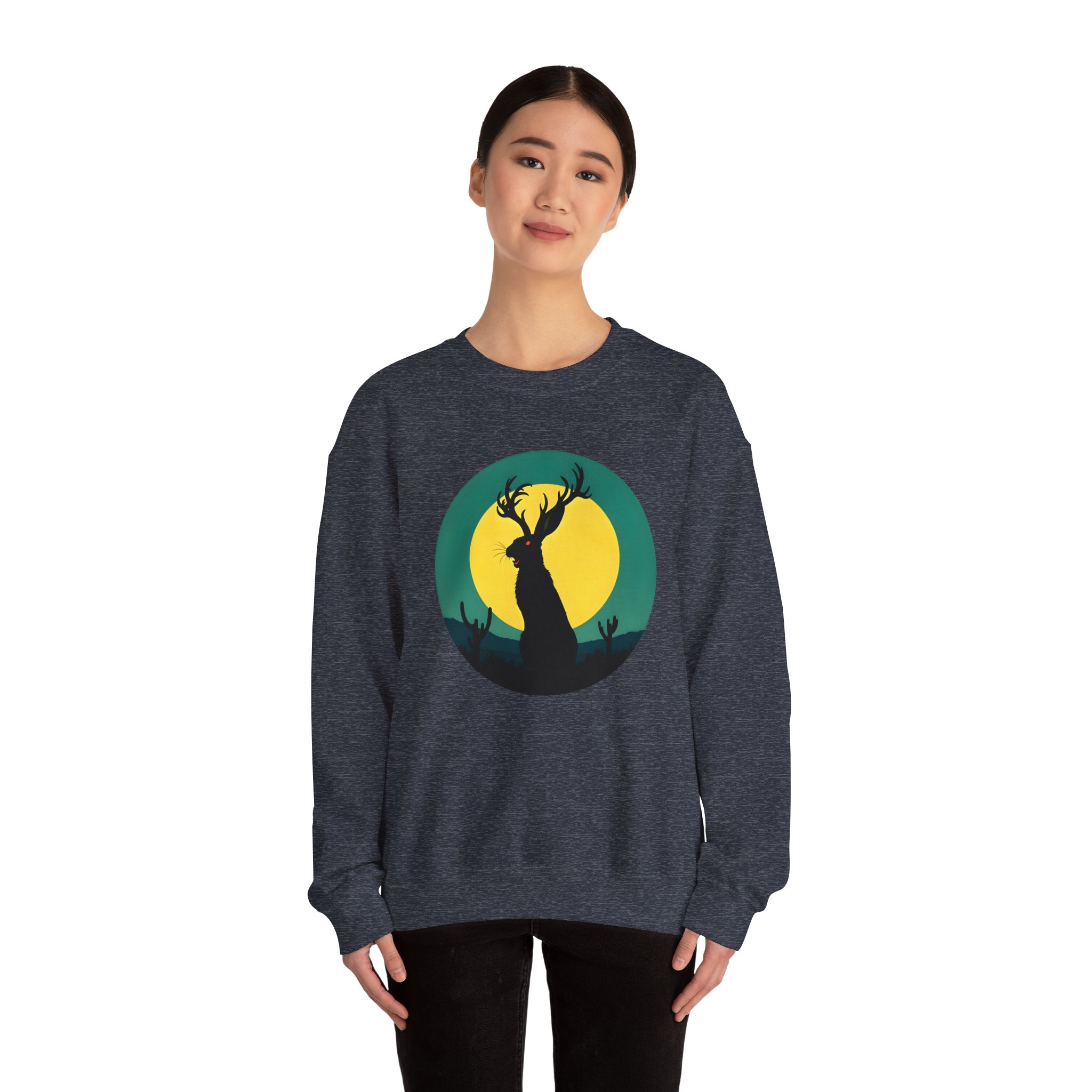 This striking graphic depicts a surreal jackalope-like creature silhouetted against a vibrant yellow full moon and teal-green desert landscape. The creature appears to be a rabbit or hare with large, elaborate deer antlers, standing upright and casting a bold black outline against the bright circular background. Two saguaro cacti frame the scene on either side, adding to the distinctly southwestern desert atmosphere. The image is rendered in a minimalist, high-contrast style with sharp color delineations between the black creature, yellow moon, and green background. The artwork creates a mysterious and slightly mythical mood, blending animal imagery with a stylized, almost graphic novel-like visual approach.
