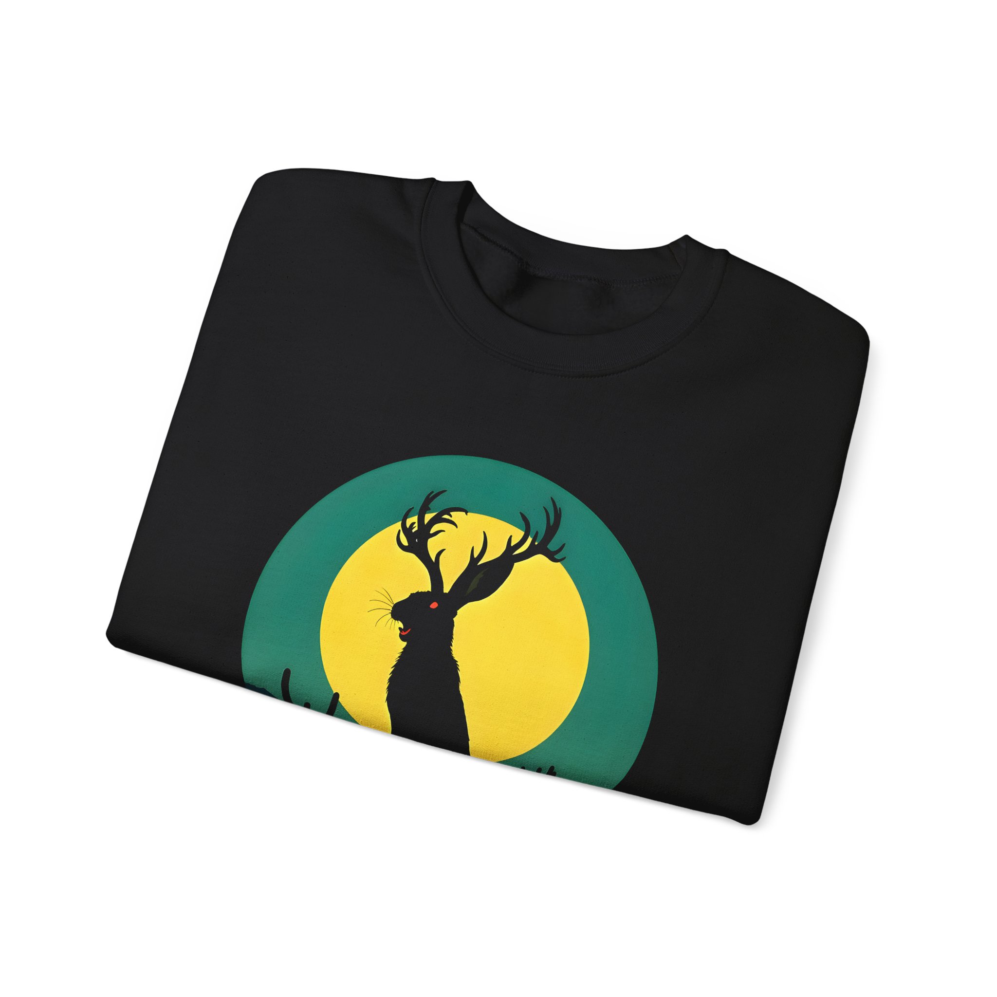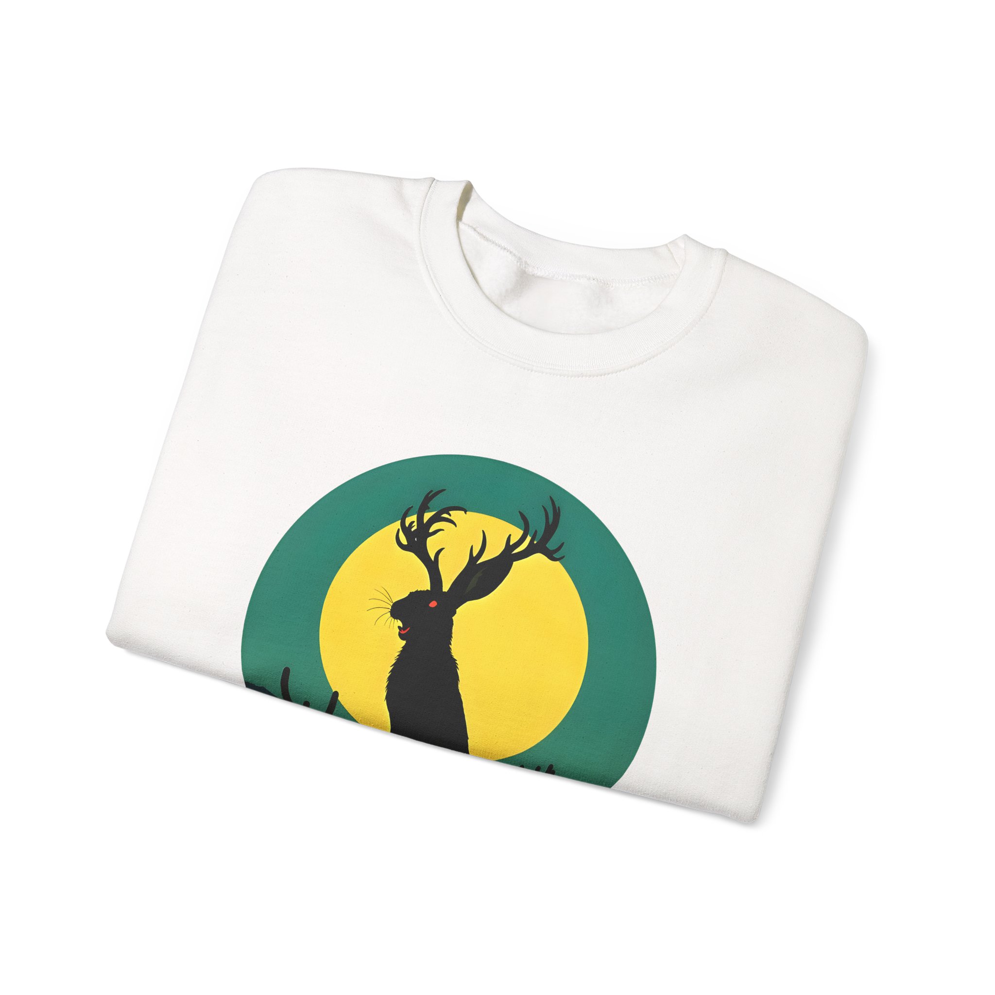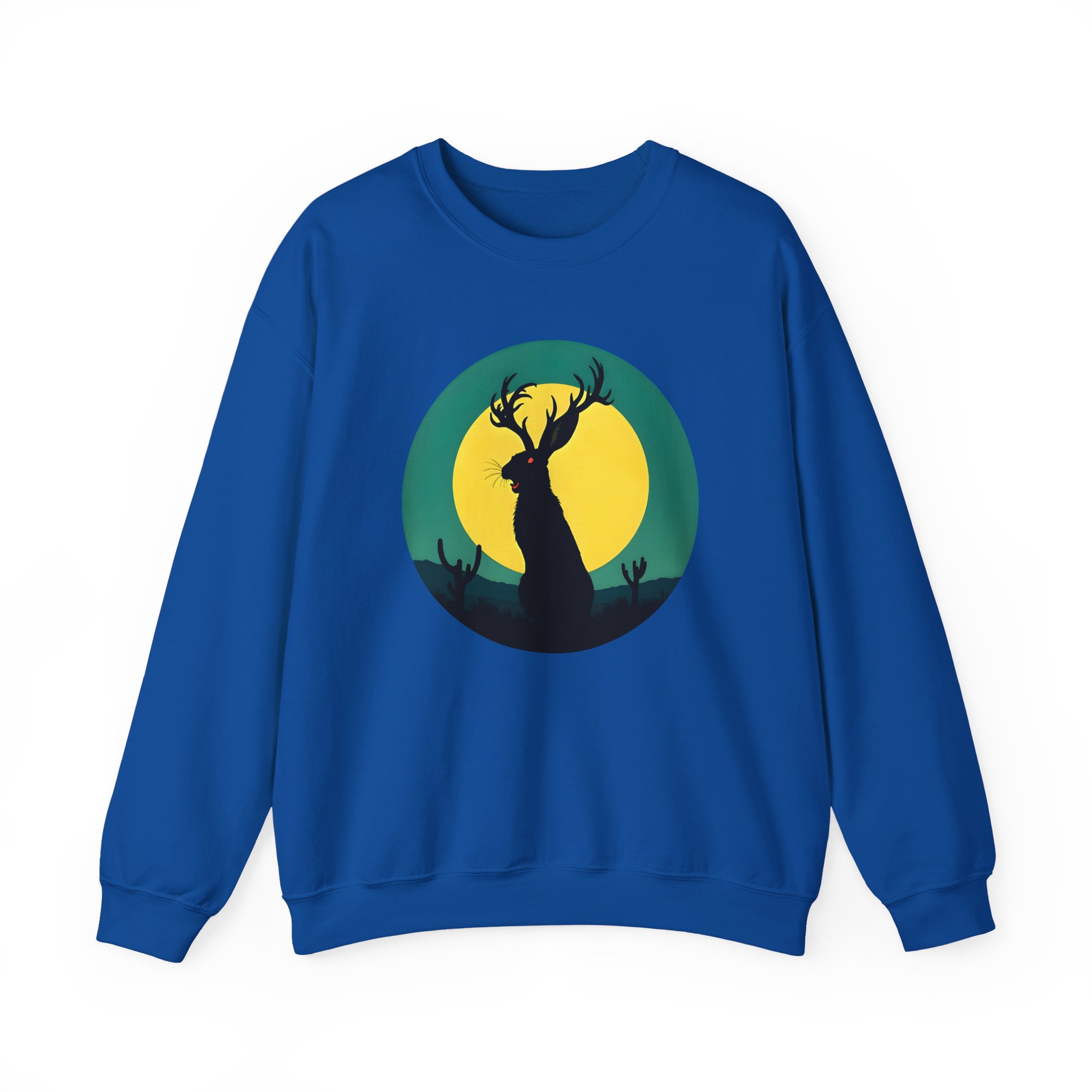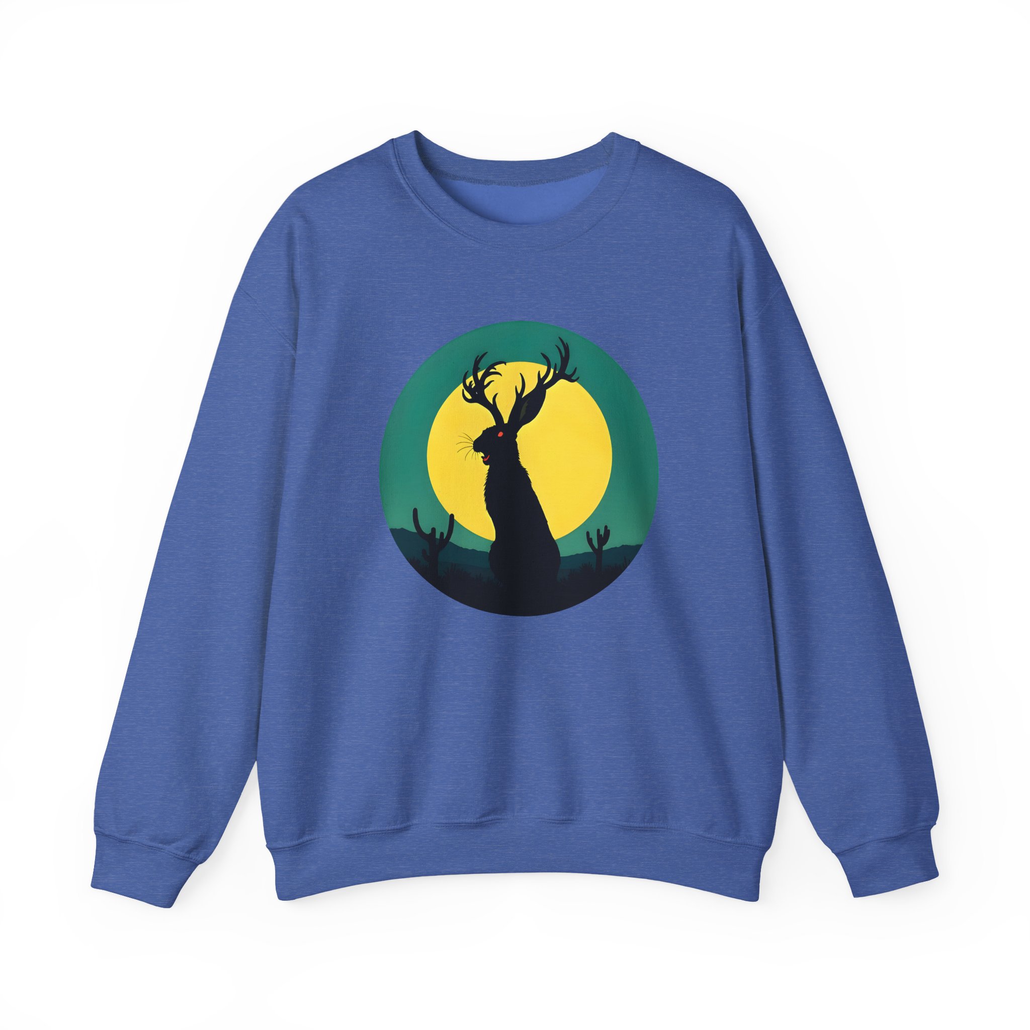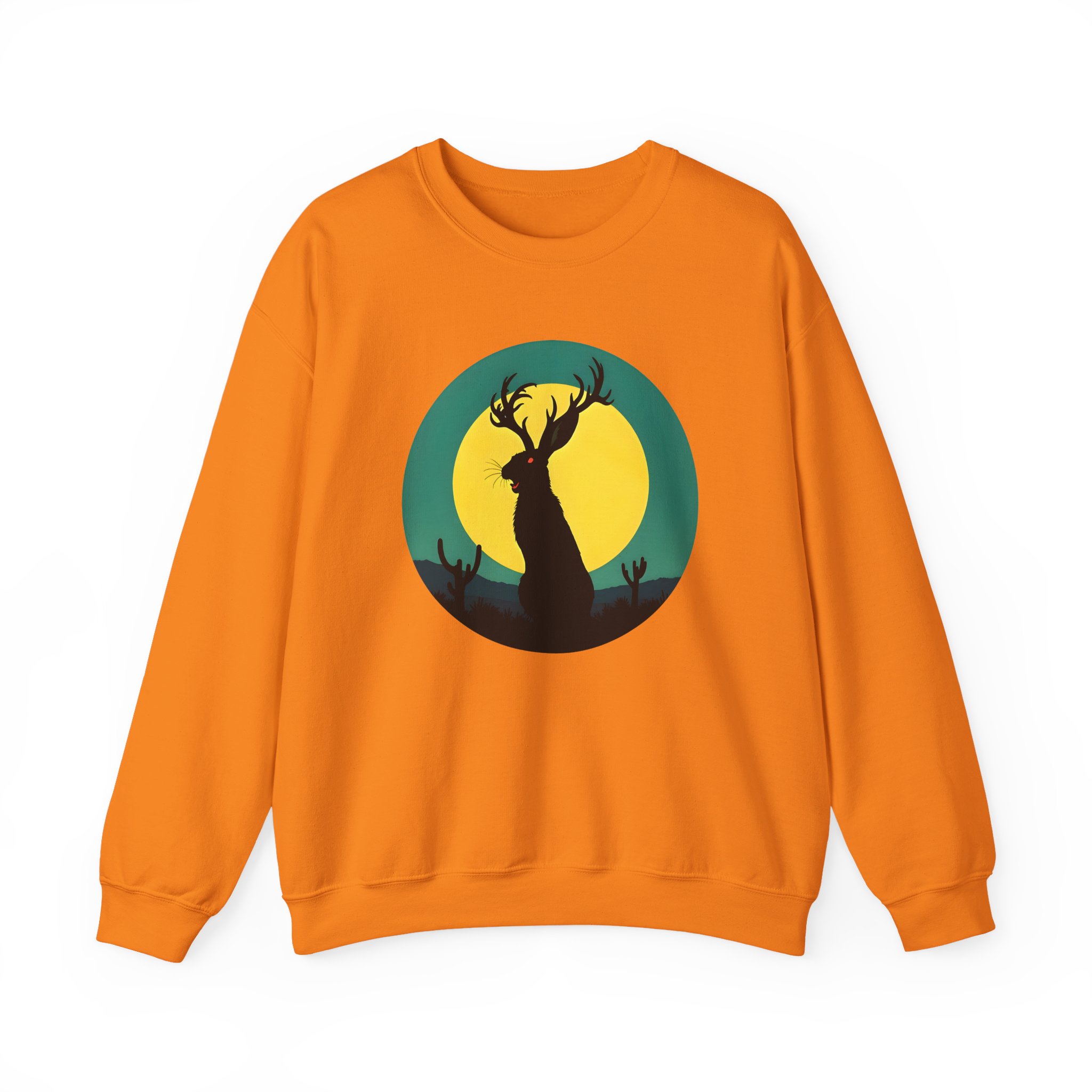 This striking graphic depicts a surreal jackalope-like creature silhouetted against a vibrant yellow full moon and teal-green desert landscape. The creature appears to be a rabbit or hare with large, elaborate deer antlers, standing upright and casting a bold black outline against the bright circular background. Two saguaro cacti frame the scene on either side, adding to the distinctly southwestern desert atmosphere. The image is rendered in a minimalist, high-contrast style with sharp color delineations between the black creature, yellow moon, and green background. The artwork creates a mysterious and slightly mythical mood, blending animal imagery with a stylized, almost graphic novel-like visual approach.