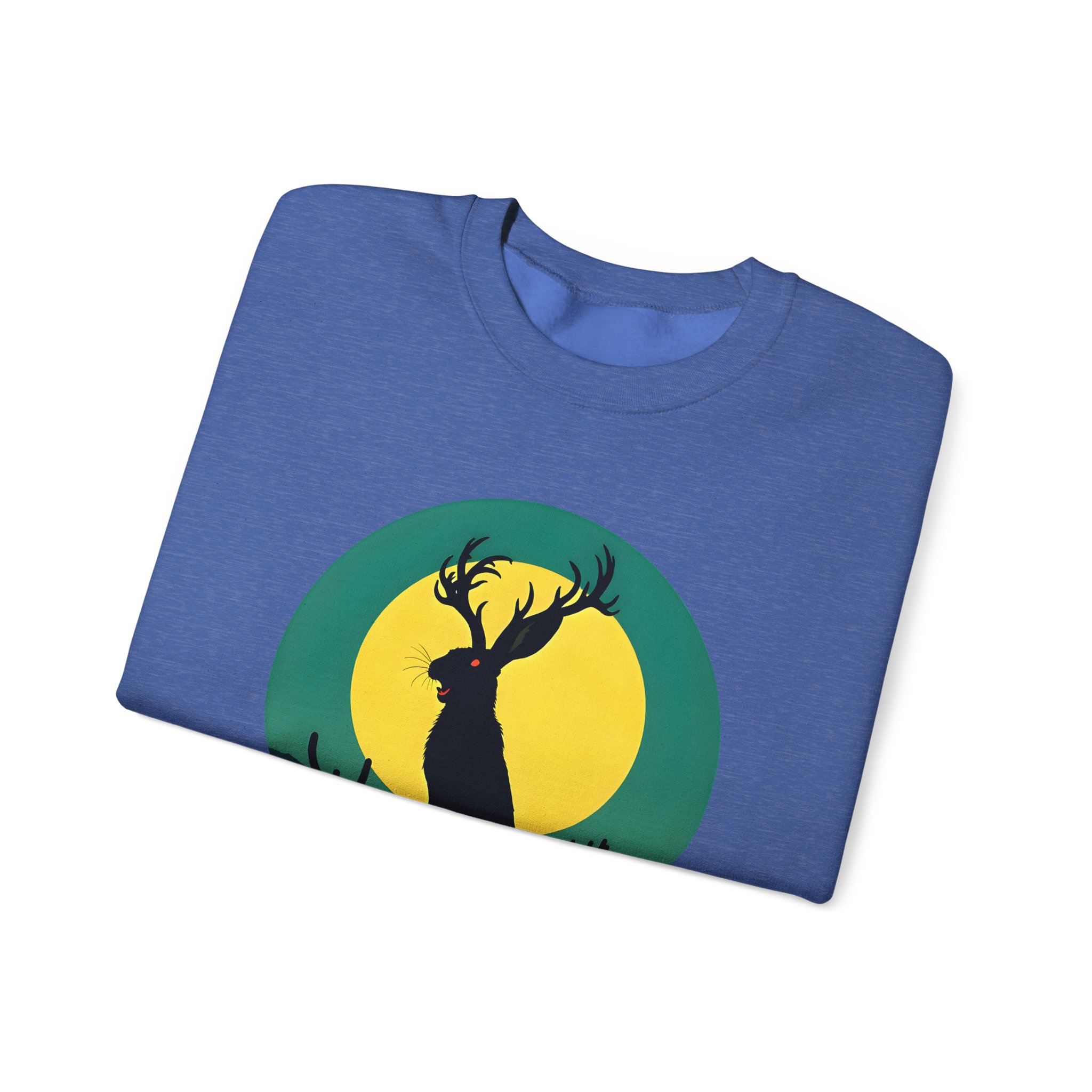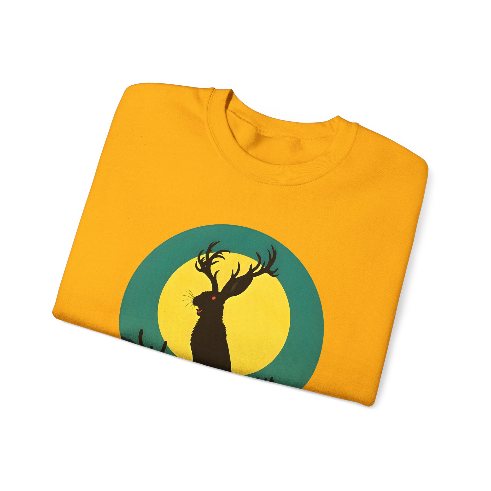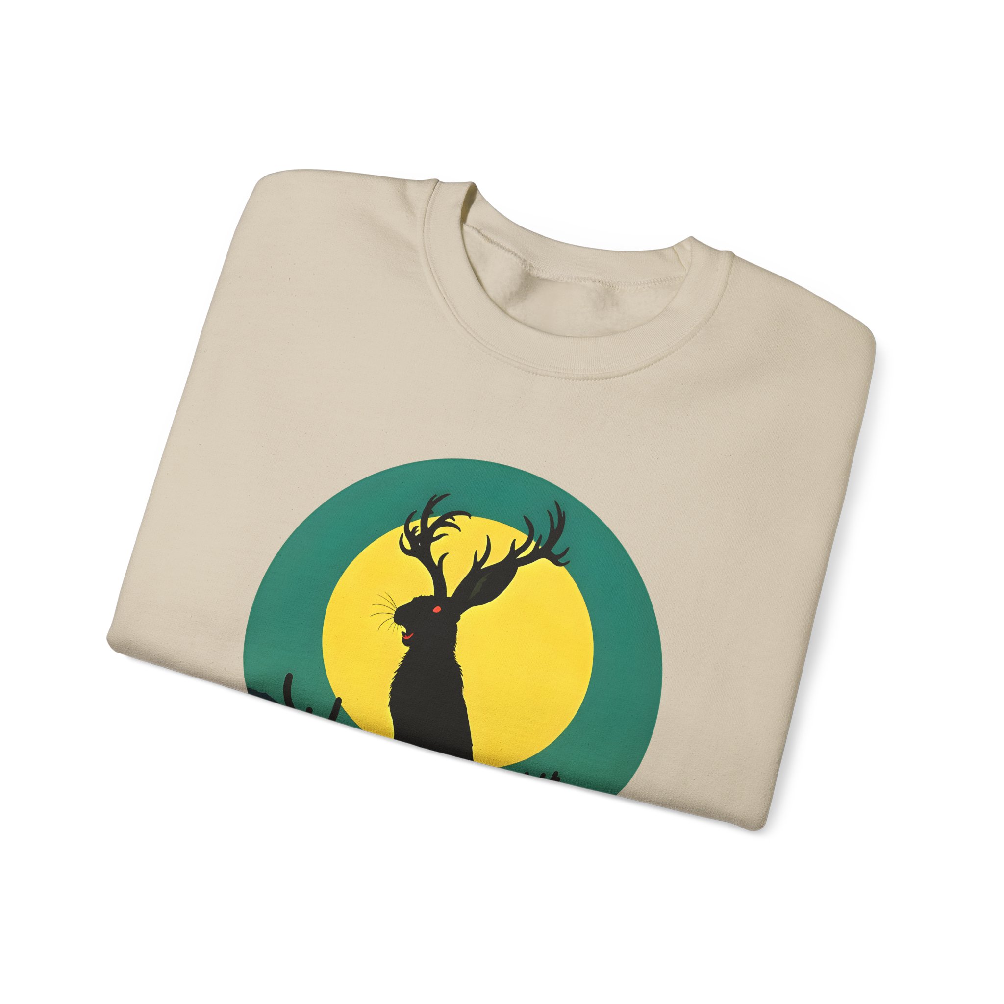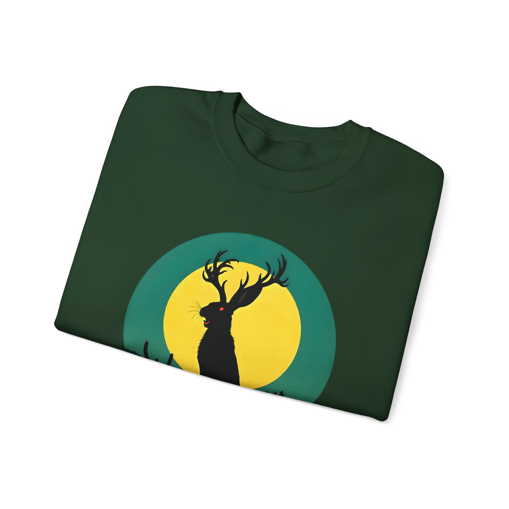 This striking graphic depicts a surreal jackalope-like creature silhouetted against a vibrant yellow full moon and teal-green desert landscape. The creature appears to be a rabbit or hare with large, elaborate deer antlers, standing upright and casting a bold black outline against the bright circular background. Two saguaro cacti frame the scene on either side, adding to the distinctly southwestern desert atmosphere. The image is rendered in a minimalist, high-contrast style with sharp color delineations between the black creature, yellow moon, and green background. The artwork creates a mysterious and slightly mythical mood, blending animal imagery with a stylized, almost graphic novel-like visual approach.