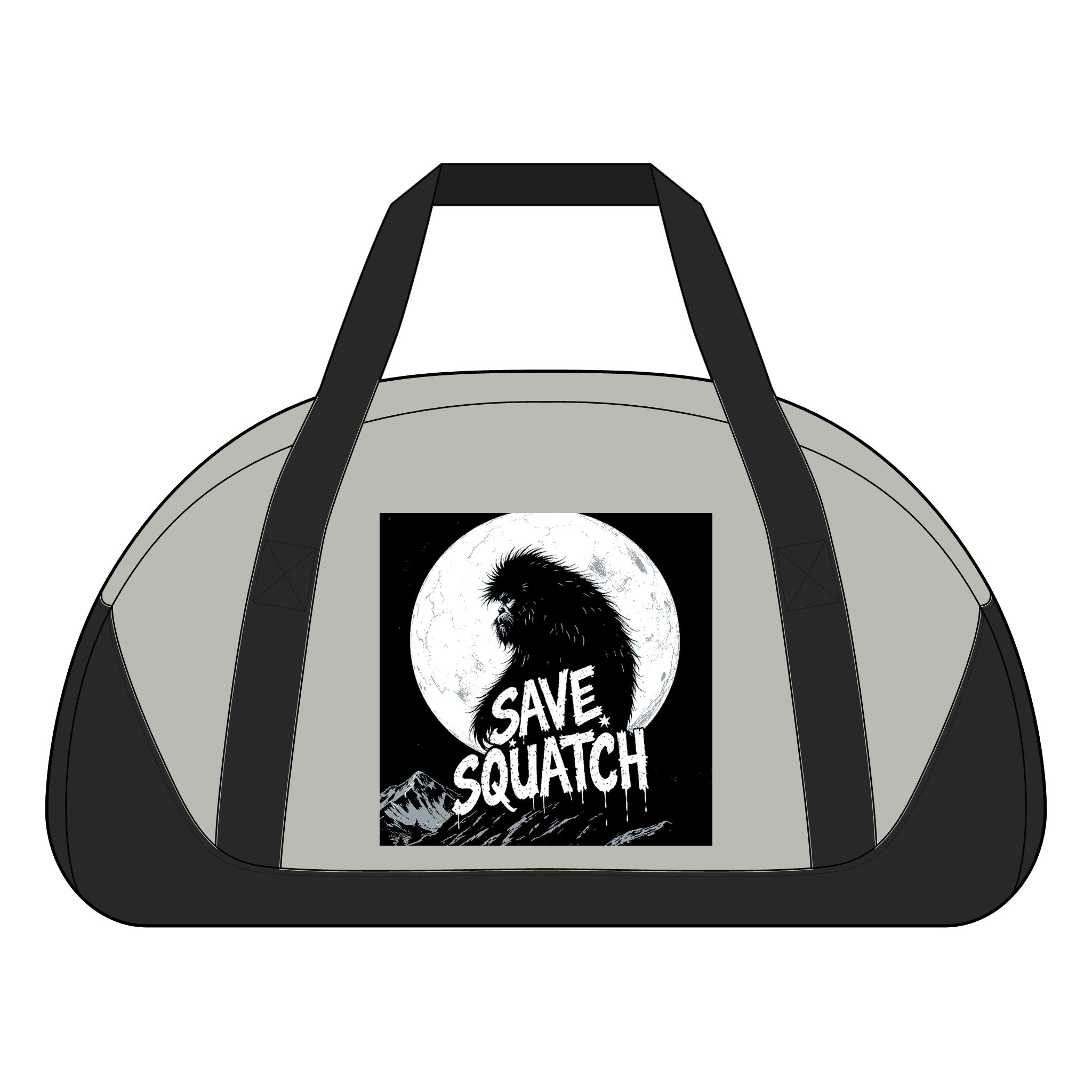 A rugged duffel built for weekend escapes, trailhead drop-offs, and last-minute overnight adventures. The roomy center compartment swallows clothes, boots, and a little gear, while the front slip pocket keeps tickets, sunscreen, or a phone within easy reach. Durable 600D poly canvas stands up to muddy campsites and gym floors alike. The adjustable shoulder strap and stout web handles let you carry it how you like — sling it over your shoulder for a hike or carry it by hand through the terminal. The printed panel on the front adds personality: moonlit Sasquatch art that hints at late-night campfire walks and star-filled clearings.