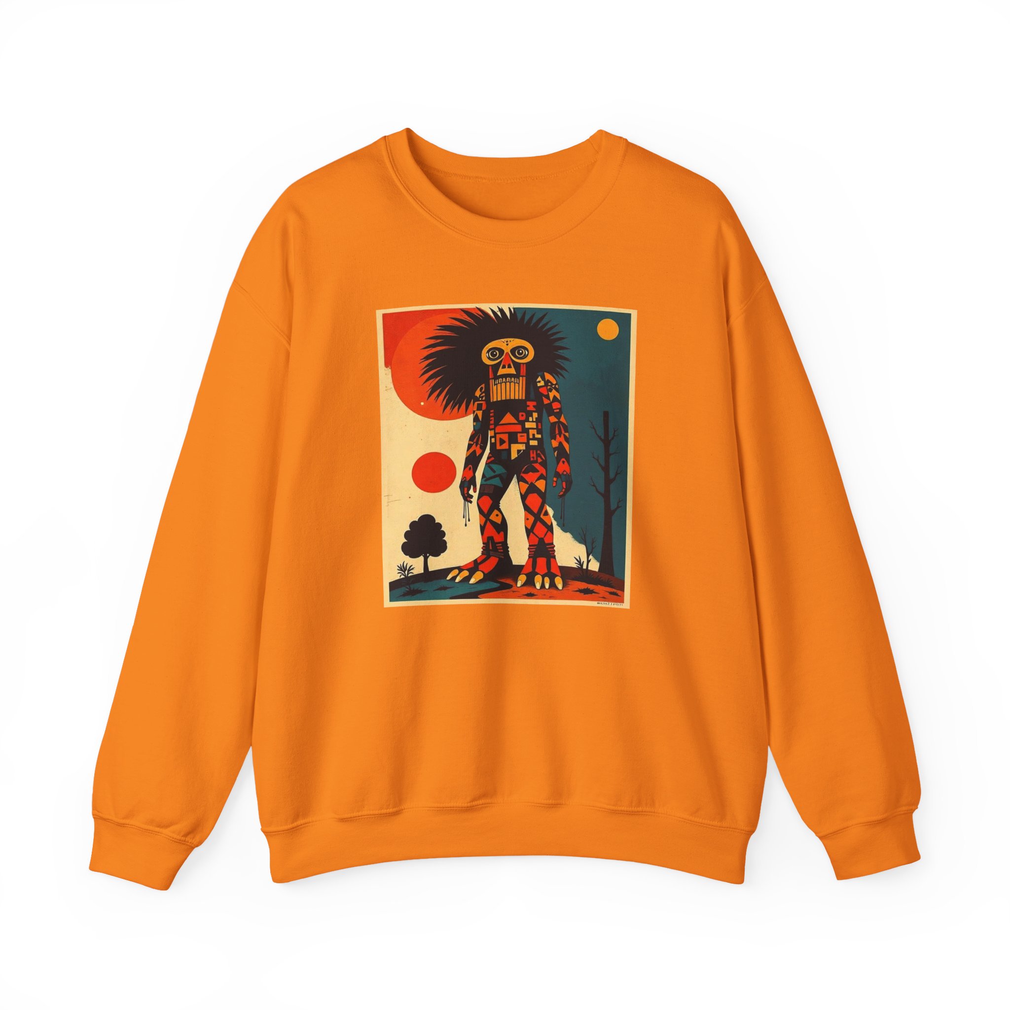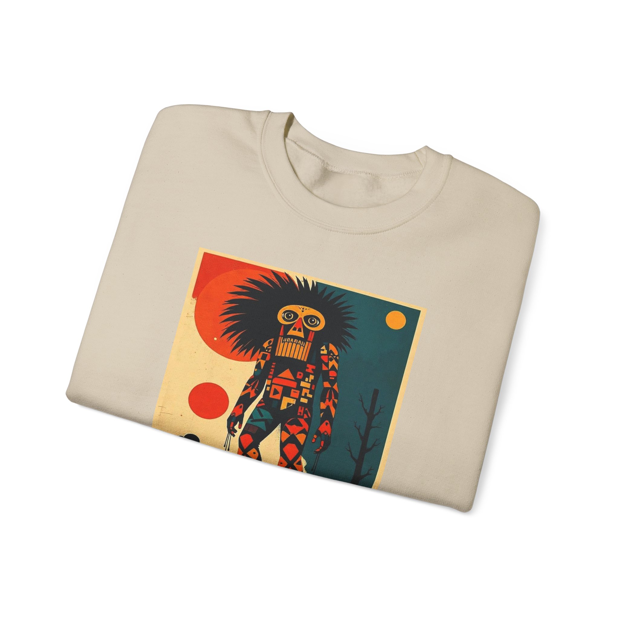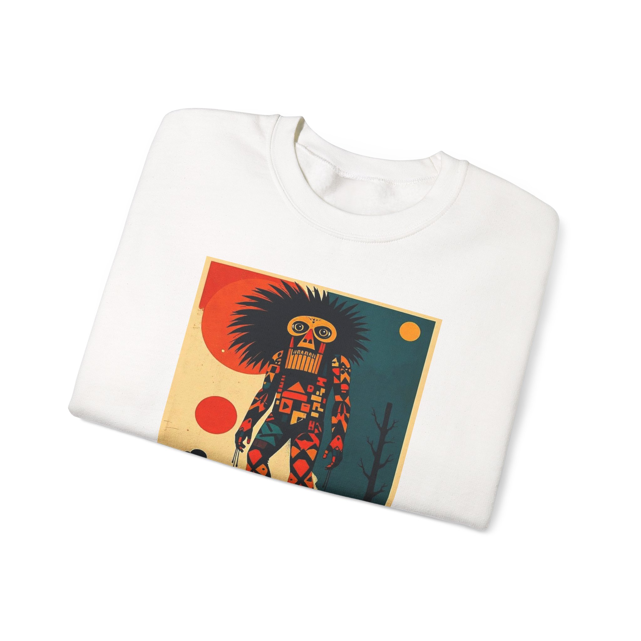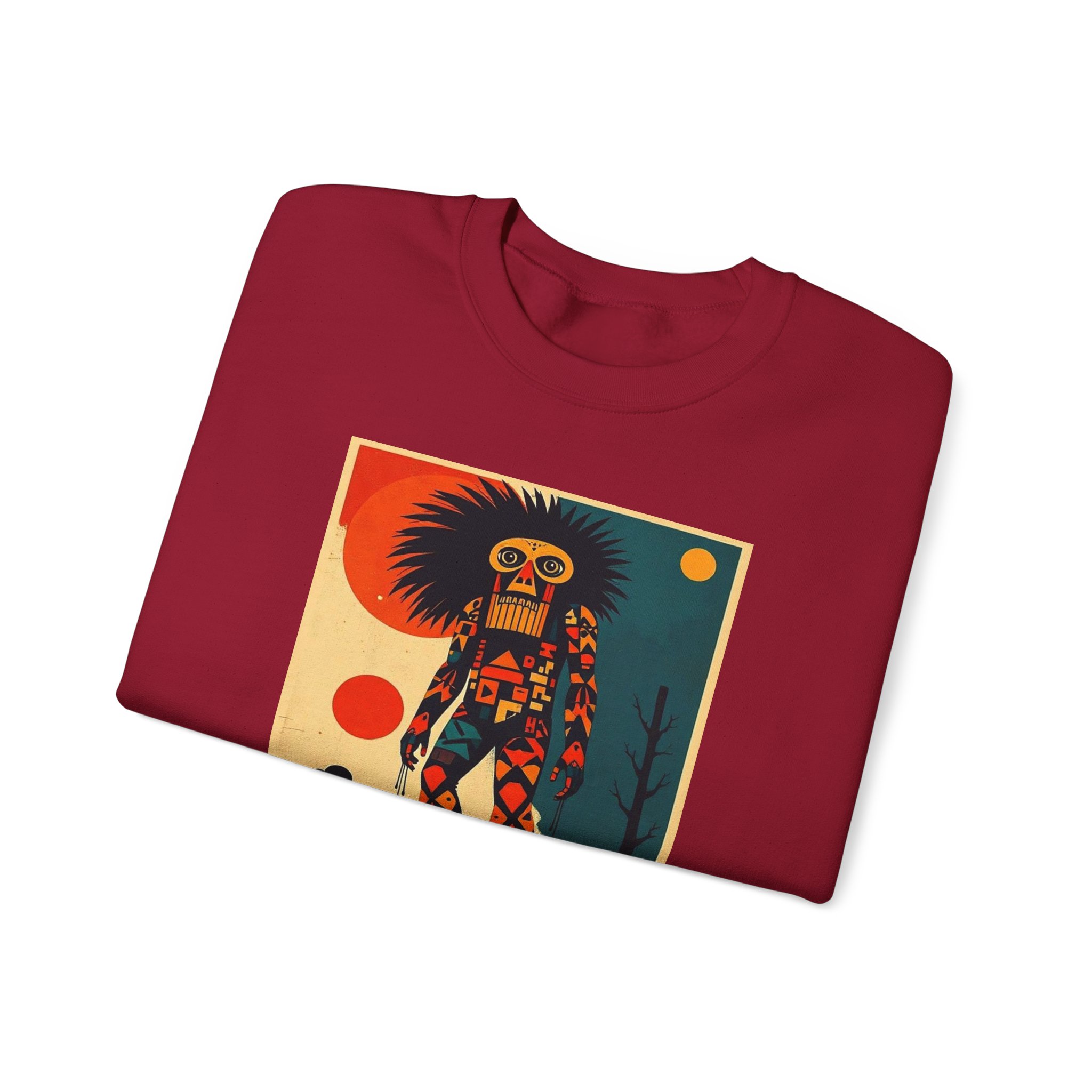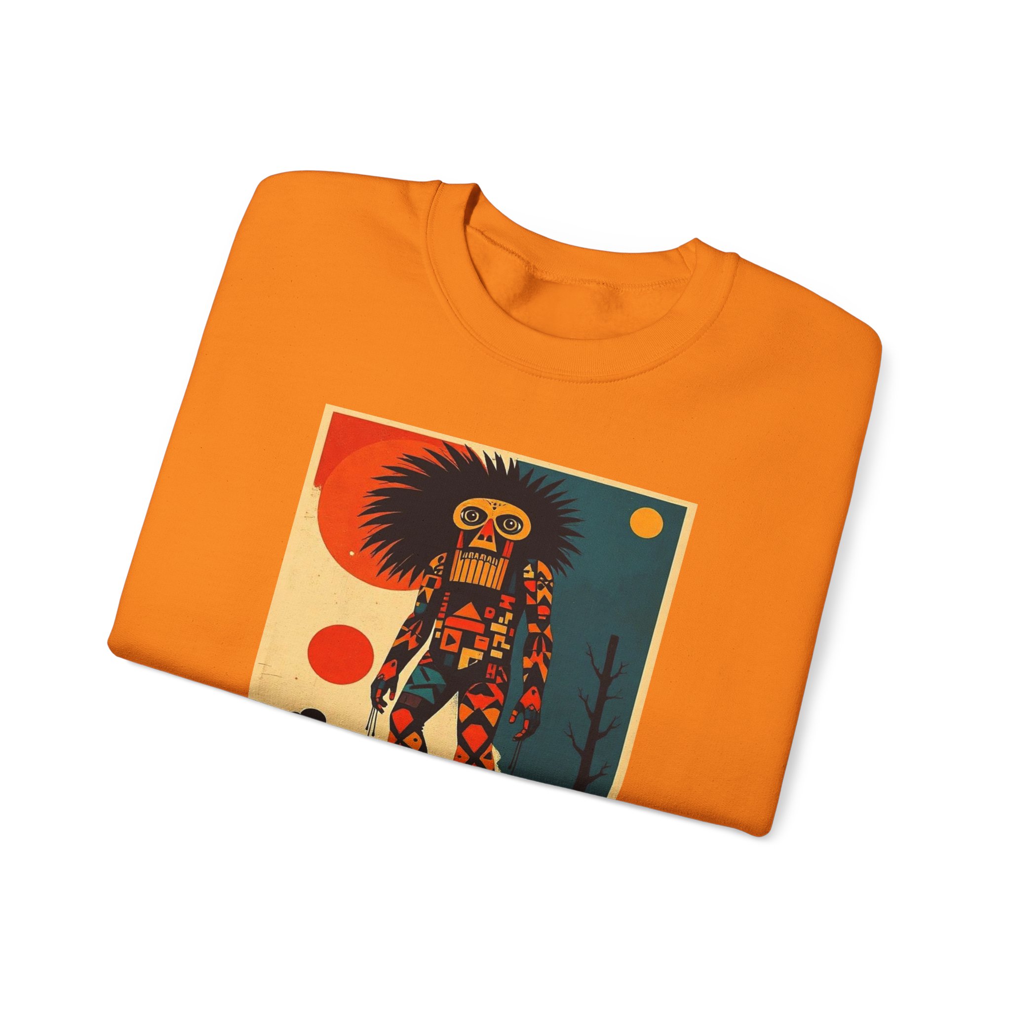 This vibrant, stylized illustration depicts a surreal, geometric humanoid figure standing against a desert-like landscape with red circular elements and a yellow moon. The character has a skull-like head with large, round eyes and a spiky black hair or headdress, constructed from angular geometric shapes in bold orange, red, and teal colors. Its body is covered in intricate, mosaic-like patterns that create a fragmented, cubist aesthetic reminiscent of mid-20th century graphic design and indigenous art styles. The background features stark, leafless trees and a small silhouetted tree, creating a sense of desolation and contrast with the dynamic figure. The artwork employs a limited color palette of orange, red, teal, yellow, and black, giving it a striking, poster-like quality with a vintage graphic art feel.