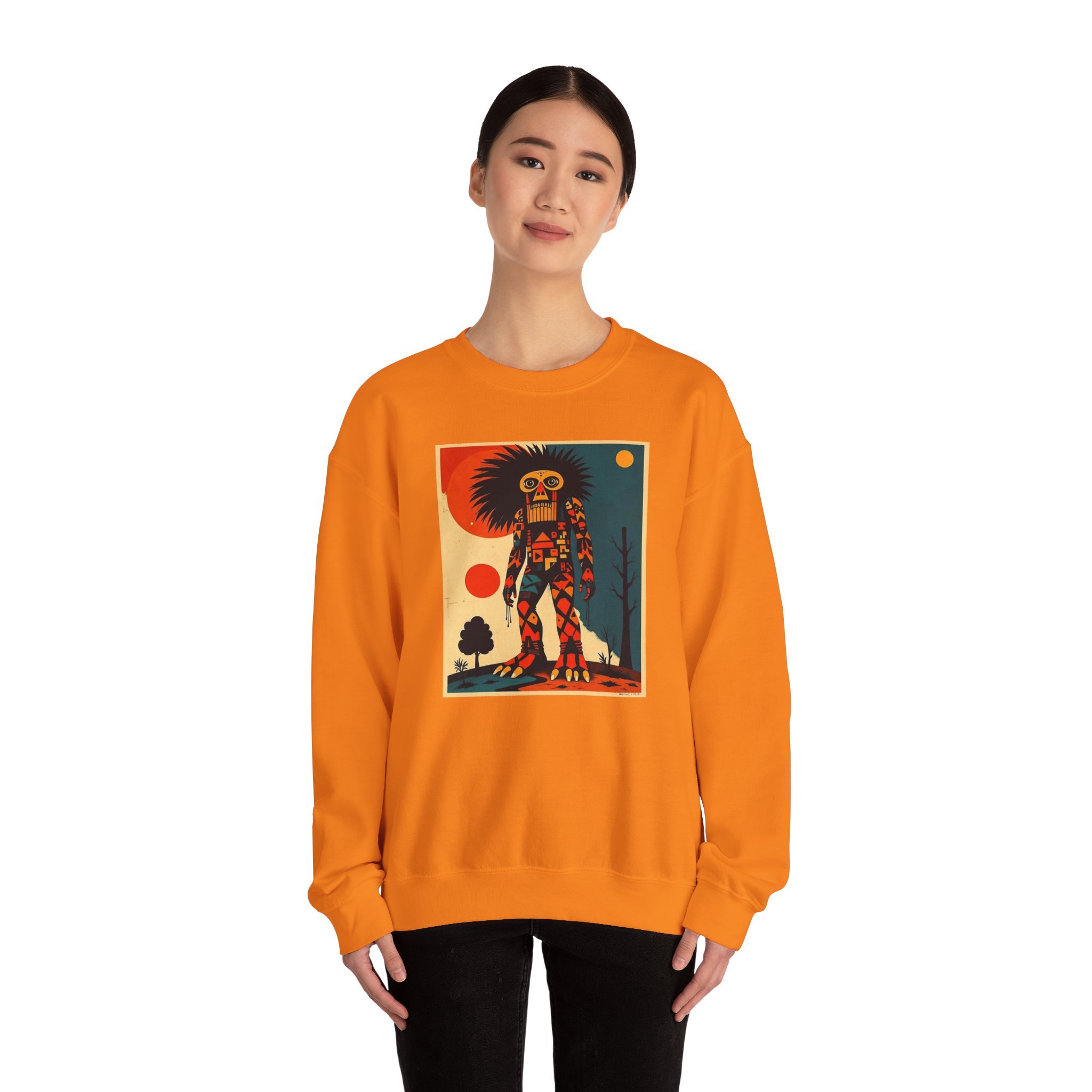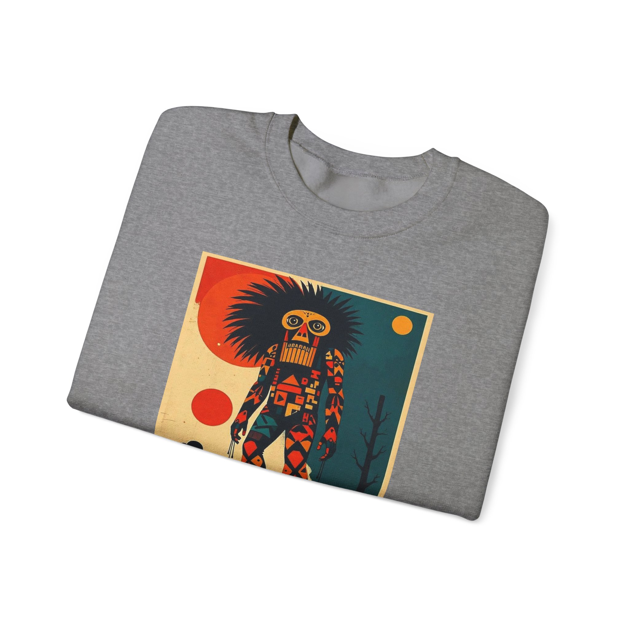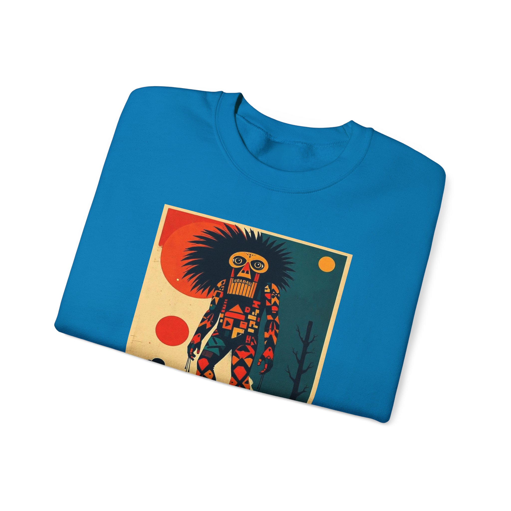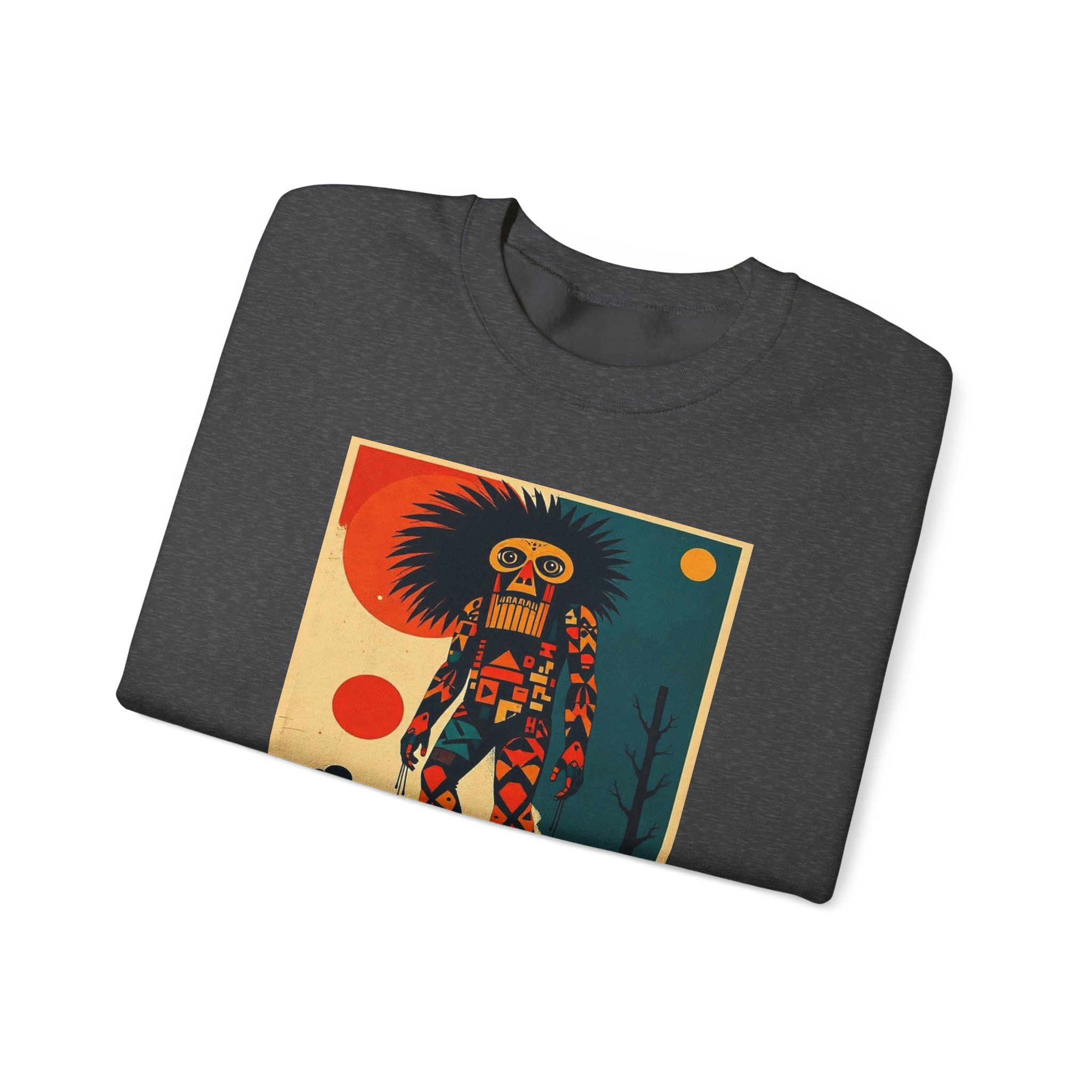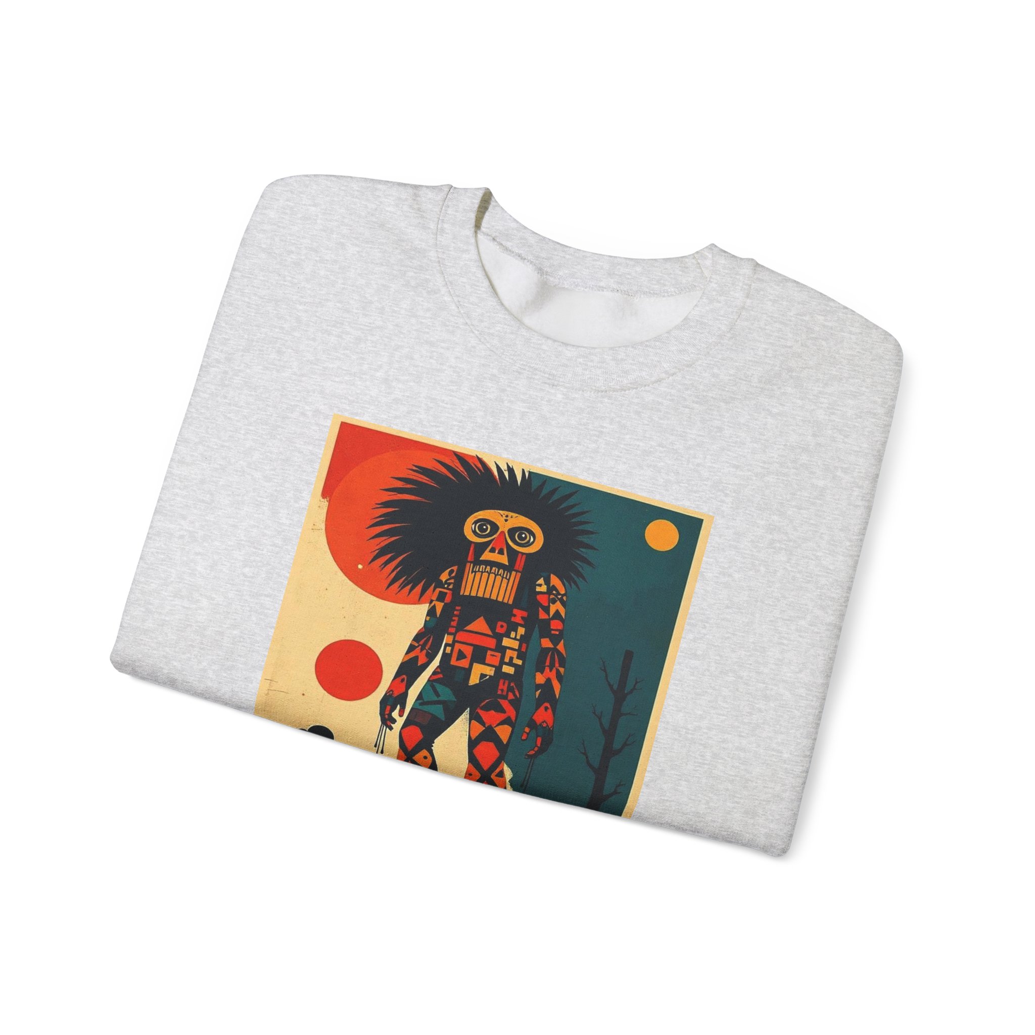 This vibrant, stylized illustration depicts a surreal, geometric humanoid figure standing against a desert-like landscape with red circular elements and a yellow moon. The character has a skull-like head with large, round eyes and a spiky black hair or headdress, constructed from angular geometric shapes in bold orange, red, and teal colors. Its body is covered in intricate, mosaic-like patterns that create a fragmented, cubist aesthetic reminiscent of mid-20th century graphic design and indigenous art styles. The background features stark, leafless trees and a small silhouetted tree, creating a sense of desolation and contrast with the dynamic figure. The artwork employs a limited color palette of orange, red, teal, yellow, and black, giving it a striking, poster-like quality with a vintage graphic art feel.