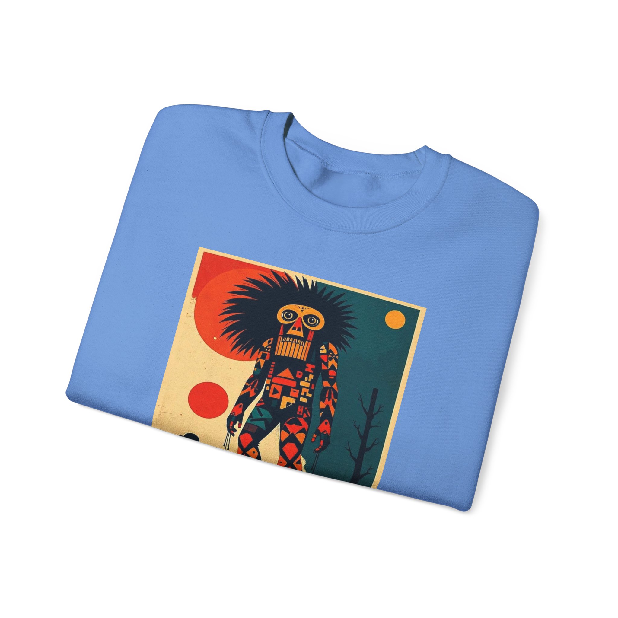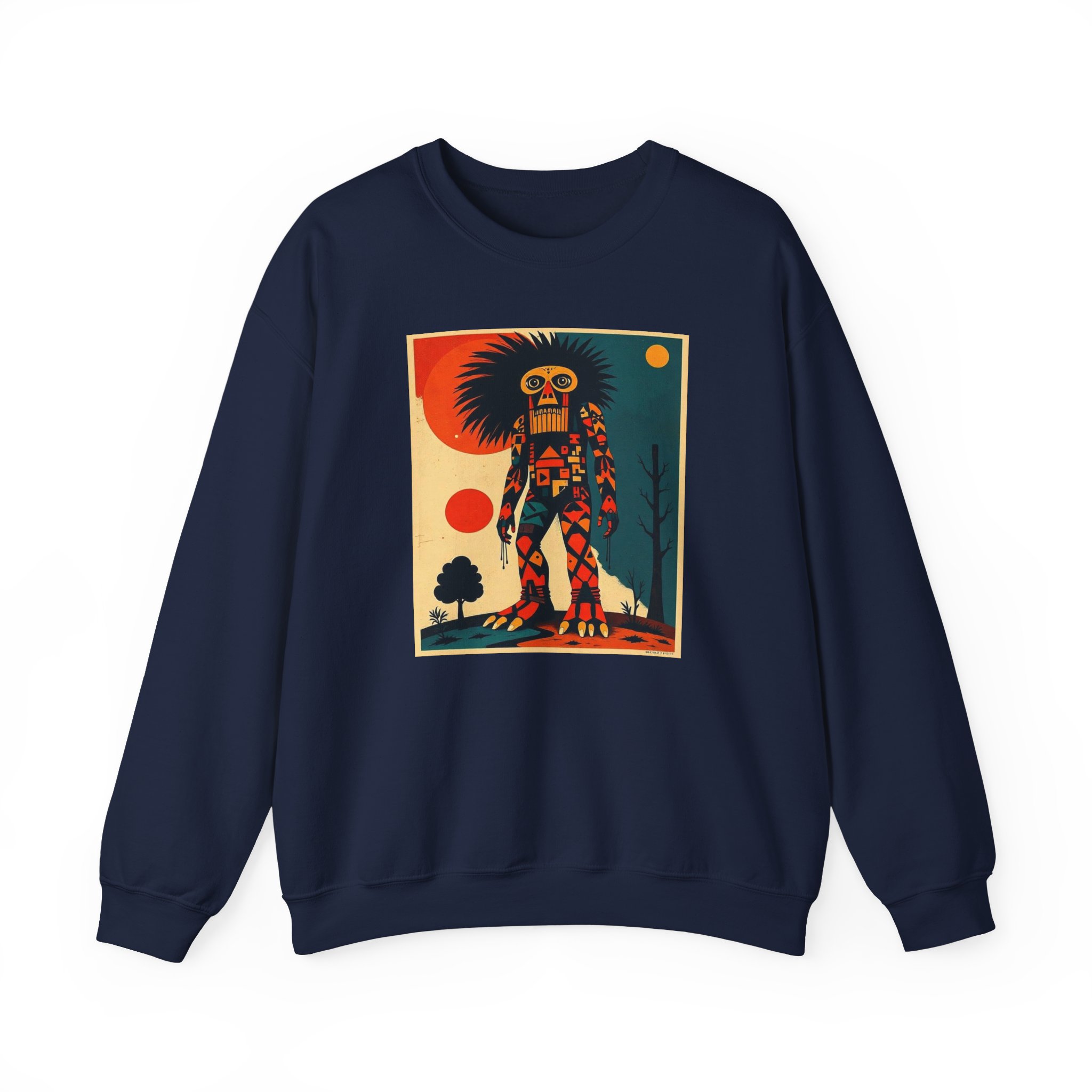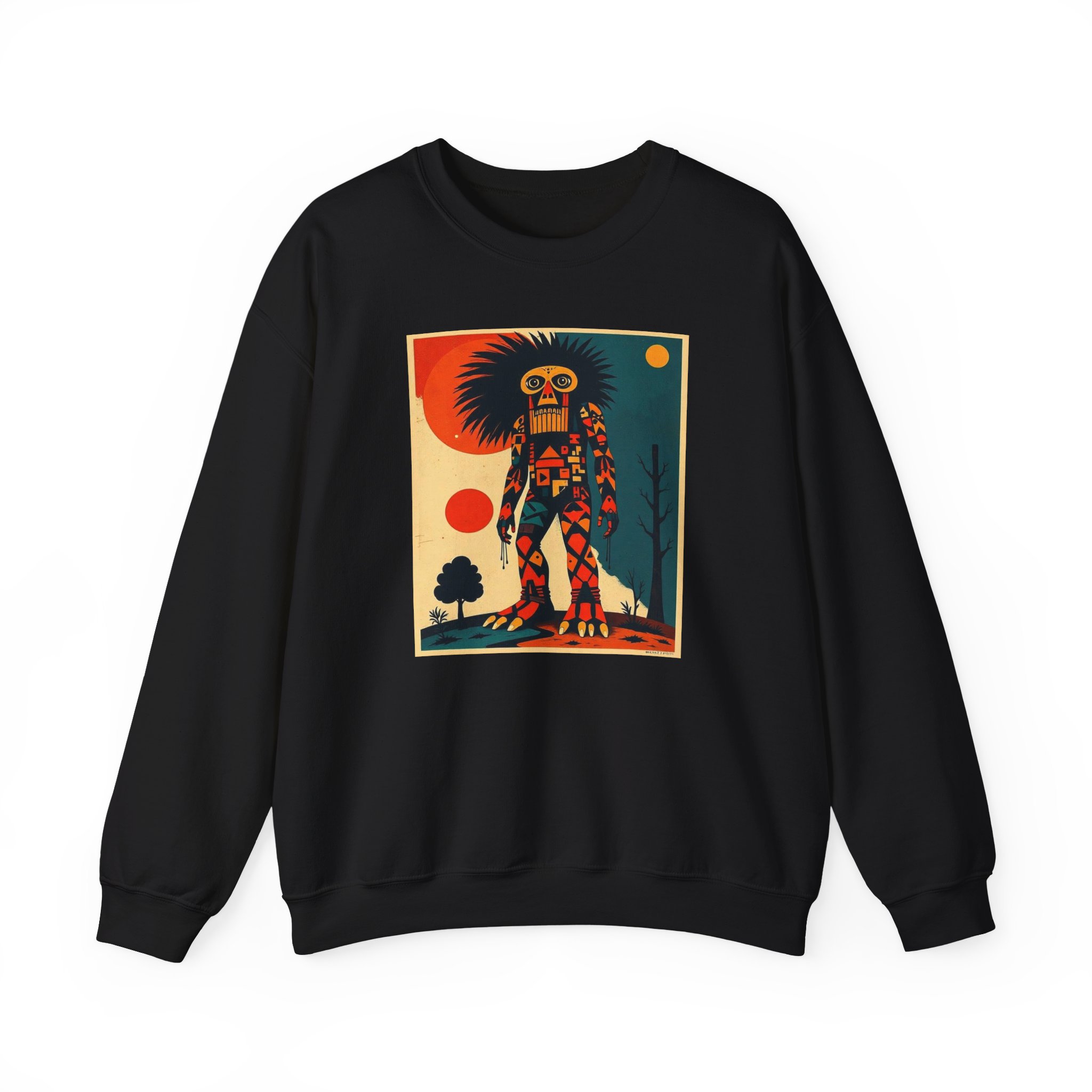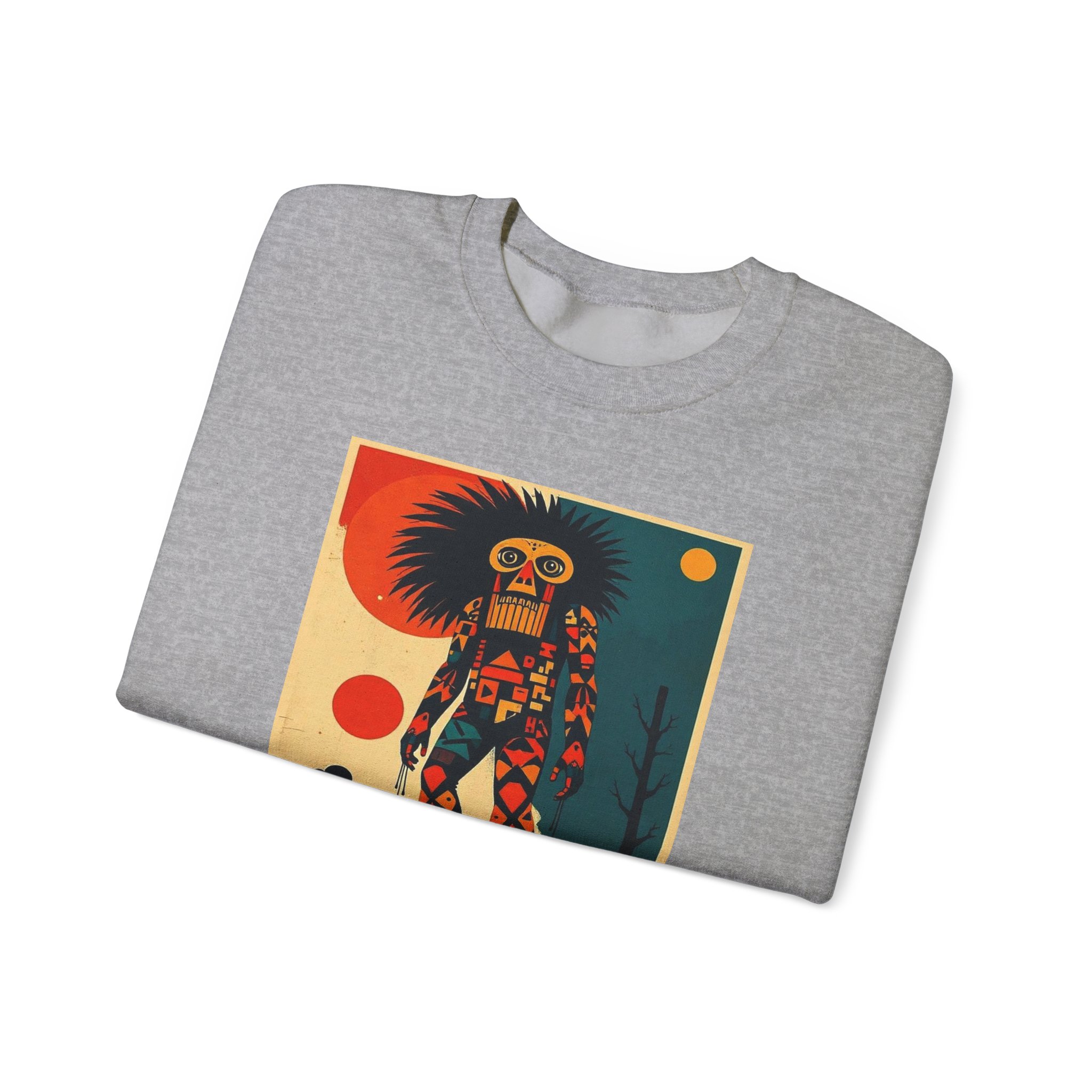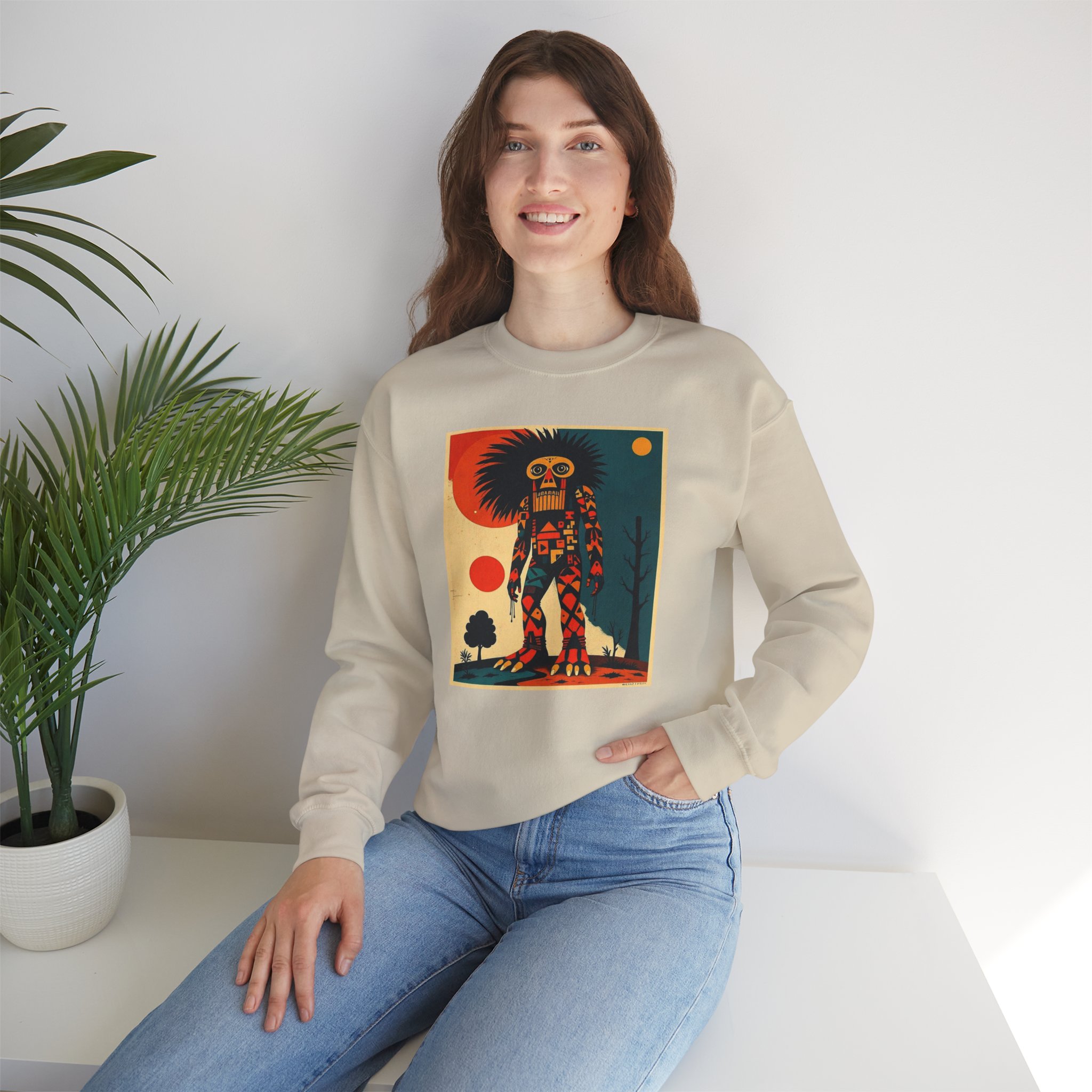 This vibrant, stylized illustration depicts a surreal, geometric humanoid figure standing against a desert-like landscape with red circular elements and a yellow moon. The character has a skull-like head with large, round eyes and a spiky black hair or headdress, constructed from angular geometric shapes in bold orange, red, and teal colors. Its body is covered in intricate, mosaic-like patterns that create a fragmented, cubist aesthetic reminiscent of mid-20th century graphic design and indigenous art styles. The background features stark, leafless trees and a small silhouetted tree, creating a sense of desolation and contrast with the dynamic figure. The artwork employs a limited color palette of orange, red, teal, yellow, and black, giving it a striking, poster-like quality with a vintage graphic art feel.