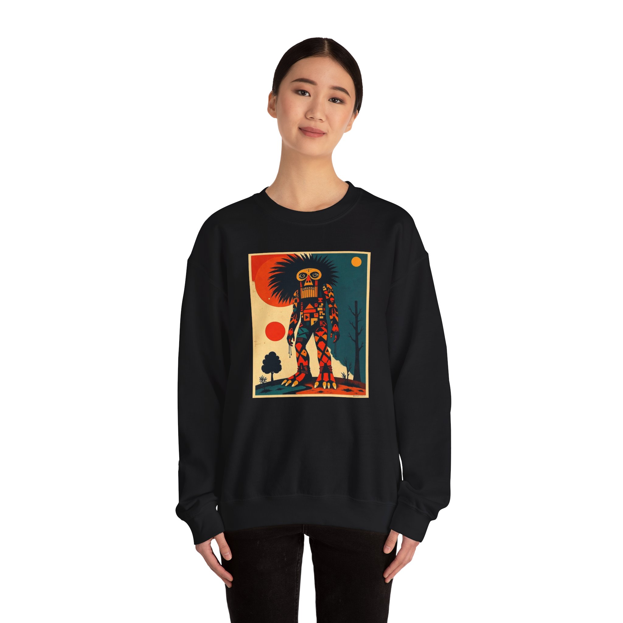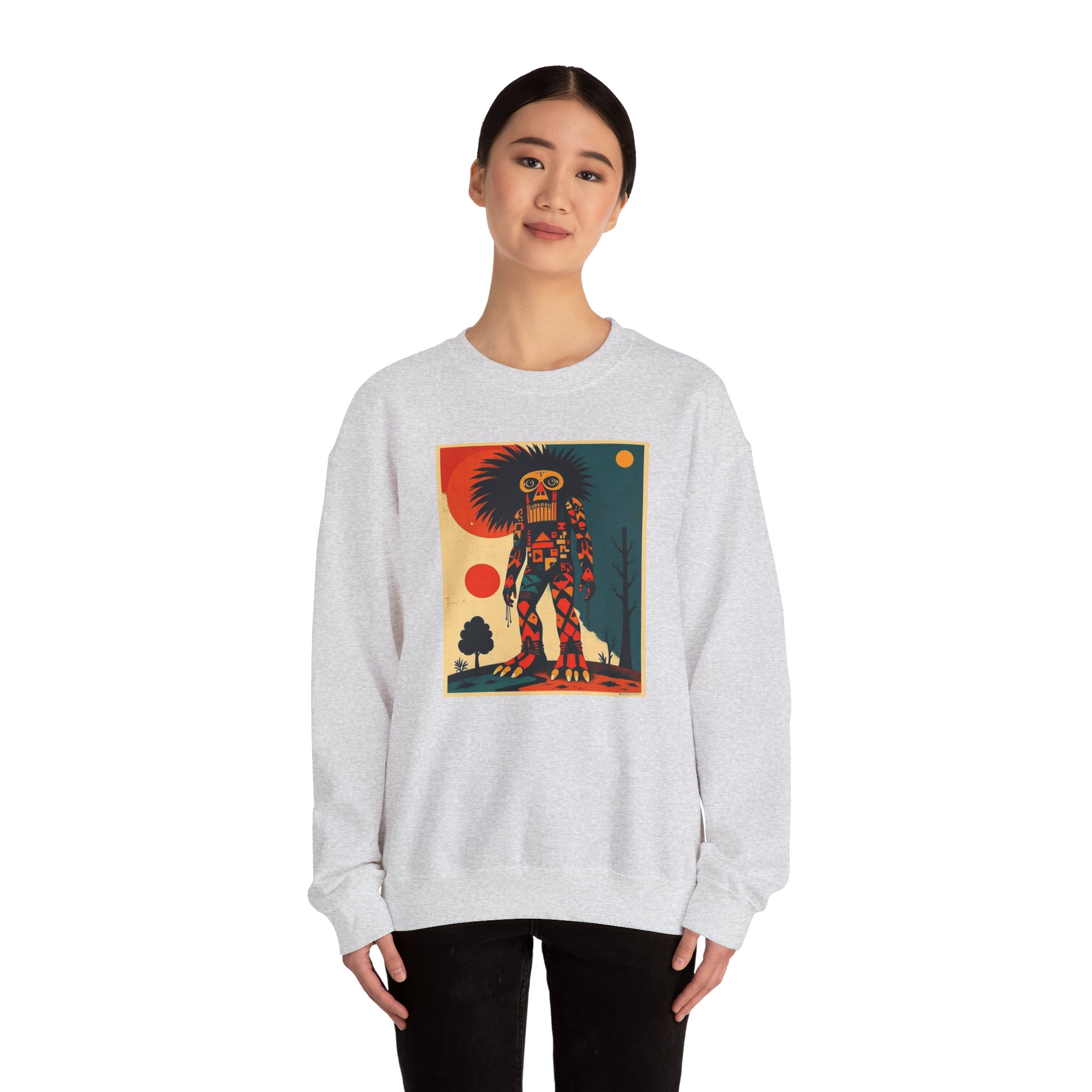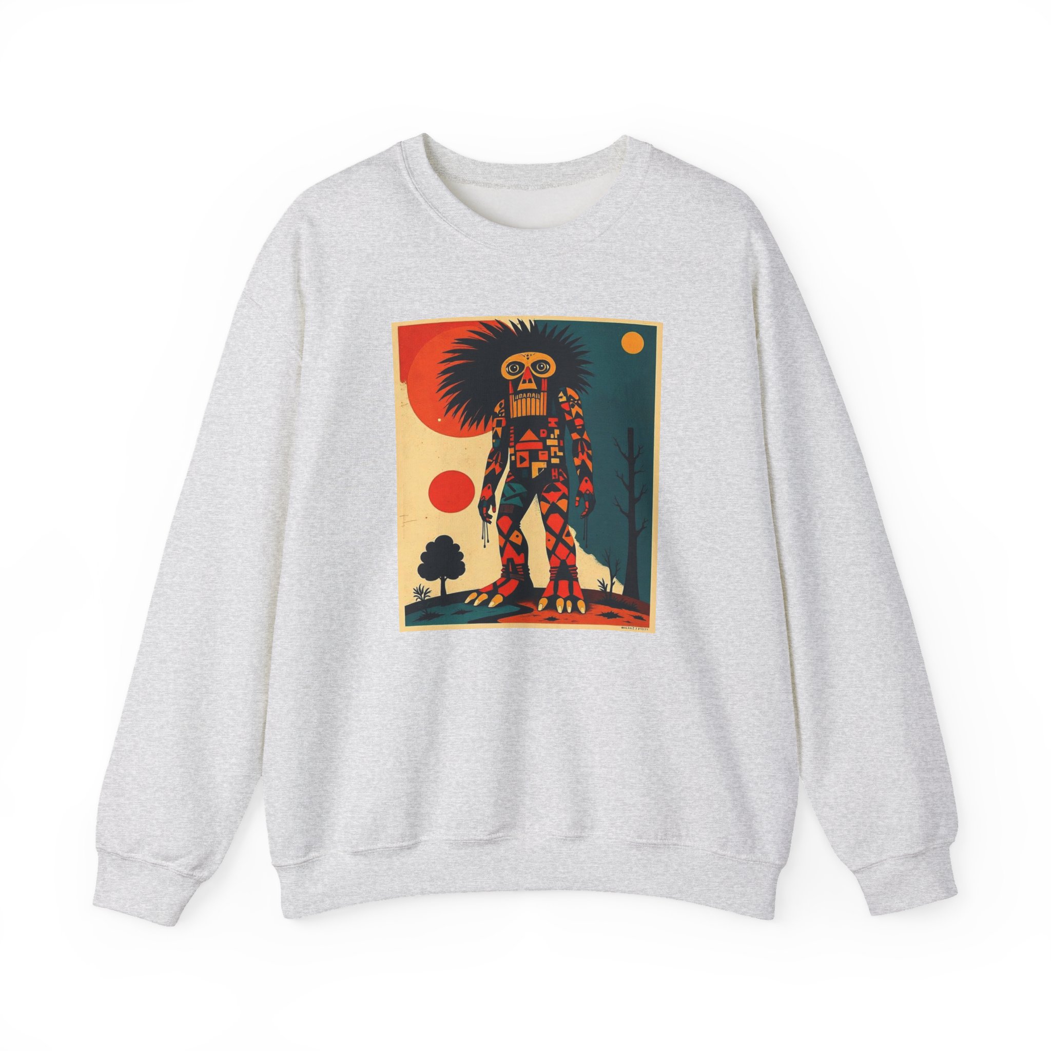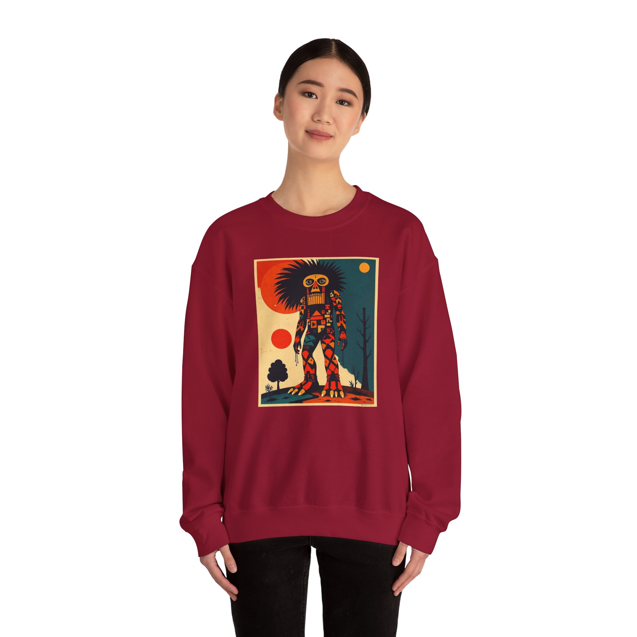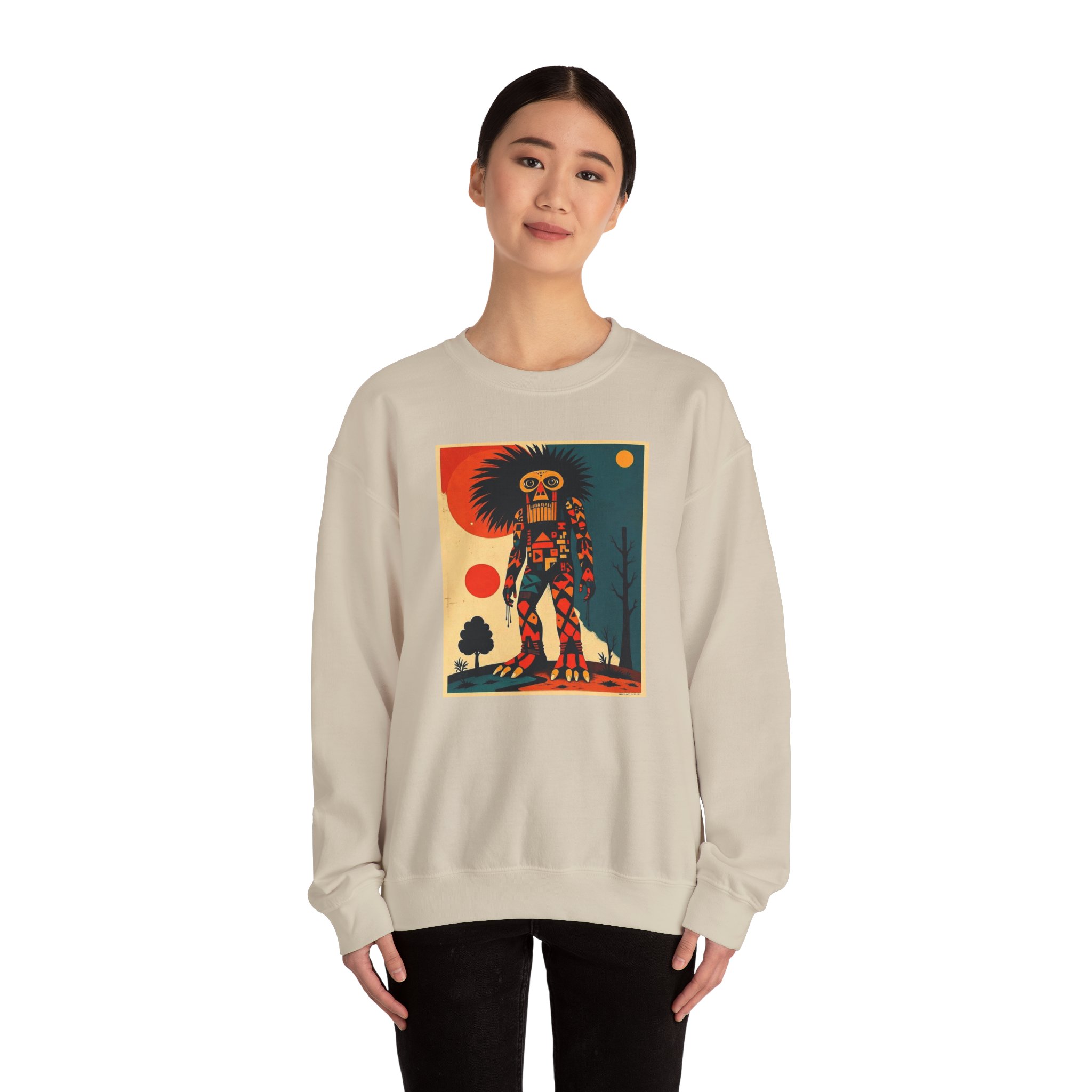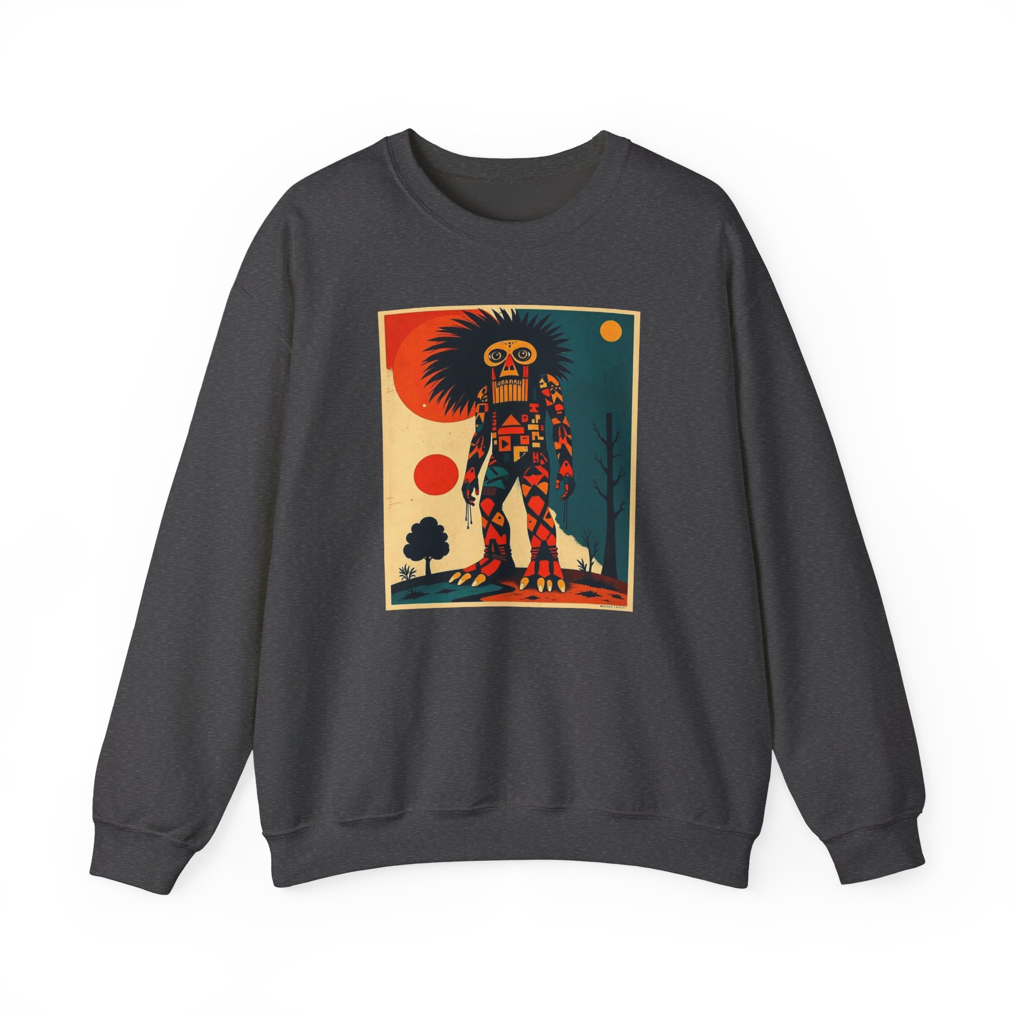 This vibrant, stylized illustration depicts a surreal, geometric humanoid figure standing against a desert-like landscape with red circular elements and a yellow moon. The character has a skull-like head with large, round eyes and a spiky black hair or headdress, constructed from angular geometric shapes in bold orange, red, and teal colors. Its body is covered in intricate, mosaic-like patterns that create a fragmented, cubist aesthetic reminiscent of mid-20th century graphic design and indigenous art styles. The background features stark, leafless trees and a small silhouetted tree, creating a sense of desolation and contrast with the dynamic figure. The artwork employs a limited color palette of orange, red, teal, yellow, and black, giving it a striking, poster-like quality with a vintage graphic art feel.