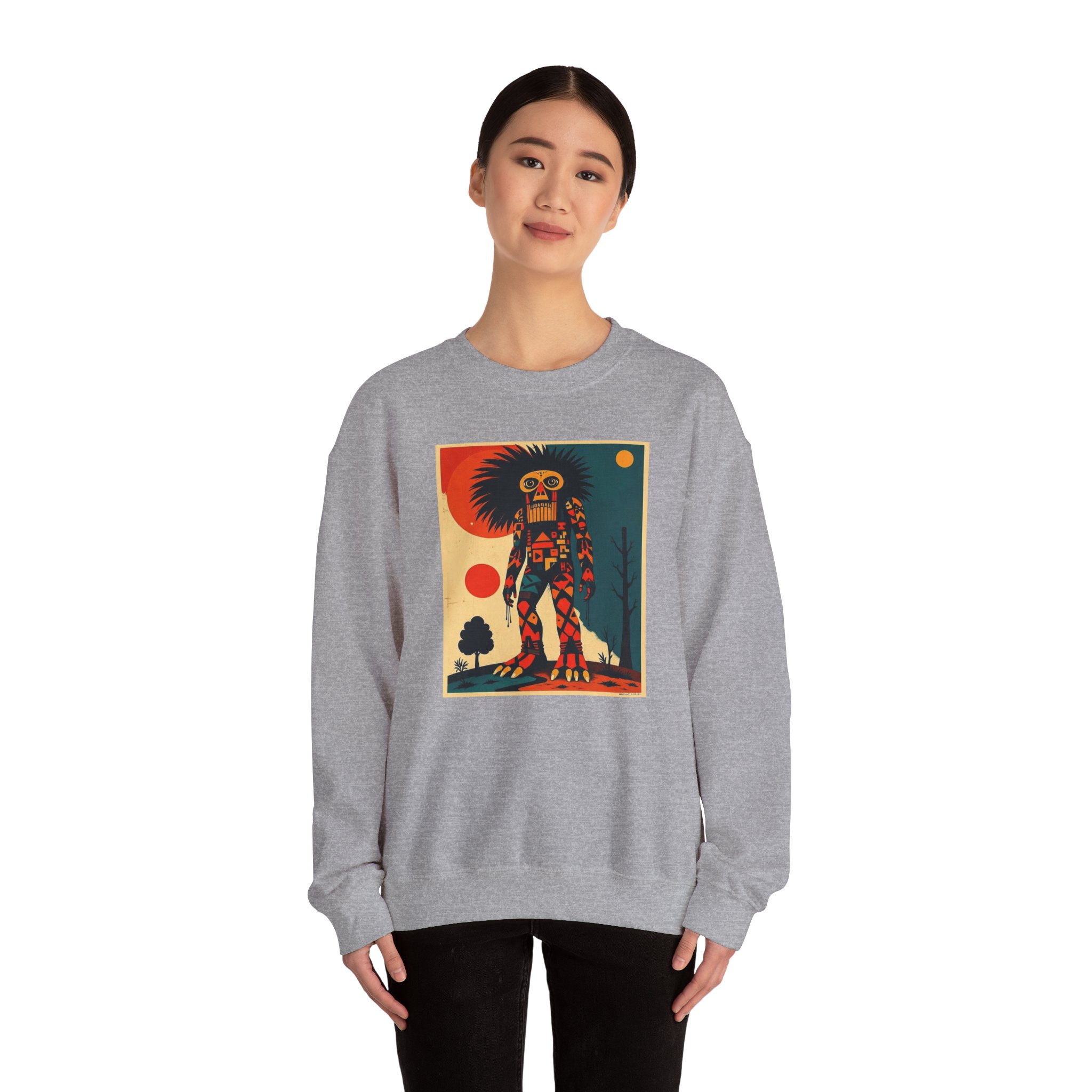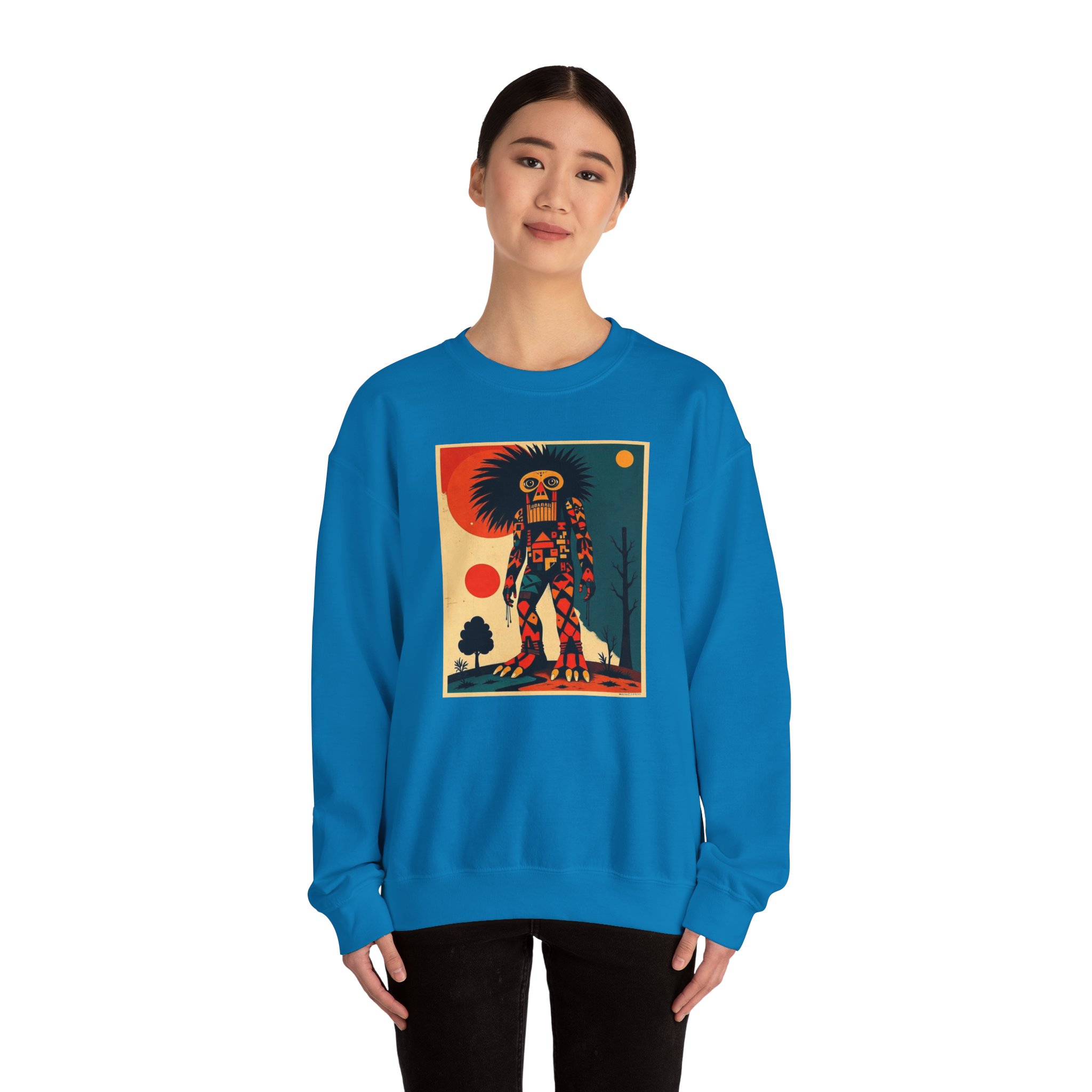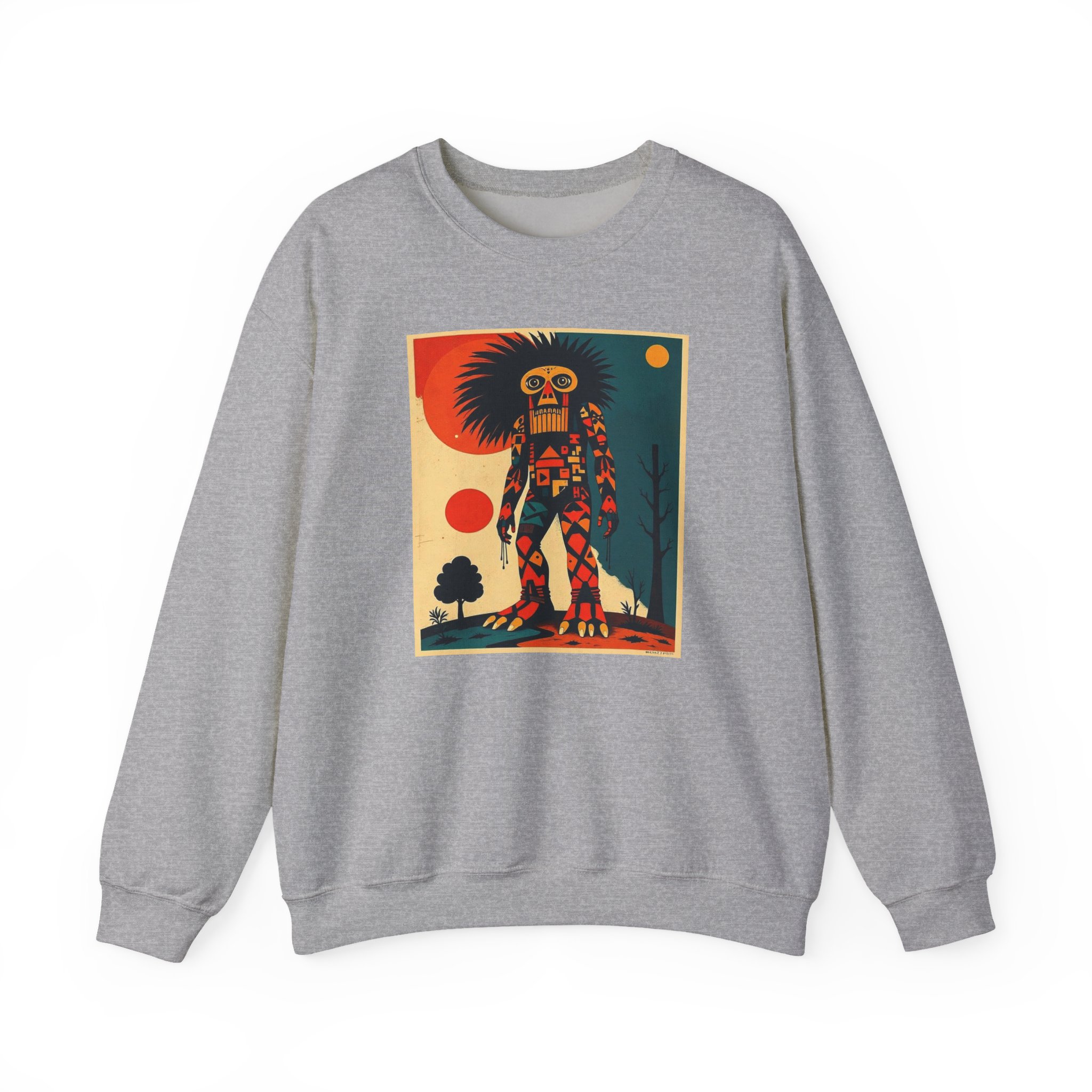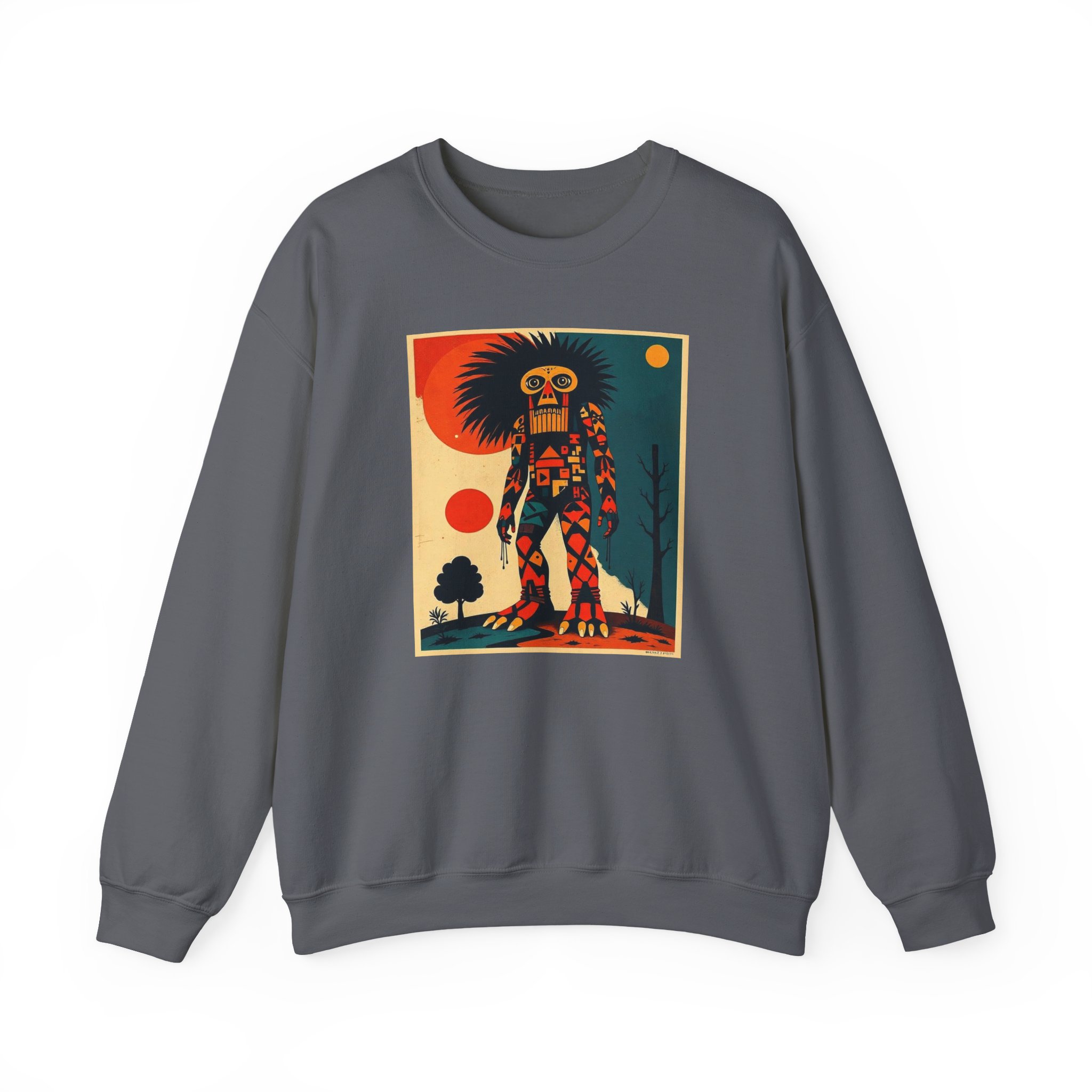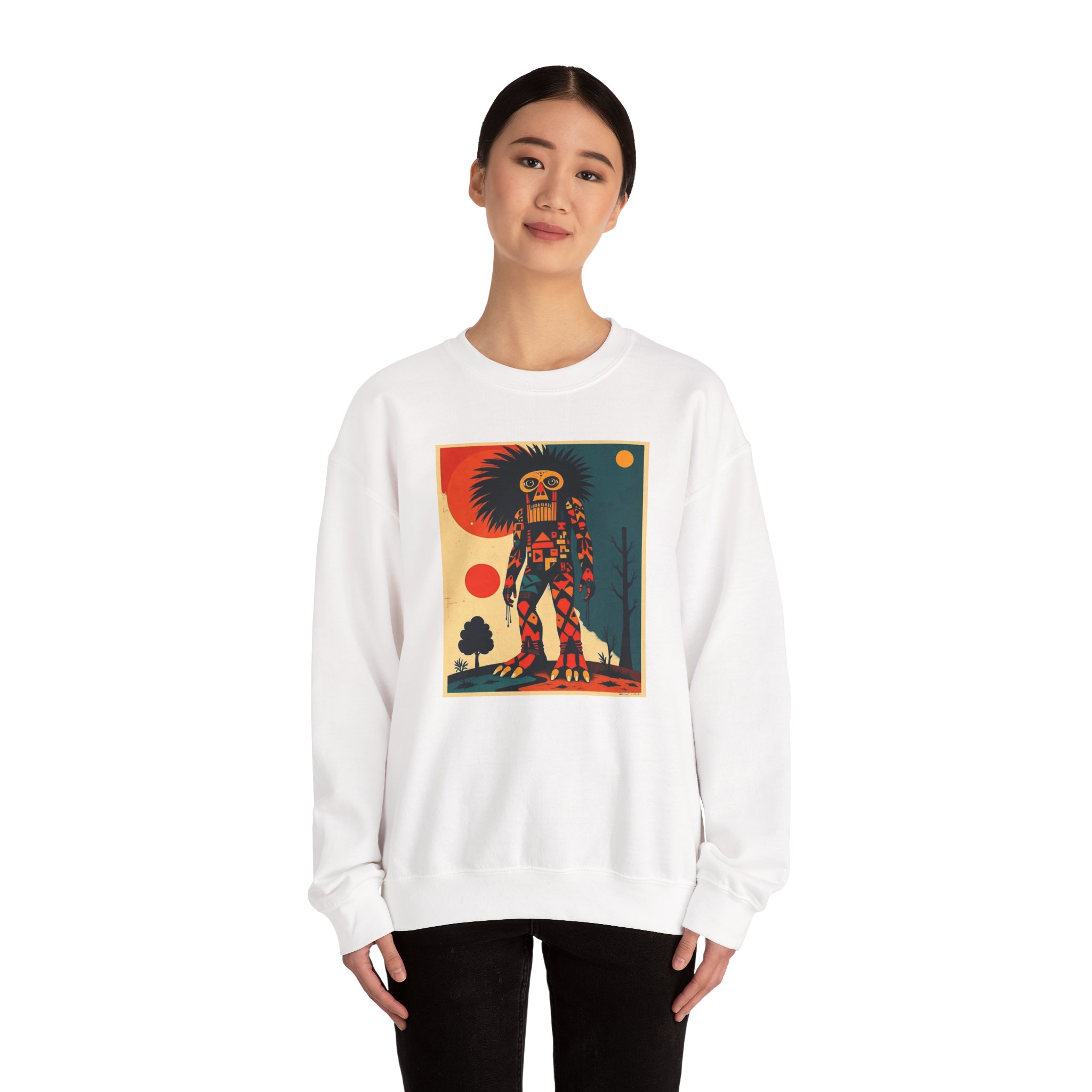 This vibrant, stylized illustration depicts a surreal, geometric humanoid figure standing against a desert-like landscape with red circular elements and a yellow moon. The character has a skull-like head with large, round eyes and a spiky black hair or headdress, constructed from angular geometric shapes in bold orange, red, and teal colors. Its body is covered in intricate, mosaic-like patterns that create a fragmented, cubist aesthetic reminiscent of mid-20th century graphic design and indigenous art styles. The background features stark, leafless trees and a small silhouetted tree, creating a sense of desolation and contrast with the dynamic figure. The artwork employs a limited color palette of orange, red, teal, yellow, and black, giving it a striking, poster-like quality with a vintage graphic art feel.