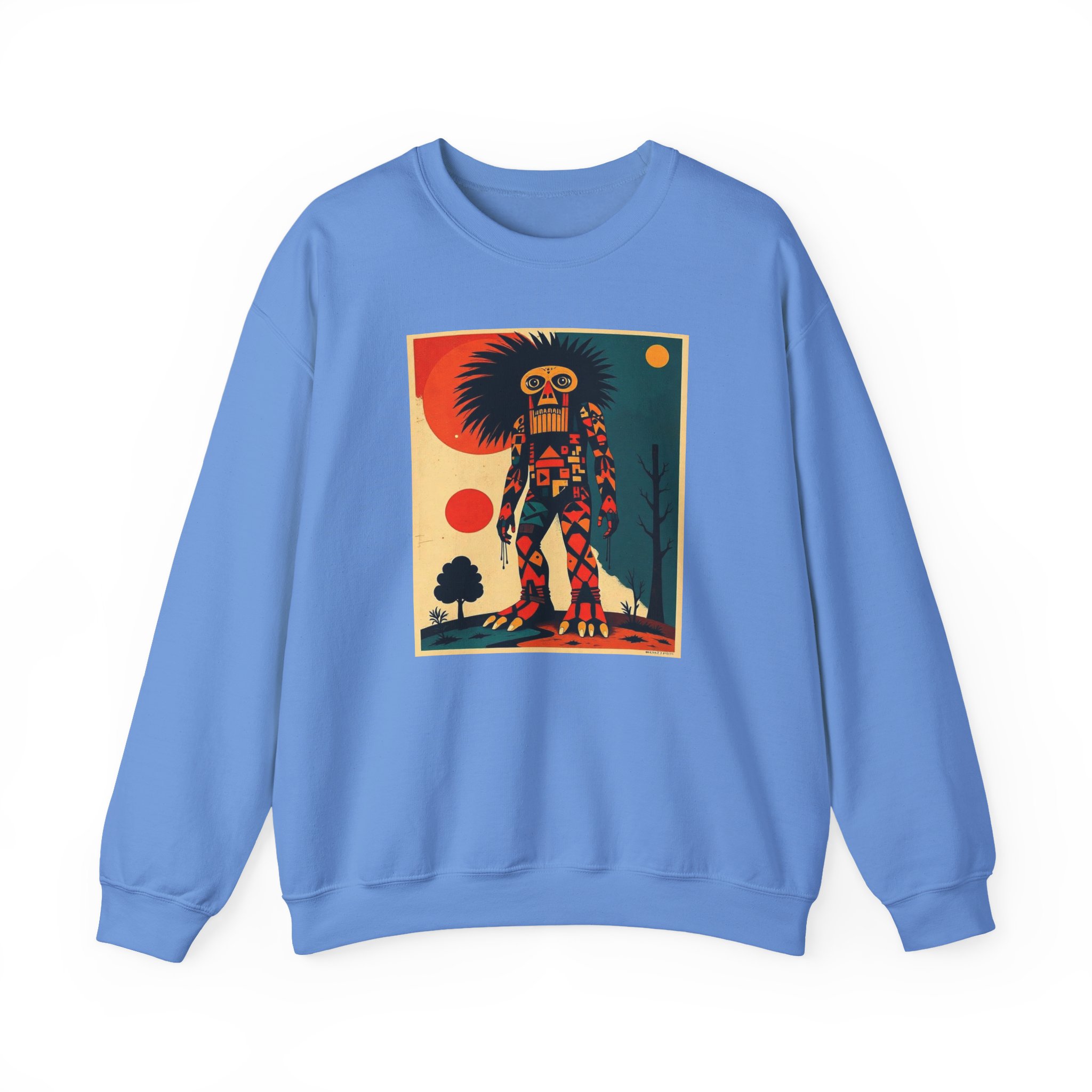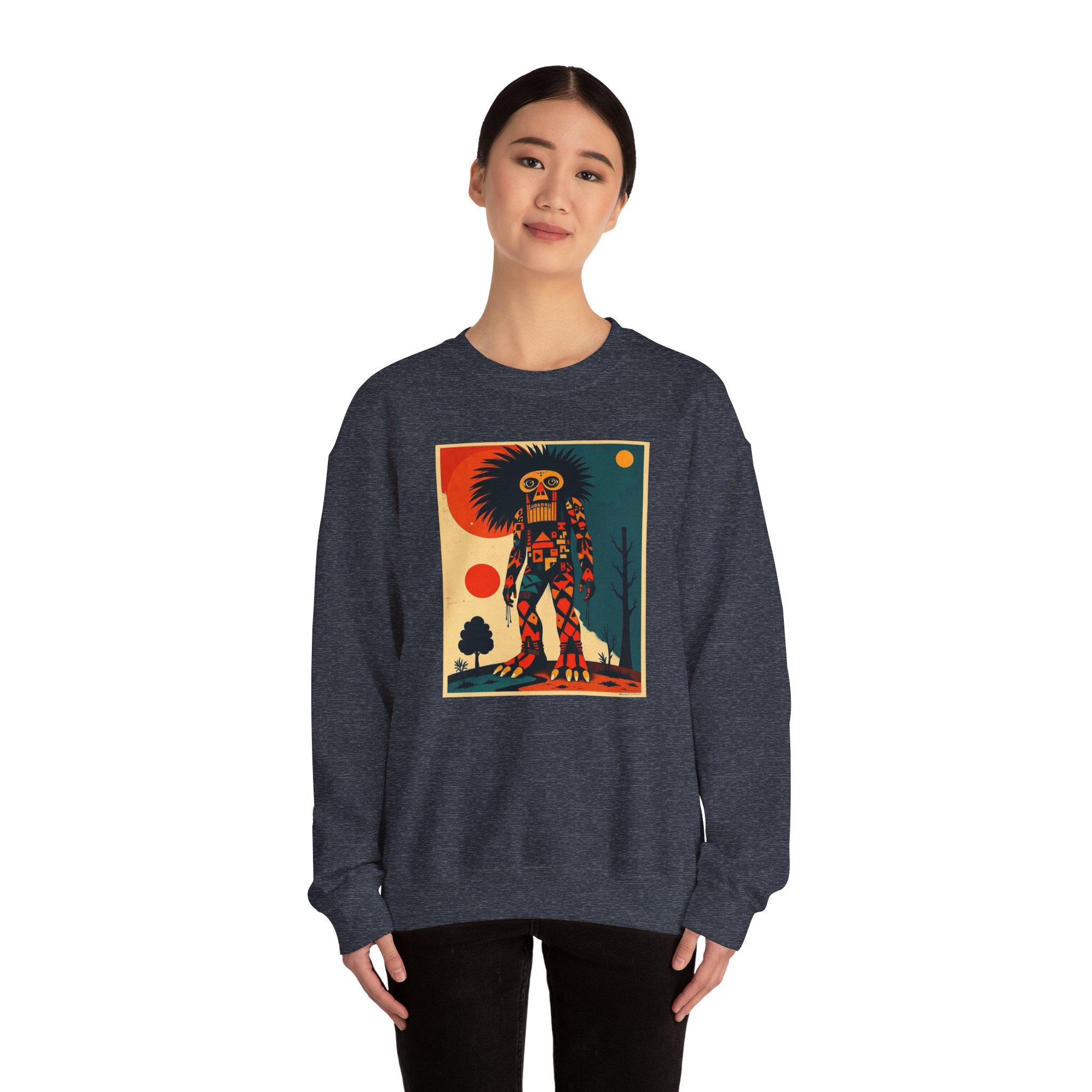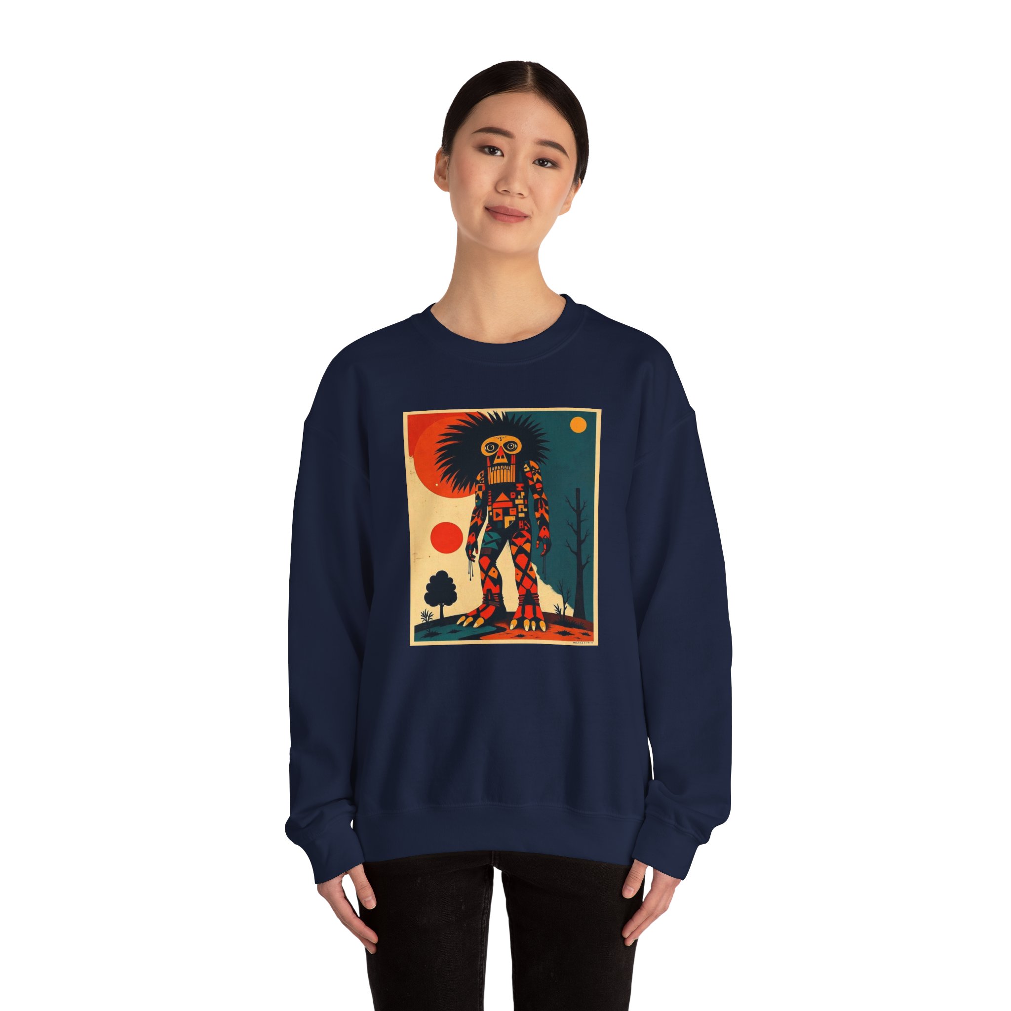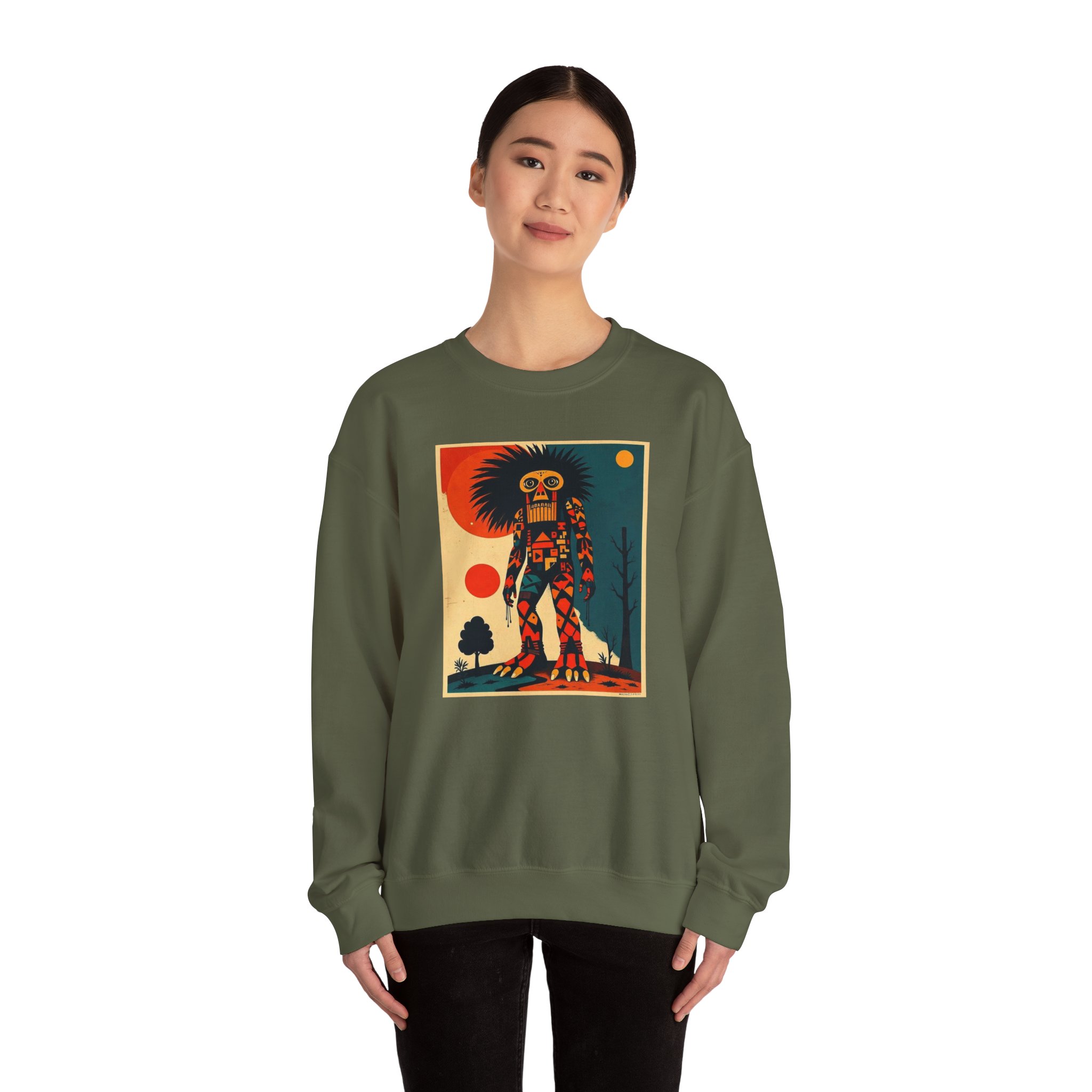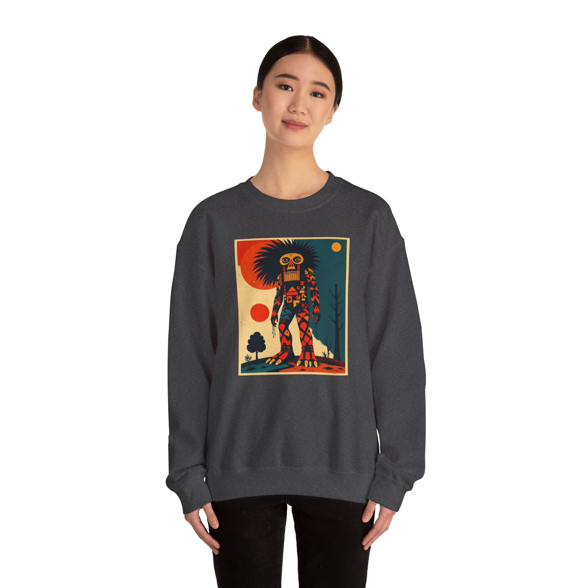 This vibrant, stylized illustration depicts a surreal, geometric humanoid figure standing against a desert-like landscape with red circular elements and a yellow moon. The character has a skull-like head with large, round eyes and a spiky black hair or headdress, constructed from angular geometric shapes in bold orange, red, and teal colors. Its body is covered in intricate, mosaic-like patterns that create a fragmented, cubist aesthetic reminiscent of mid-20th century graphic design and indigenous art styles. The background features stark, leafless trees and a small silhouetted tree, creating a sense of desolation and contrast with the dynamic figure. The artwork employs a limited color palette of orange, red, teal, yellow, and black, giving it a striking, poster-like quality with a vintage graphic art feel.