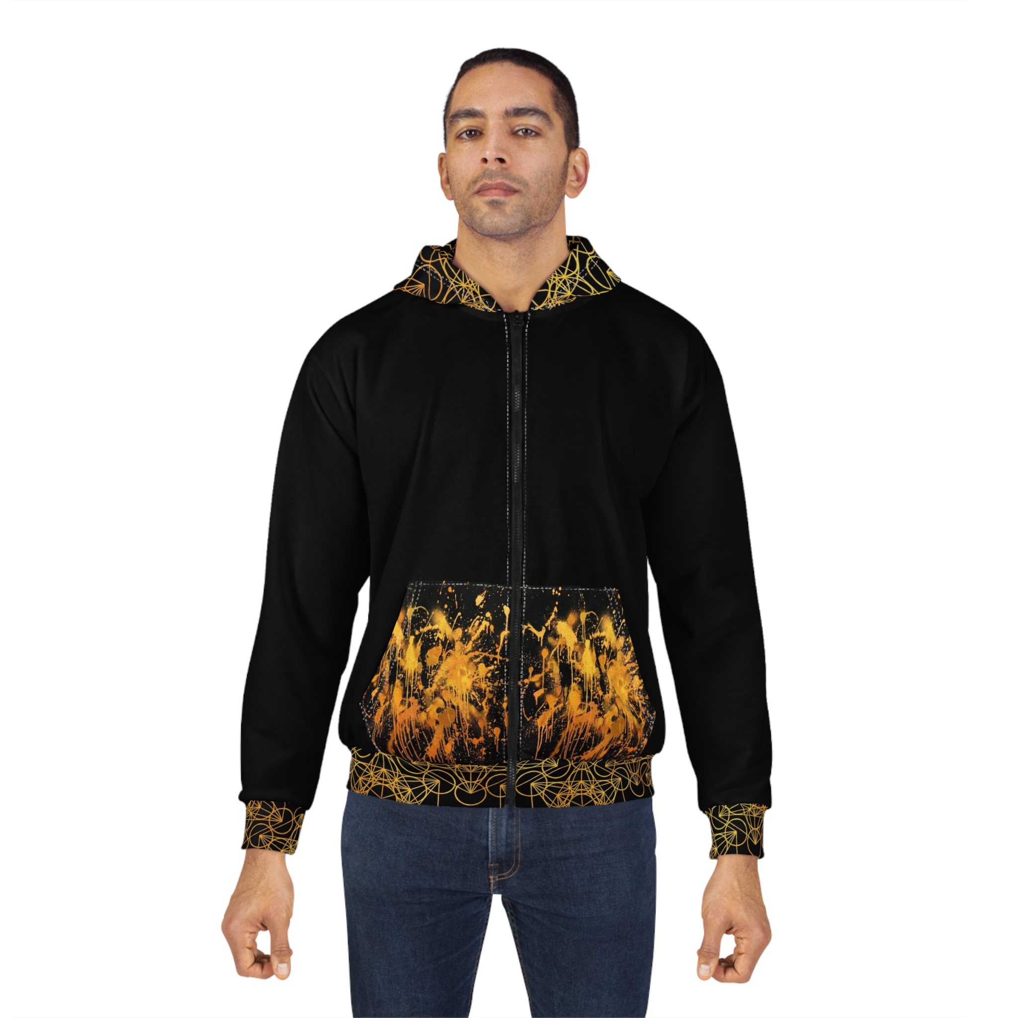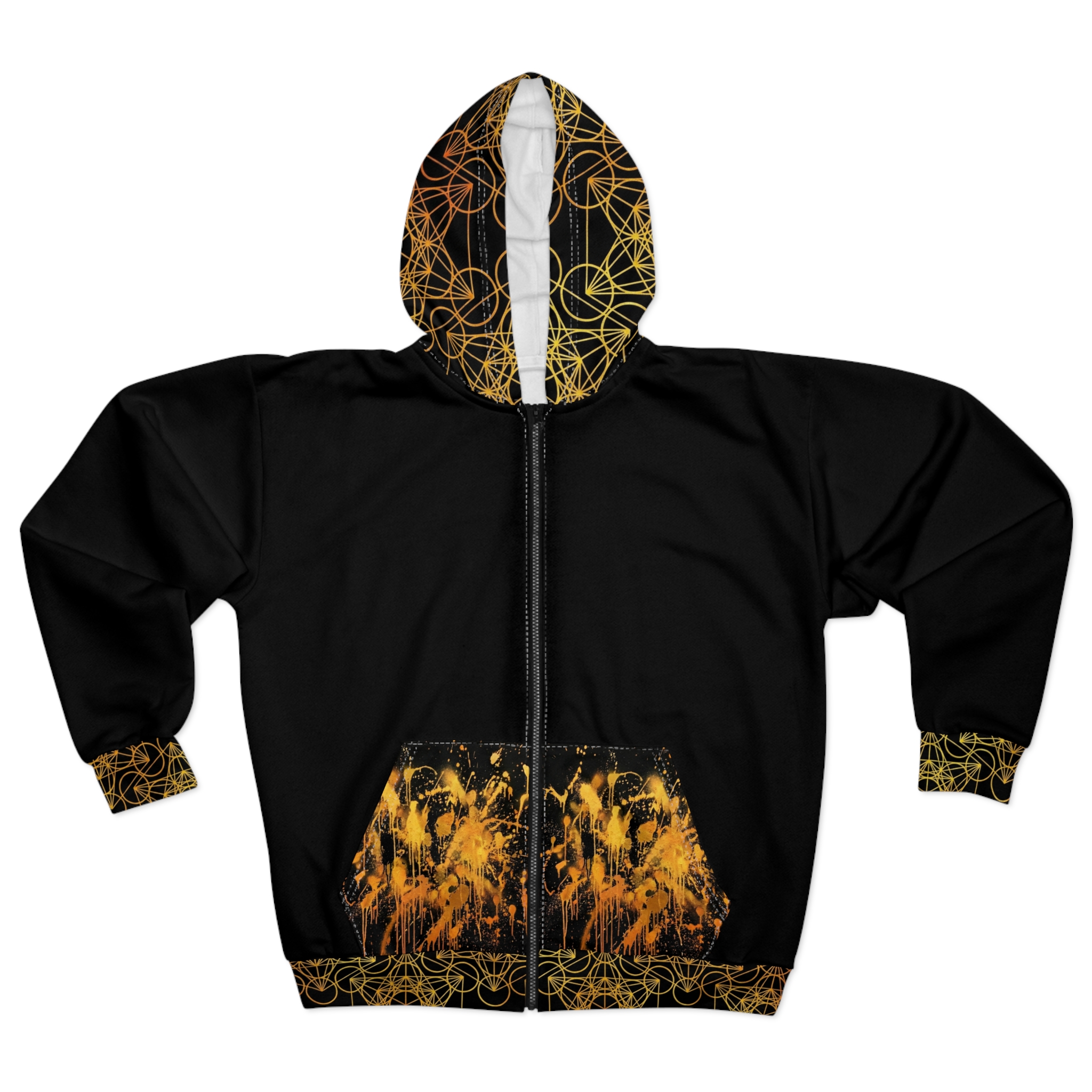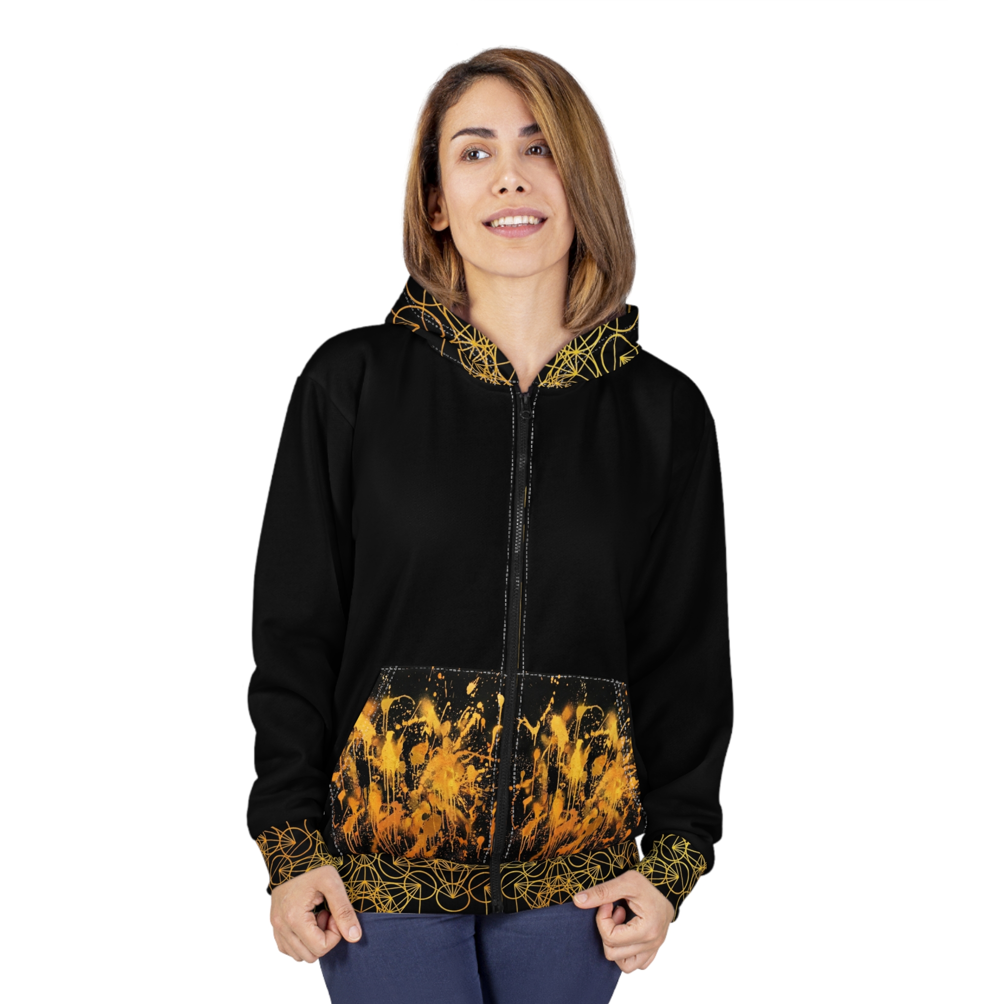 This hoodie feels like stepping into a midnight lab where curiosity runs wild. Vivid alien paint swirls across every inch, a riot of color that refuses to hide. Slip it on and your hands find the roomy front pockets while the medium-weight fabric holds a steady, comfortable warmth. The stretched, all-over print keeps the artwork uninterrupted — like wearing a secret experiment that only you and fellow night-owl explorers will notice. It settles into a classic fit, hangs right whether you’re sketching designs, wandering city backstreets, or lingering at late gallery openings. The black zipper and clean white stitching give the chaos a little edge, letting the art speak loud without losing structure.