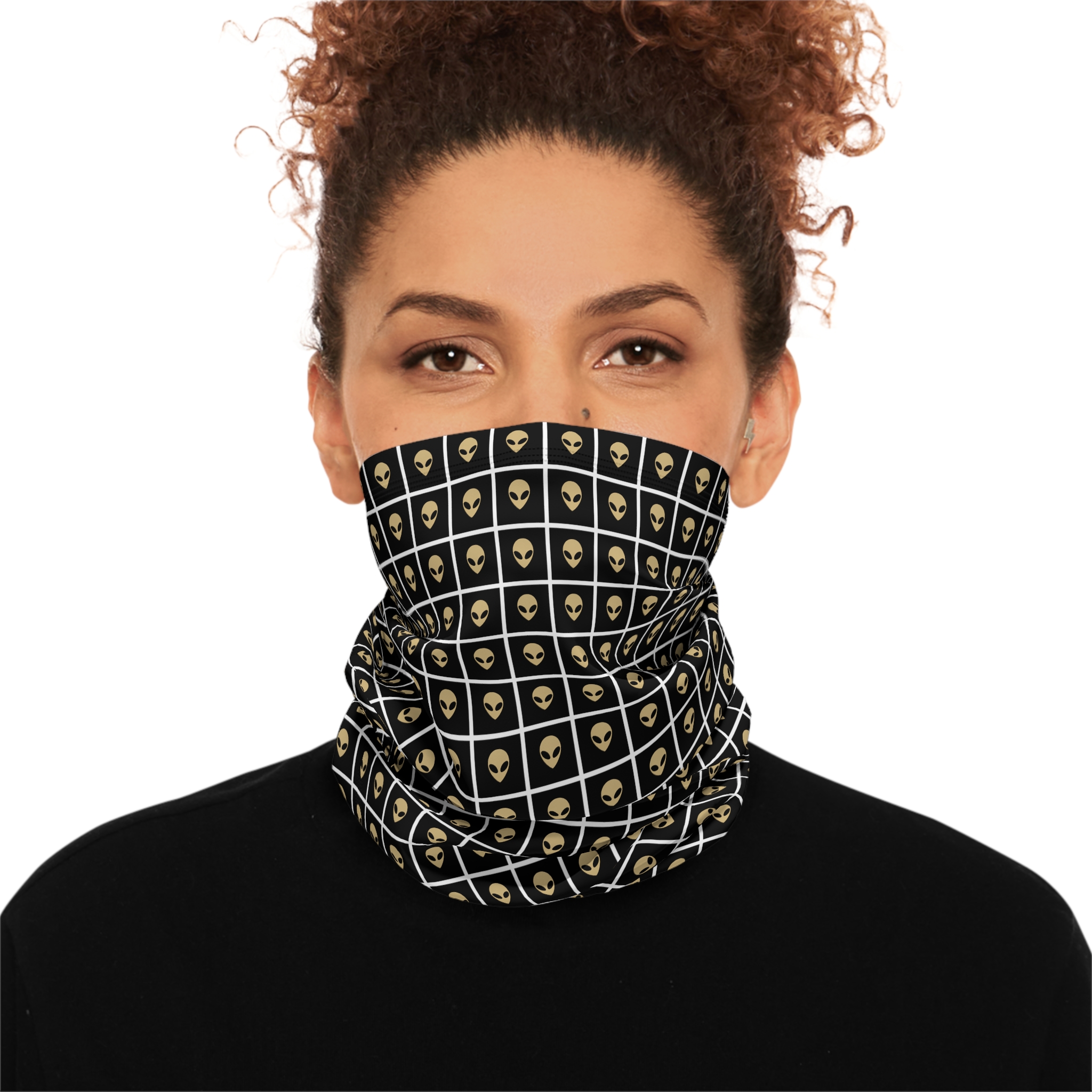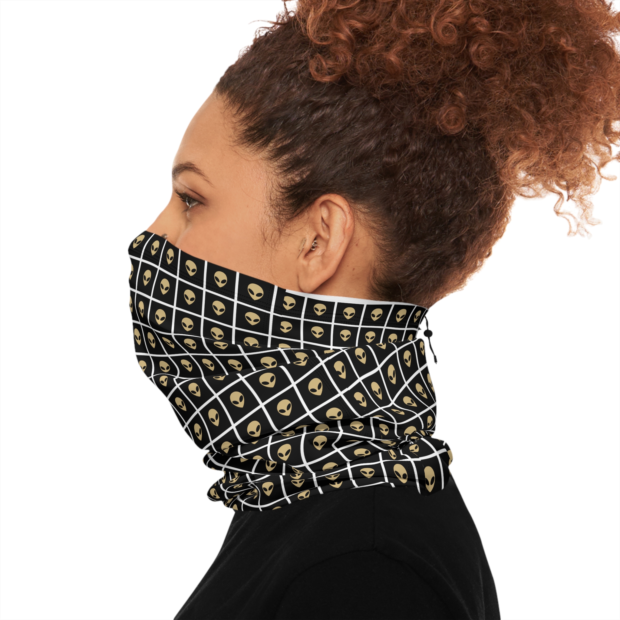 Slip into winter with a neck gaiter that feels like a secret. The deep black fabric carries a subtle gold alien grid pattern—futuristic, slightly rebellious, and quietly bold. Pull it up to shield your face during a snowy morning run, cinch the drawstring for a snug hood while waiting at the trailhead, or wear it loose around your neck as you cross a frosty parking lot. The fleece-like interior warms quickly; the smooth exterior sheds wind and adds a sleek, space-age edge to your cold-weather kit. For outdoor athletes who like to stand out without shouting, and for night commuters who appreciate heat and low-key style, this gaiter blends practical warmth with a touch of otherworldly design. It slips into winter routines effortlessly—layer it under a shell for long days outside, tuck it into a coat pocket between climbs, or use it as a quick face layer on chilly urban evenings.