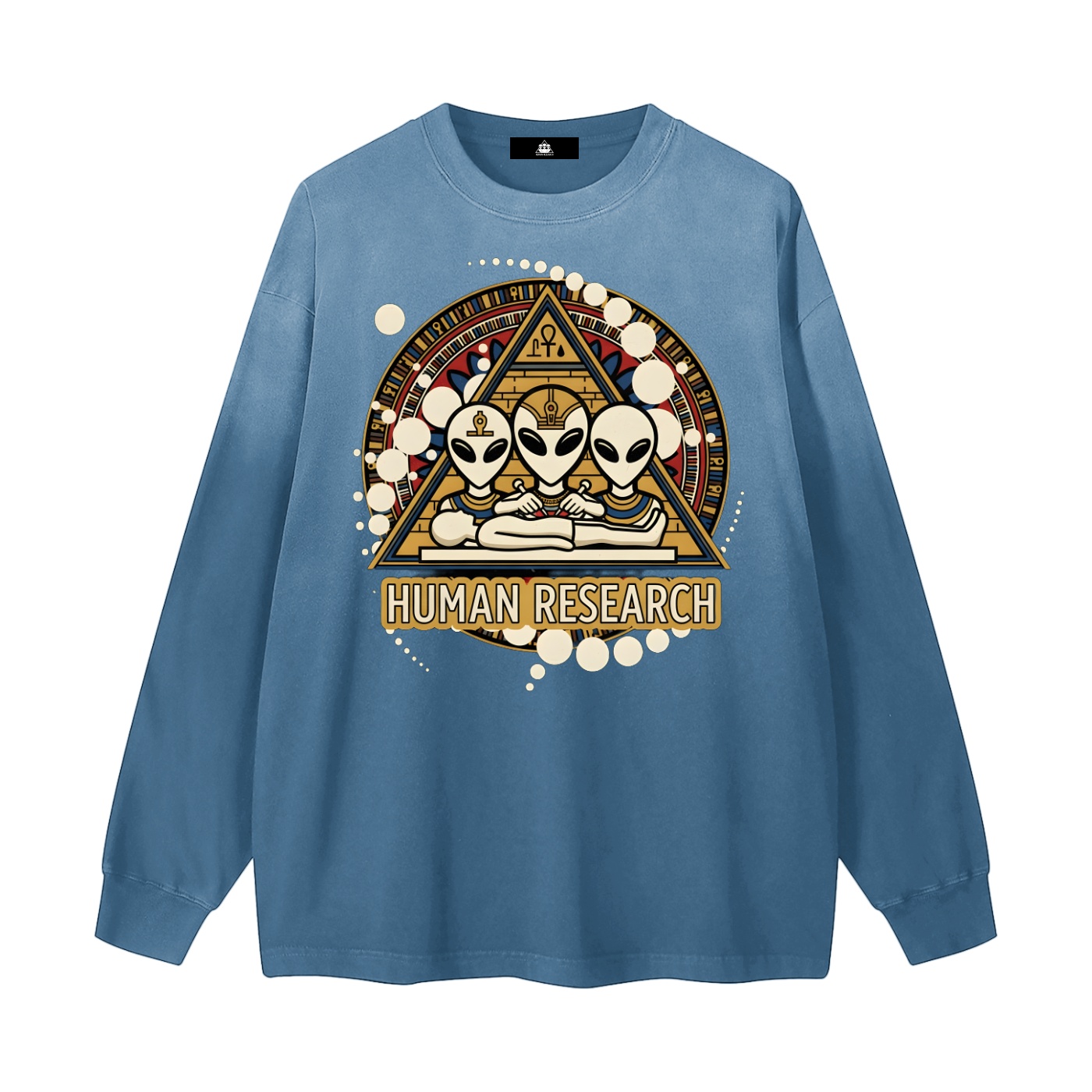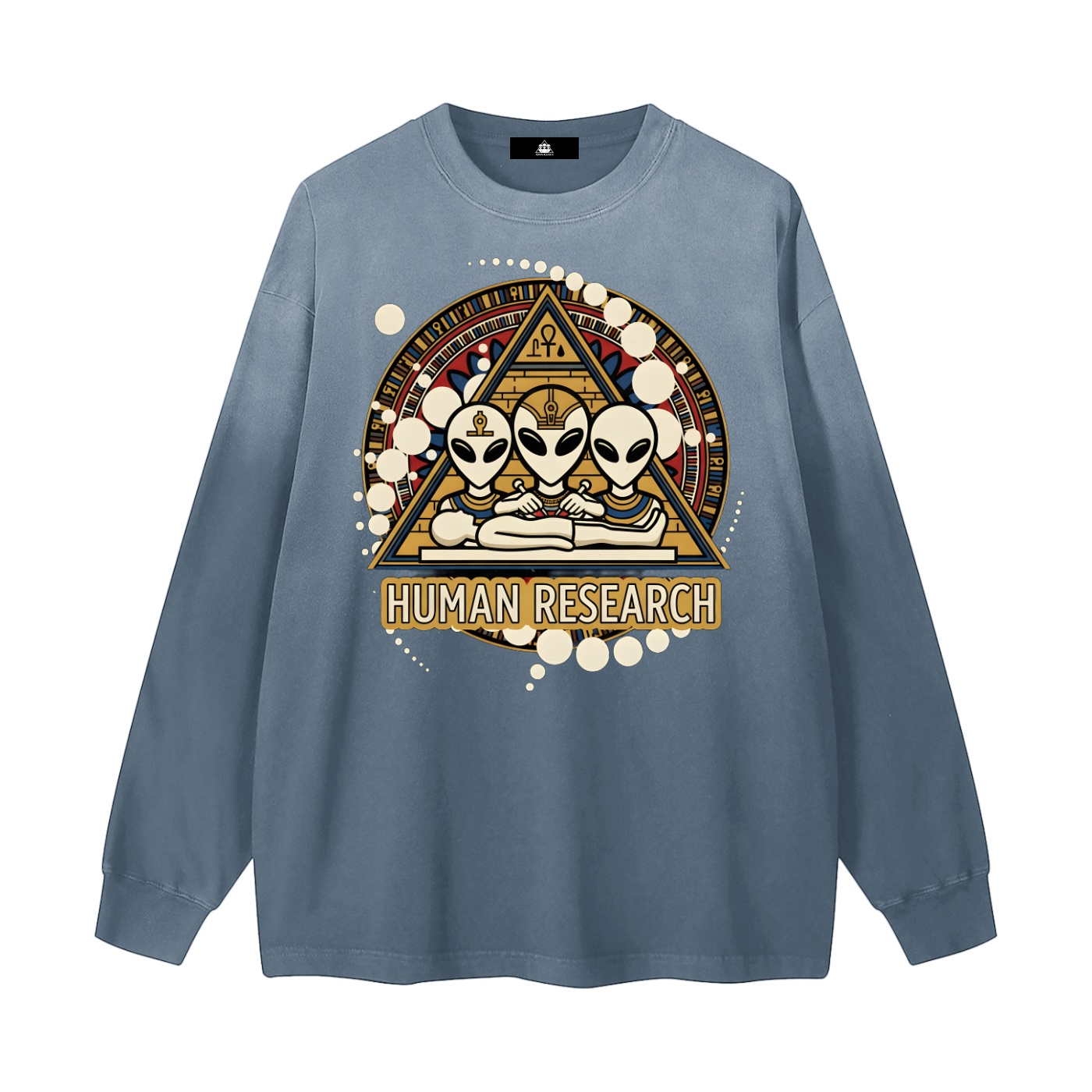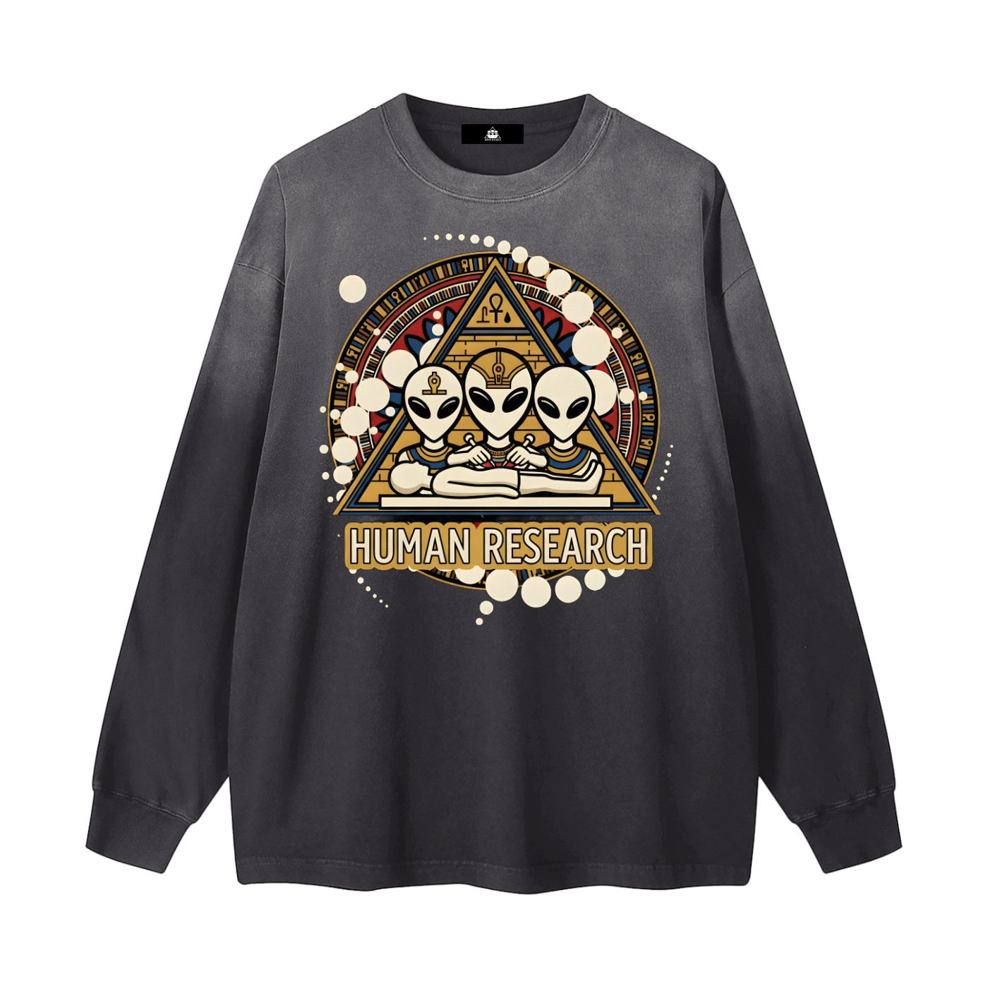 This graphic delves into the theory of ancient intervention, featuring our most detailed design yet: the Egyptian Research Logo. The artwork depicts three extraterrestrial figures adorned in pharaonic headdresses, conducting an examination on a human subject before the backdrop of a Great Pyramid.