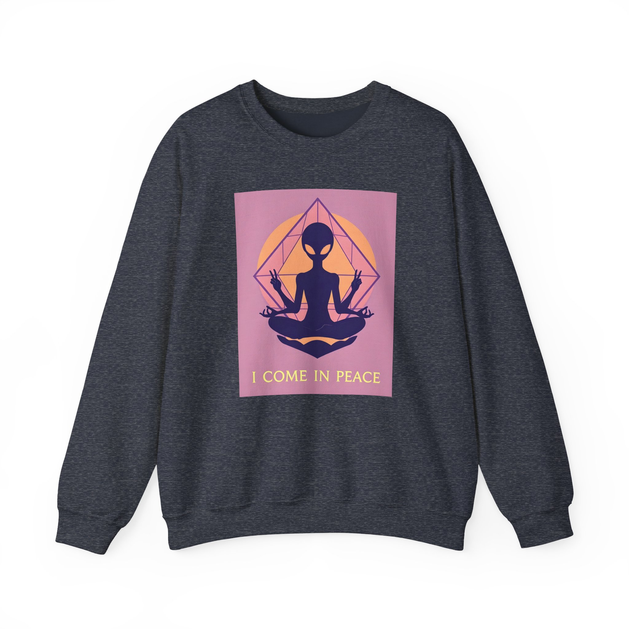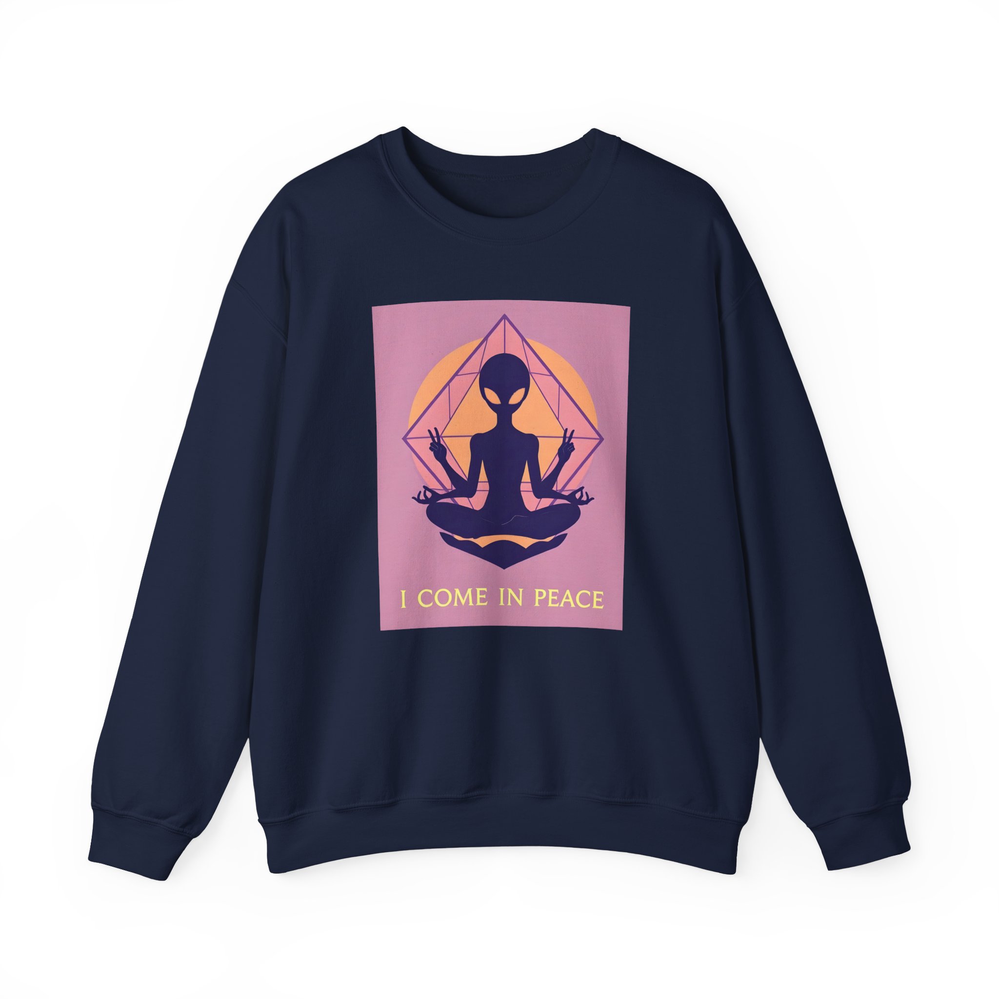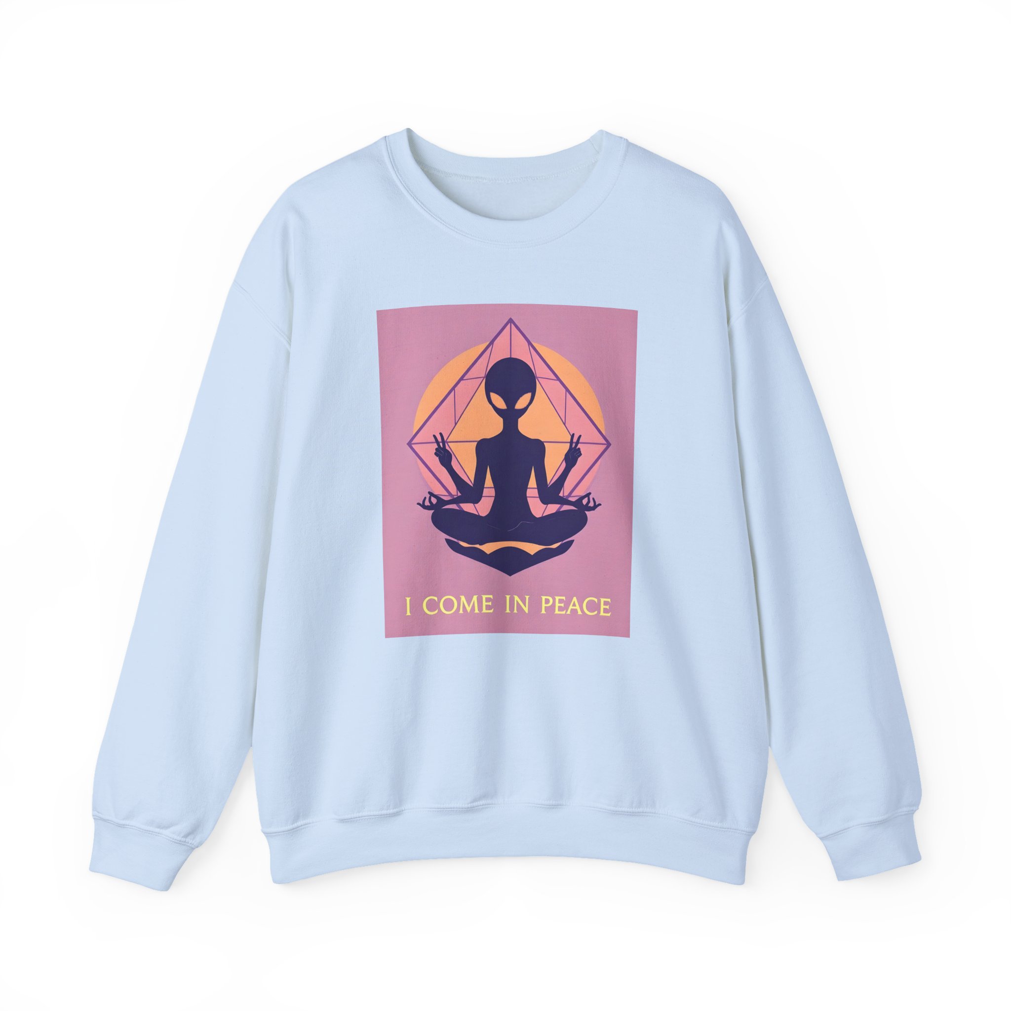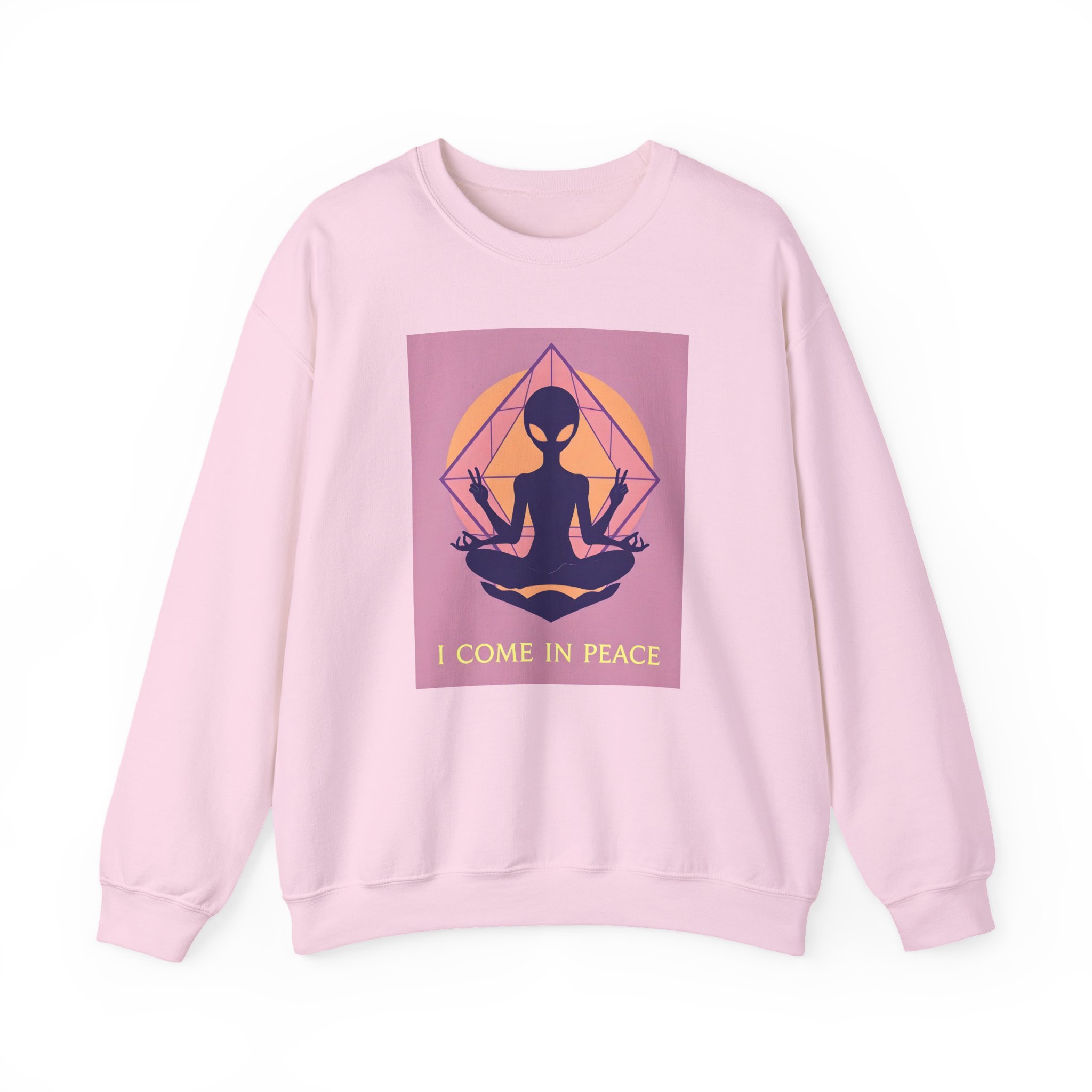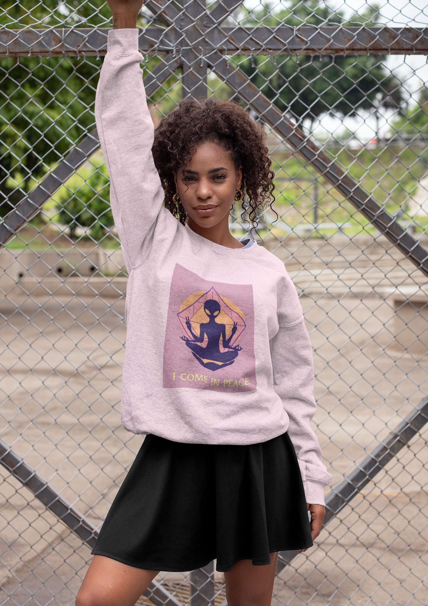 This stylized graphic depicts an alien figure in a meditative lotus position, set against a pastel pink and yellow background. The extraterrestrial silhouette is dark blue and has a distinctly elongated head with large almond-shaped eyes, sitting in a classic yoga pose with hands forming mudra gestures. Behind the alien is a geometric pyramid or diamond-shaped outline and a circular yellow background, creating a symmetrical and balanced composition. The alien is making peace signs with two of its hands, reinforcing the text at the bottom of the image which reads “I COME IN PEACE” in yellow lowercase letters. The artwork blends spiritual meditation imagery with science fiction themes, using a retro-inspired color palette of pink, purple, yellow, and blue with a minimalist, graphic design aesthetic.