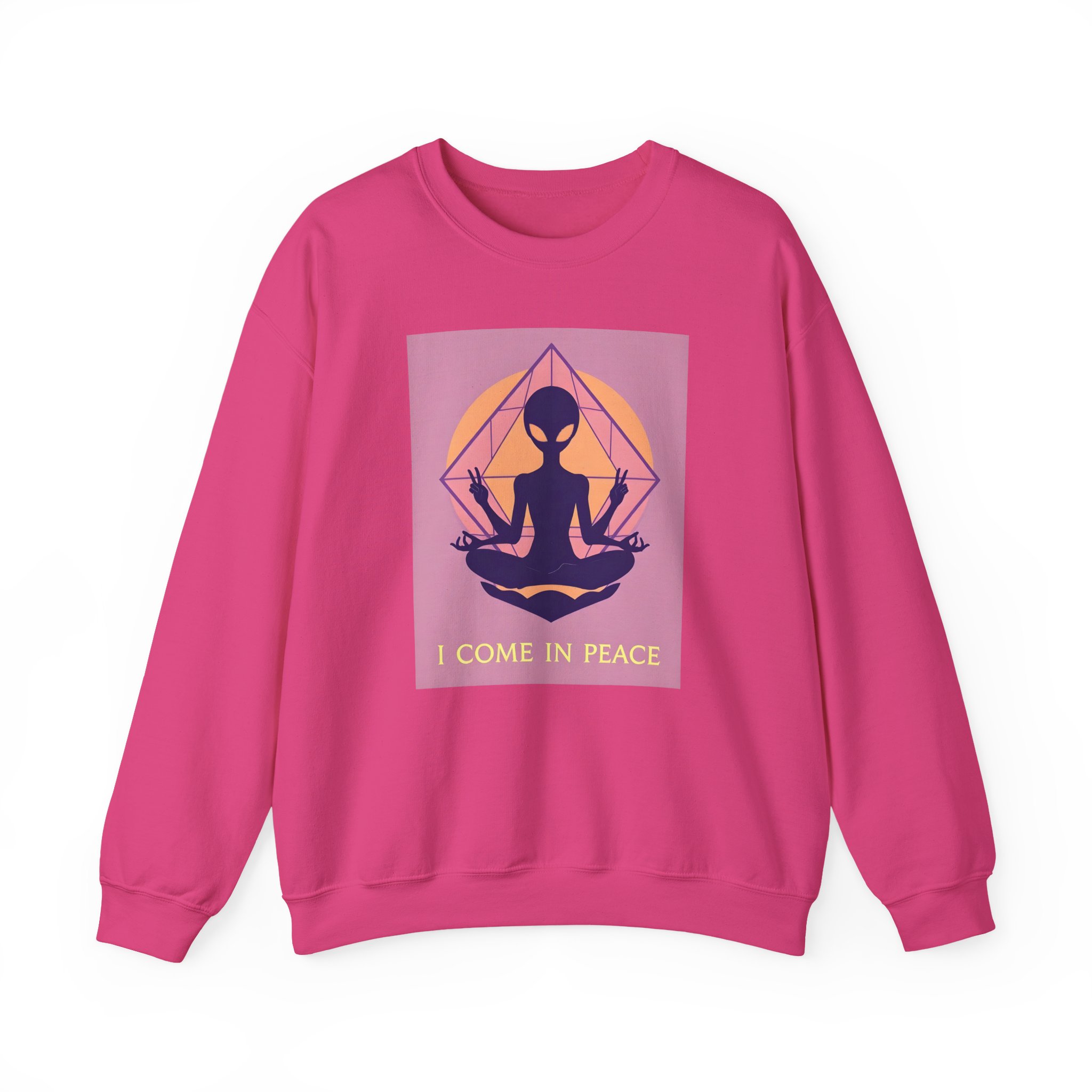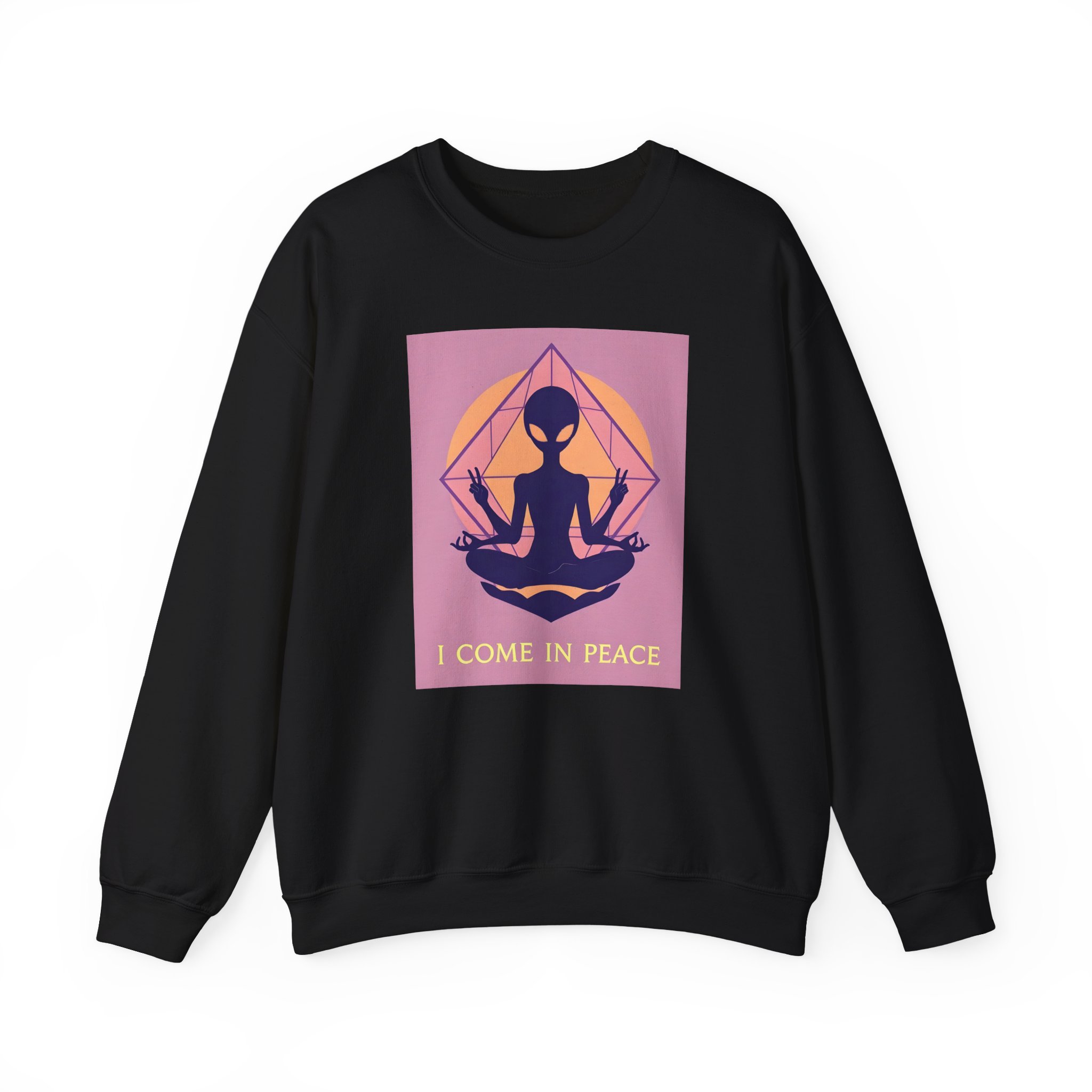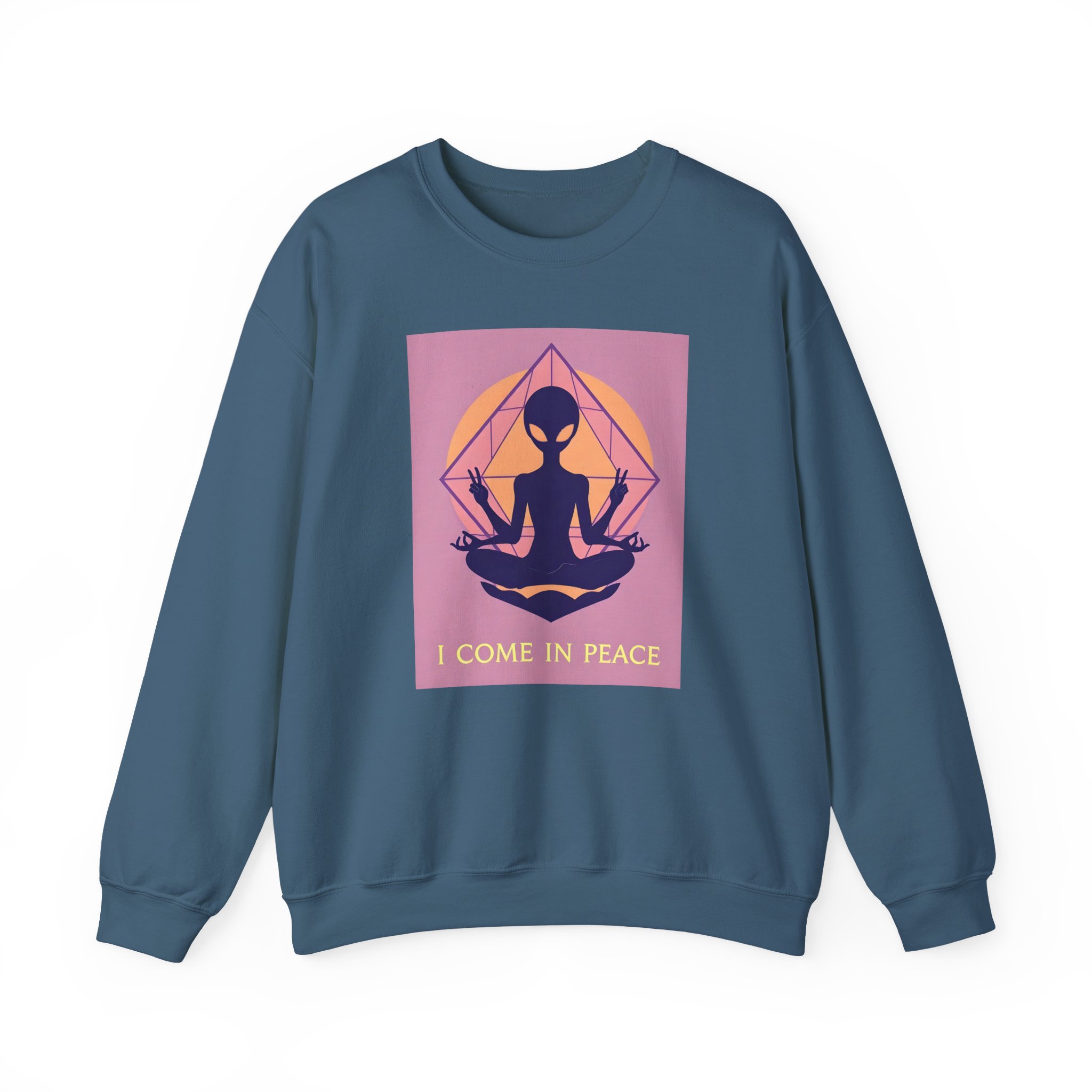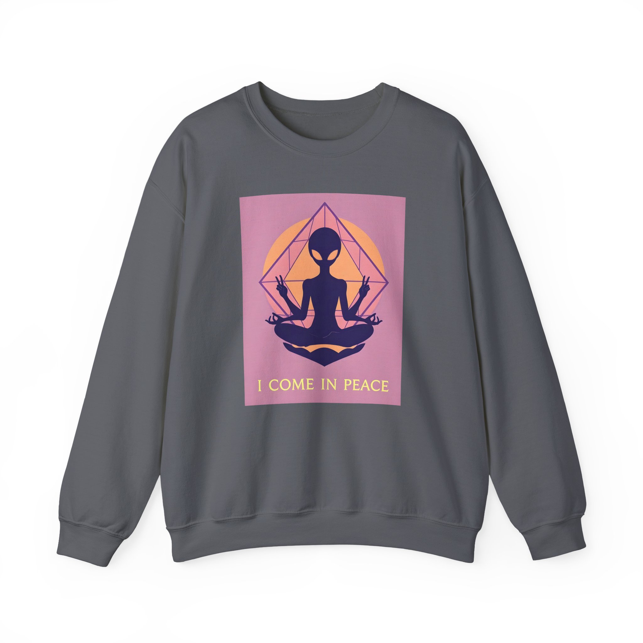 This stylized graphic depicts an alien figure in a meditative lotus position, set against a pastel pink and yellow background. The extraterrestrial silhouette is dark blue and has a distinctly elongated head with large almond-shaped eyes, sitting in a classic yoga pose with hands forming mudra gestures. Behind the alien is a geometric pyramid or diamond-shaped outline and a circular yellow background, creating a symmetrical and balanced composition. The alien is making peace signs with two of its hands, reinforcing the text at the bottom of the image which reads “I COME IN PEACE” in yellow lowercase letters. The artwork blends spiritual meditation imagery with science fiction themes, using a retro-inspired color palette of pink, purple, yellow, and blue with a minimalist, graphic design aesthetic.