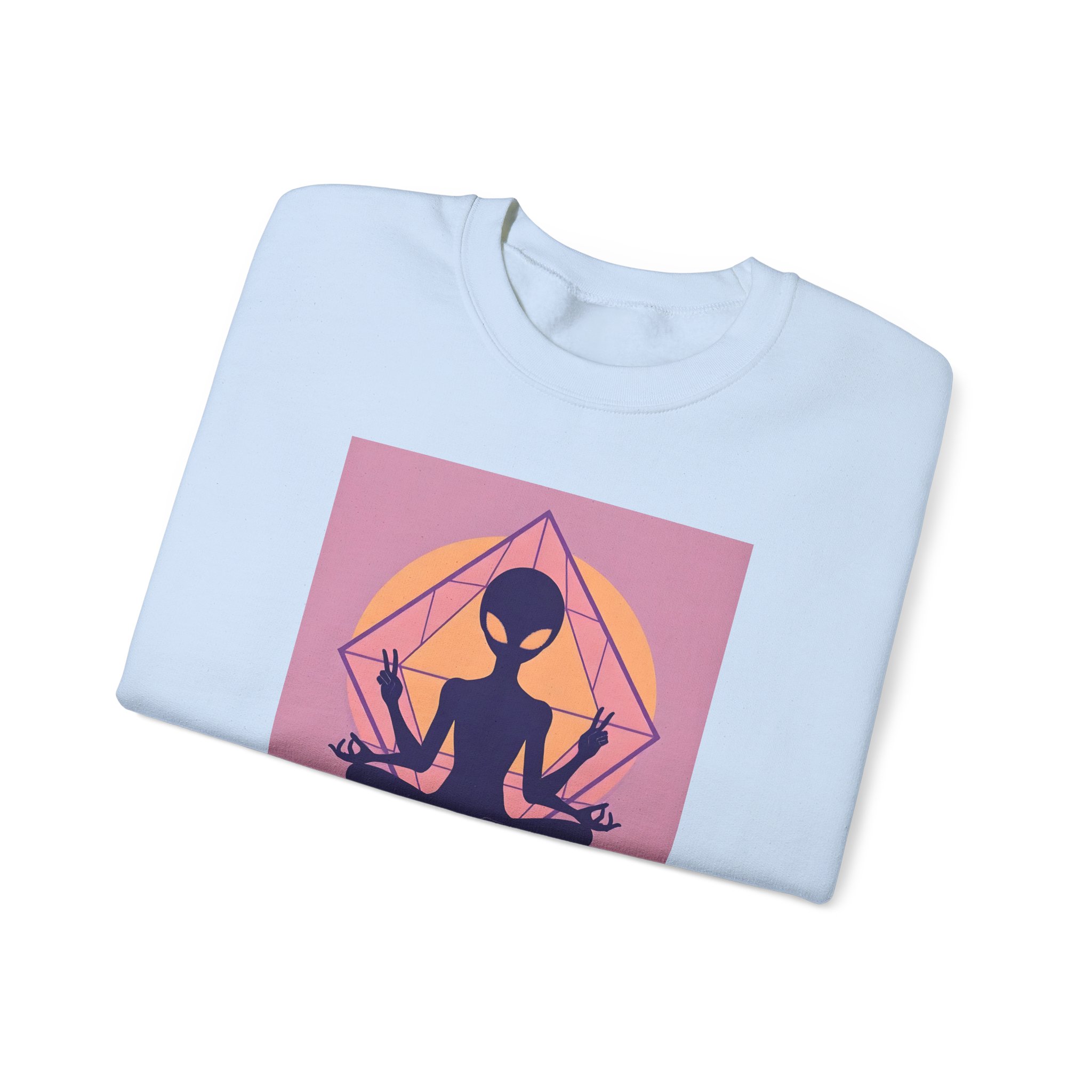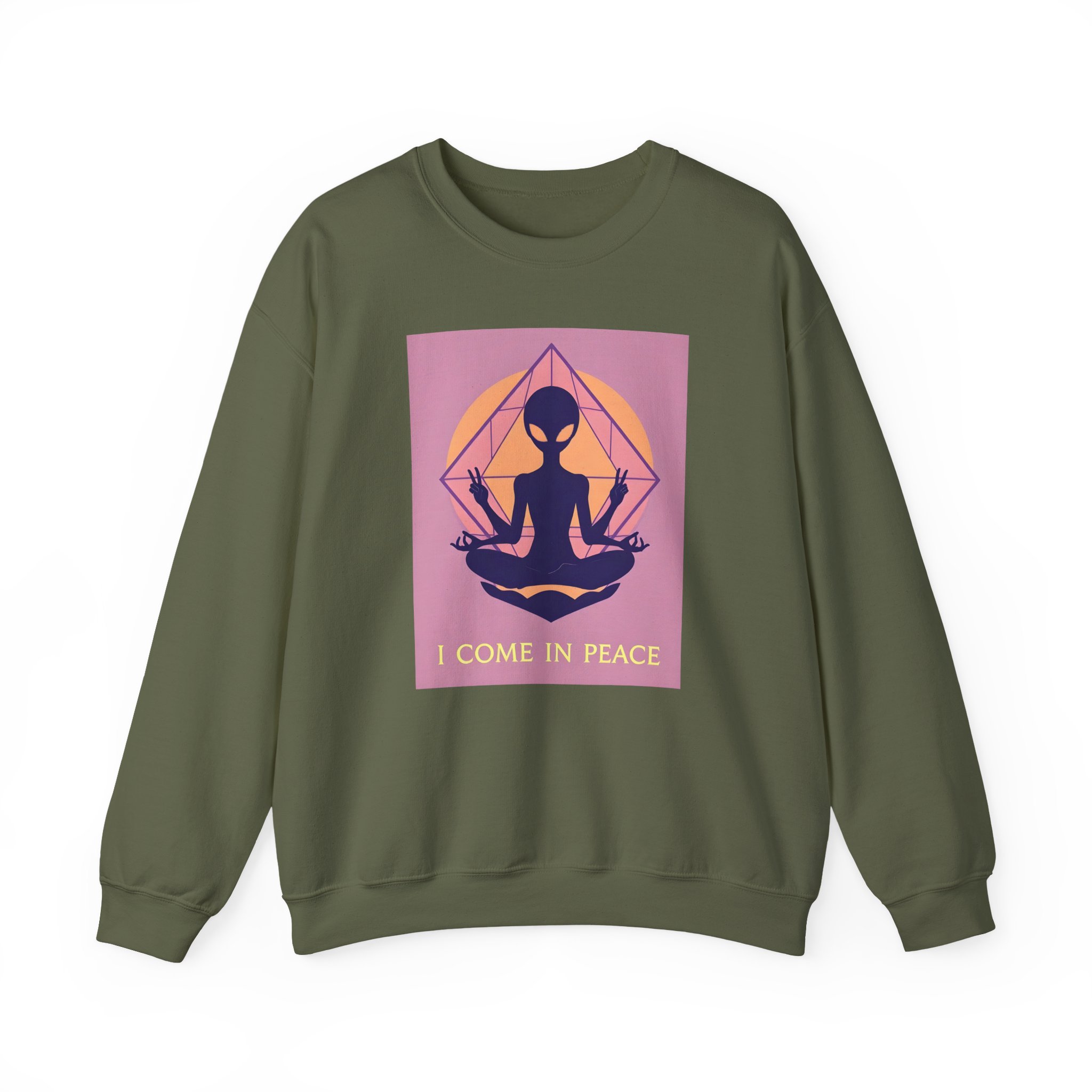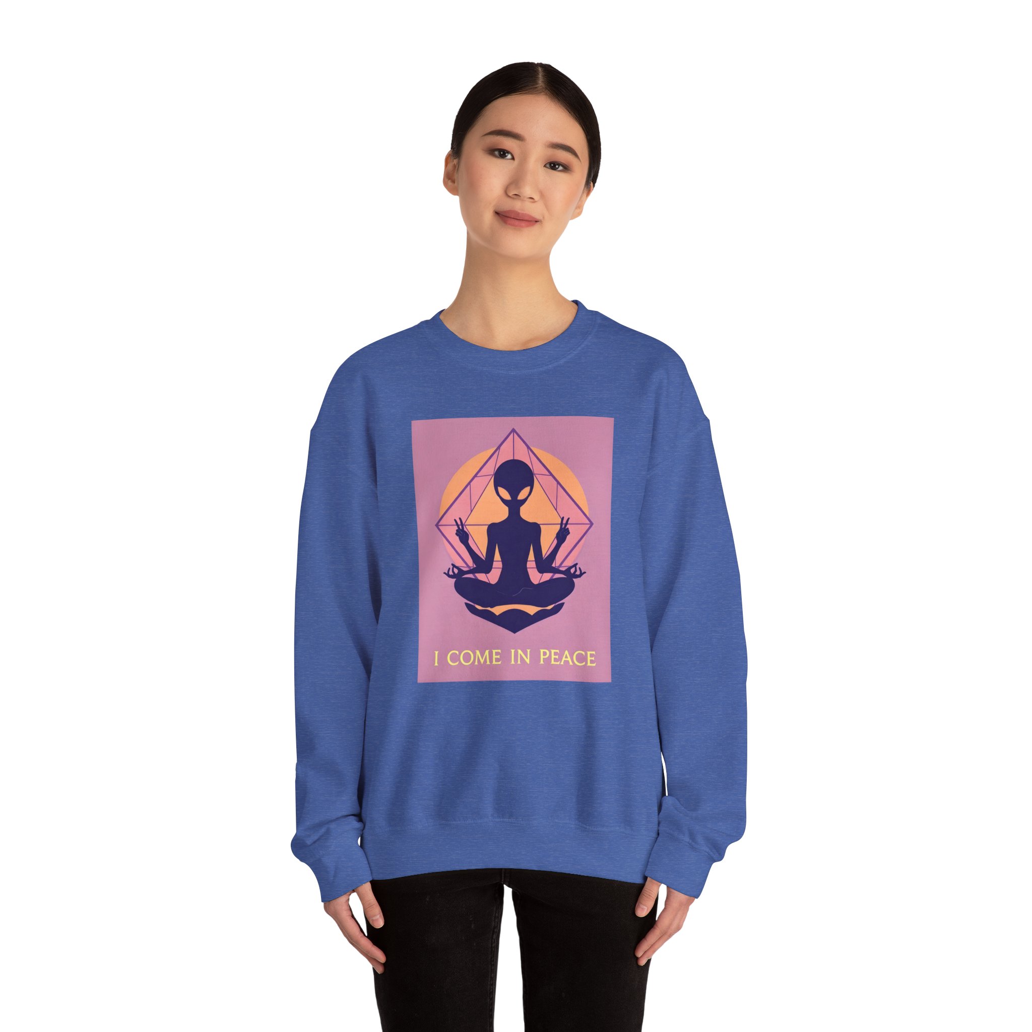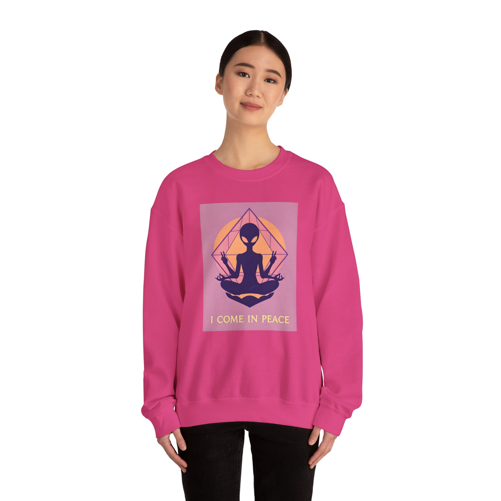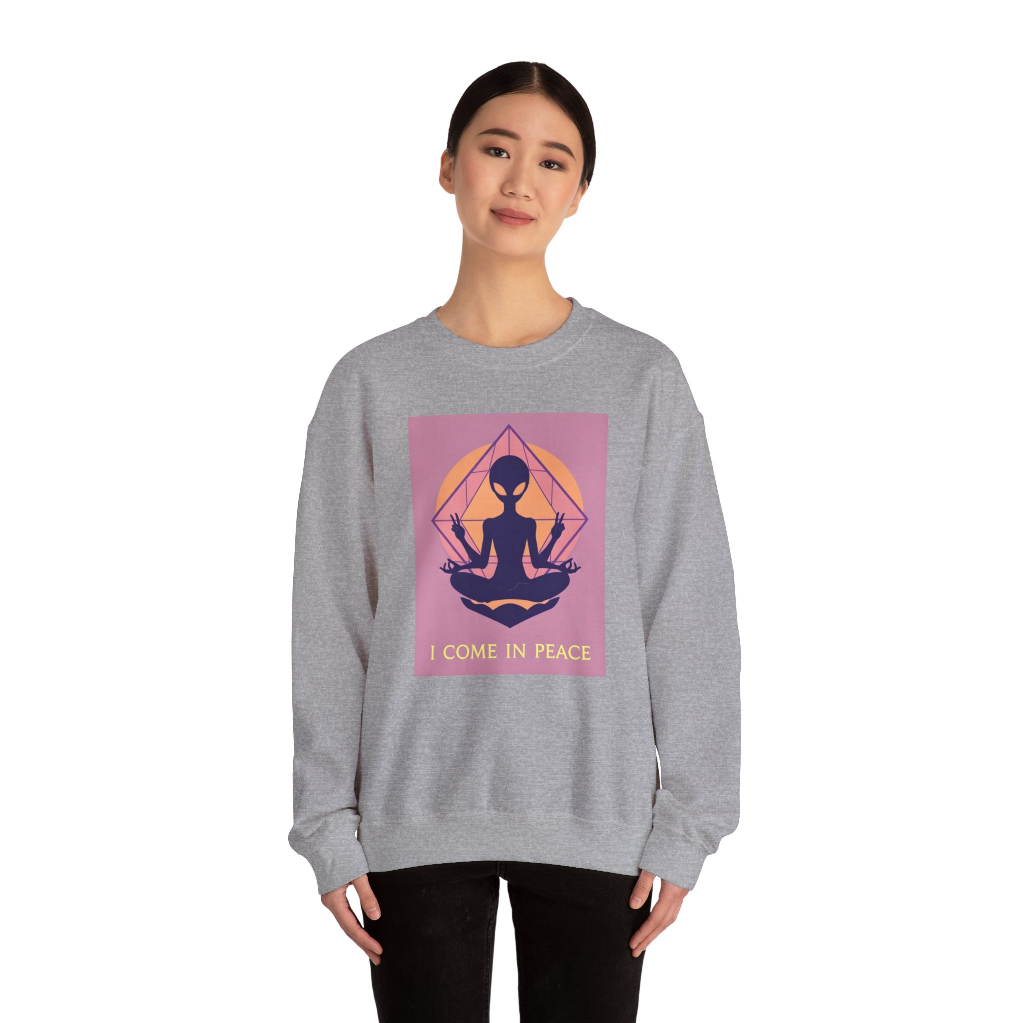 This stylized graphic depicts an alien figure in a meditative lotus position, set against a pastel pink and yellow background. The extraterrestrial silhouette is dark blue and has a distinctly elongated head with large almond-shaped eyes, sitting in a classic yoga pose with hands forming mudra gestures. Behind the alien is a geometric pyramid or diamond-shaped outline and a circular yellow background, creating a symmetrical and balanced composition. The alien is making peace signs with two of its hands, reinforcing the text at the bottom of the image which reads “I COME IN PEACE” in yellow lowercase letters. The artwork blends spiritual meditation imagery with science fiction themes, using a retro-inspired color palette of pink, purple, yellow, and blue with a minimalist, graphic design aesthetic.