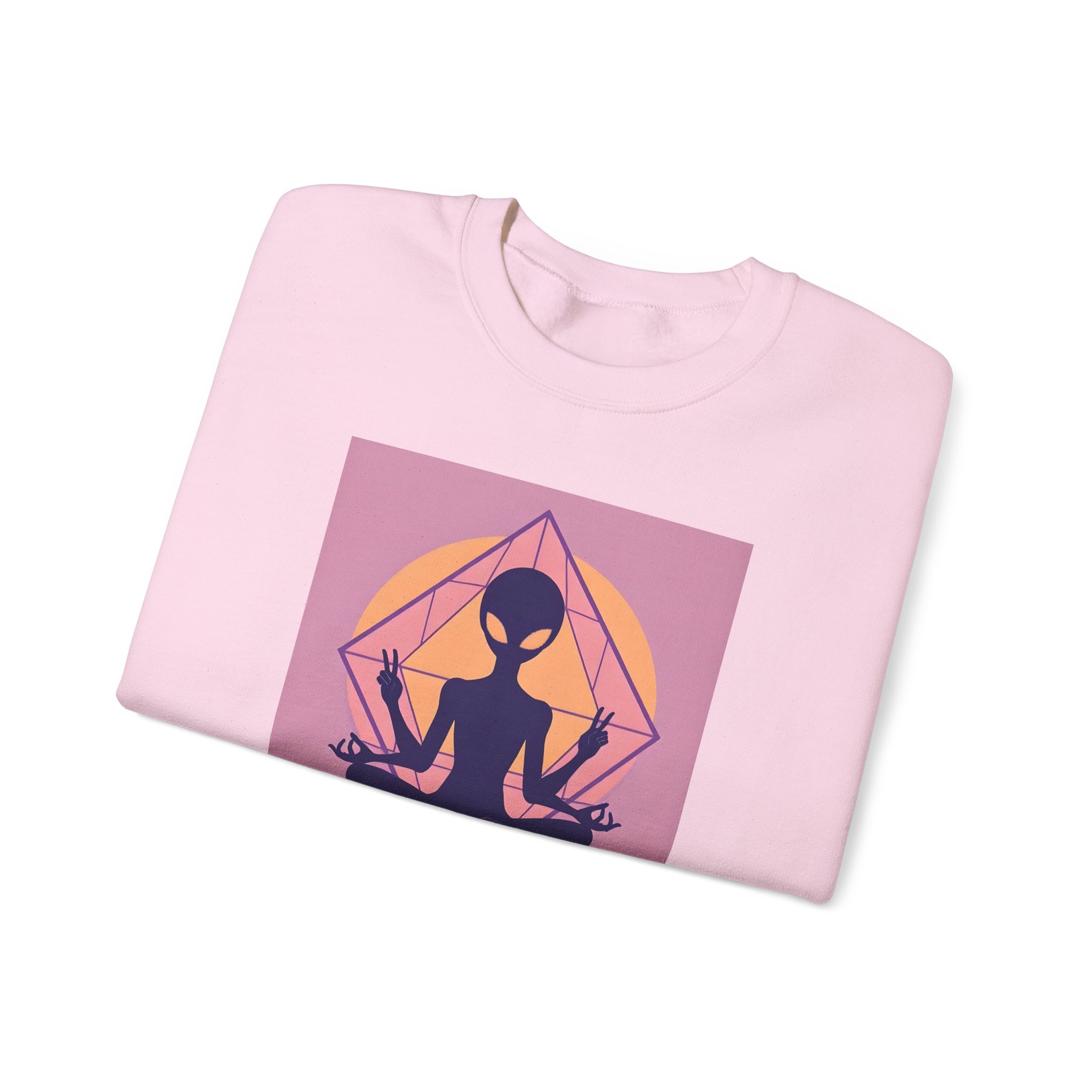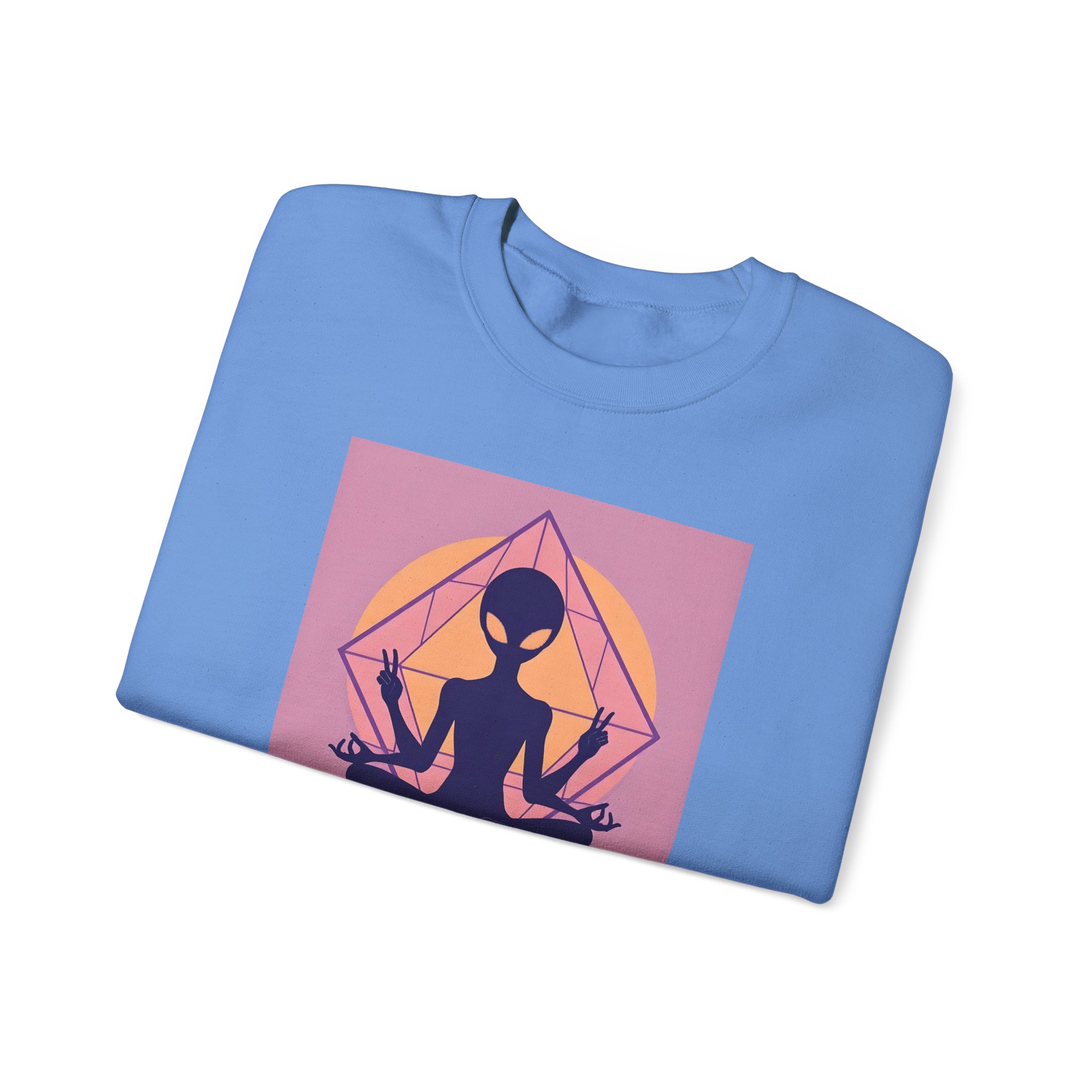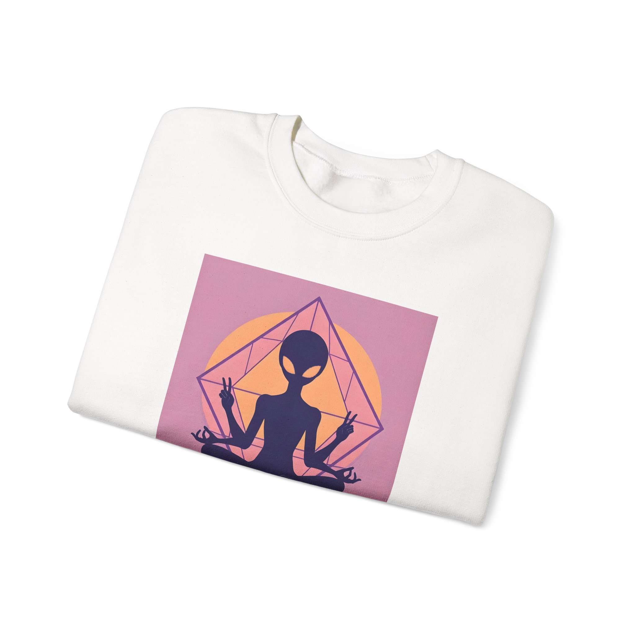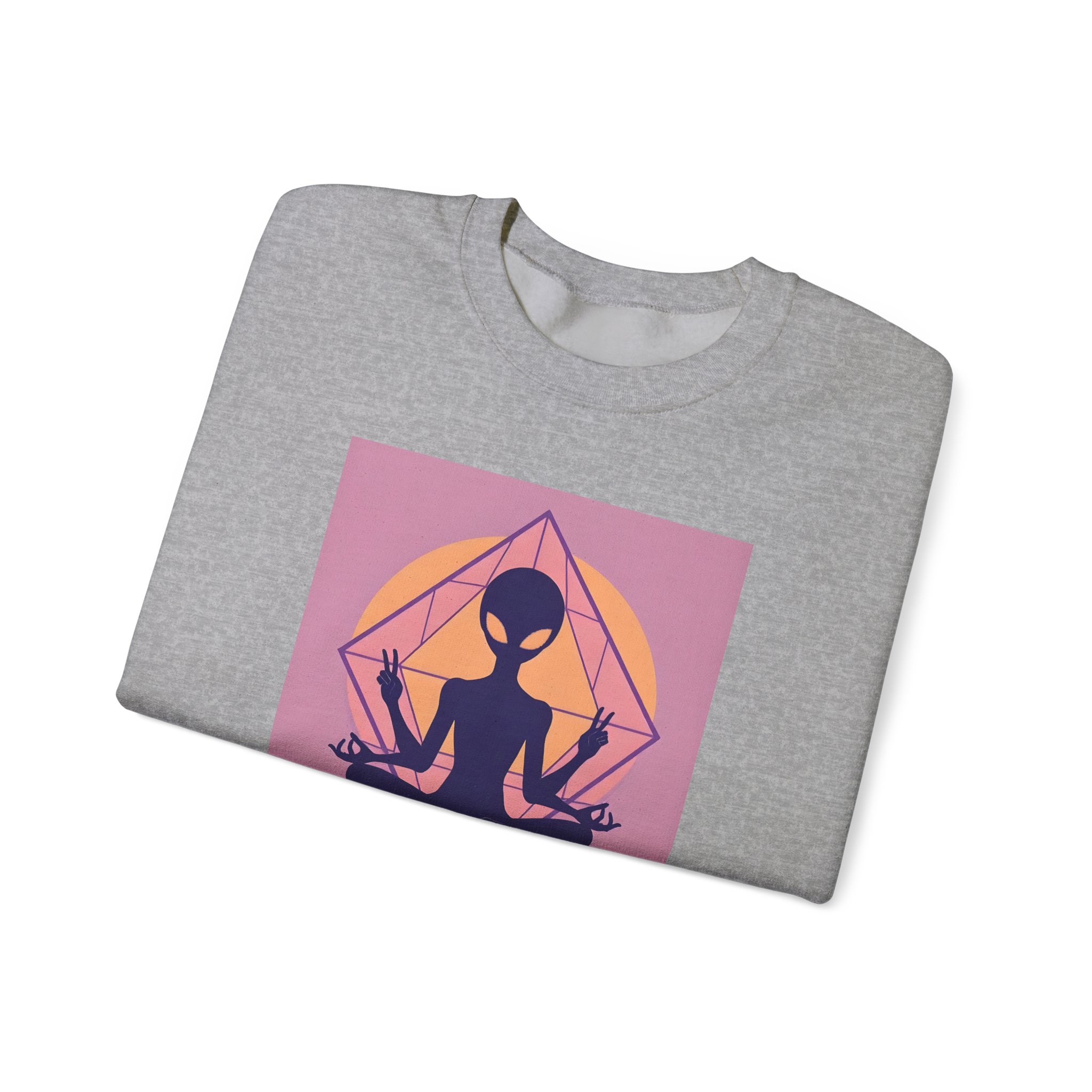 This stylized graphic depicts an alien figure in a meditative lotus position, set against a pastel pink and yellow background. The extraterrestrial silhouette is dark blue and has a distinctly elongated head with large almond-shaped eyes, sitting in a classic yoga pose with hands forming mudra gestures. Behind the alien is a geometric pyramid or diamond-shaped outline and a circular yellow background, creating a symmetrical and balanced composition. The alien is making peace signs with two of its hands, reinforcing the text at the bottom of the image which reads “I COME IN PEACE” in yellow lowercase letters. The artwork blends spiritual meditation imagery with science fiction themes, using a retro-inspired color palette of pink, purple, yellow, and blue with a minimalist, graphic design aesthetic.