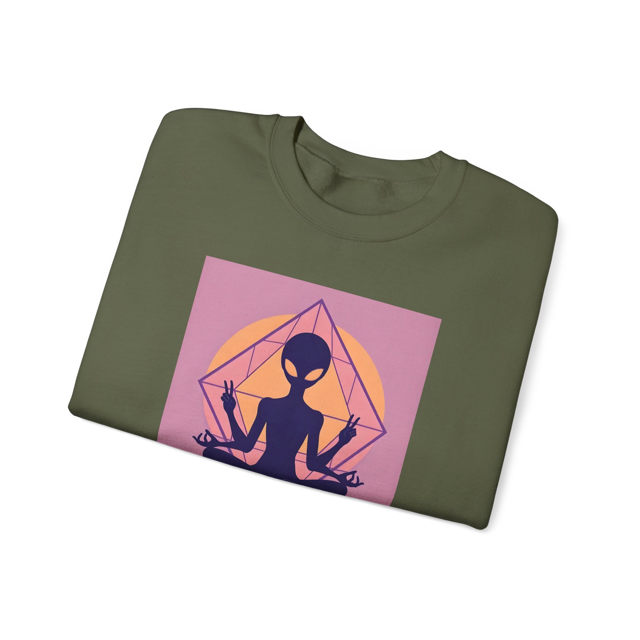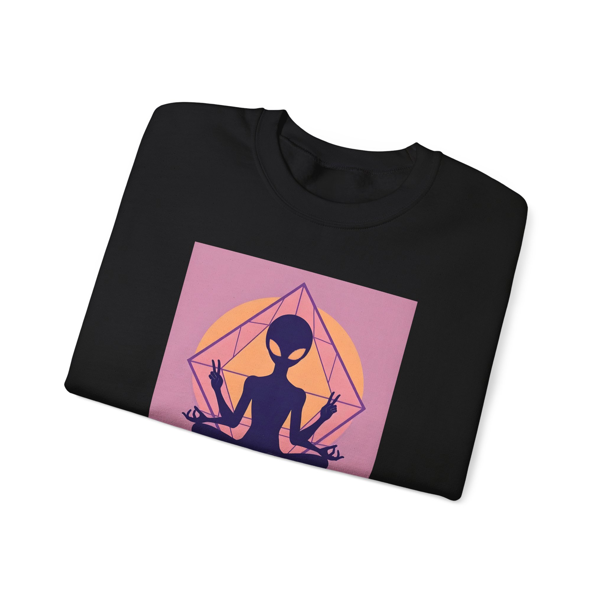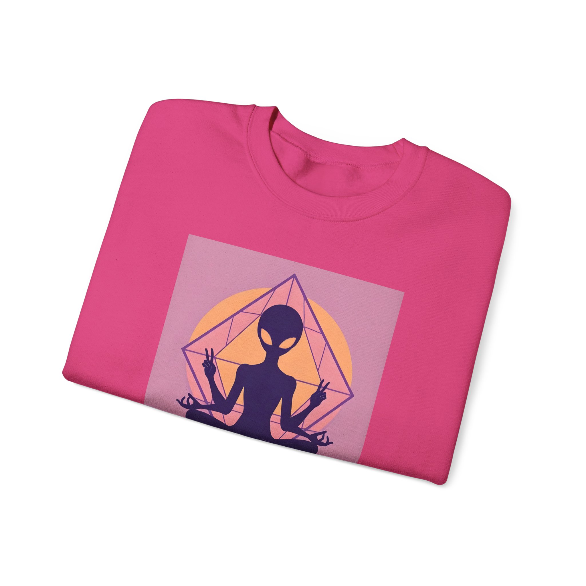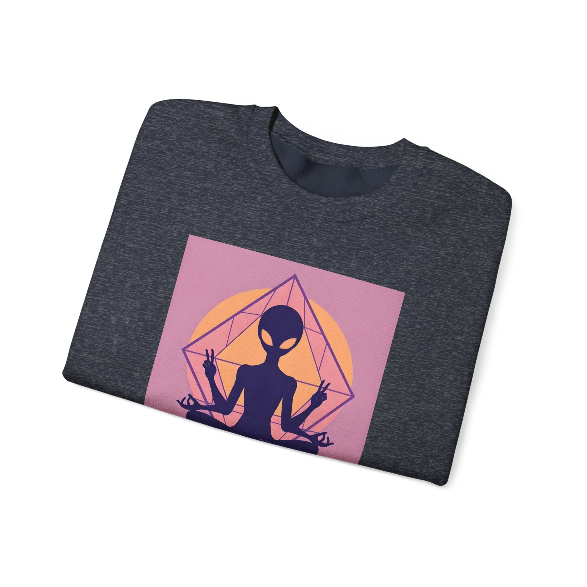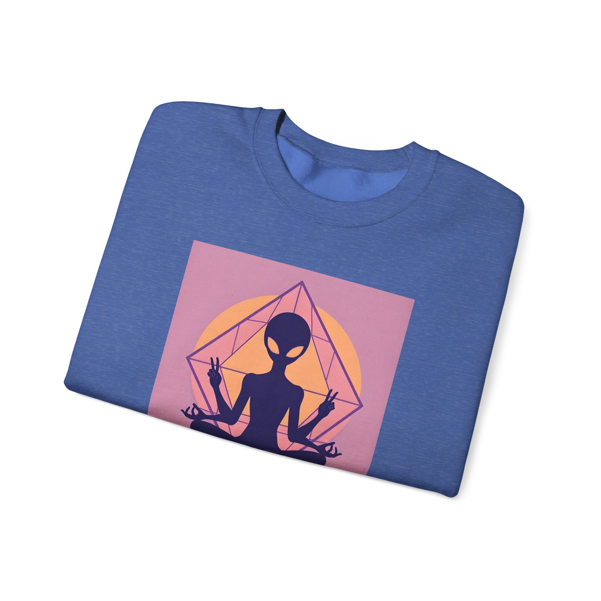 This stylized graphic depicts an alien figure in a meditative lotus position, set against a pastel pink and yellow background. The extraterrestrial silhouette is dark blue and has a distinctly elongated head with large almond-shaped eyes, sitting in a classic yoga pose with hands forming mudra gestures. Behind the alien is a geometric pyramid or diamond-shaped outline and a circular yellow background, creating a symmetrical and balanced composition. The alien is making peace signs with two of its hands, reinforcing the text at the bottom of the image which reads “I COME IN PEACE” in yellow lowercase letters. The artwork blends spiritual meditation imagery with science fiction themes, using a retro-inspired color palette of pink, purple, yellow, and blue with a minimalist, graphic design aesthetic.