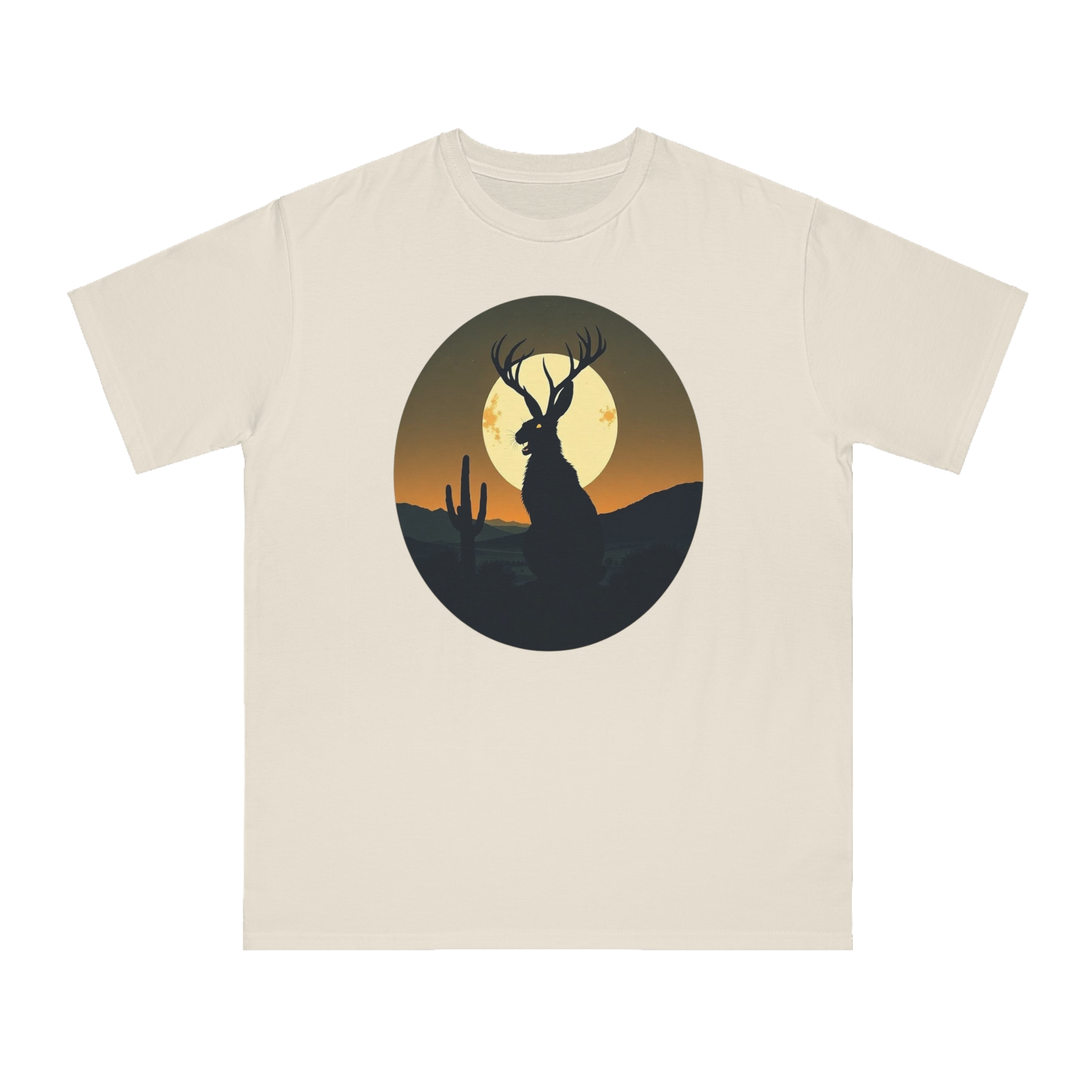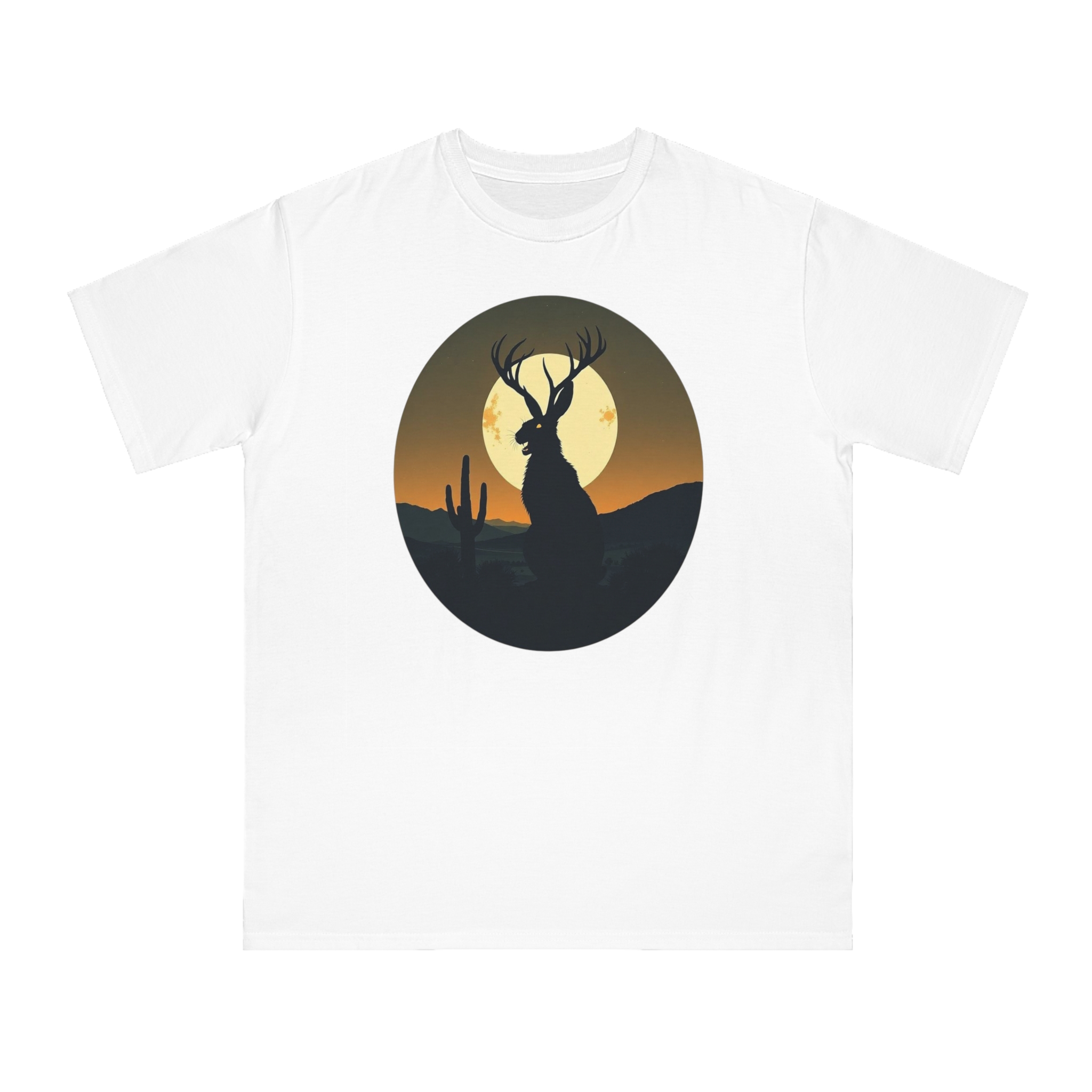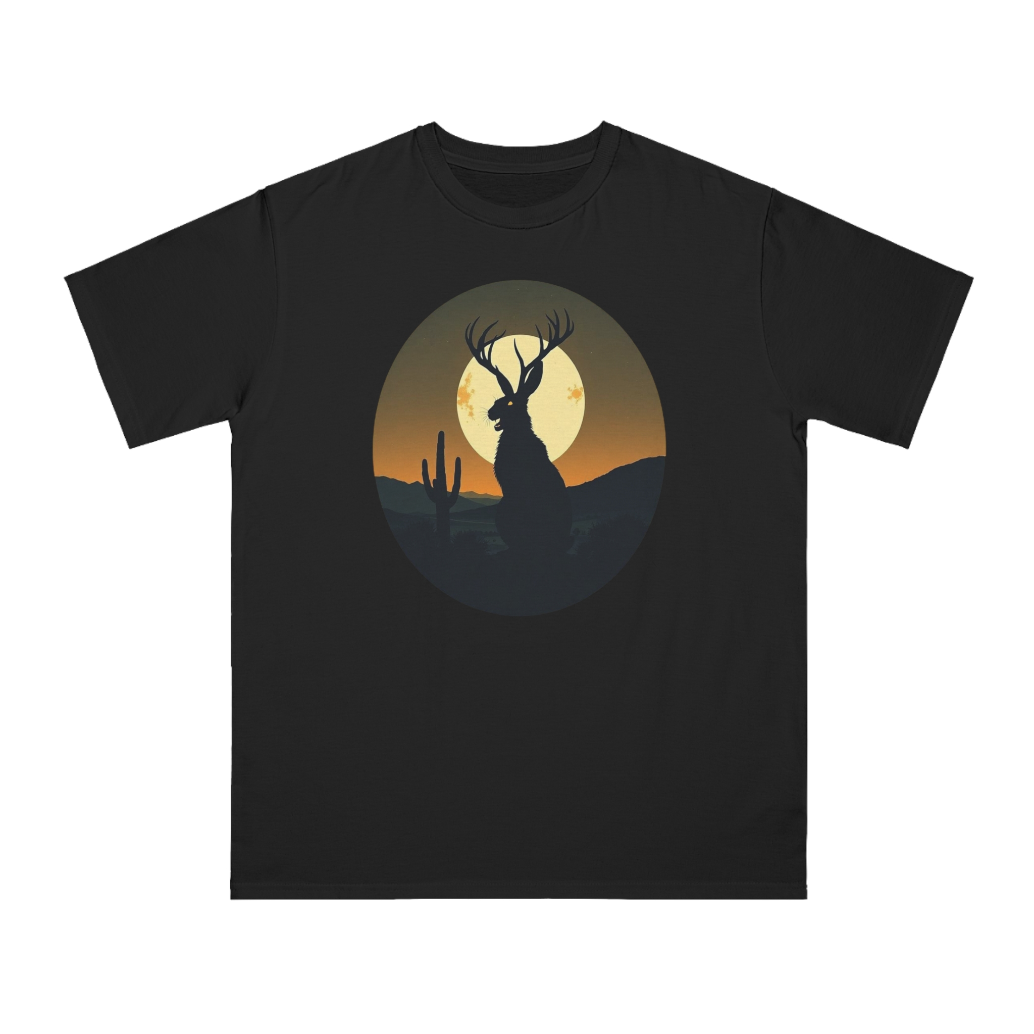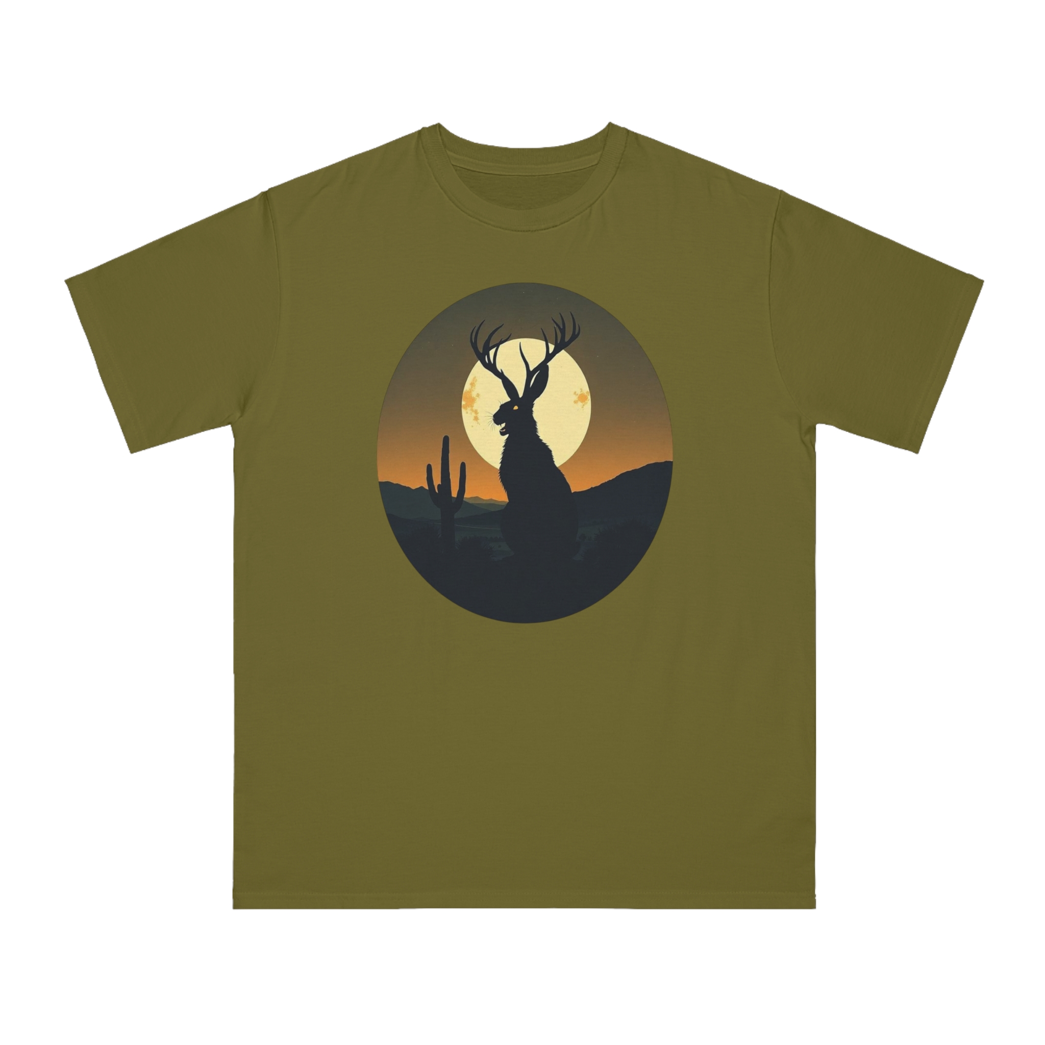 This striking illustration depicts a mystical jackalope silhouetted against a desert landscape at sunset. The hybrid creature, with distinctive antlers and a rabbit-like form, stands prominently in the foreground, casting a dark profile against a large, golden full moon. A solitary saguaro cactus rises on the left side of the image, adding to the southwestern desert atmosphere. The artwork is rendered in a minimalist, circular composition with a limited color palette of deep greens, blacks, and warm oranges and yellows. The stylized, graphic design creates a sense of mystery and mythical folklore, blending natural elements with a surreal, imaginative creature.