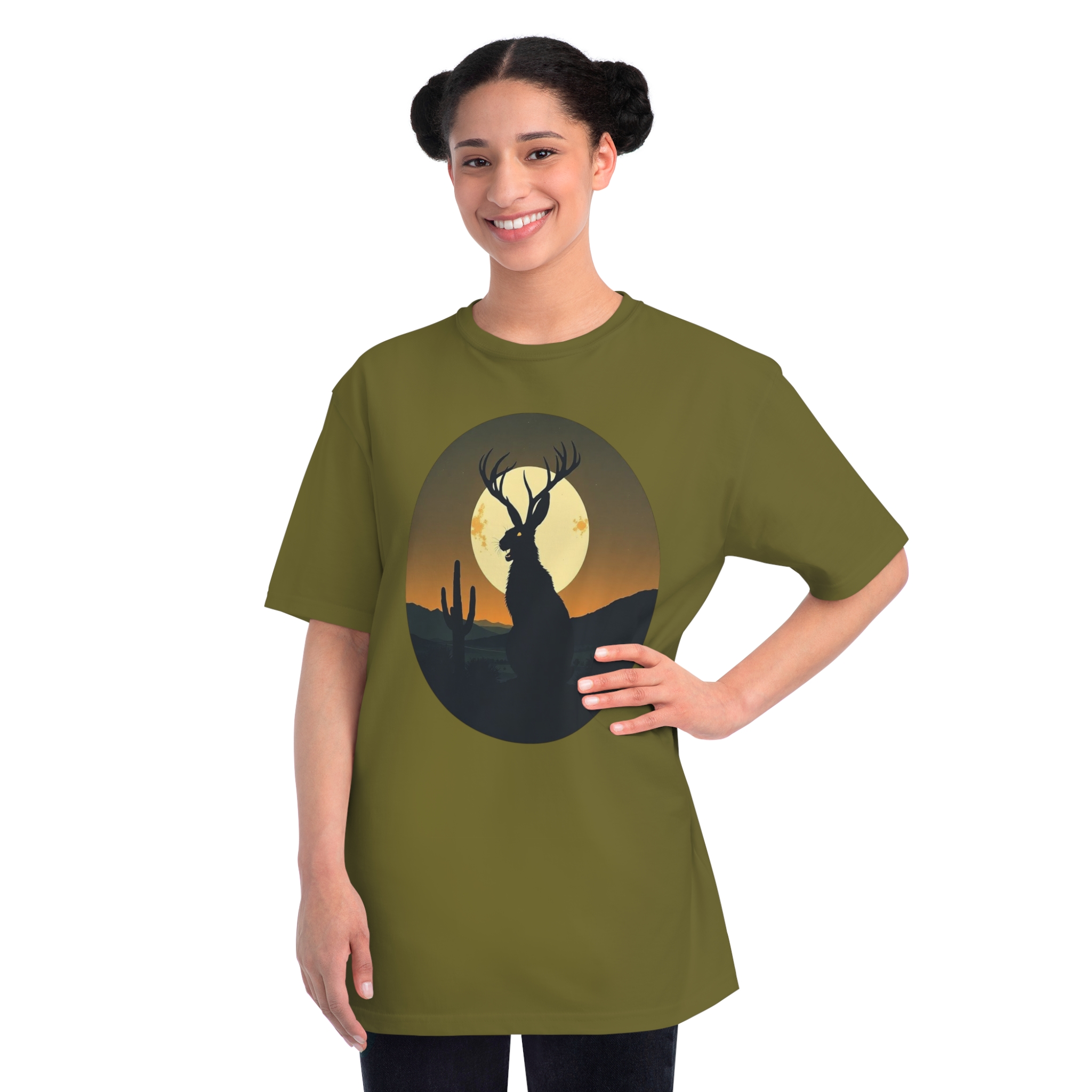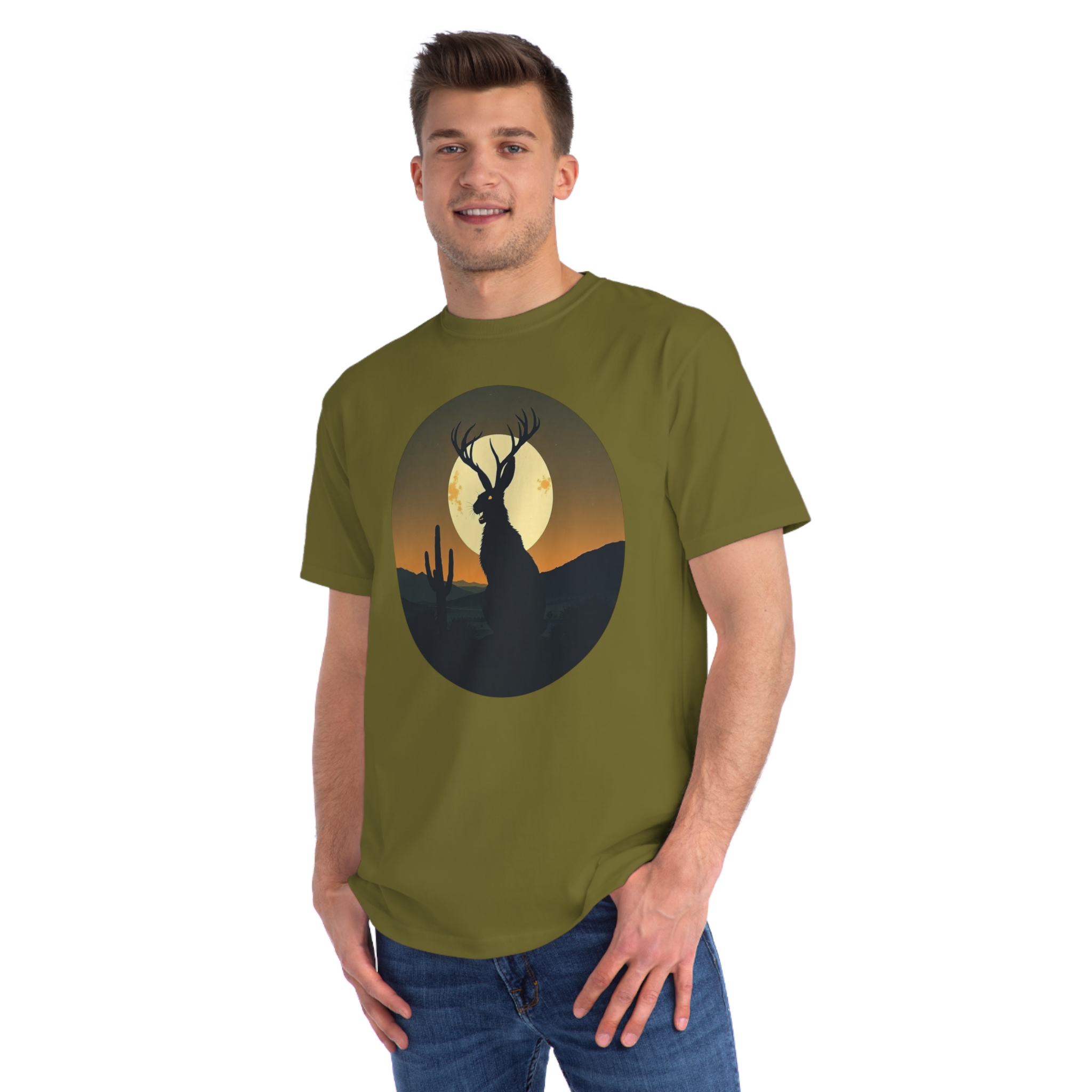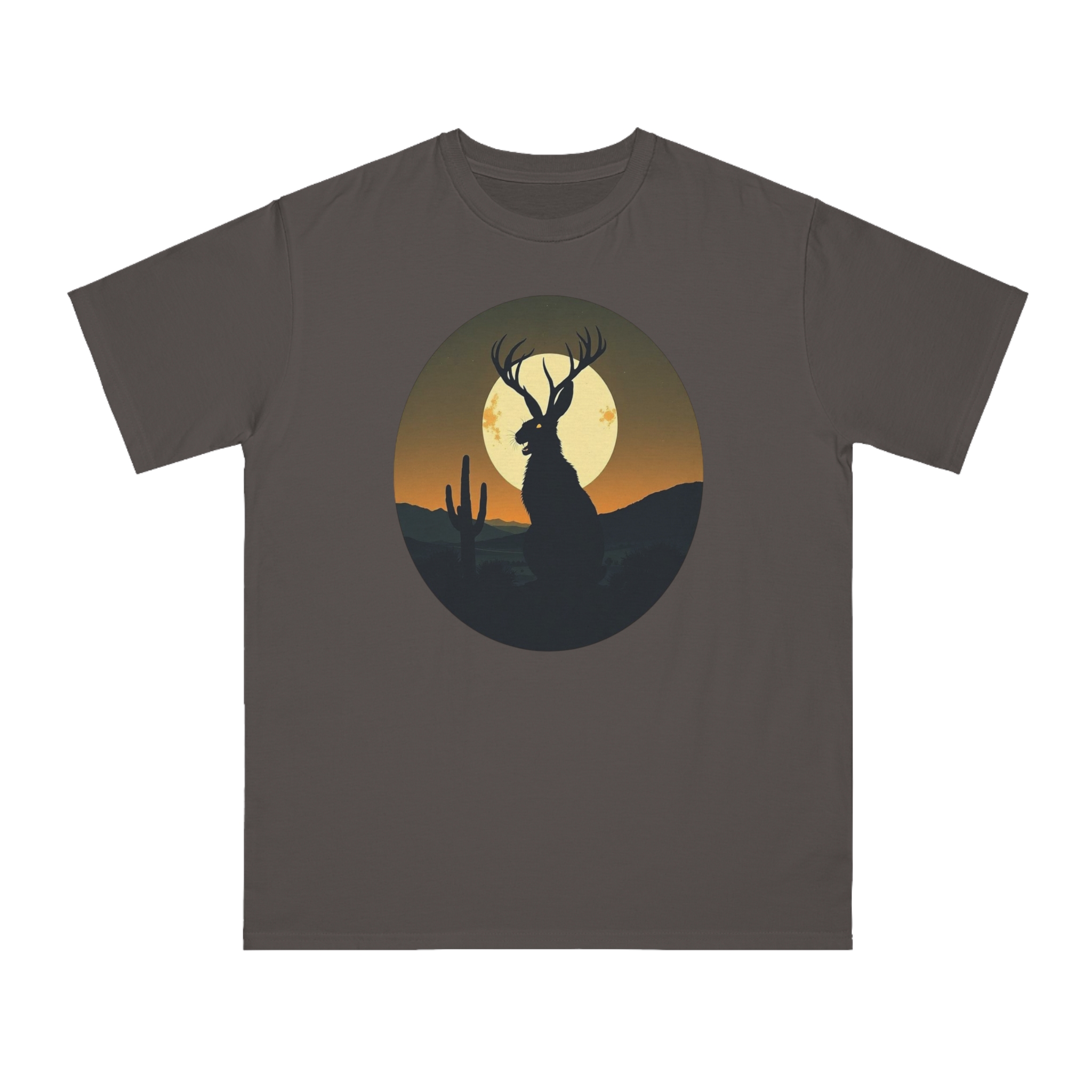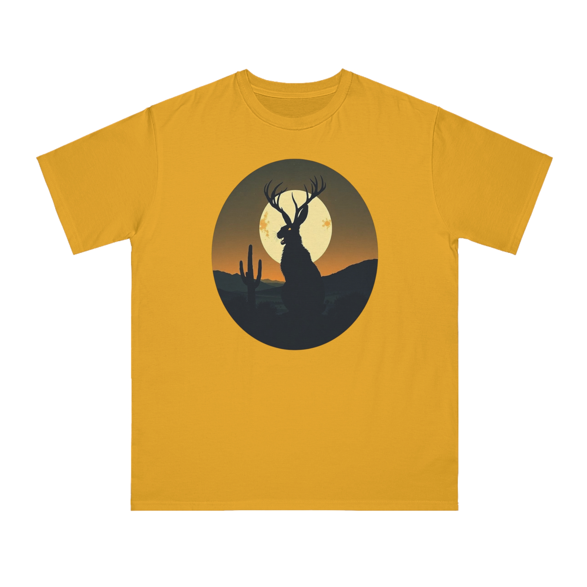 This striking illustration depicts a mystical jackalope silhouetted against a desert landscape at sunset. The hybrid creature, with distinctive antlers and a rabbit-like form, stands prominently in the foreground, casting a dark profile against a large, golden full moon. A solitary saguaro cactus rises on the left side of the image, adding to the southwestern desert atmosphere. The artwork is rendered in a minimalist, circular composition with a limited color palette of deep greens, blacks, and warm oranges and yellows. The stylized, graphic design creates a sense of mystery and mythical folklore, blending natural elements with a surreal, imaginative creature.