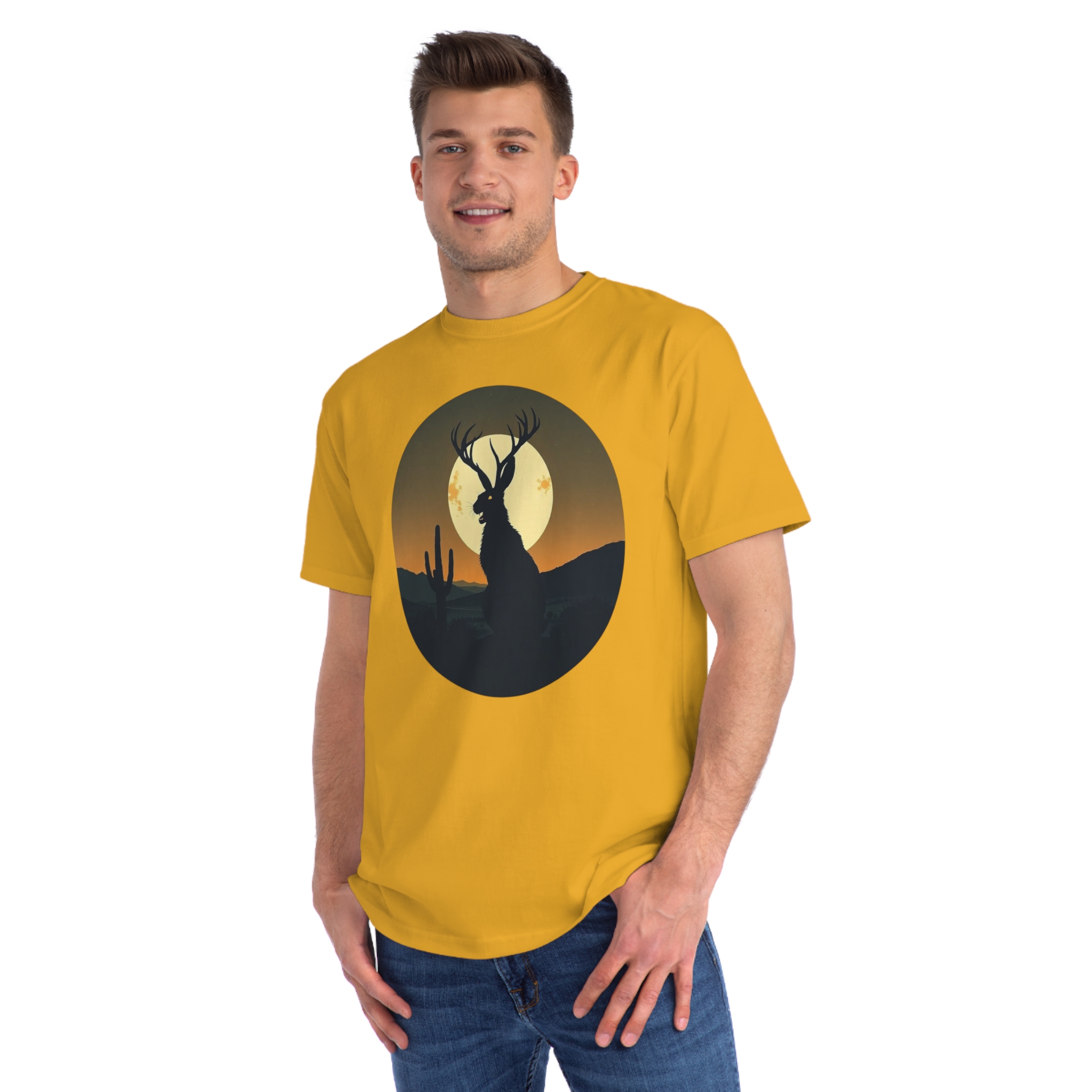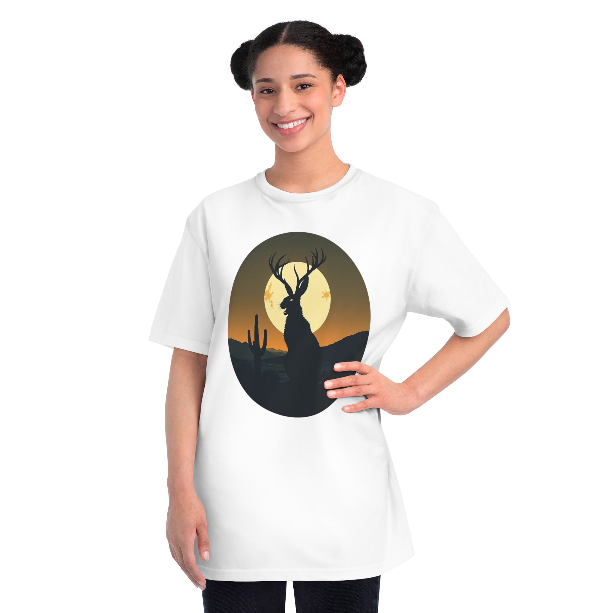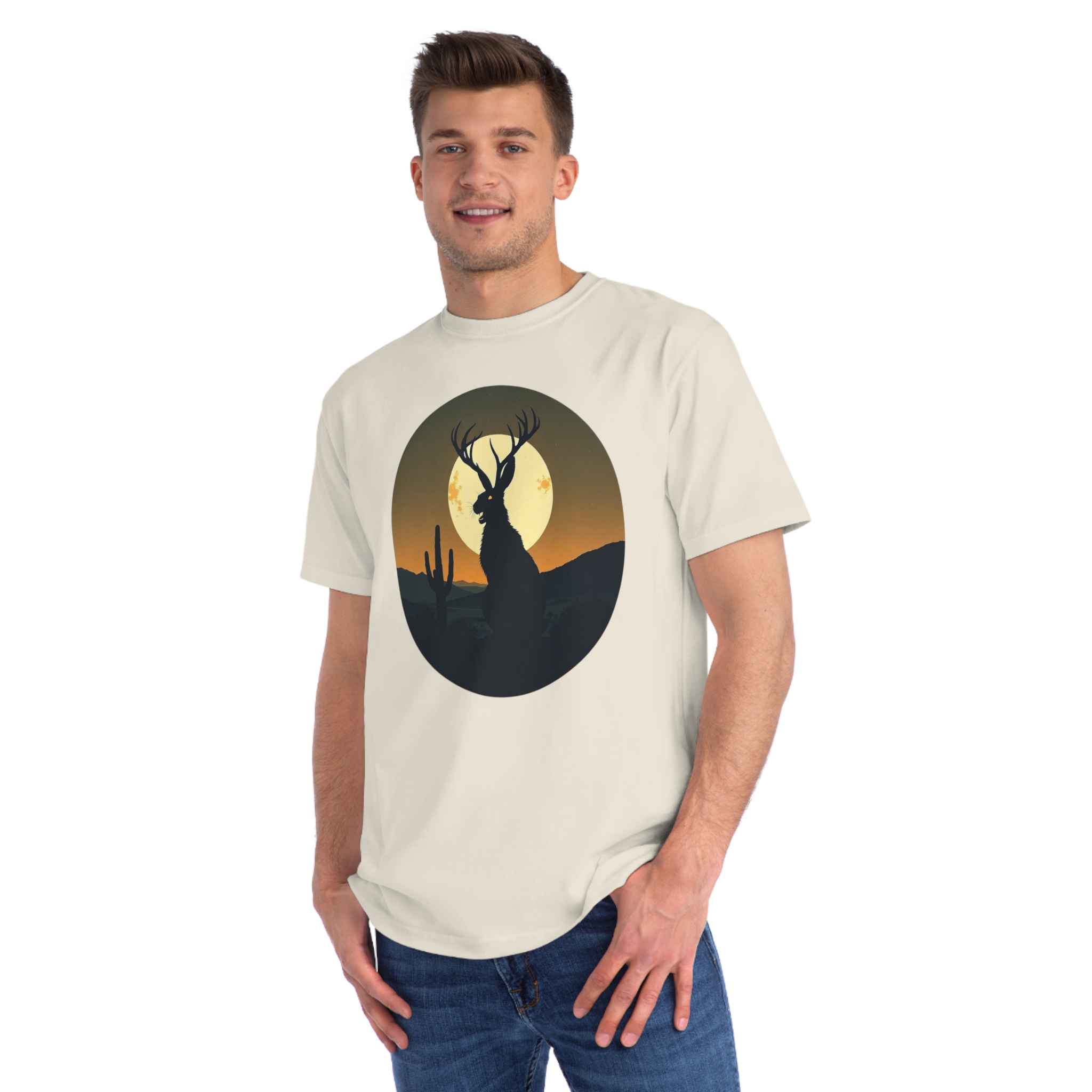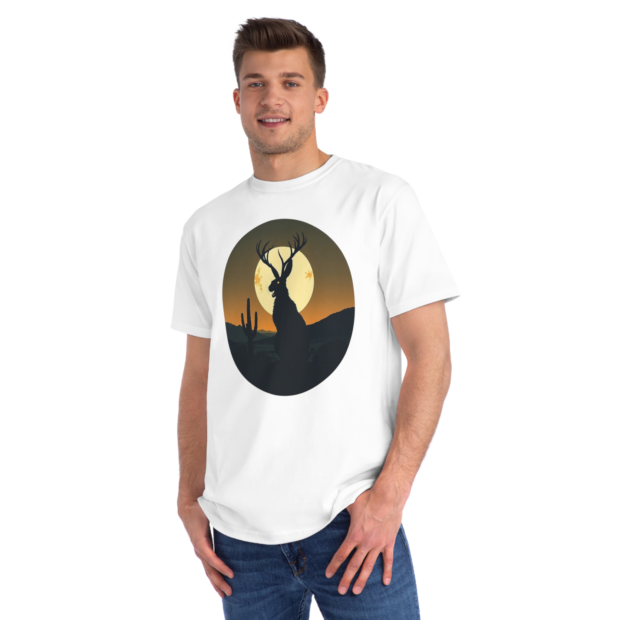 This striking illustration depicts a mystical jackalope silhouetted against a desert landscape at sunset. The hybrid creature, with distinctive antlers and a rabbit-like form, stands prominently in the foreground, casting a dark profile against a large, golden full moon. A solitary saguaro cactus rises on the left side of the image, adding to the southwestern desert atmosphere. The artwork is rendered in a minimalist, circular composition with a limited color palette of deep greens, blacks, and warm oranges and yellows. The stylized, graphic design creates a sense of mystery and mythical folklore, blending natural elements with a surreal, imaginative creature.