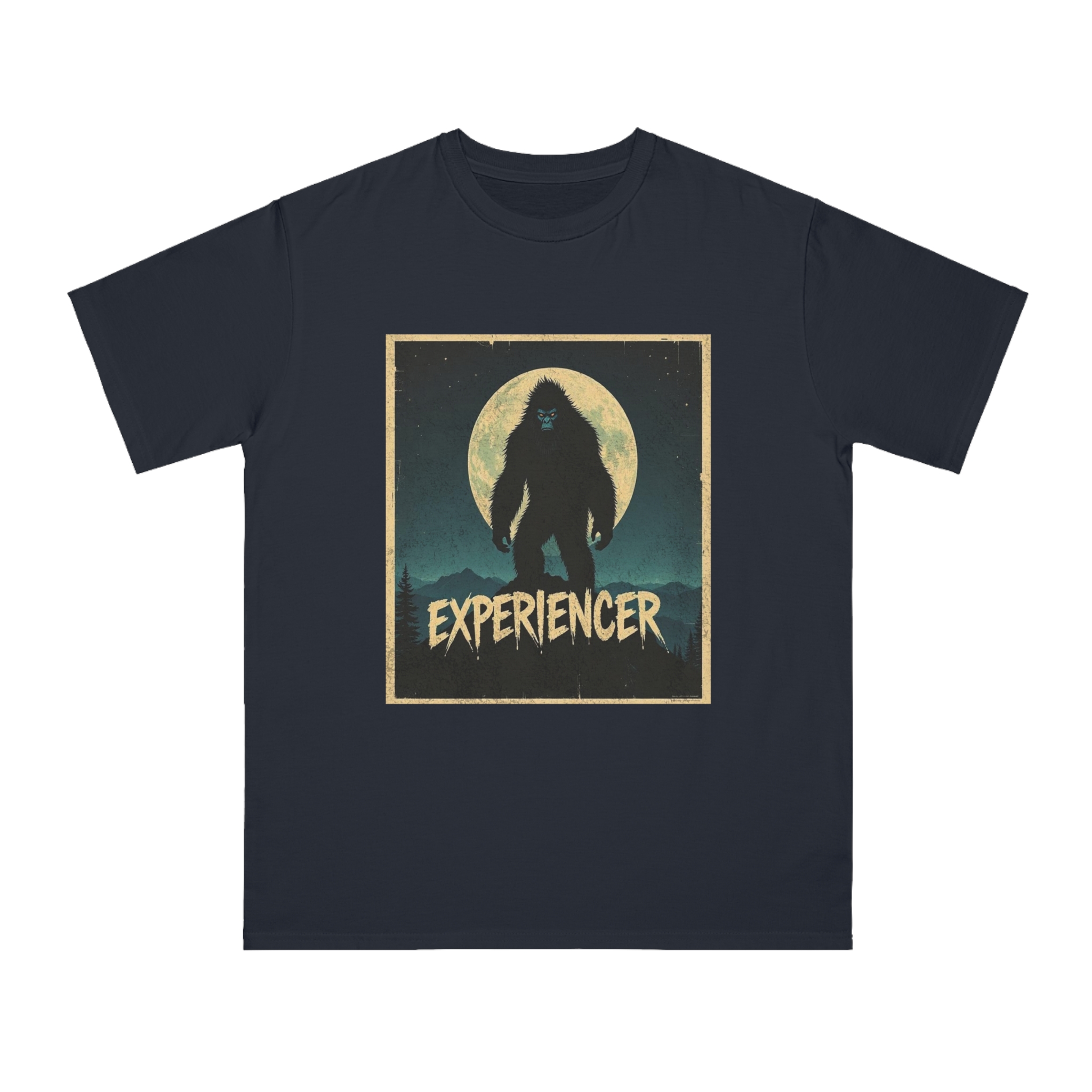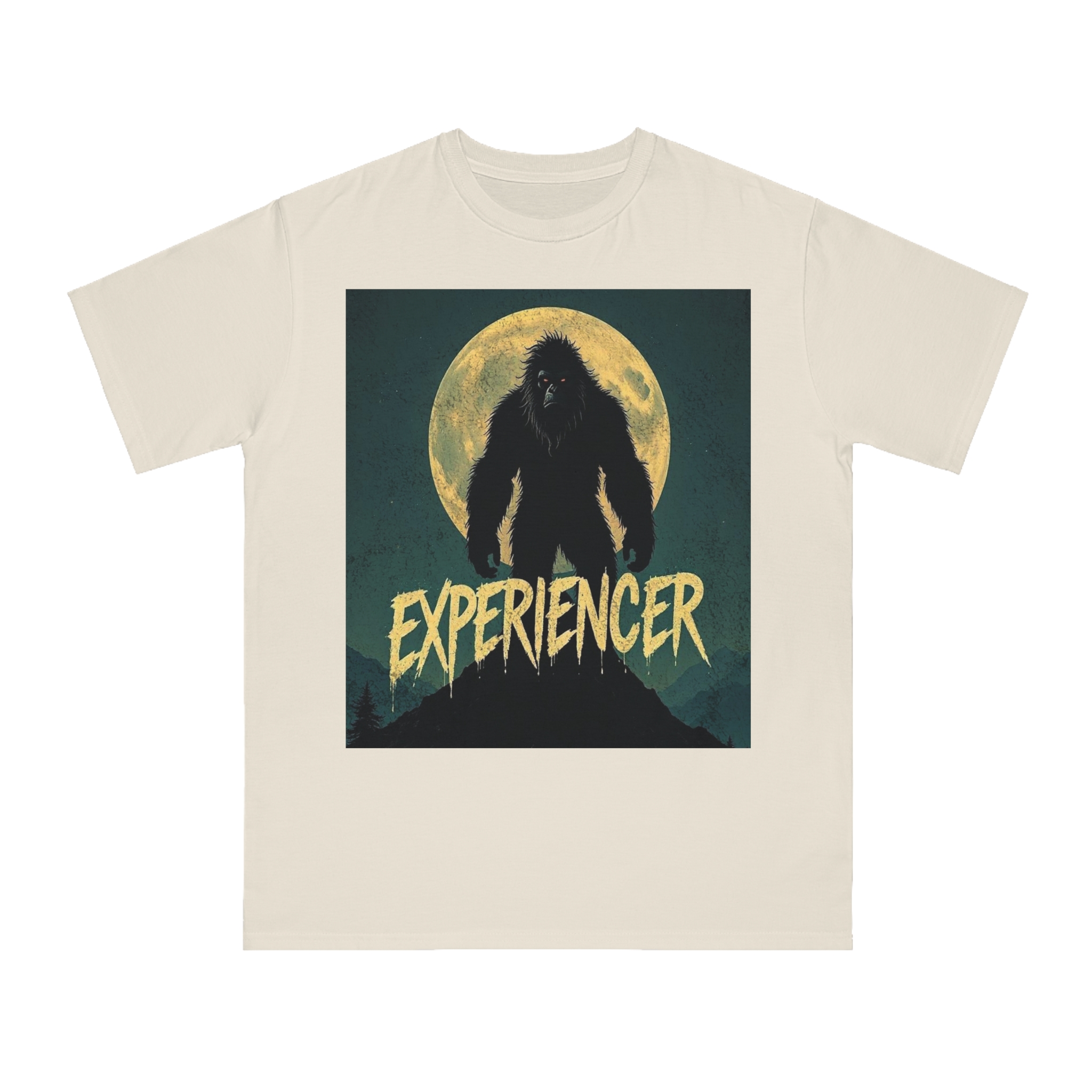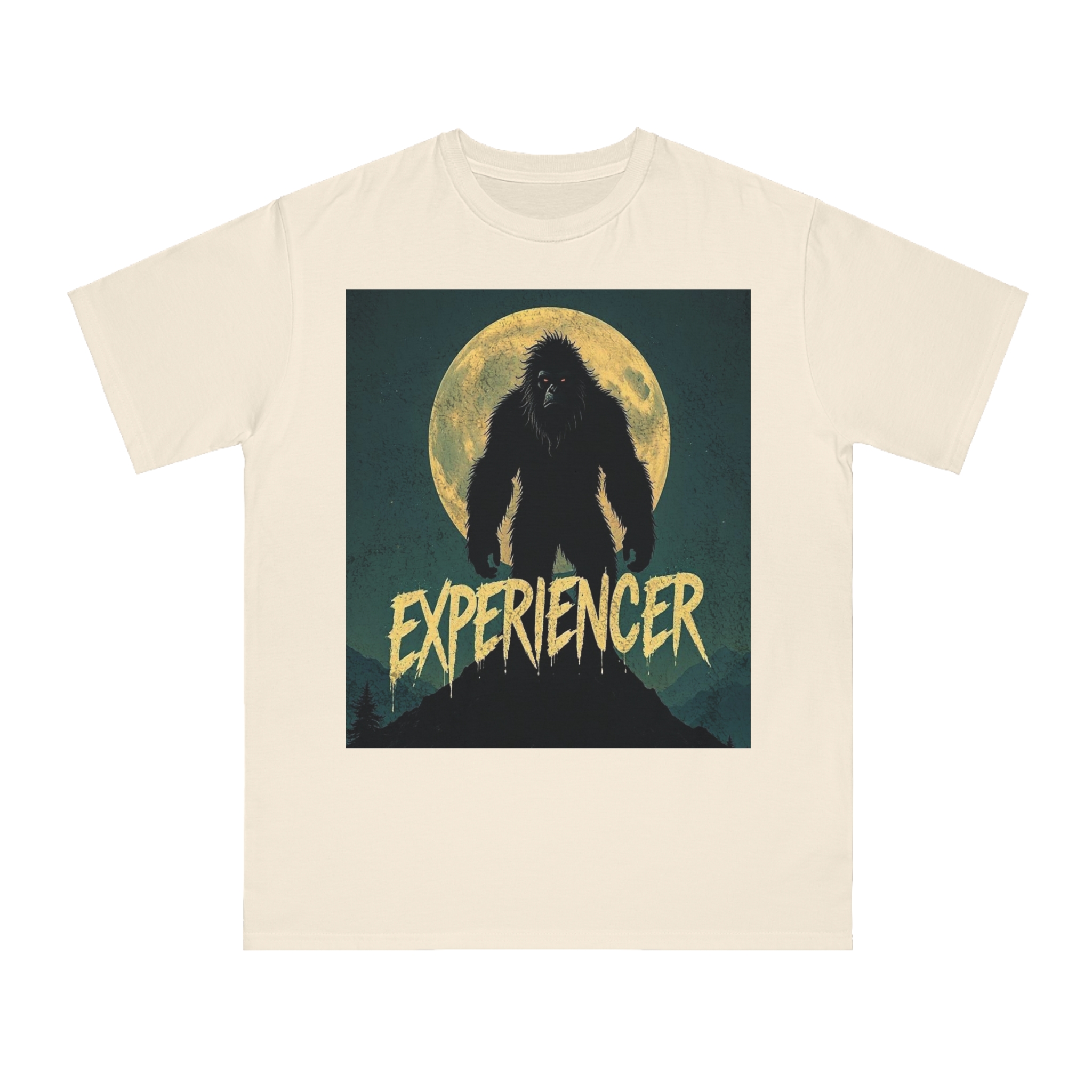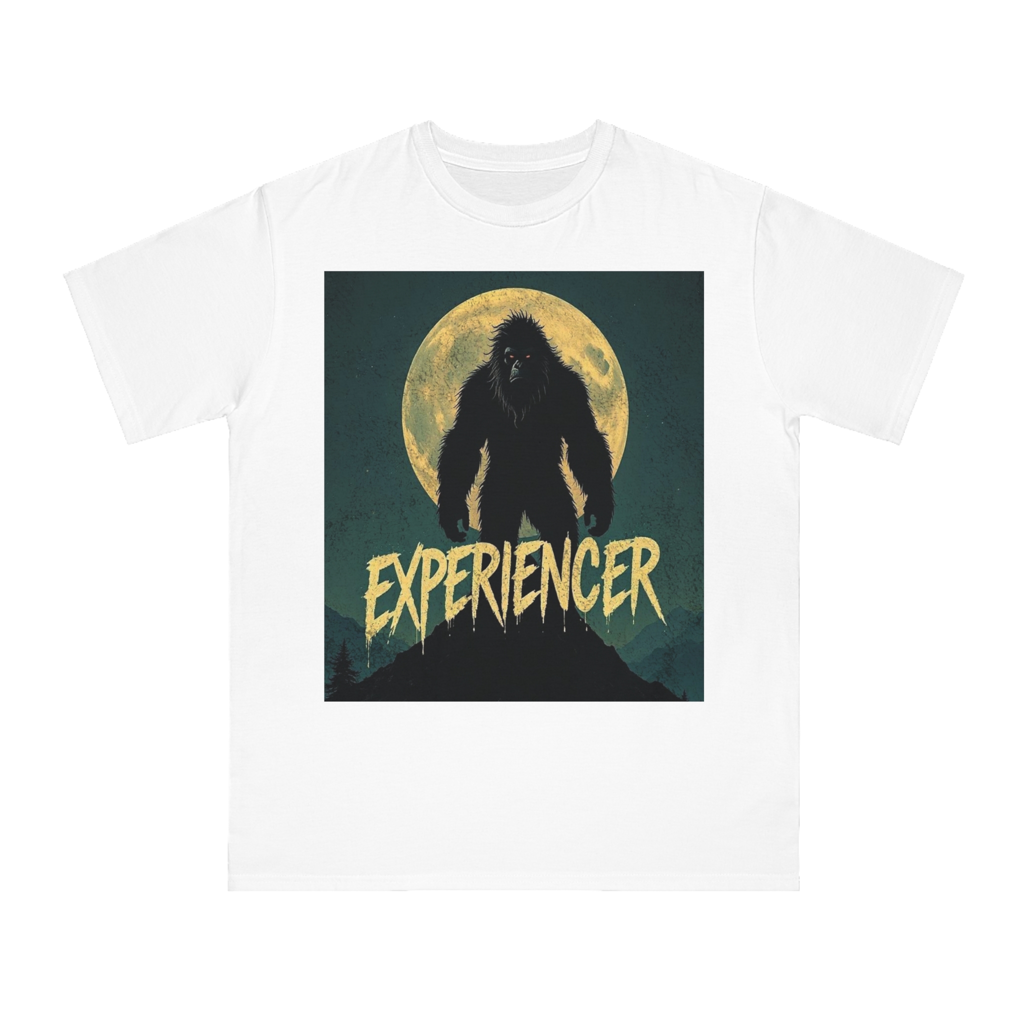 This vintage-style graphic poster depicts a menacing, fur-covered creature silhouetted against a large, textured full moon. The creature appears to be a Bigfoot or Sasquatch-like entity, standing tall with a shaggy, wild appearance and glowing red eyes. Set against a dark teal background with a mountainous landscape, the image has a gritty, retro horror aesthetic. The word “EXPERIENCED” is written in a distressed, dripping font at the bottom of the image, adding to the mysterious and ominous mood. The overall design suggests a vintage movie poster or album cover with a cryptozoological or supernatural theme.