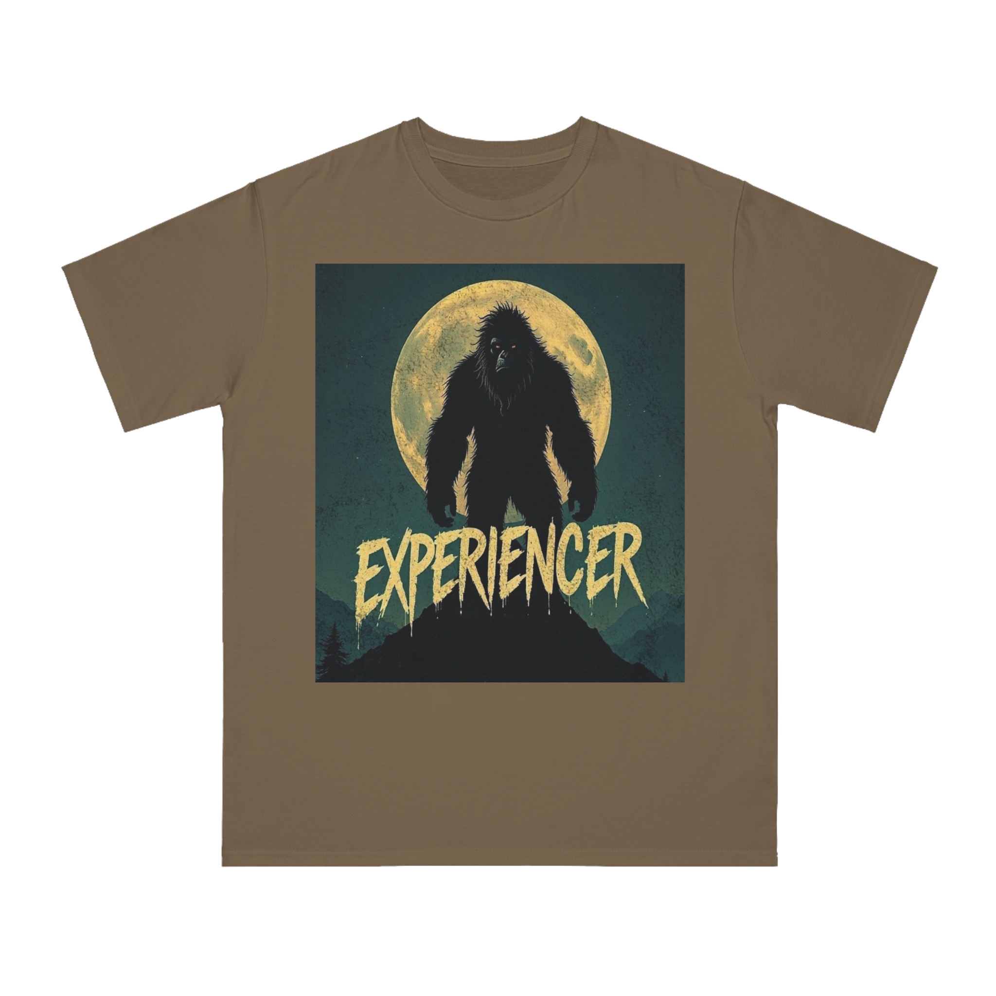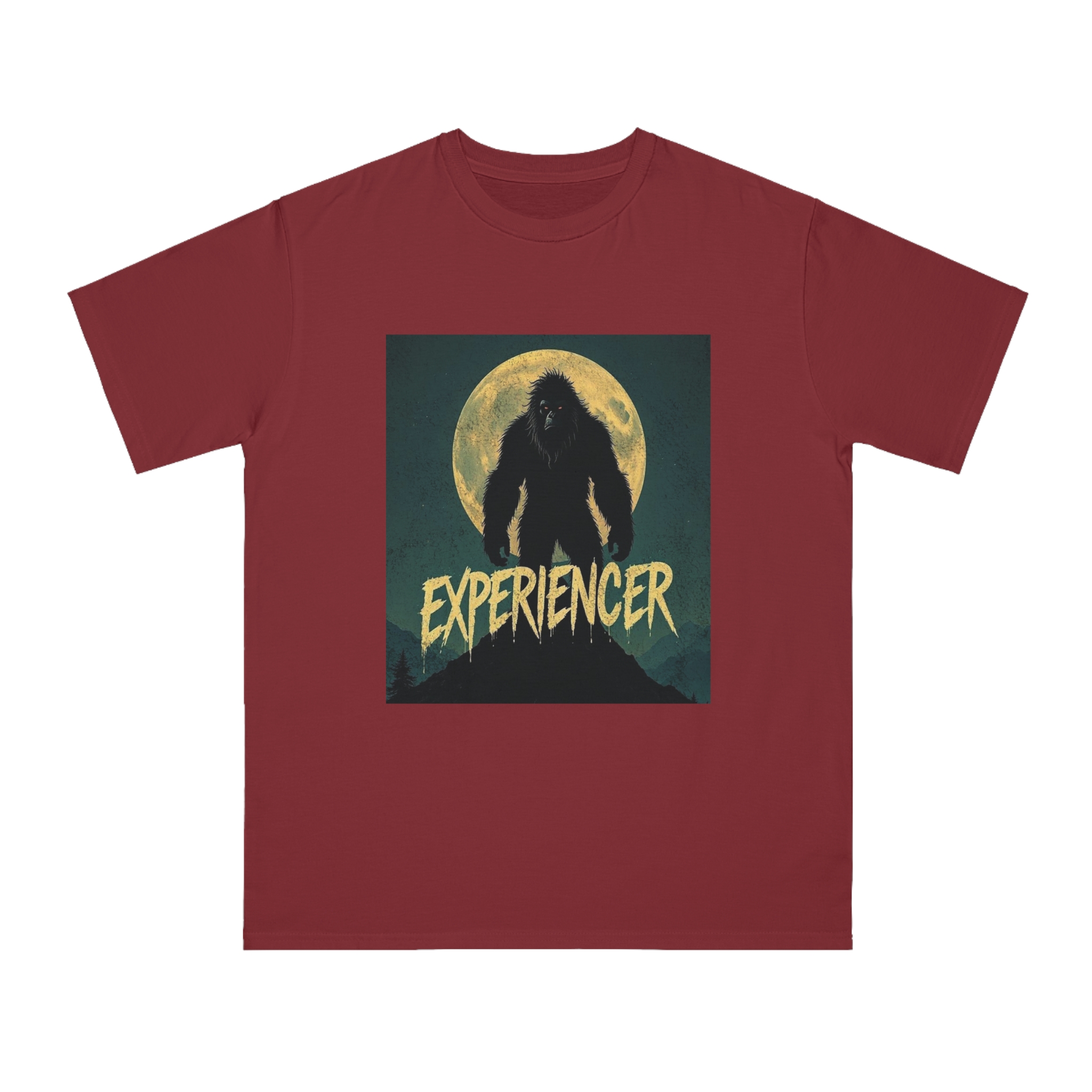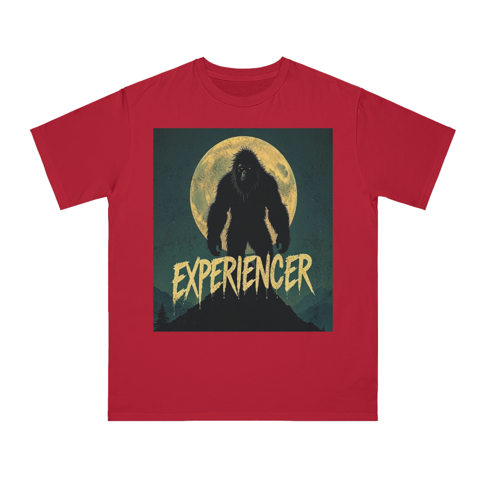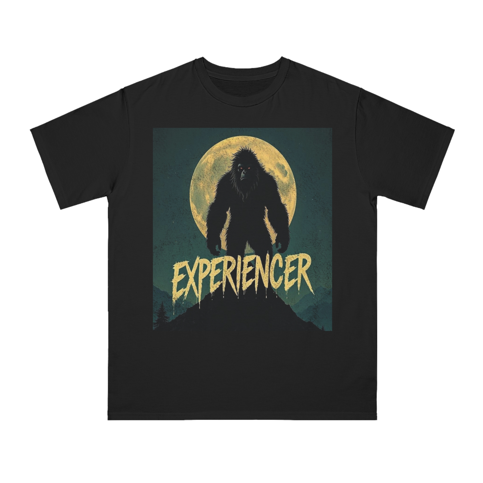 This vintage-style graphic poster depicts a menacing, fur-covered creature silhouetted against a large, textured full moon. The creature appears to be a Bigfoot or Sasquatch-like entity, standing tall with a shaggy, wild appearance and glowing red eyes. Set against a dark teal background with a mountainous landscape, the image has a gritty, retro horror aesthetic. The word “EXPERIENCED” is written in a distressed, dripping font at the bottom of the image, adding to the mysterious and ominous mood. The overall design suggests a vintage movie poster or album cover with a cryptozoological or supernatural theme.