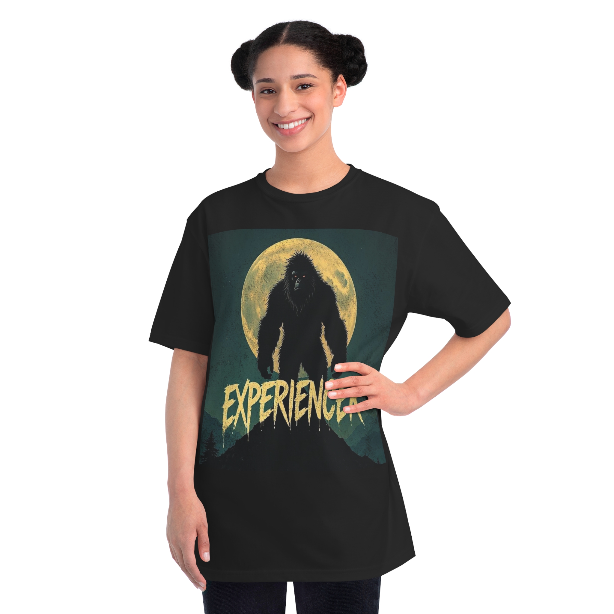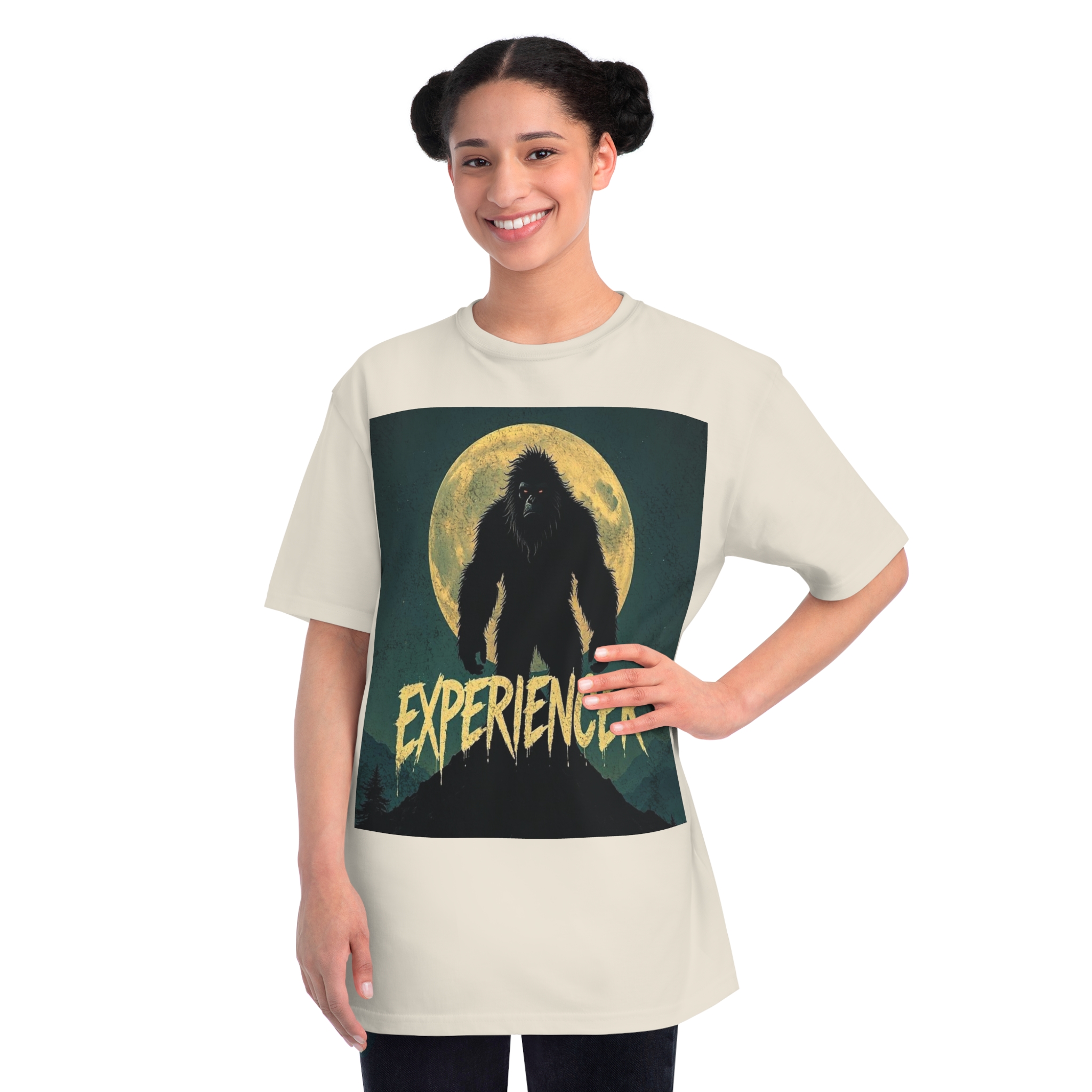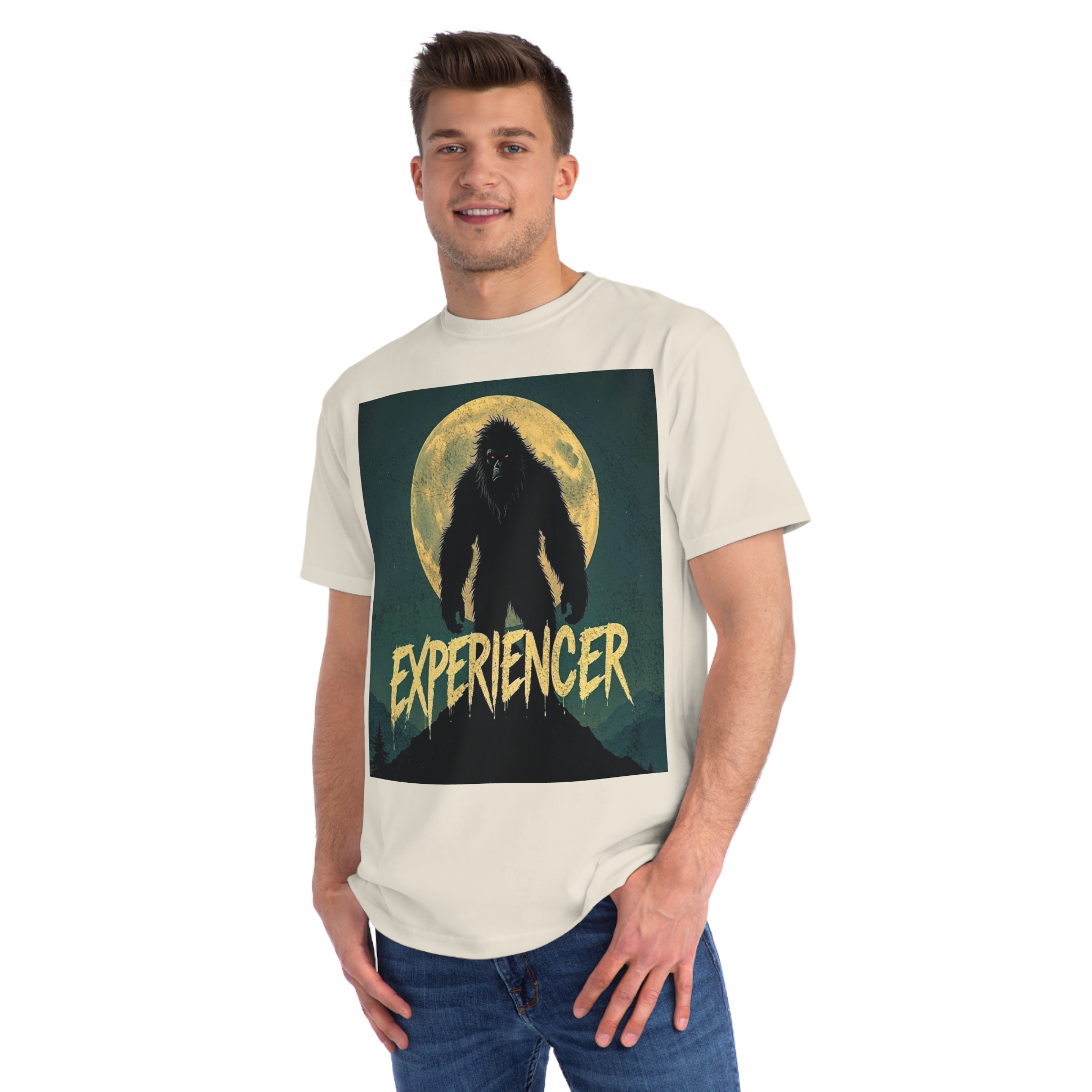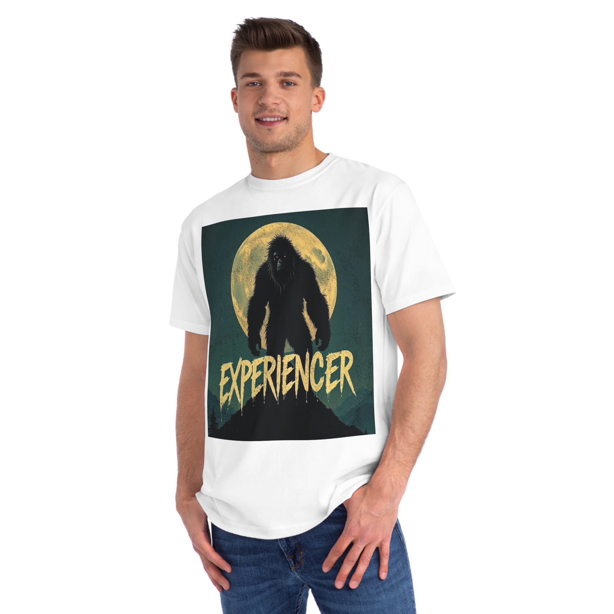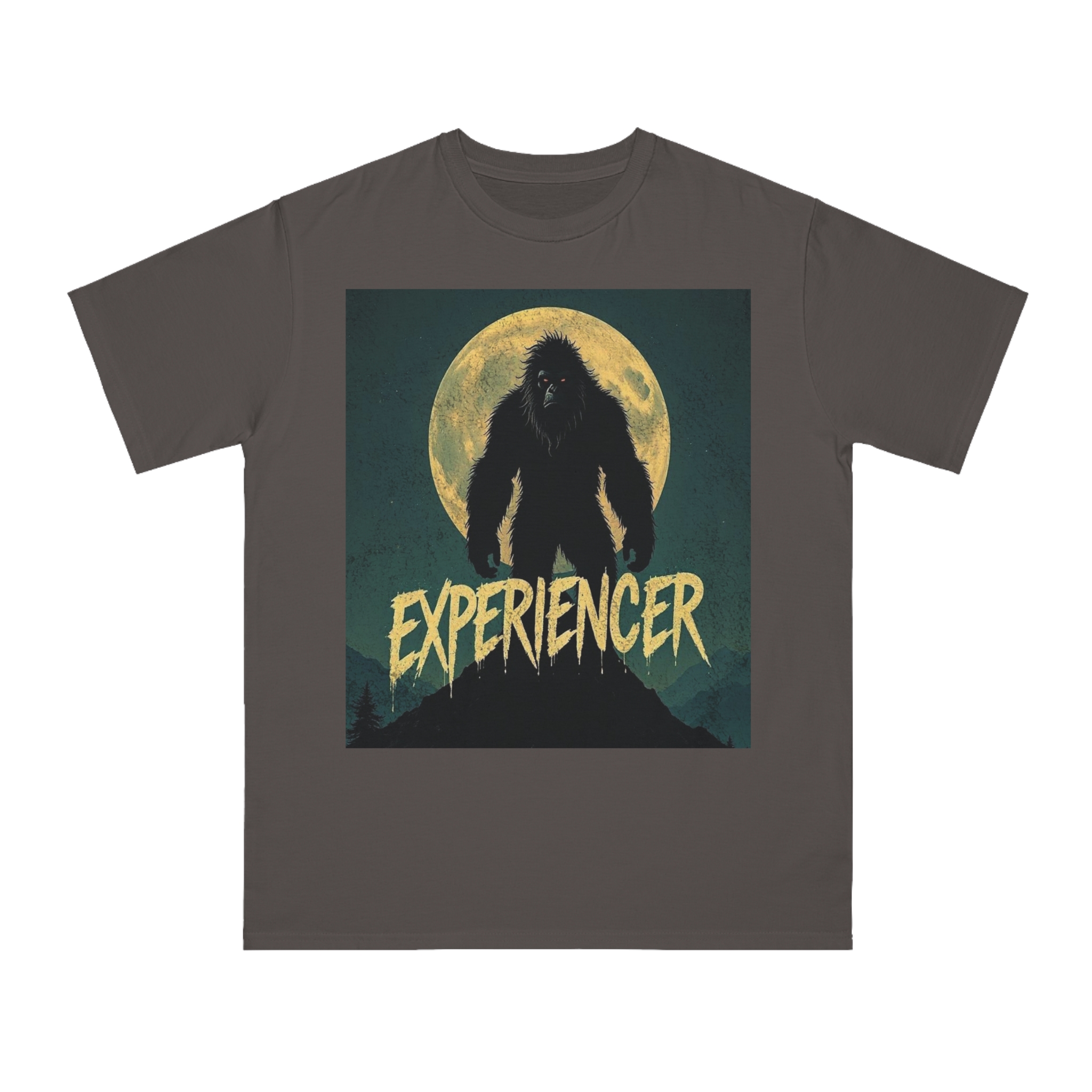 This vintage-style graphic poster depicts a menacing, fur-covered creature silhouetted against a large, textured full moon. The creature appears to be a Bigfoot or Sasquatch-like entity, standing tall with a shaggy, wild appearance and glowing red eyes. Set against a dark teal background with a mountainous landscape, the image has a gritty, retro horror aesthetic. The word “EXPERIENCED” is written in a distressed, dripping font at the bottom of the image, adding to the mysterious and ominous mood. The overall design suggests a vintage movie poster or album cover with a cryptozoological or supernatural theme.