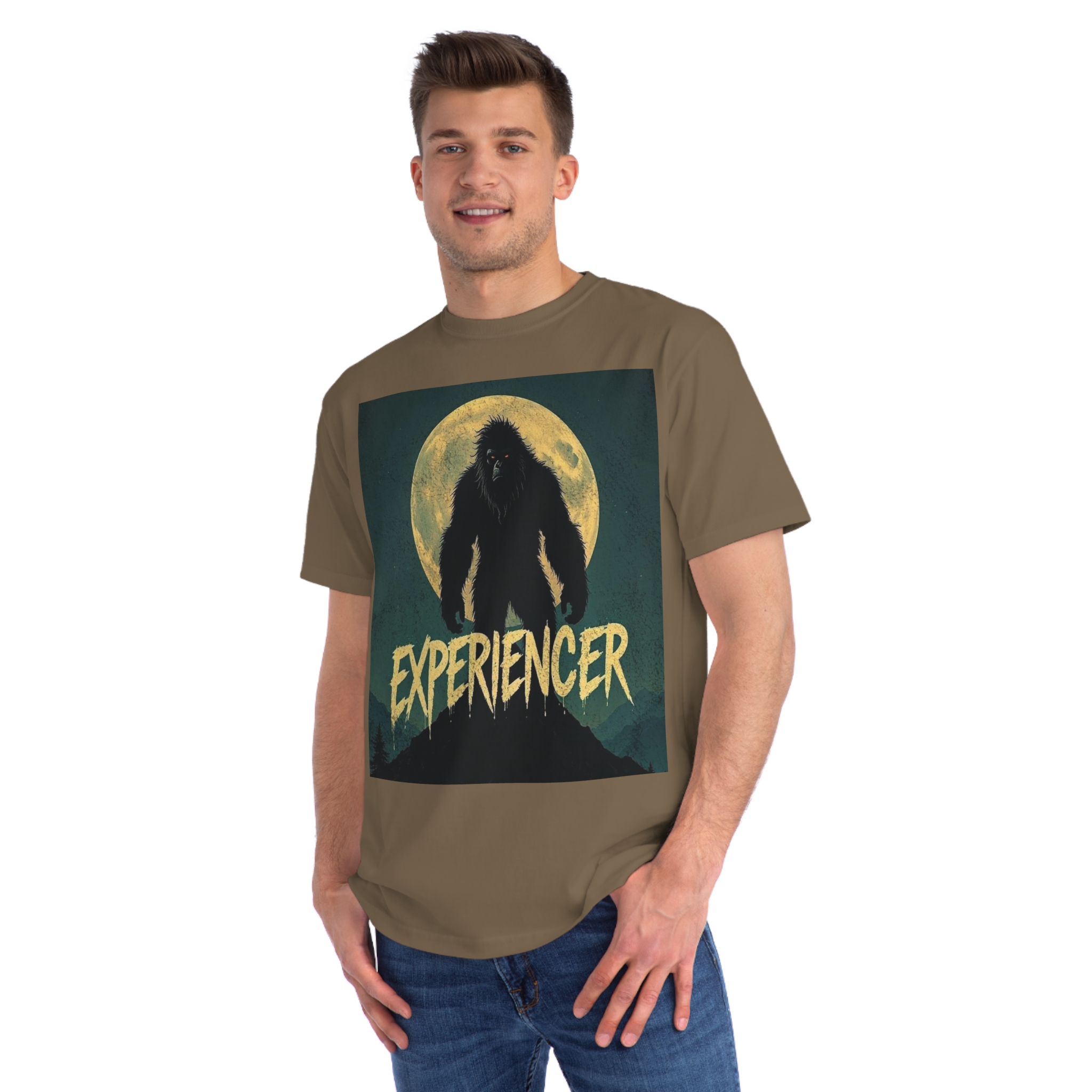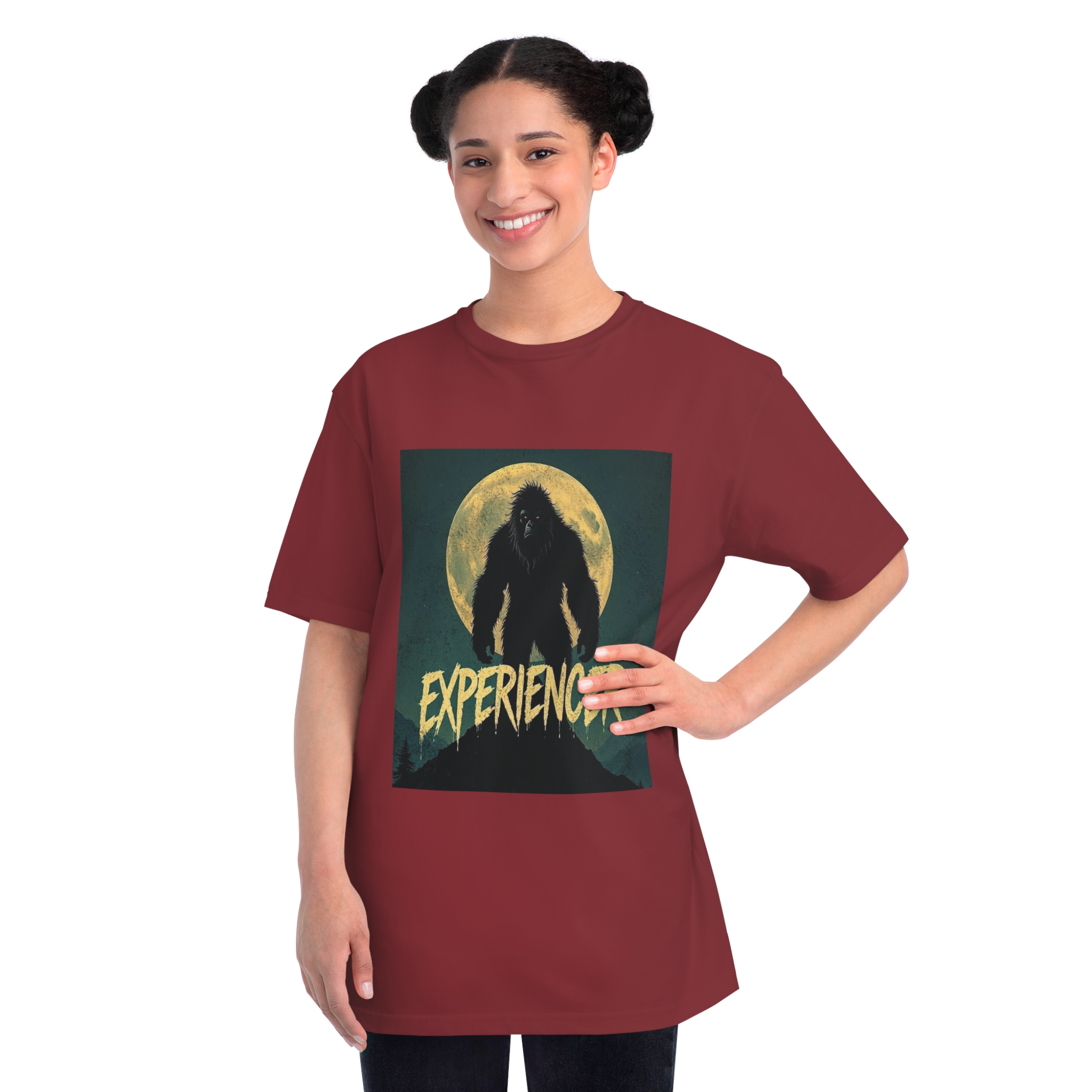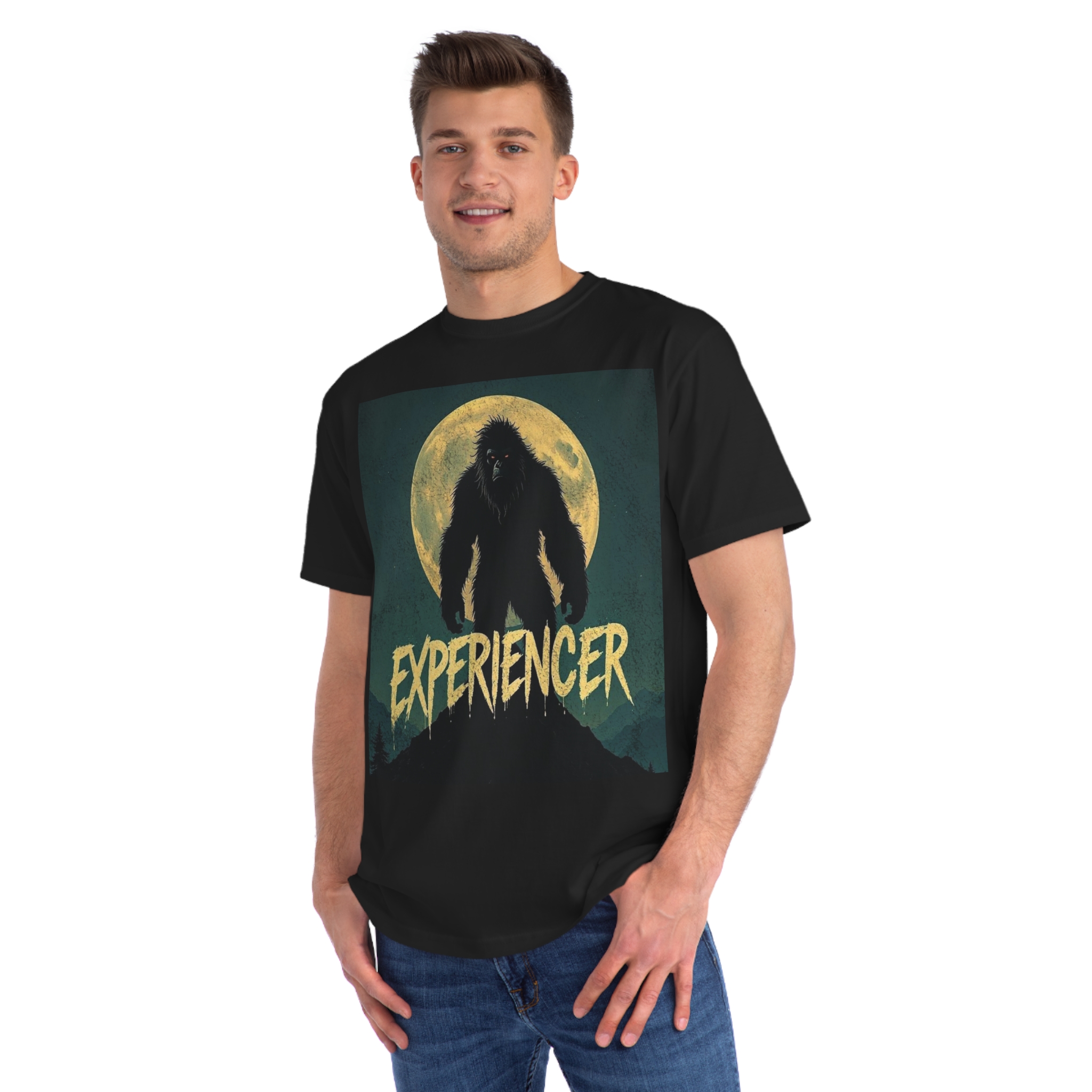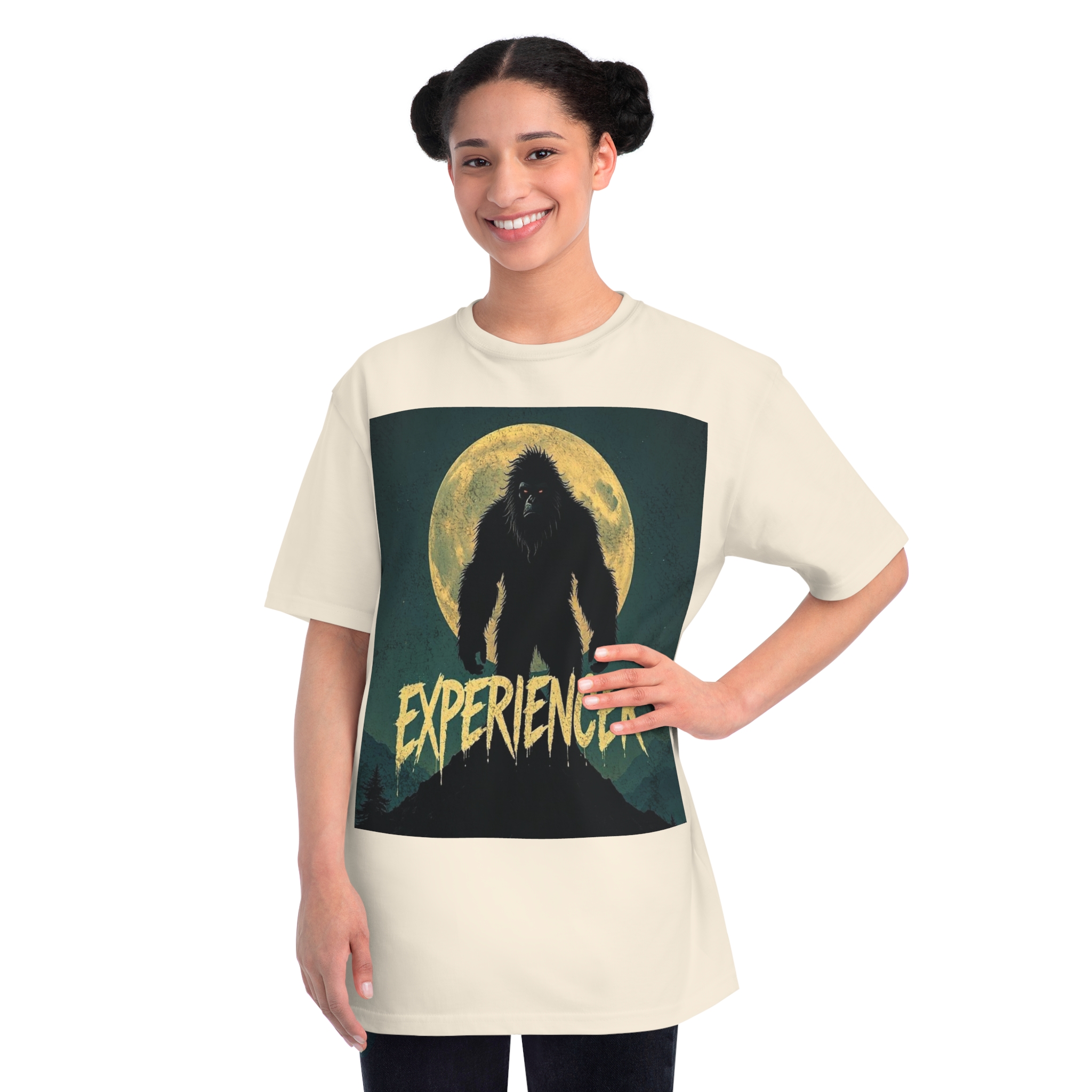 This vintage-style graphic poster depicts a menacing, fur-covered creature silhouetted against a large, textured full moon. The creature appears to be a Bigfoot or Sasquatch-like entity, standing tall with a shaggy, wild appearance and glowing red eyes. Set against a dark teal background with a mountainous landscape, the image has a gritty, retro horror aesthetic. The word “EXPERIENCED” is written in a distressed, dripping font at the bottom of the image, adding to the mysterious and ominous mood. The overall design suggests a vintage movie poster or album cover with a cryptozoological or supernatural theme.