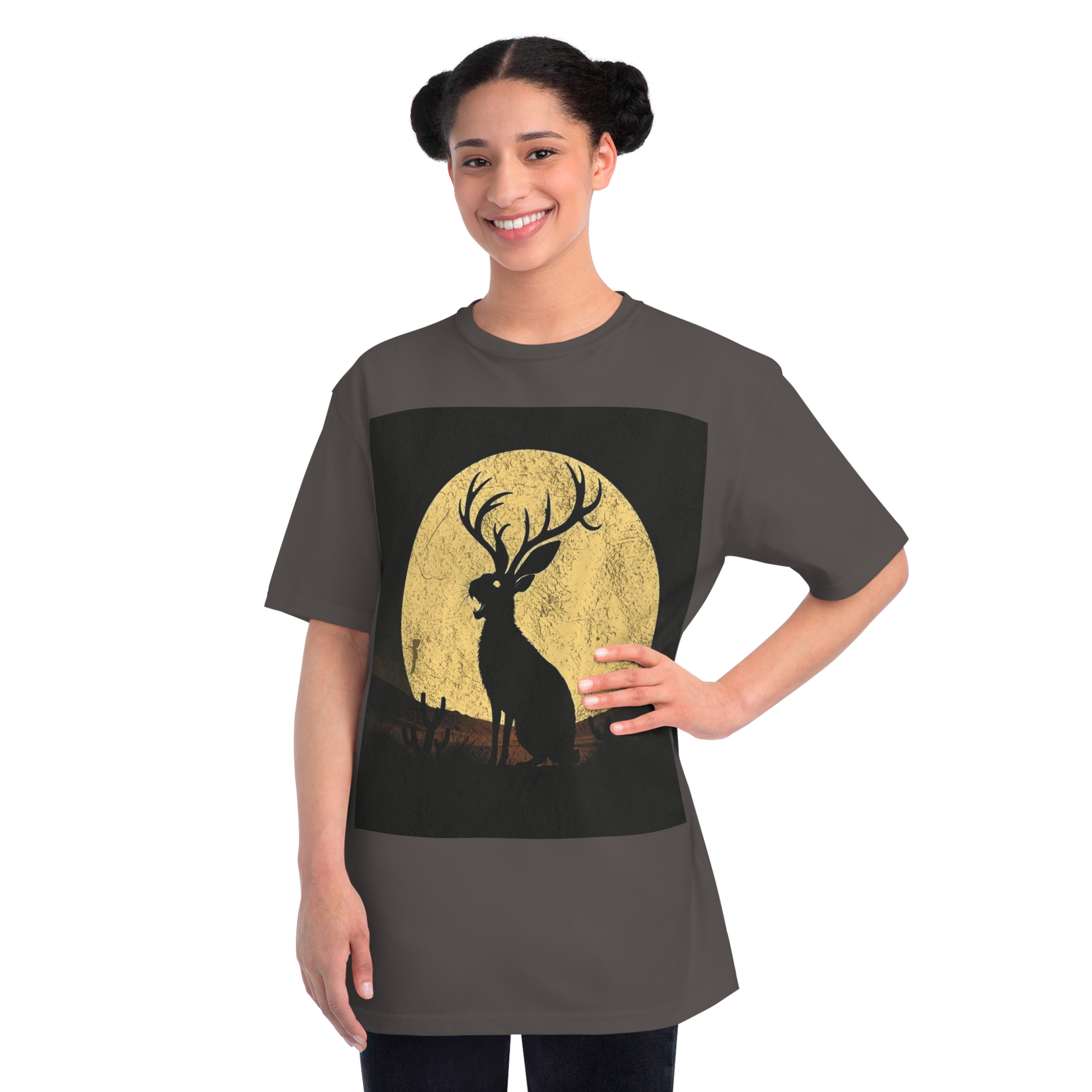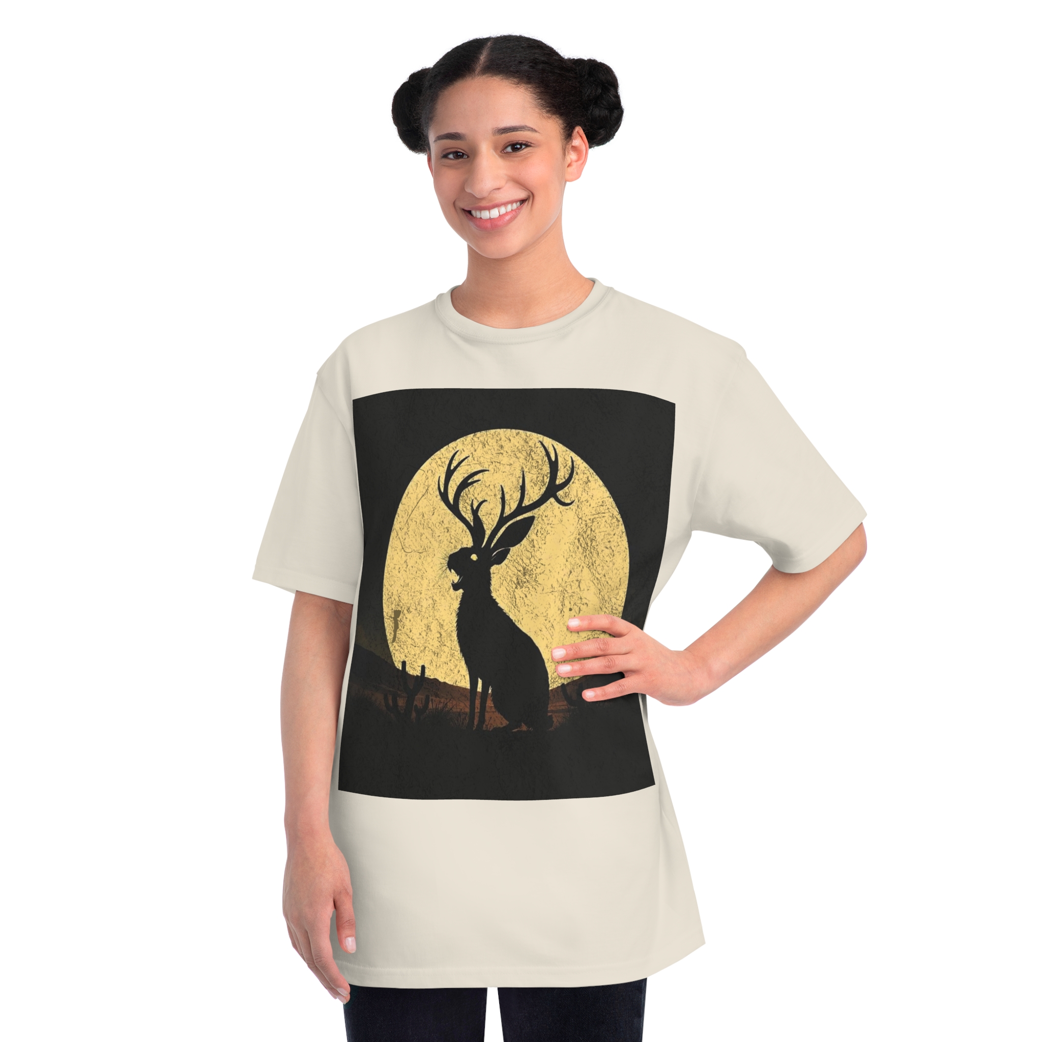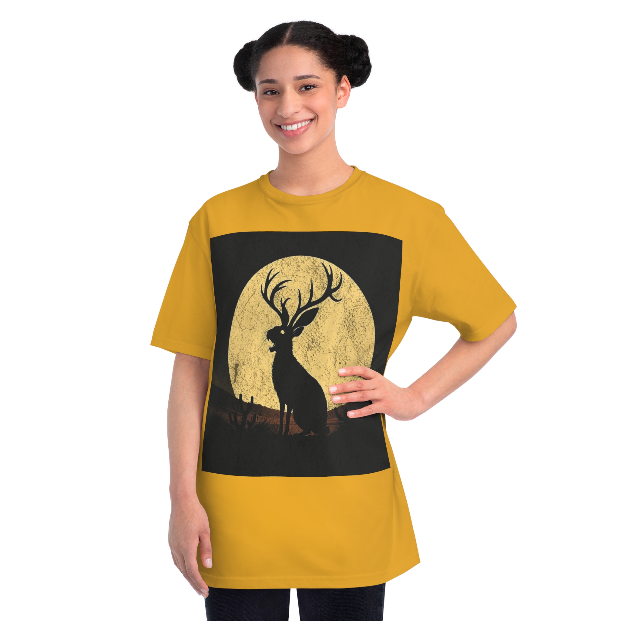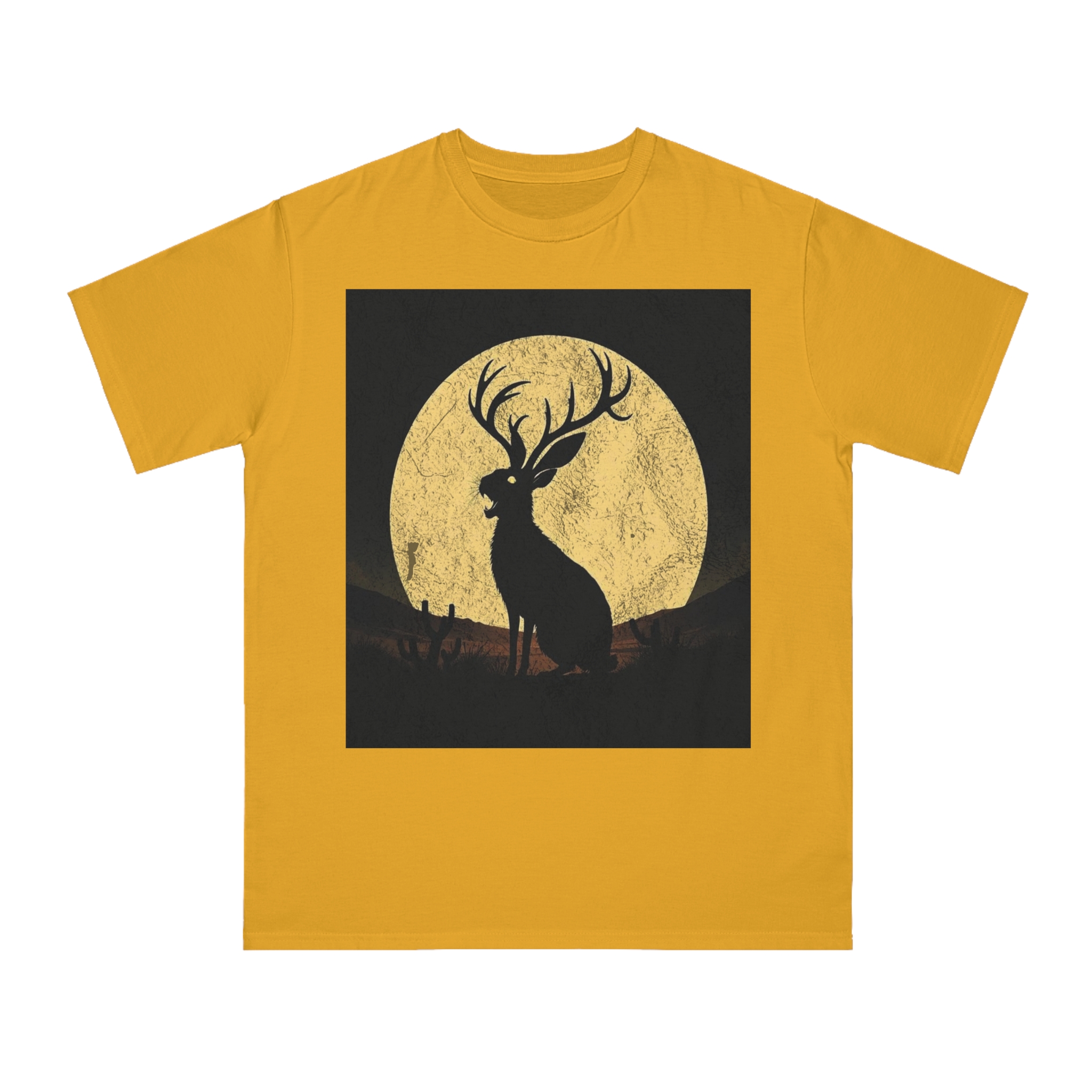This striking graphic illustration depicts a majestic jackalope silhouetted against a large, textured golden moon. The creature stands in a dark, desert-like landscape with cacti and rugged terrain visible in the background. Its body is rendered in solid black, with impressive antlers spreading wide and a fierce, open-mouthed expression that suggests a wild, untamed spirit. The image employs a dramatic contrast between the deep black foreground and the rich, golden-yellow background, creating a powerful visual impact. The art style appears to be a blend of minimalist silhouette design and vintage poster-like texturing, giving the piece a timeless and mythical quality.