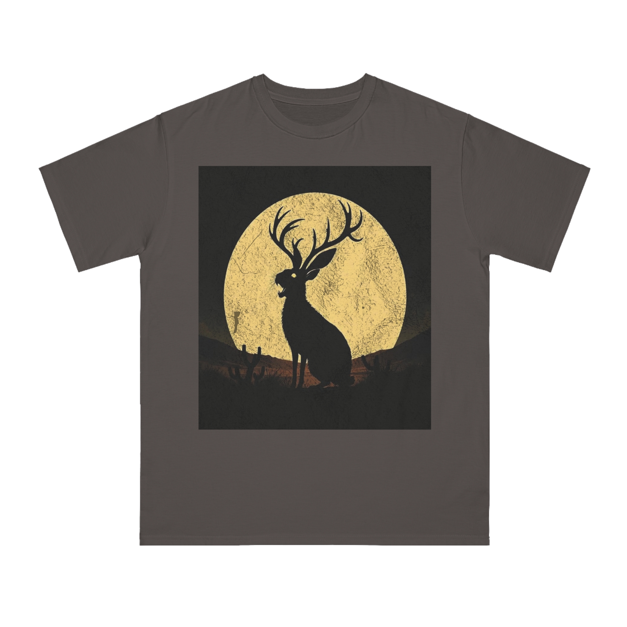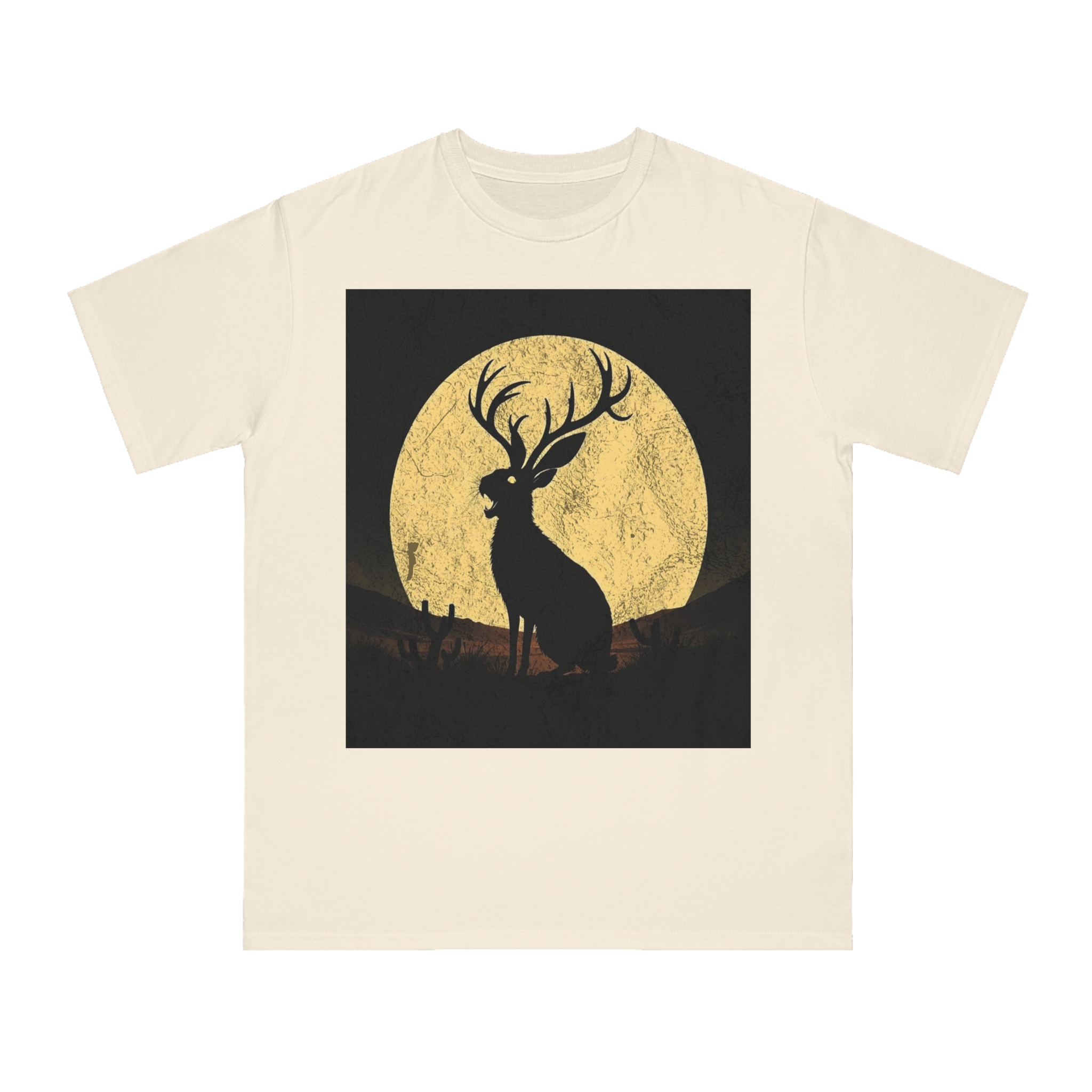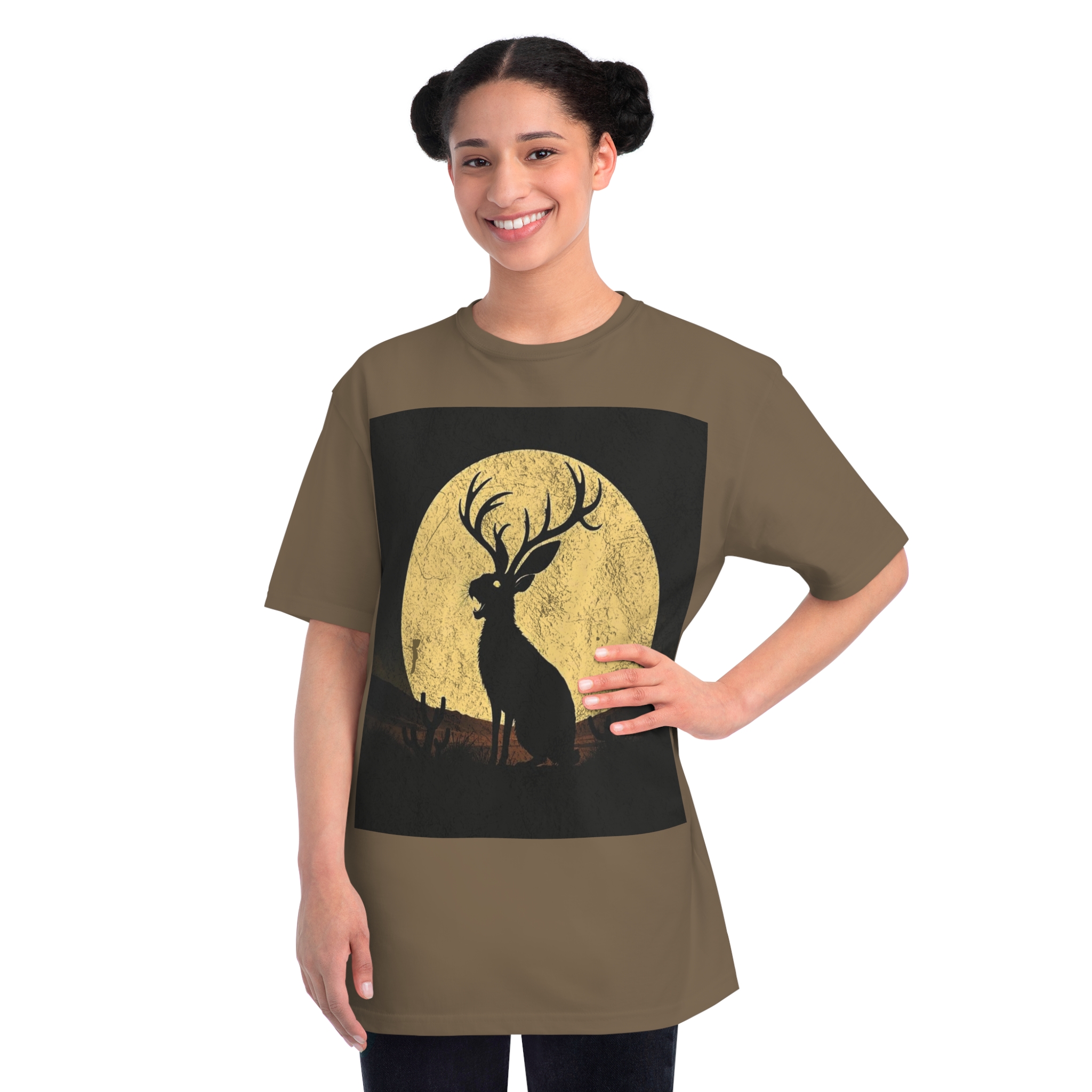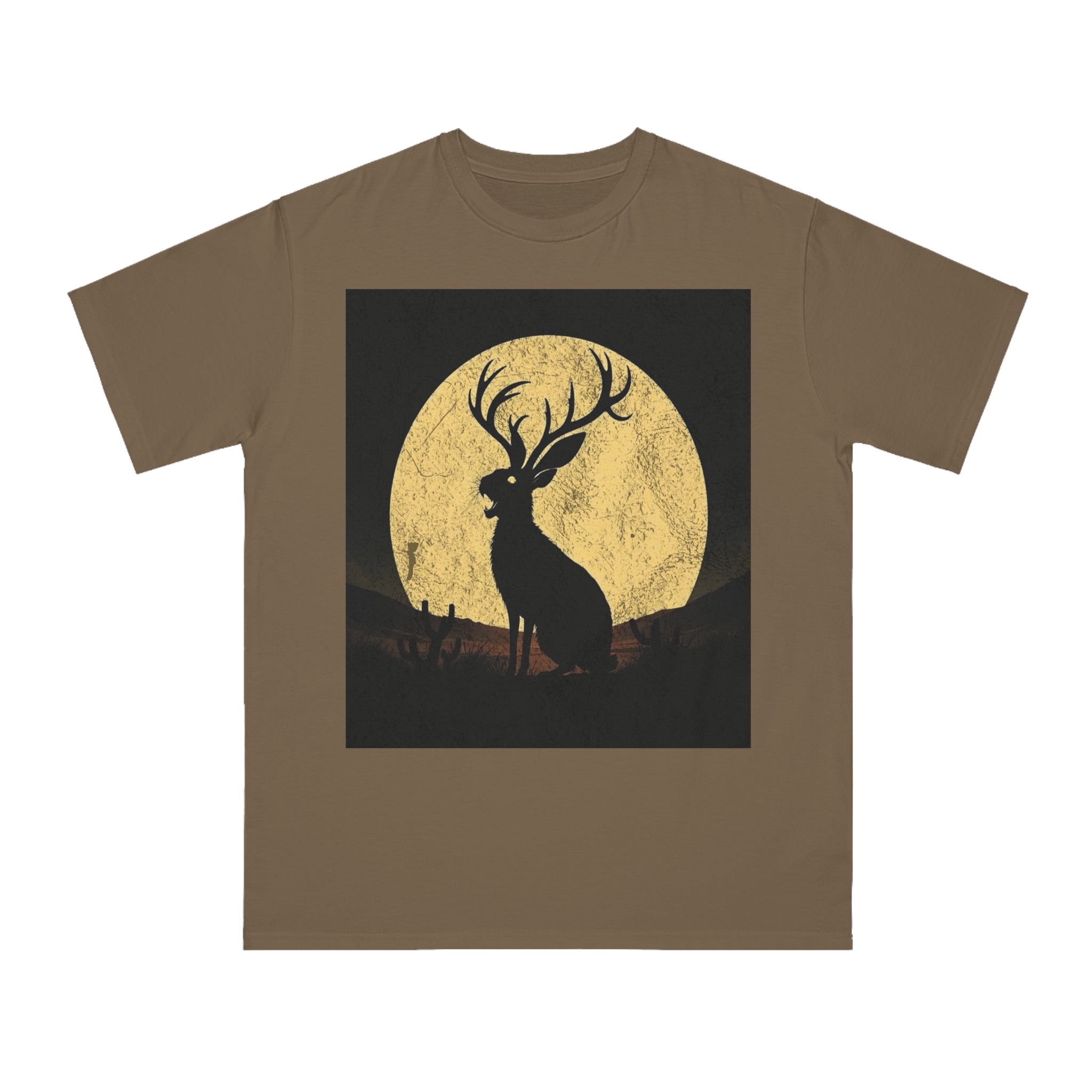 This striking graphic illustration depicts a majestic jackalope silhouetted against a large, textured golden moon. The creature stands in a dark, desert-like landscape with cacti and rugged terrain visible in the background. Its body is rendered in solid black, with impressive antlers spreading wide and a fierce, open-mouthed expression that suggests a wild, untamed spirit. The image employs a dramatic contrast between the deep black foreground and the rich, golden-yellow background, creating a powerful visual impact. The art style appears to be a blend of minimalist silhouette design and vintage poster-like texturing, giving the piece a timeless and mythical quality.