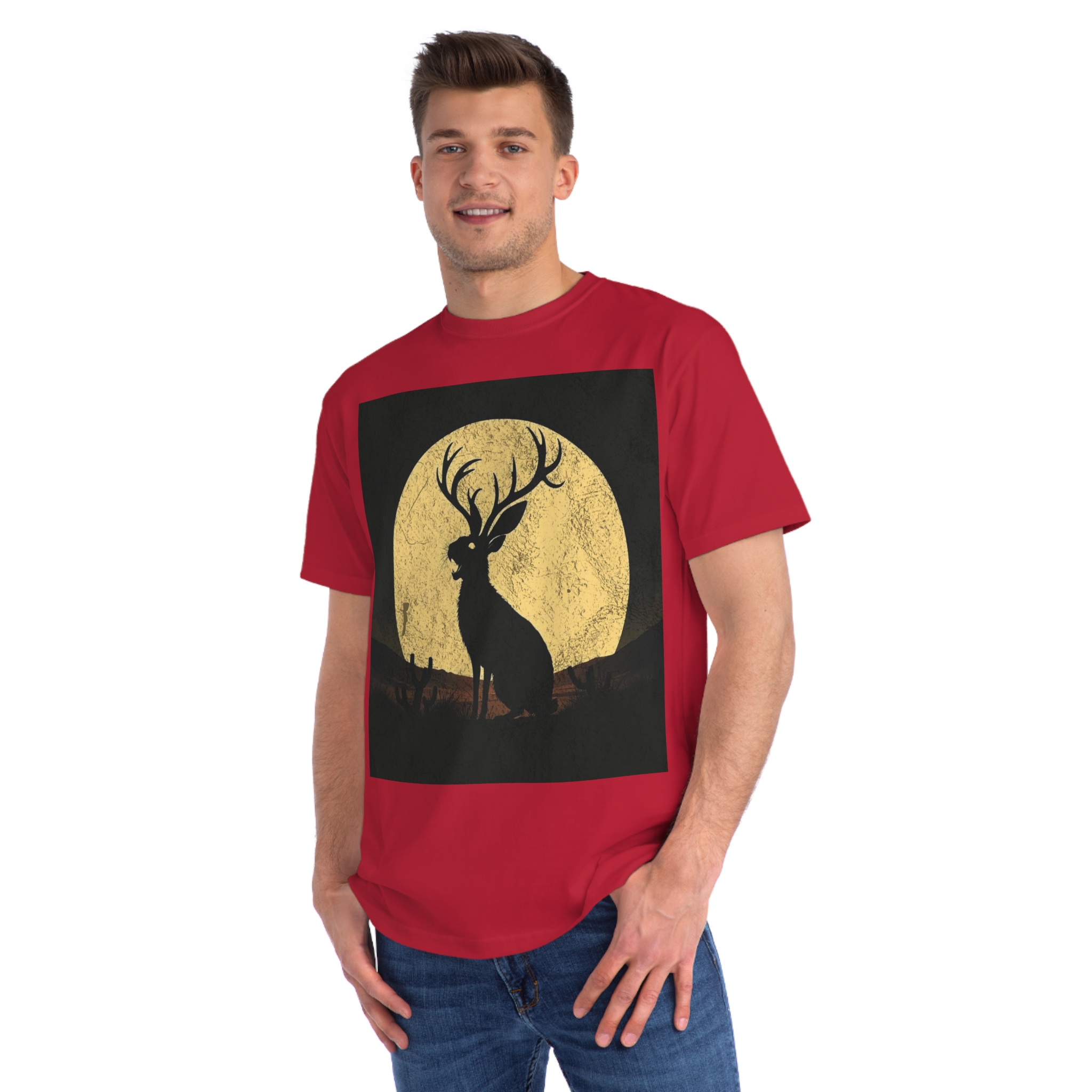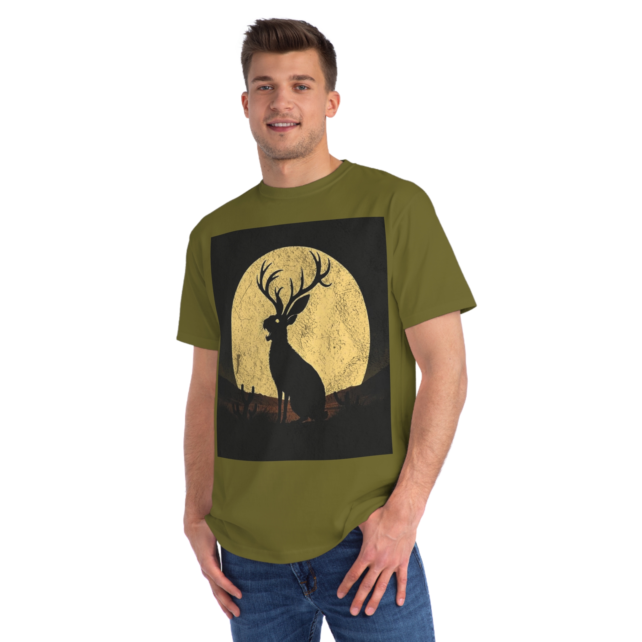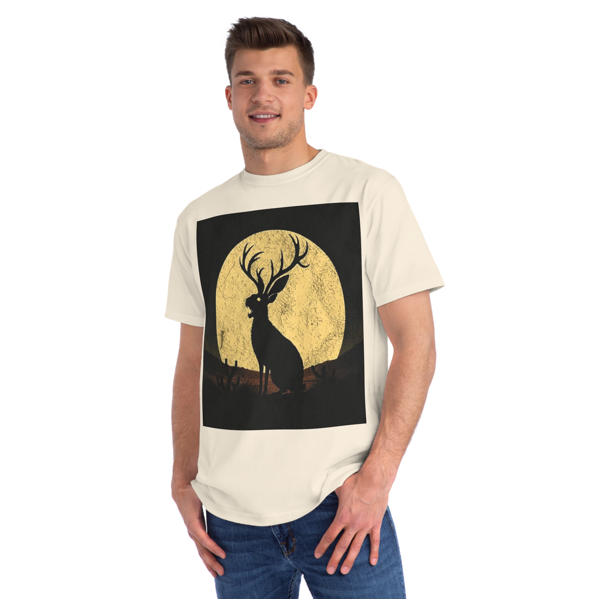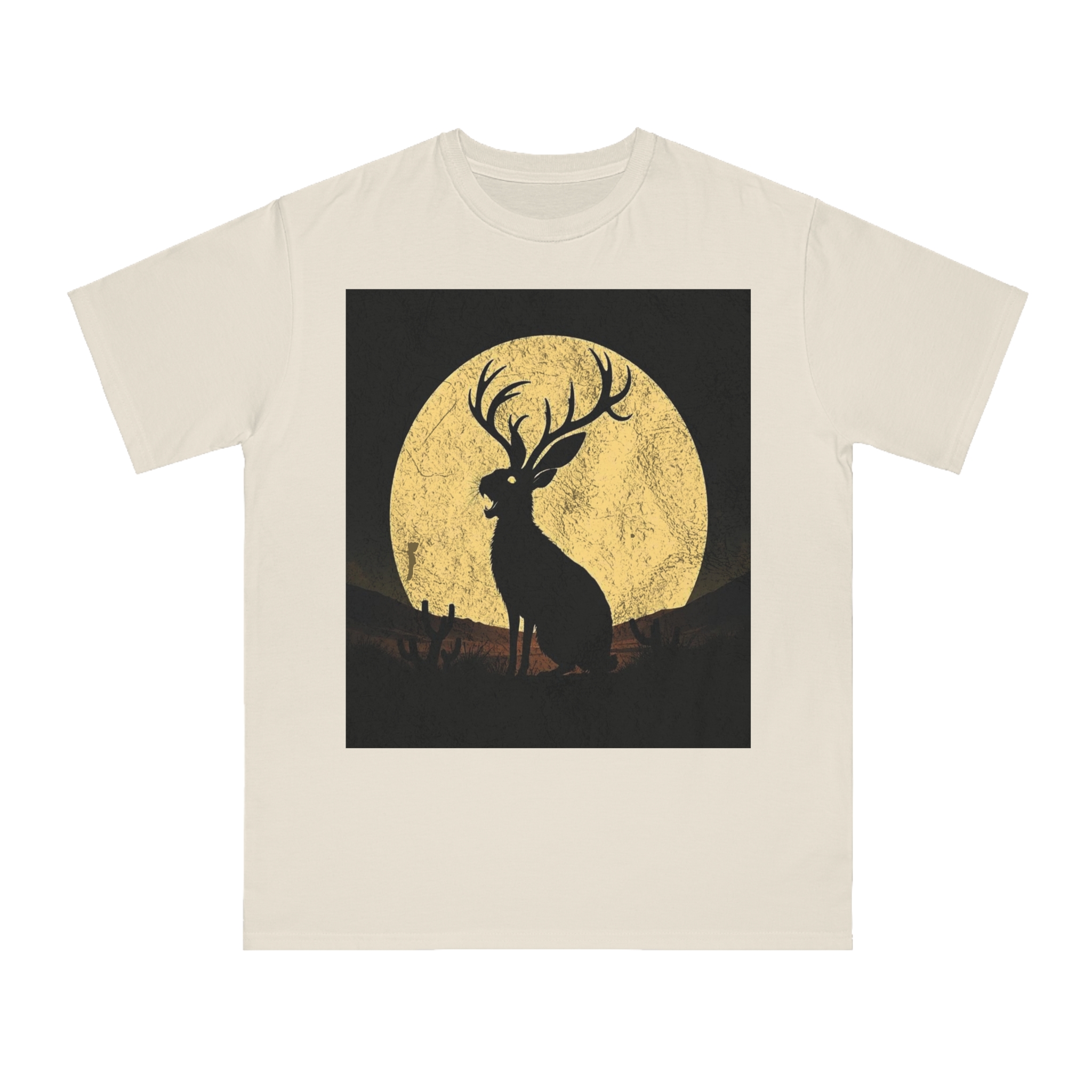 This striking graphic illustration depicts a majestic jackalope silhouetted against a large, textured golden moon. The creature stands in a dark, desert-like landscape with cacti and rugged terrain visible in the background. Its body is rendered in solid black, with impressive antlers spreading wide and a fierce, open-mouthed expression that suggests a wild, untamed spirit. The image employs a dramatic contrast between the deep black foreground and the rich, golden-yellow background, creating a powerful visual impact. The art style appears to be a blend of minimalist silhouette design and vintage poster-like texturing, giving the piece a timeless and mythical quality.