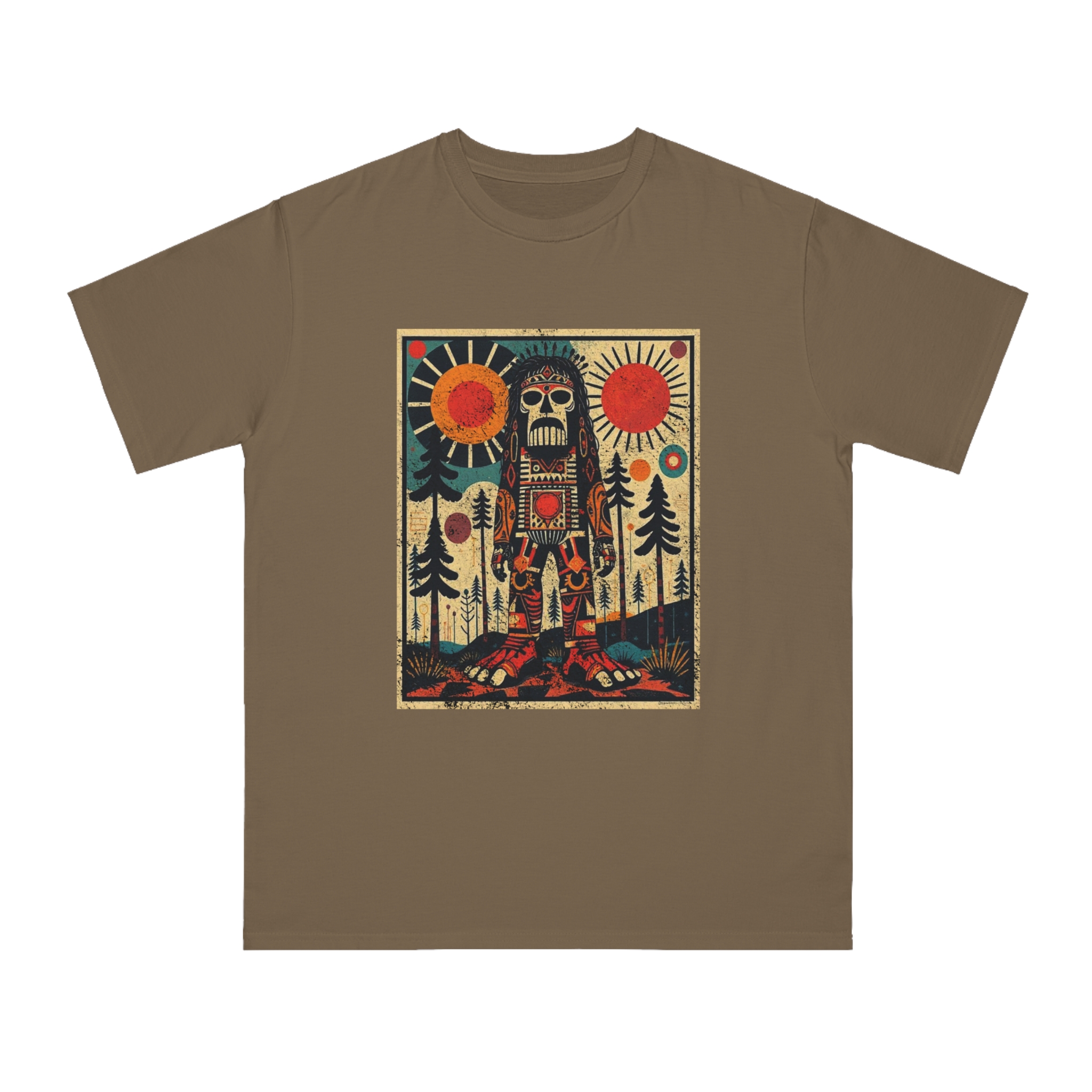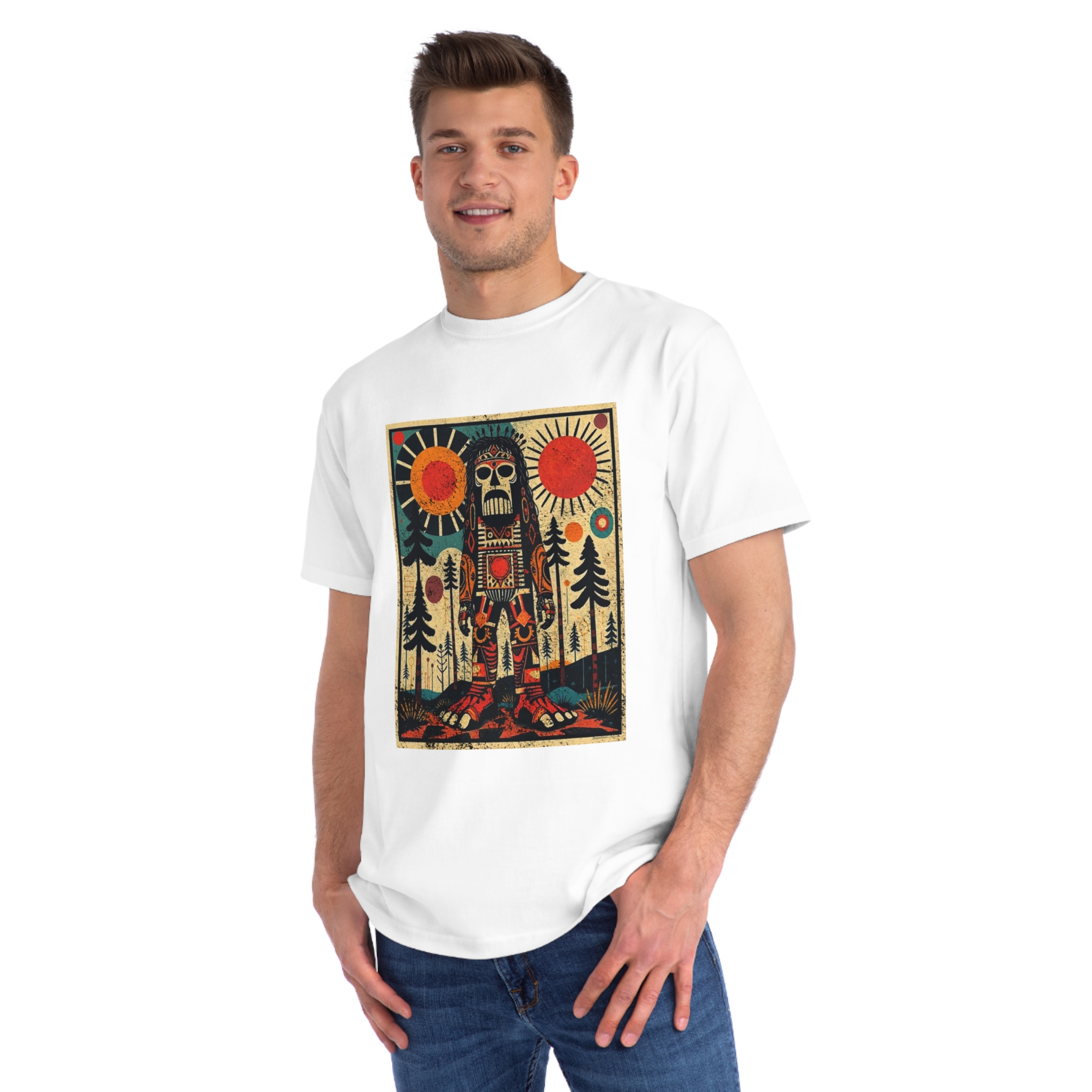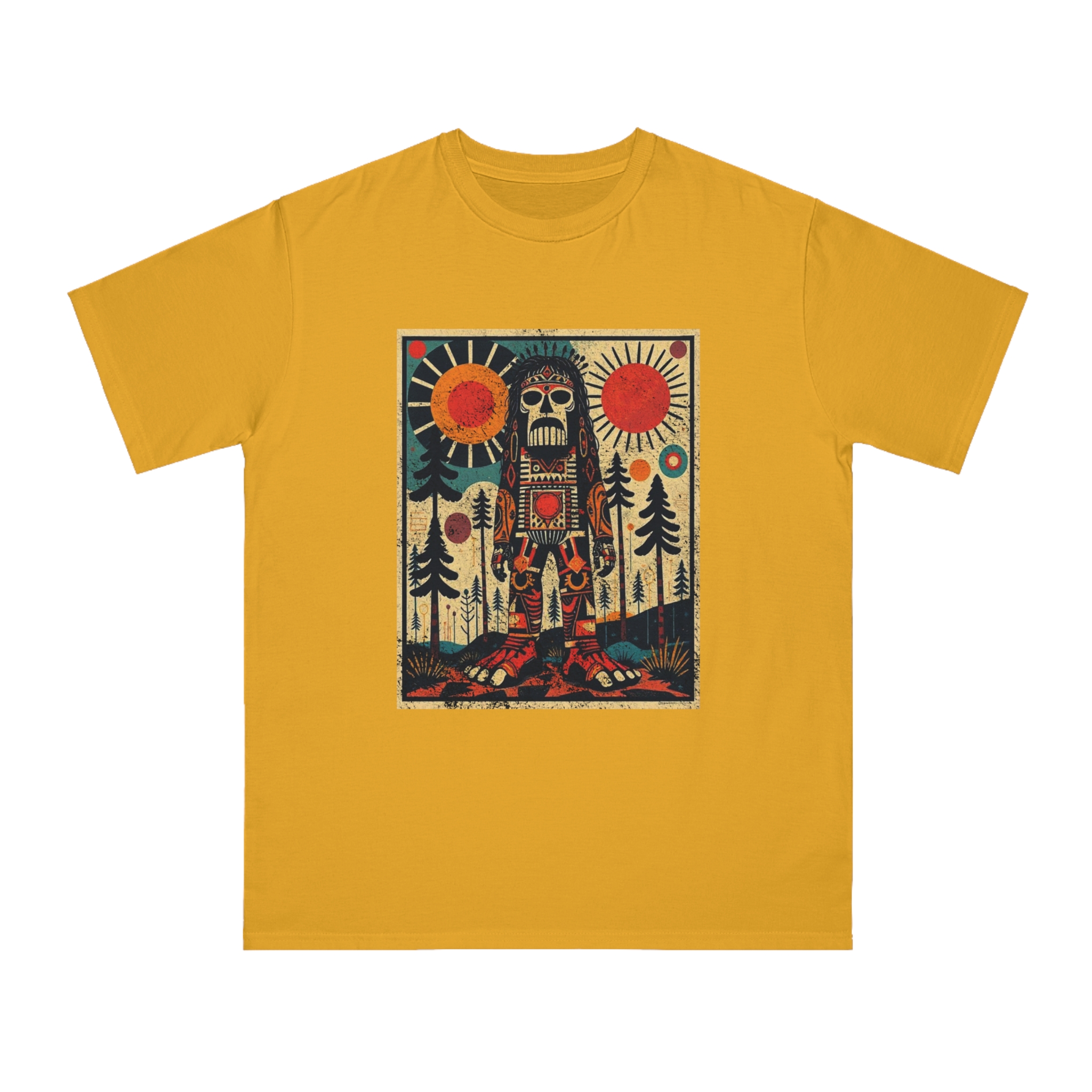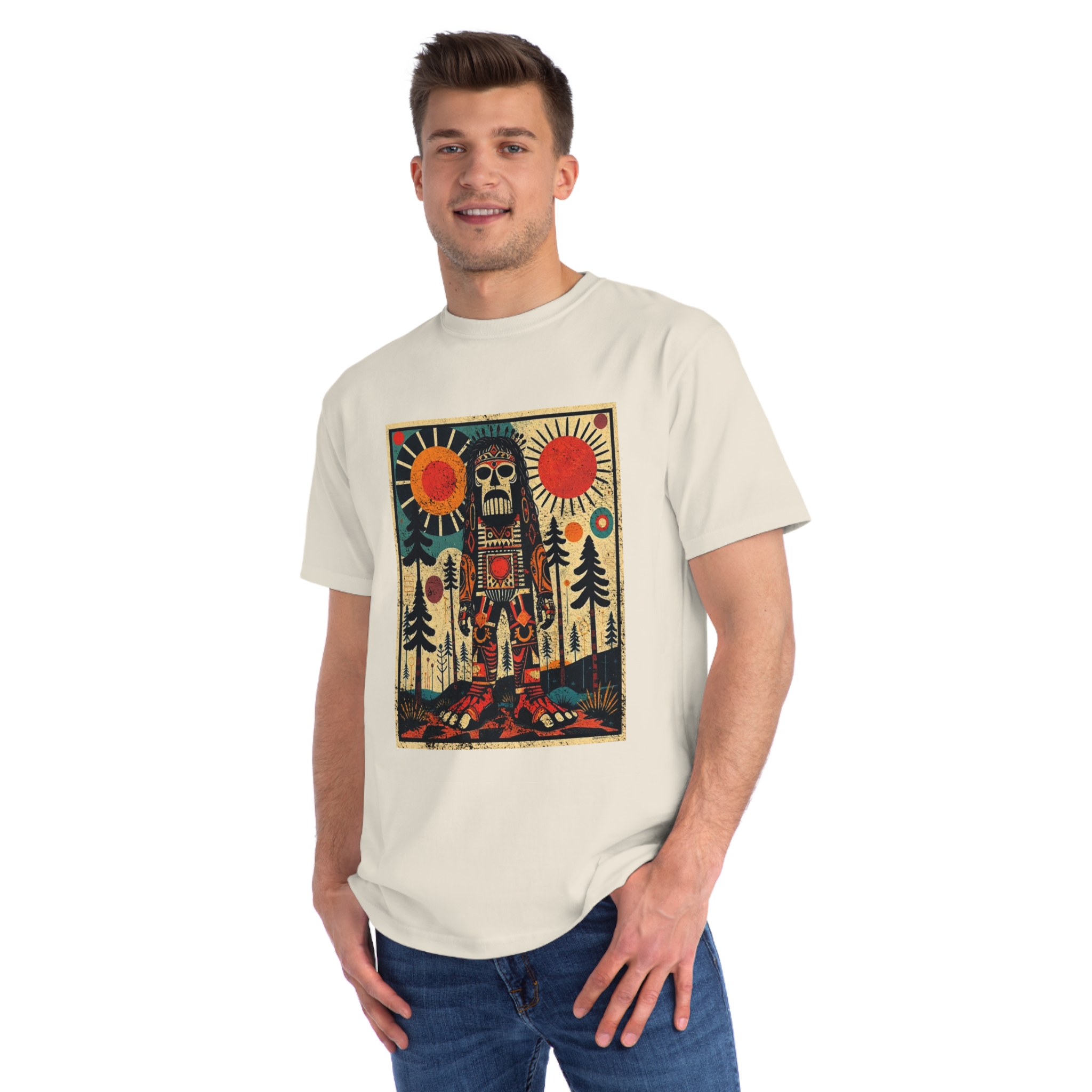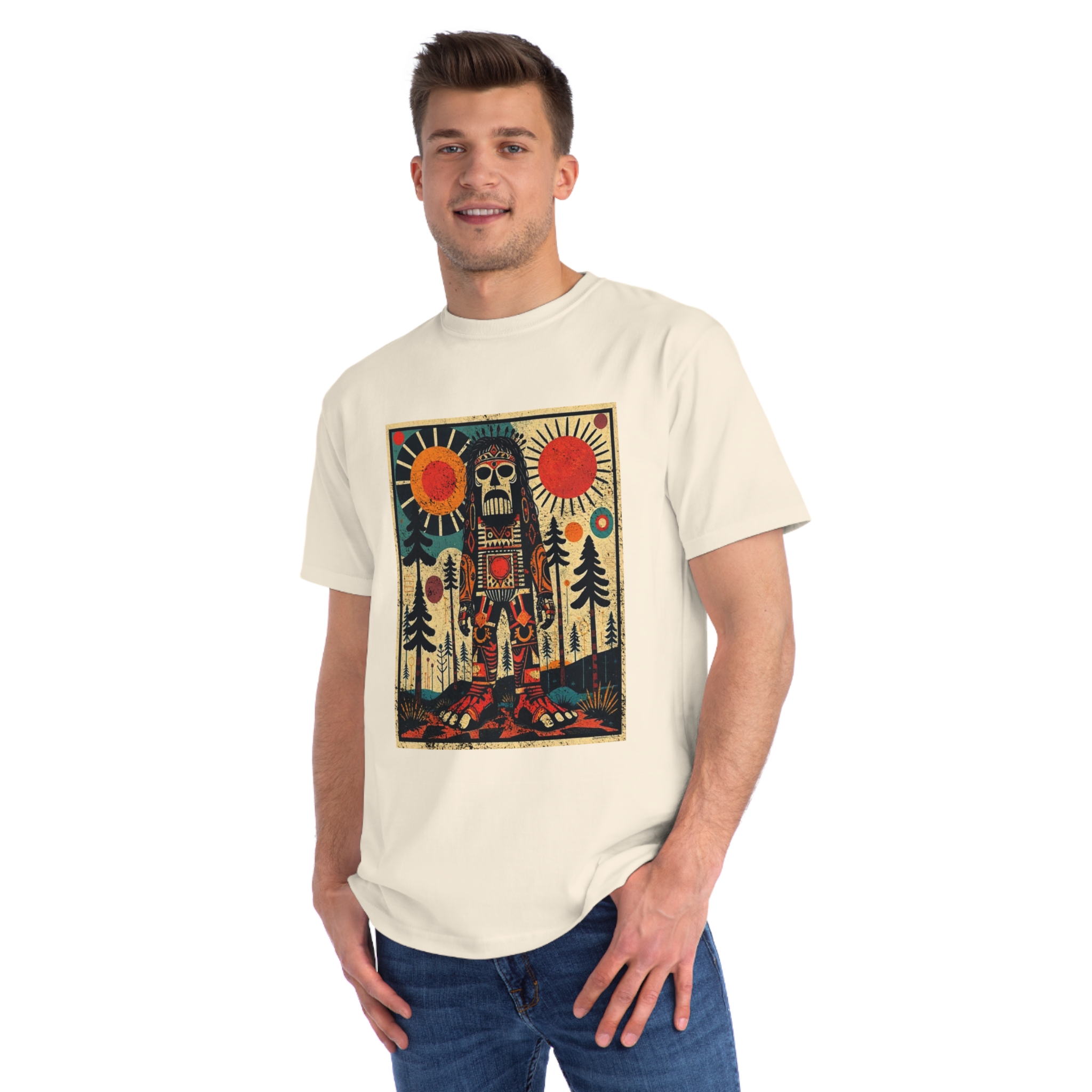 This organic cotton tee carries a bold, folk-art illustration that feels like a myth told around a campfire. Warm earth tones and sun motifs frame a towering, totem-like figure standing among pines — the design reads like a relic from a forest pilgrimage. The shirt is breathable and slightly insulating, so it layers well on cool mornings or stands alone on dry, sunlit afternoons. It’s for people who prefer stories on their sleeves: hikers who collect trail-town legends, artists who like handcrafted prints, and anyone who wants a quiet connection to wild places. Wear it to a weekend trailhead, a low-key outdoor show, or when you want your outfit to hint at mystery and craft rather than shout for attention.