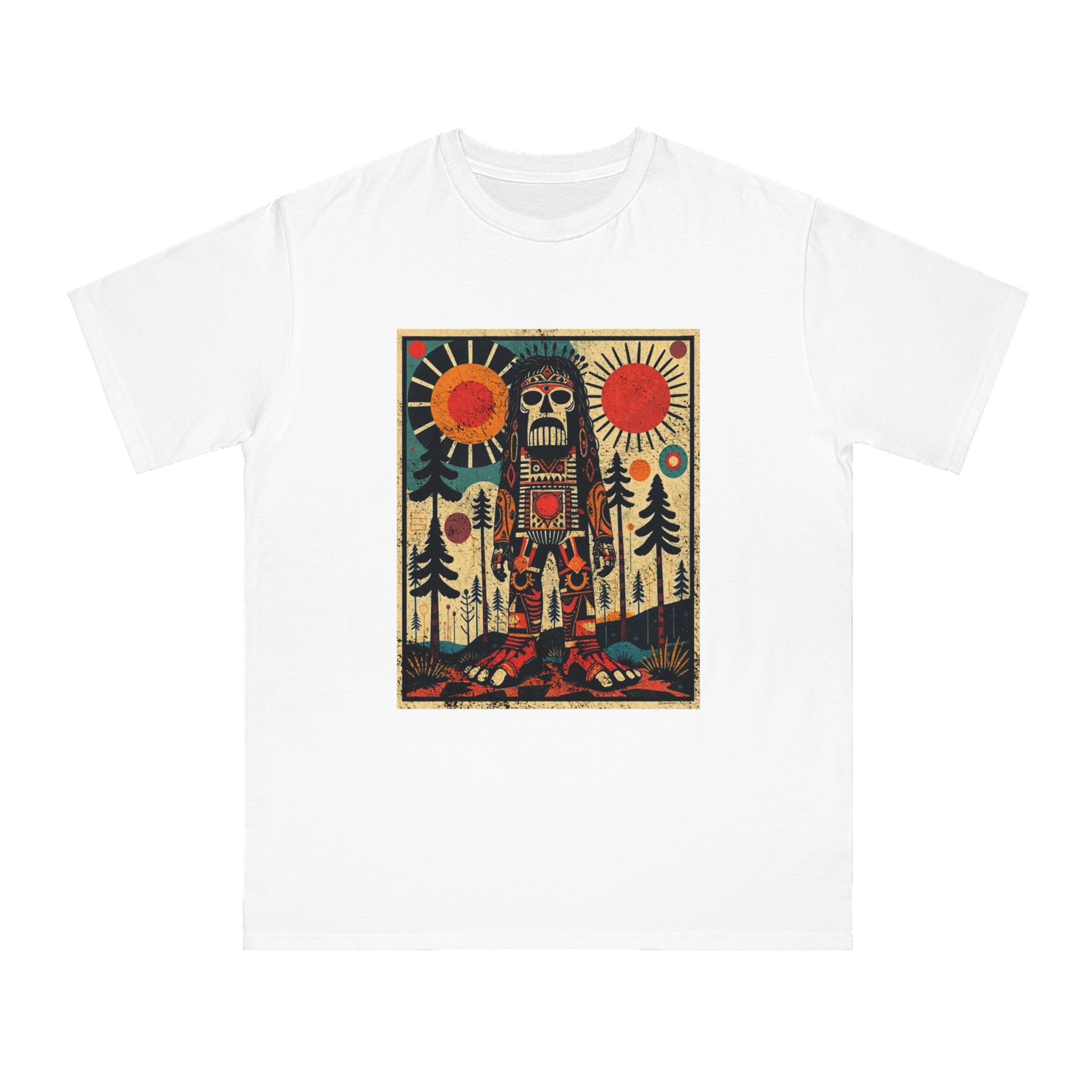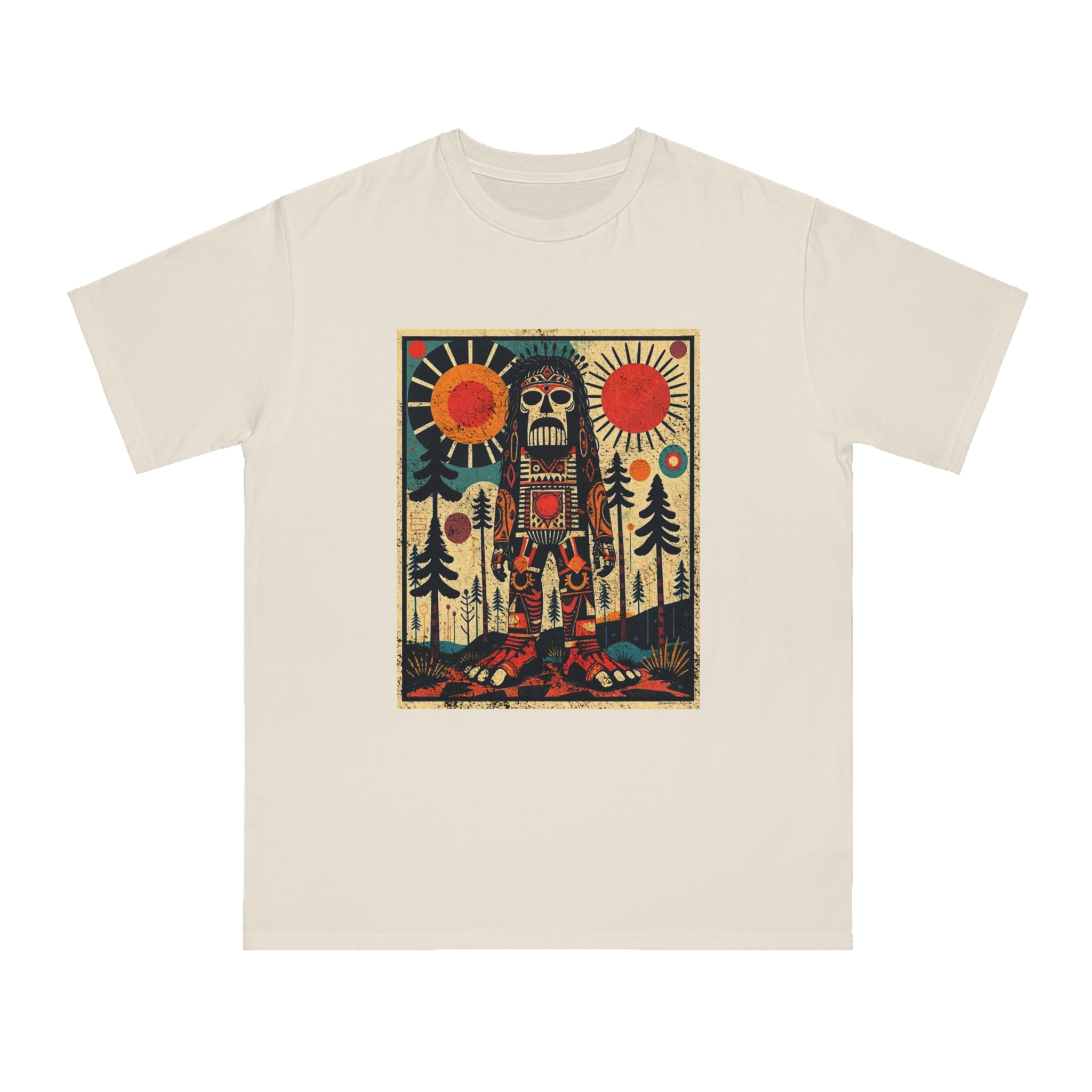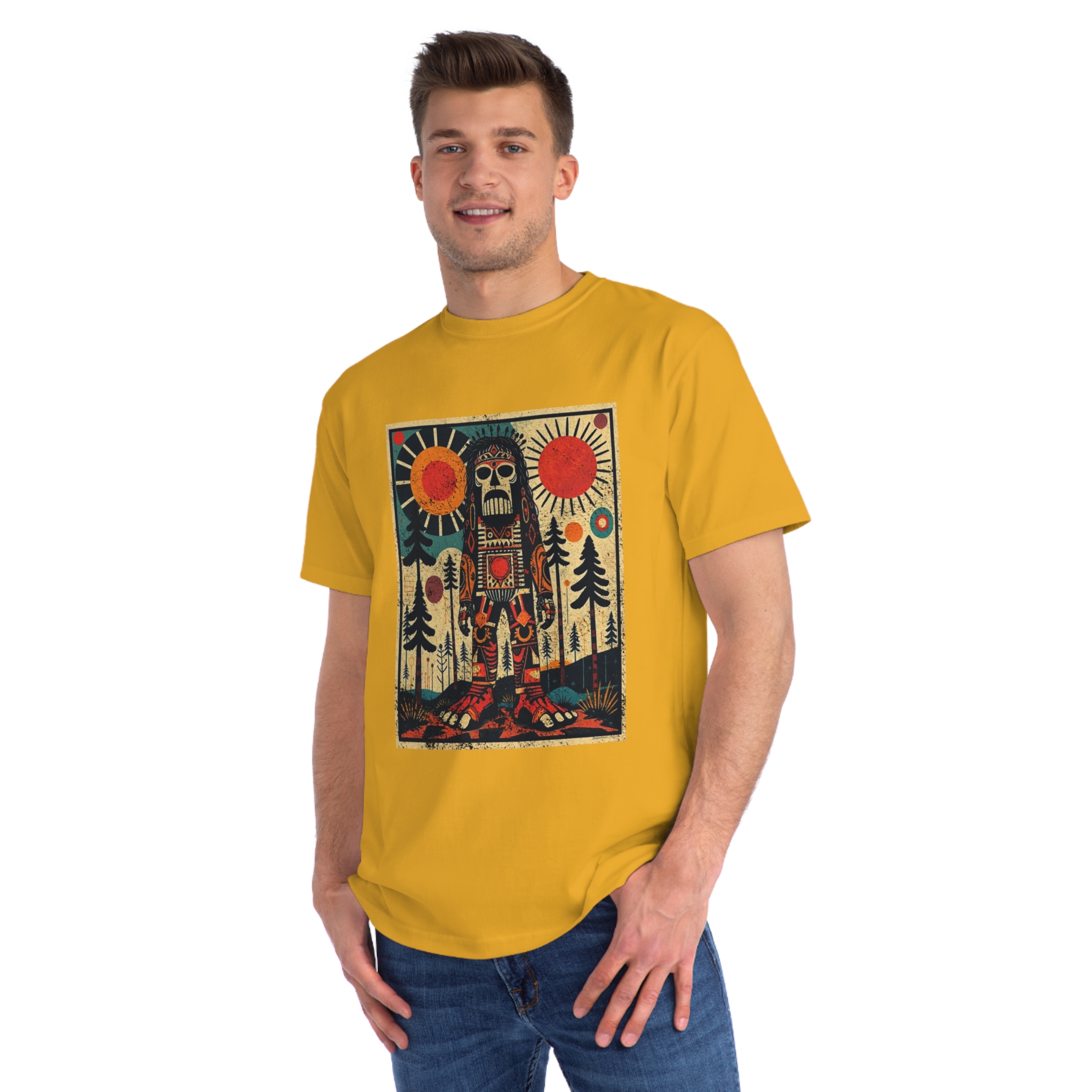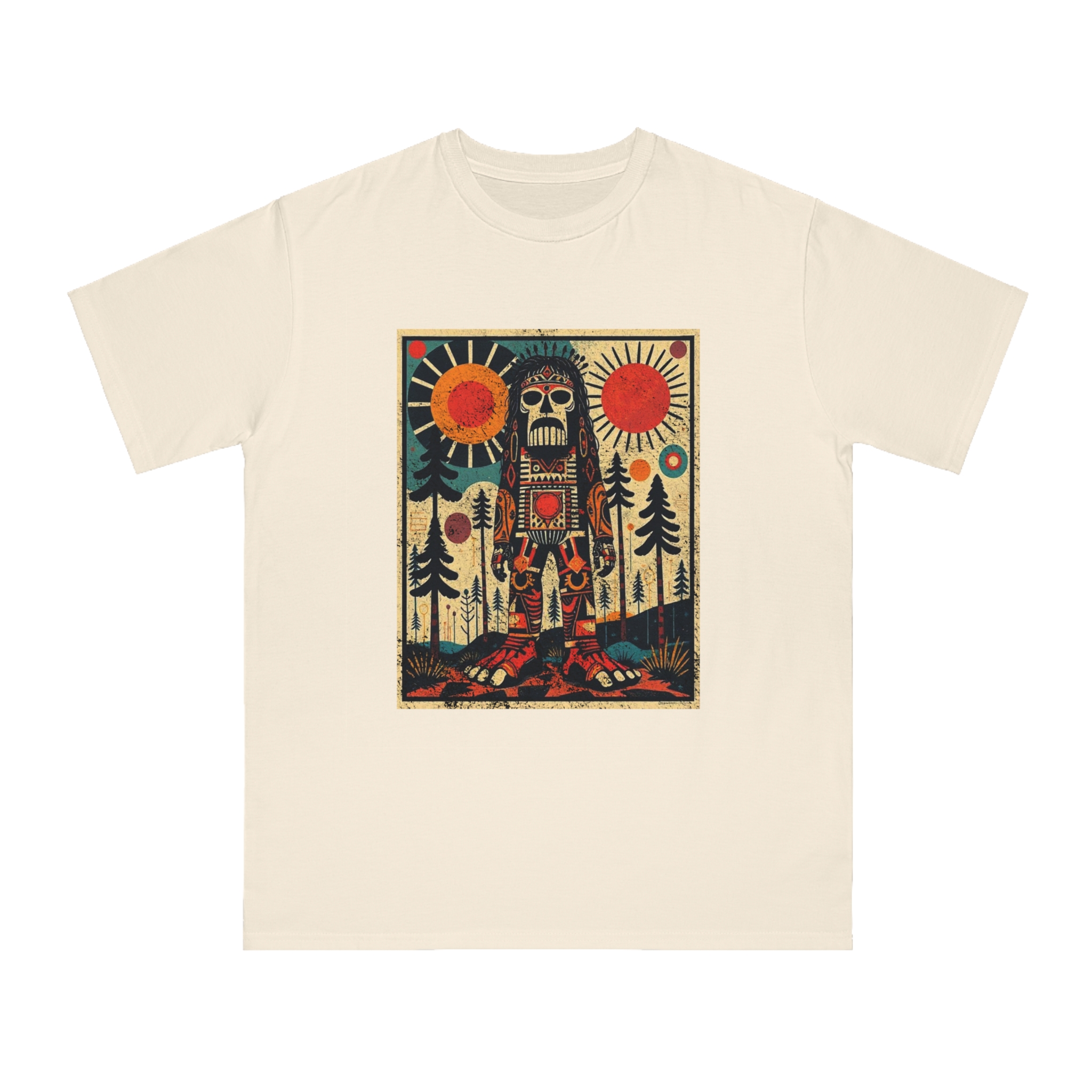 This organic cotton tee carries a bold, folk-art illustration that feels like a myth told around a campfire. Warm earth tones and sun motifs frame a towering, totem-like figure standing among pines — the design reads like a relic from a forest pilgrimage. The shirt is breathable and slightly insulating, so it layers well on cool mornings or stands alone on dry, sunlit afternoons. It’s for people who prefer stories on their sleeves: hikers who collect trail-town legends, artists who like handcrafted prints, and anyone who wants a quiet connection to wild places. Wear it to a weekend trailhead, a low-key outdoor show, or when you want your outfit to hint at mystery and craft rather than shout for attention.