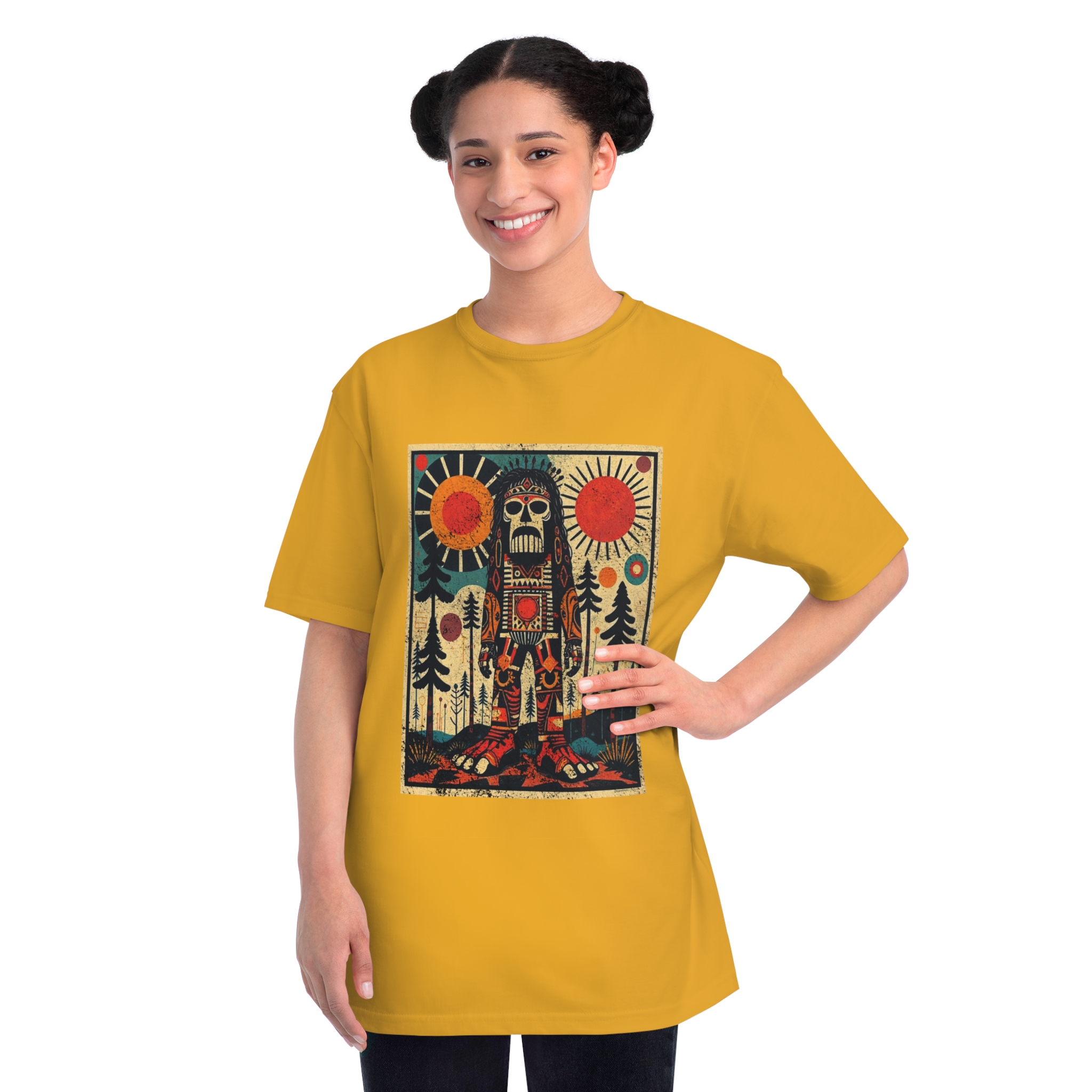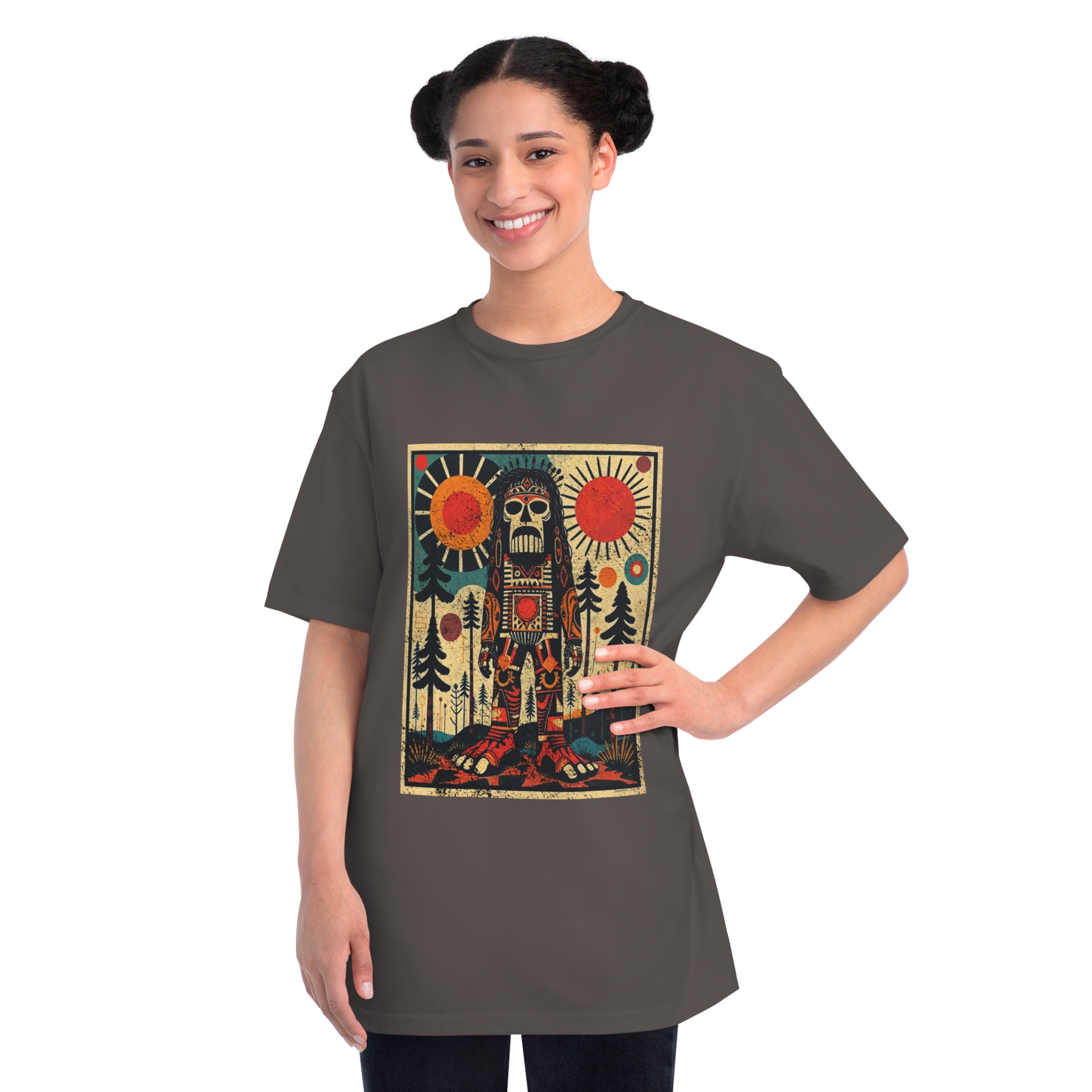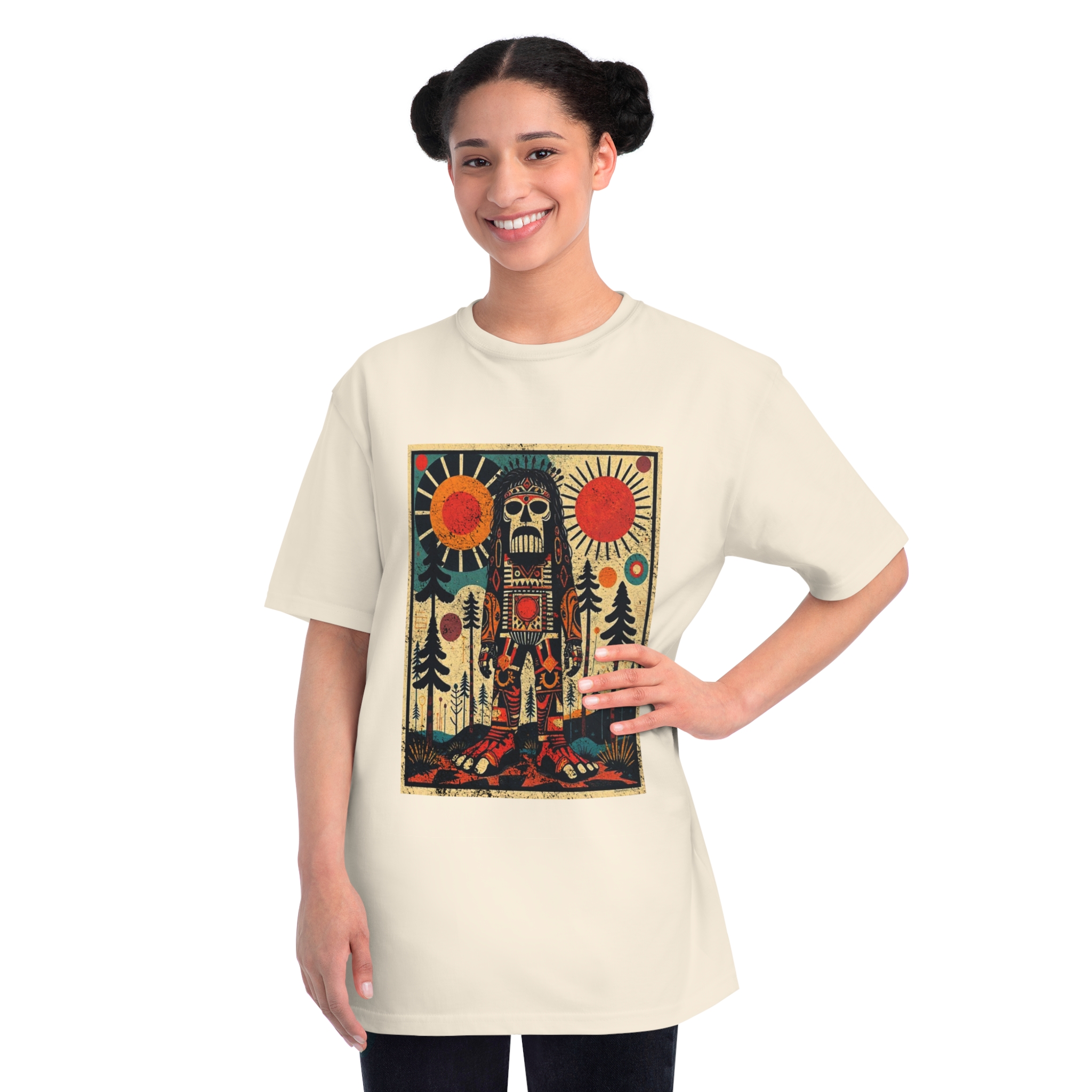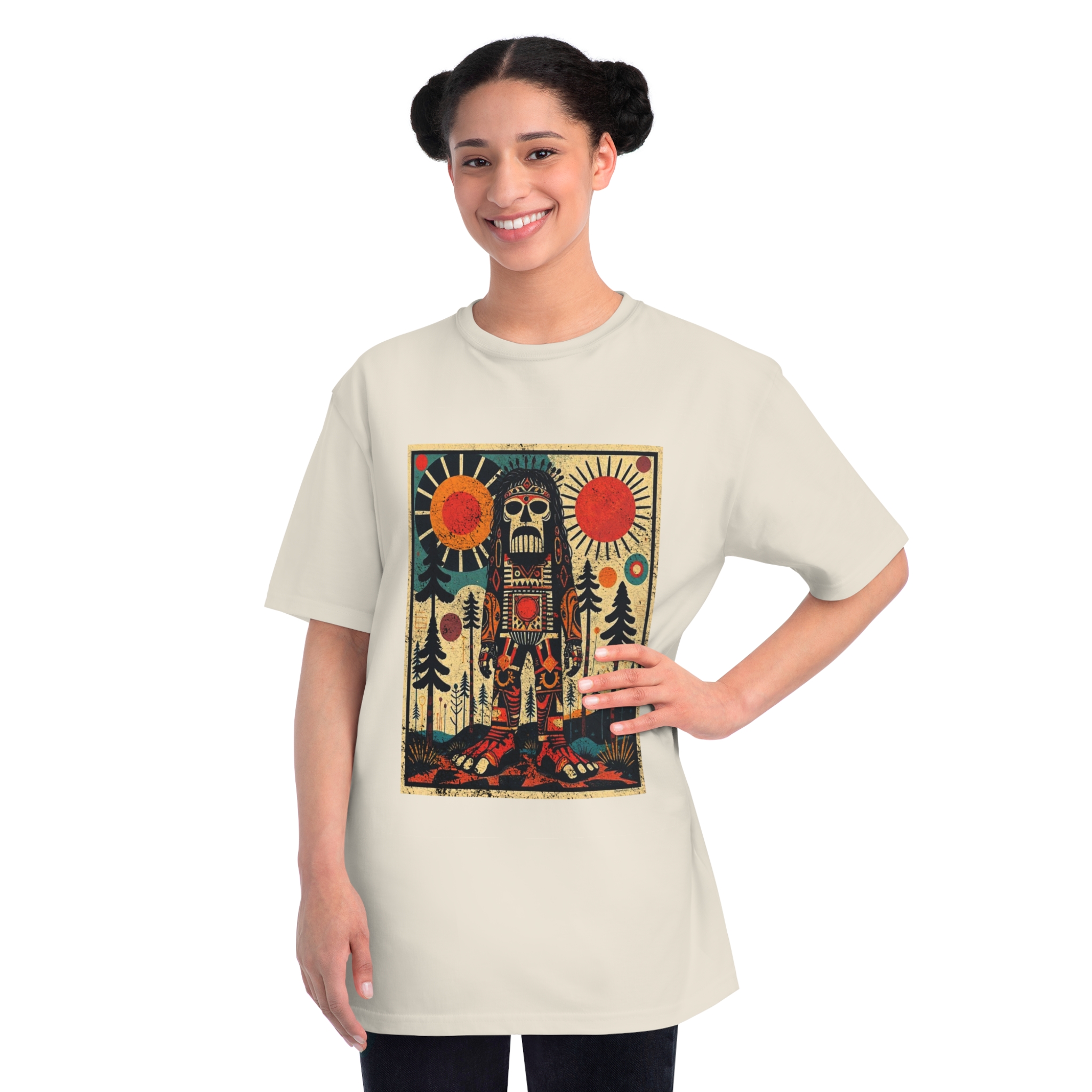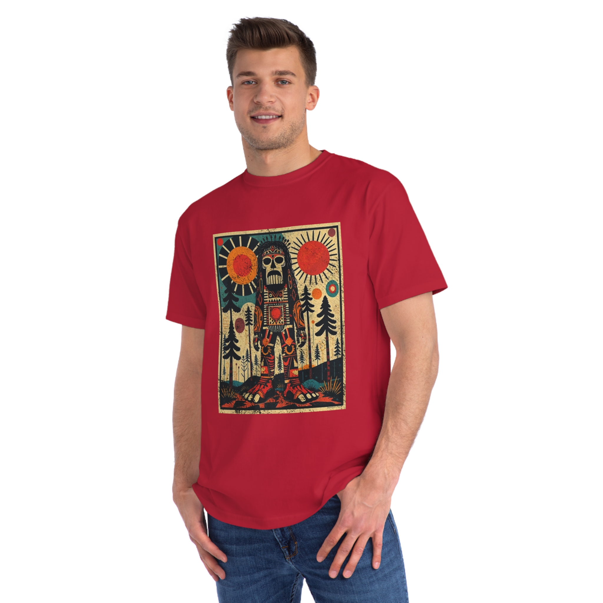 This organic cotton tee carries a bold, folk-art illustration that feels like a myth told around a campfire. Warm earth tones and sun motifs frame a towering, totem-like figure standing among pines — the design reads like a relic from a forest pilgrimage. The shirt is breathable and slightly insulating, so it layers well on cool mornings or stands alone on dry, sunlit afternoons. It’s for people who prefer stories on their sleeves: hikers who collect trail-town legends, artists who like handcrafted prints, and anyone who wants a quiet connection to wild places. Wear it to a weekend trailhead, a low-key outdoor show, or when you want your outfit to hint at mystery and craft rather than shout for attention.