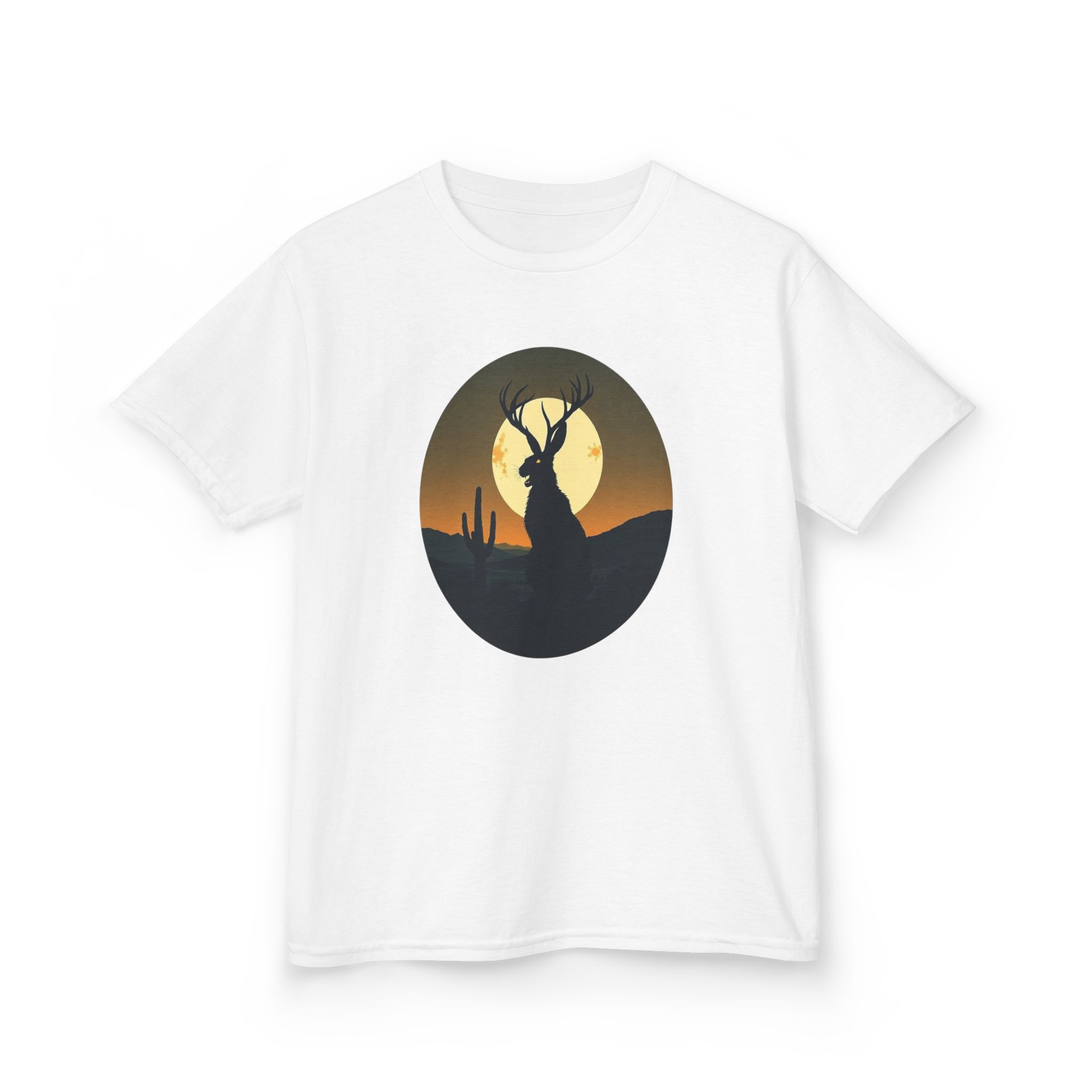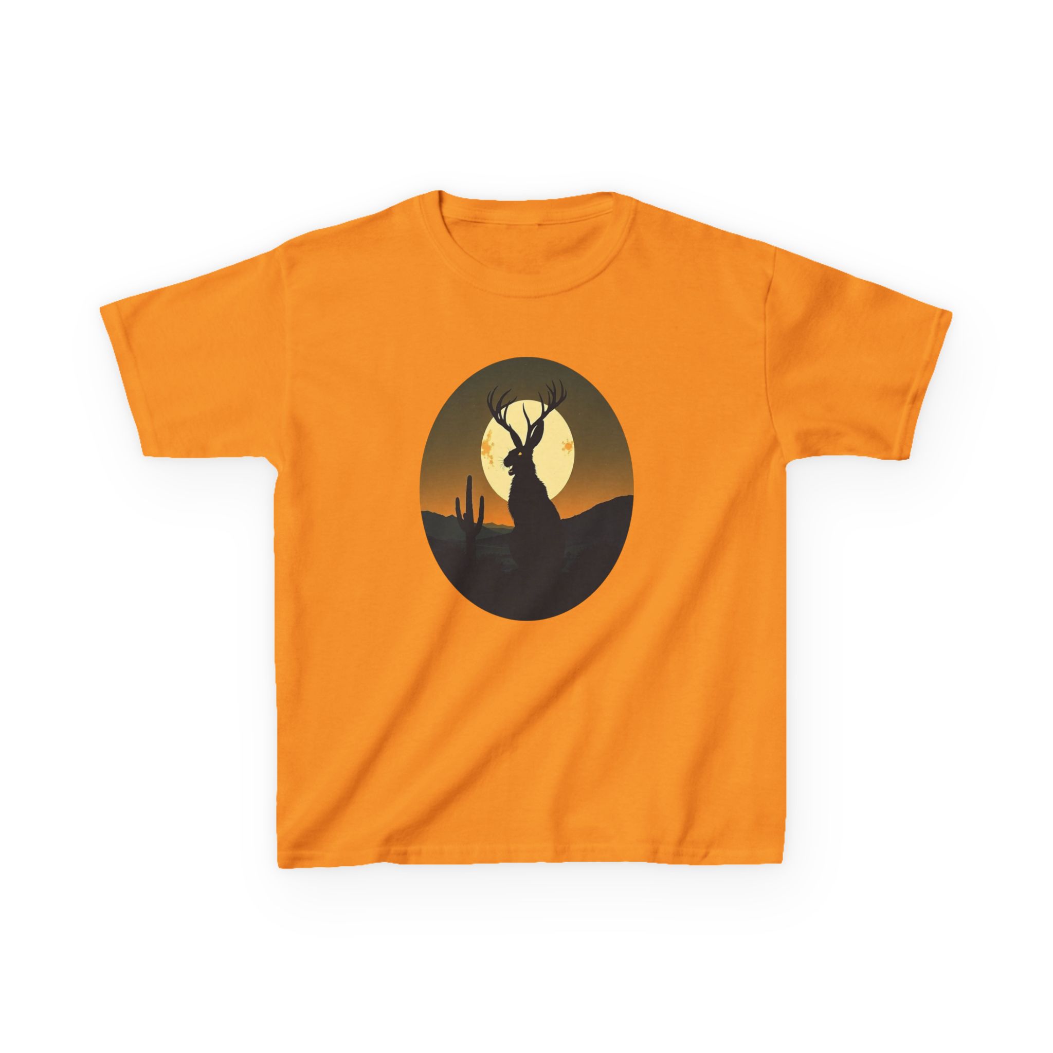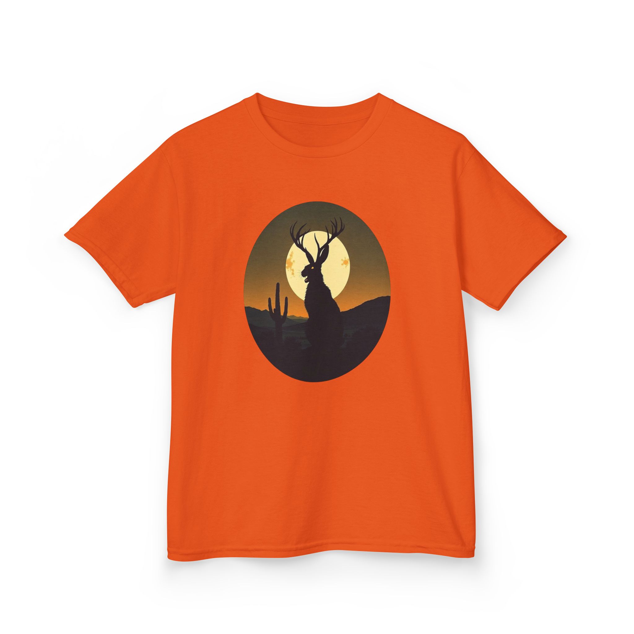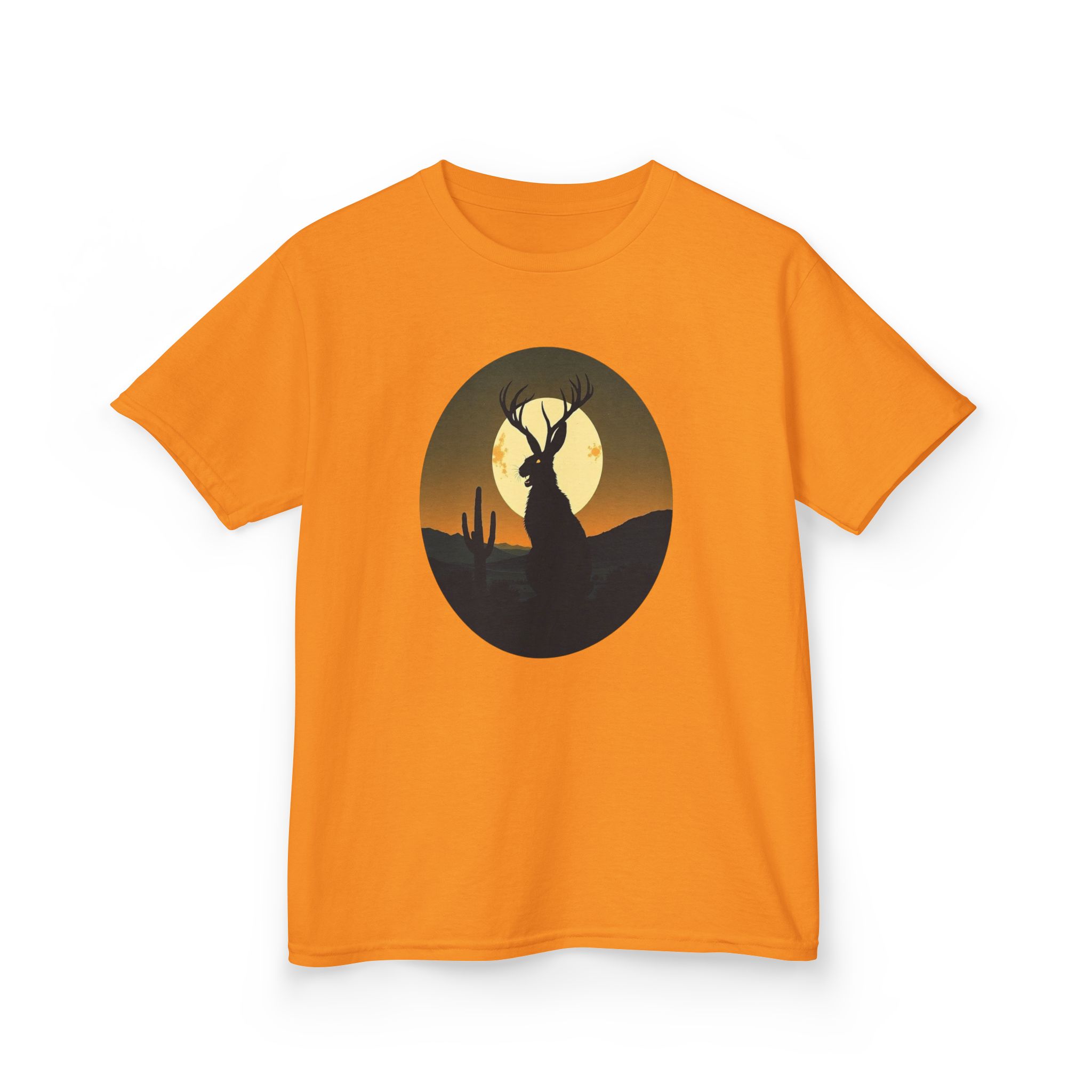 Rendered in a vibrant sunset palette that transitions from deep orange and golden yellow to dark forest green, this Jackalope desert shirt offers a moody, high-contrast look that pops against the fabric. Printed on our premium heavyweight US cotton, it provides a structured streetwear silhouette that is built for both comfort and durability. Whether you're exploring the high desert or the urban jungle, this cryptid graphic tee is the ultimate evidence of your belief in the unexplained.