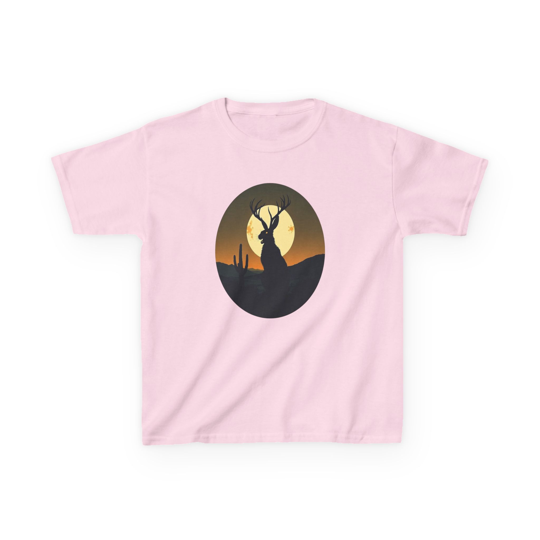 - The Artwork: Modern, circular framed illustration of a Jackalope silhouette against a glowing full moon and desert landscape.