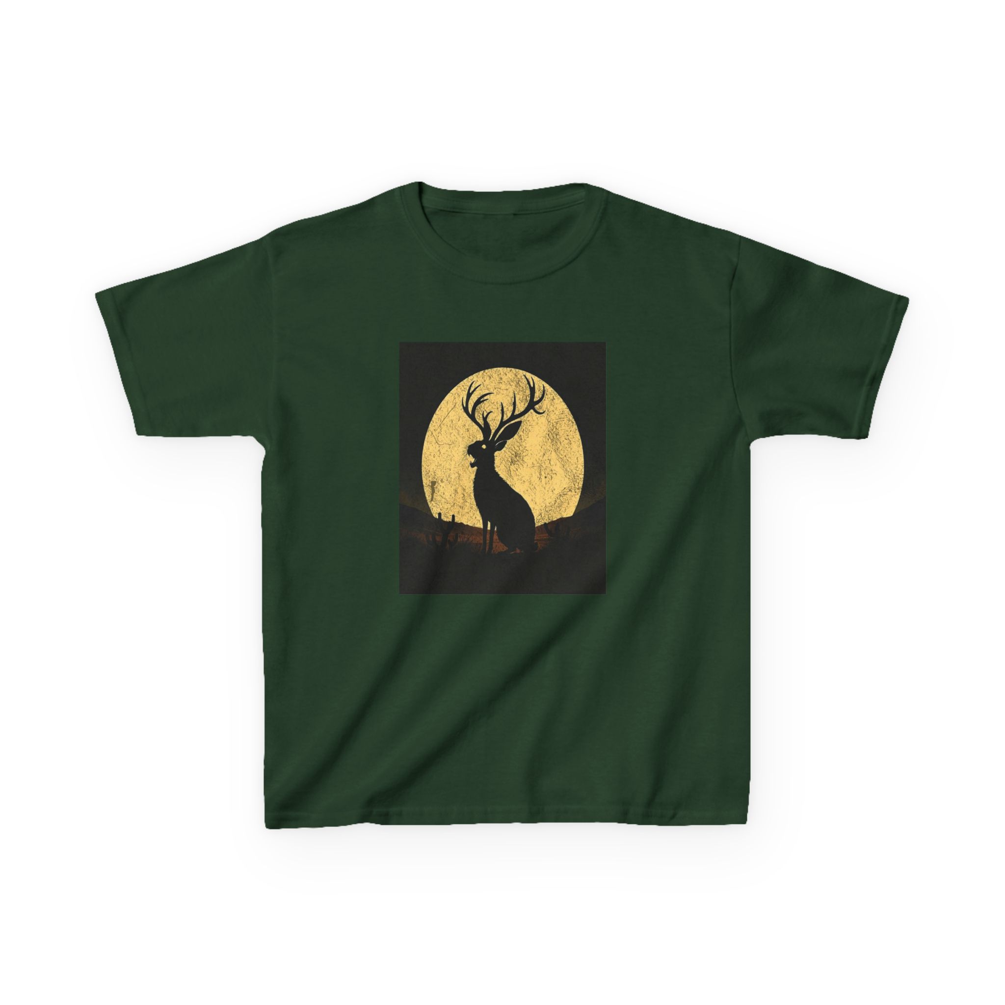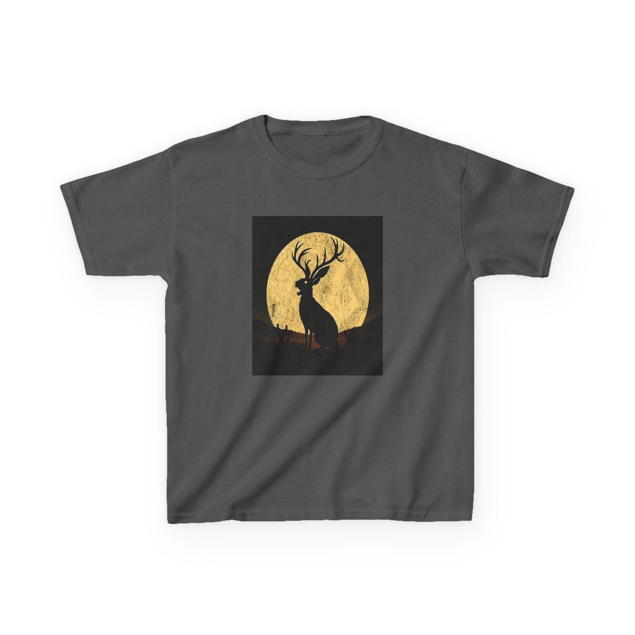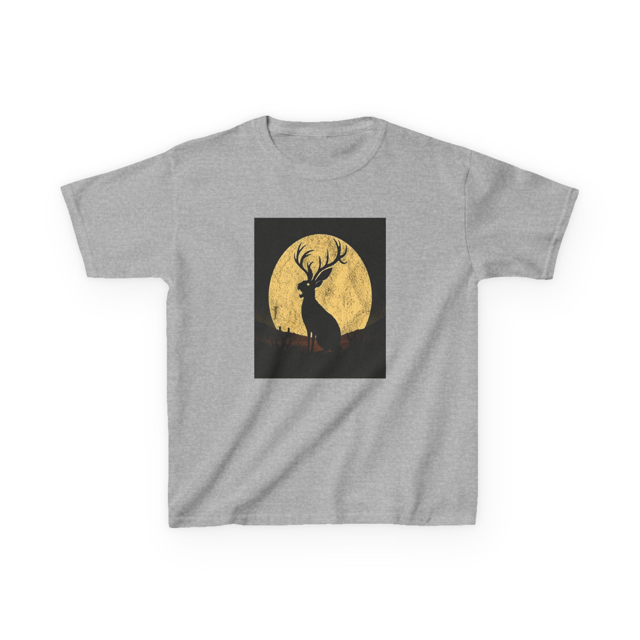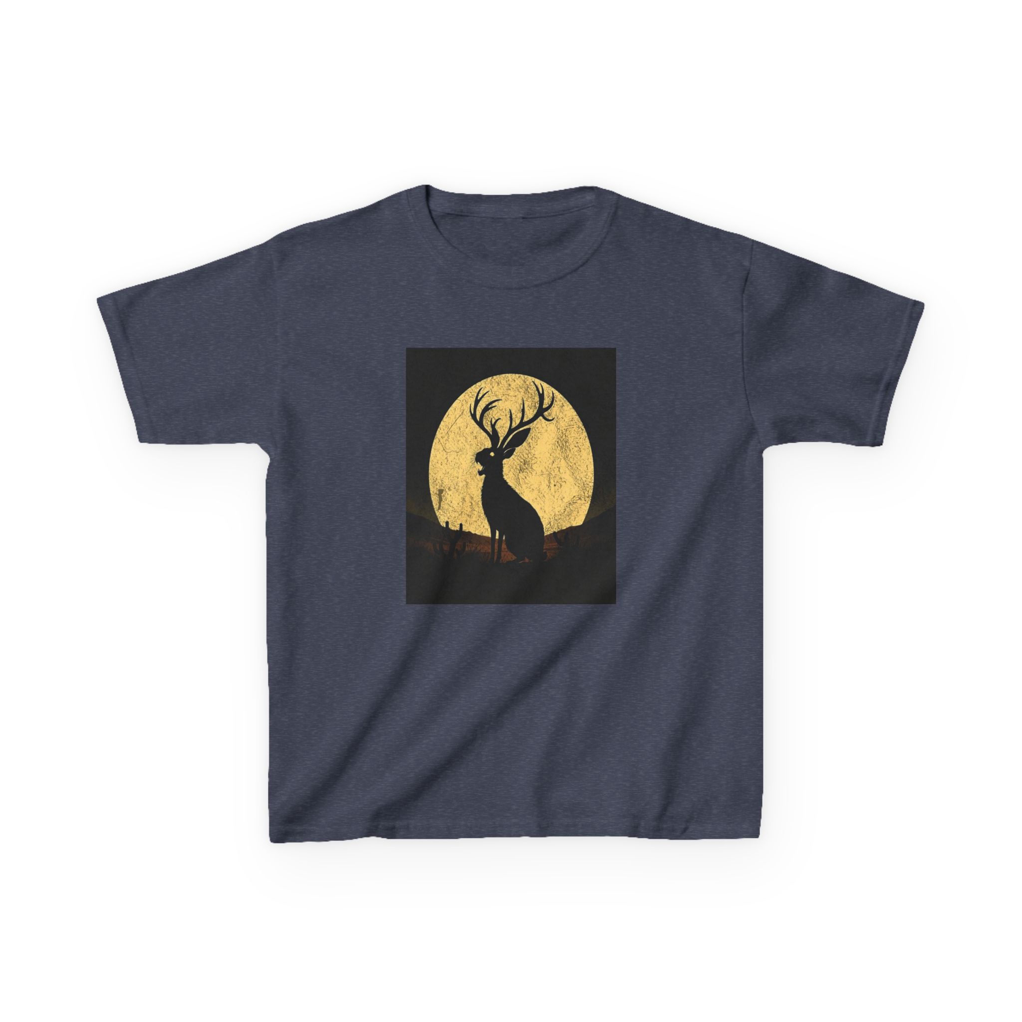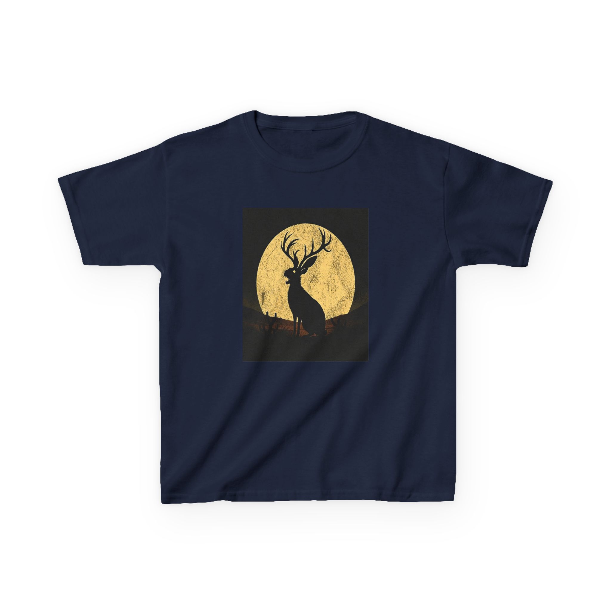 - The Artwork: High-contrast Jackalope silhouette howling against a textured golden full moon in a minimalist nocturnal landscape.