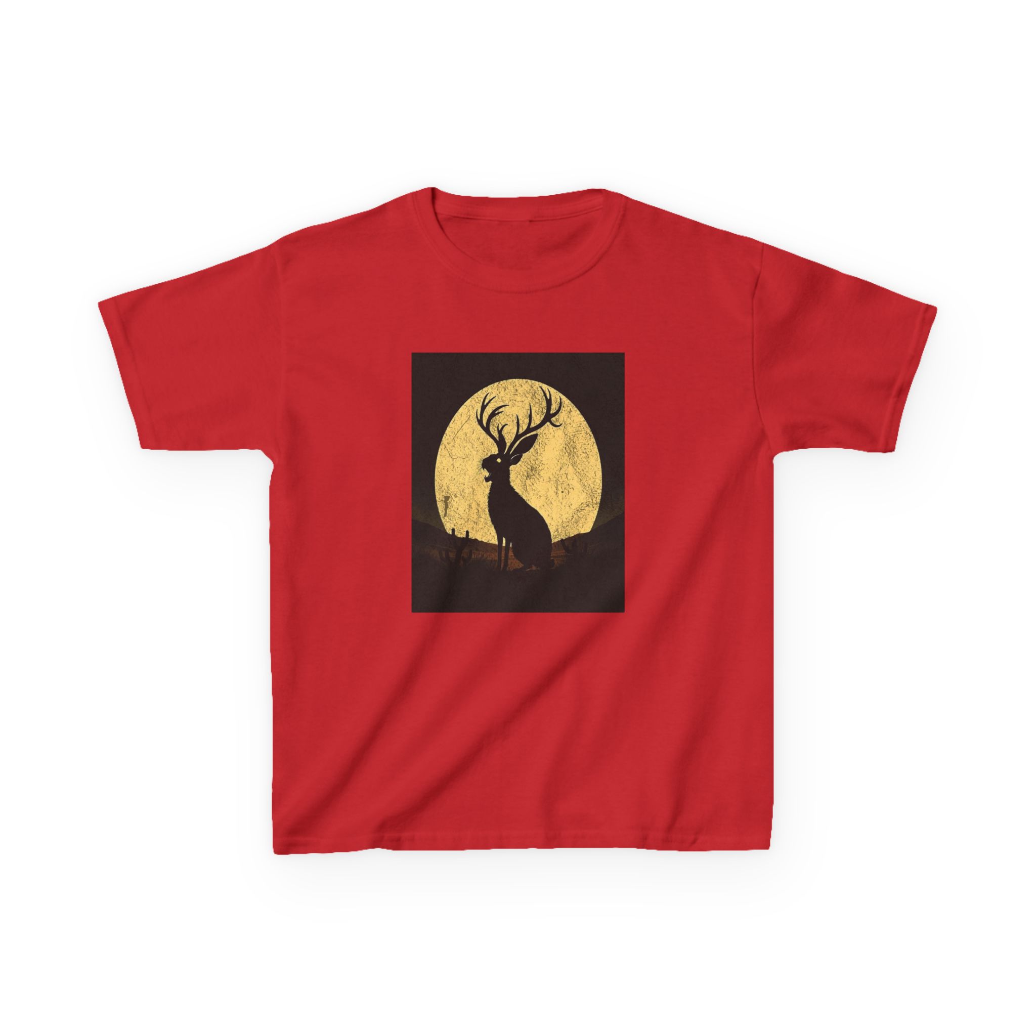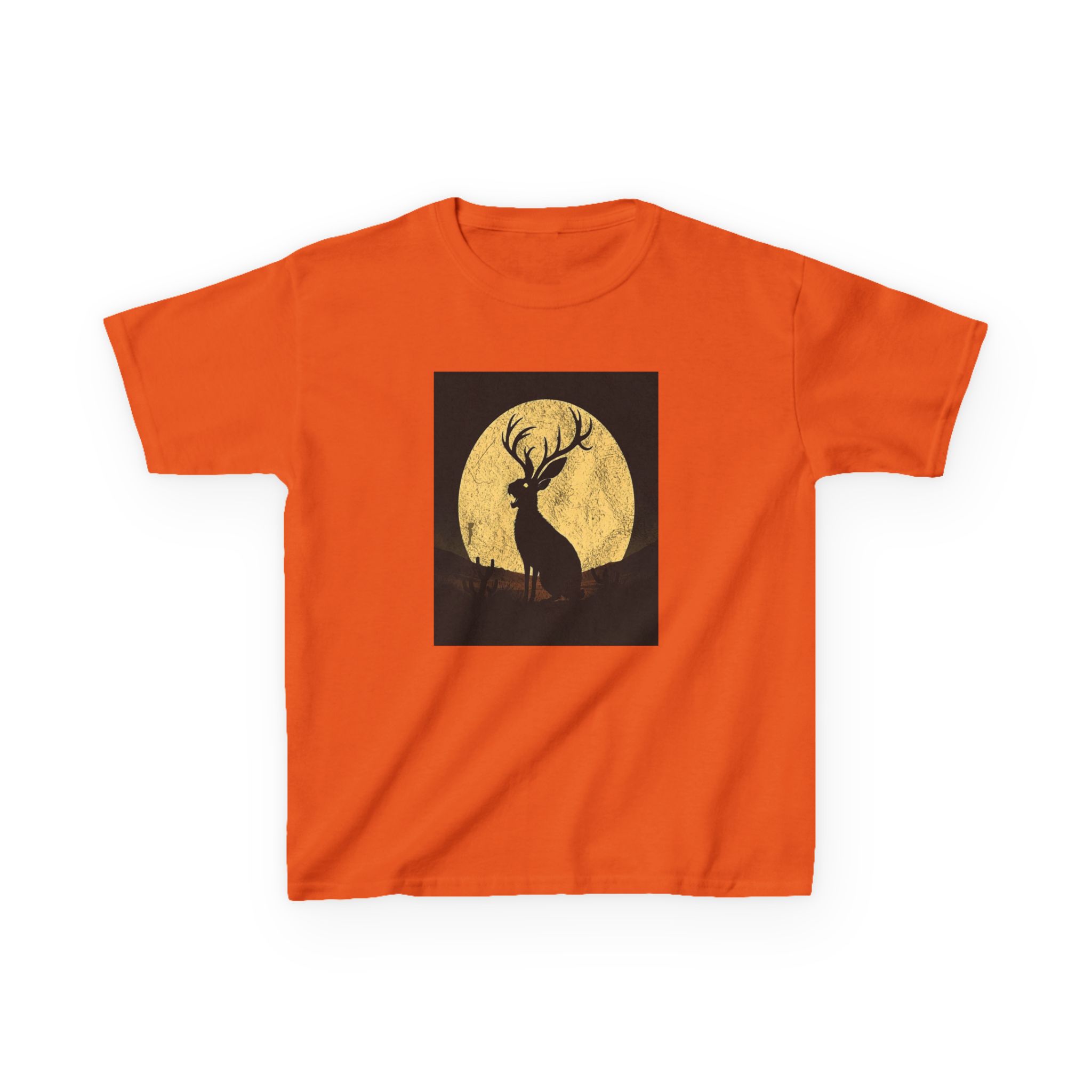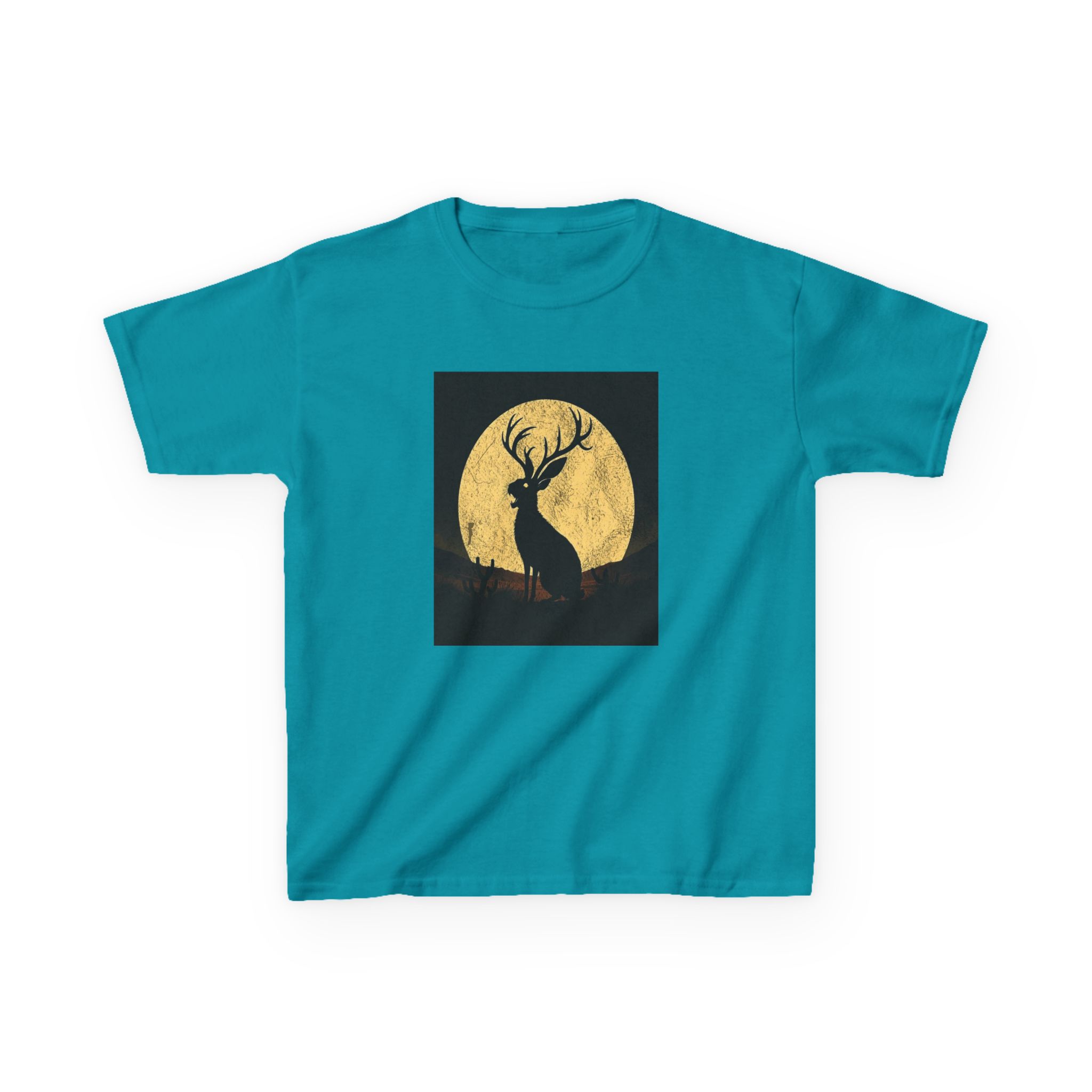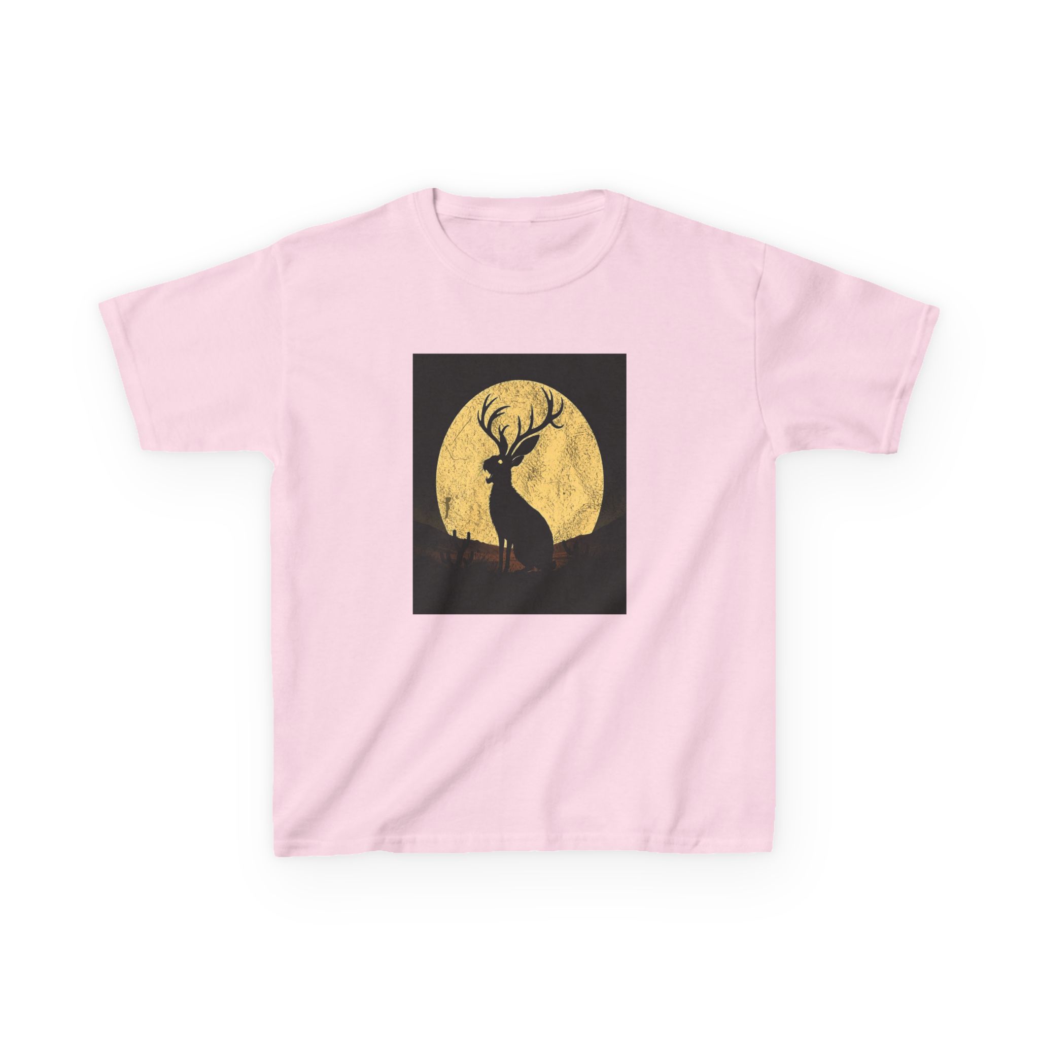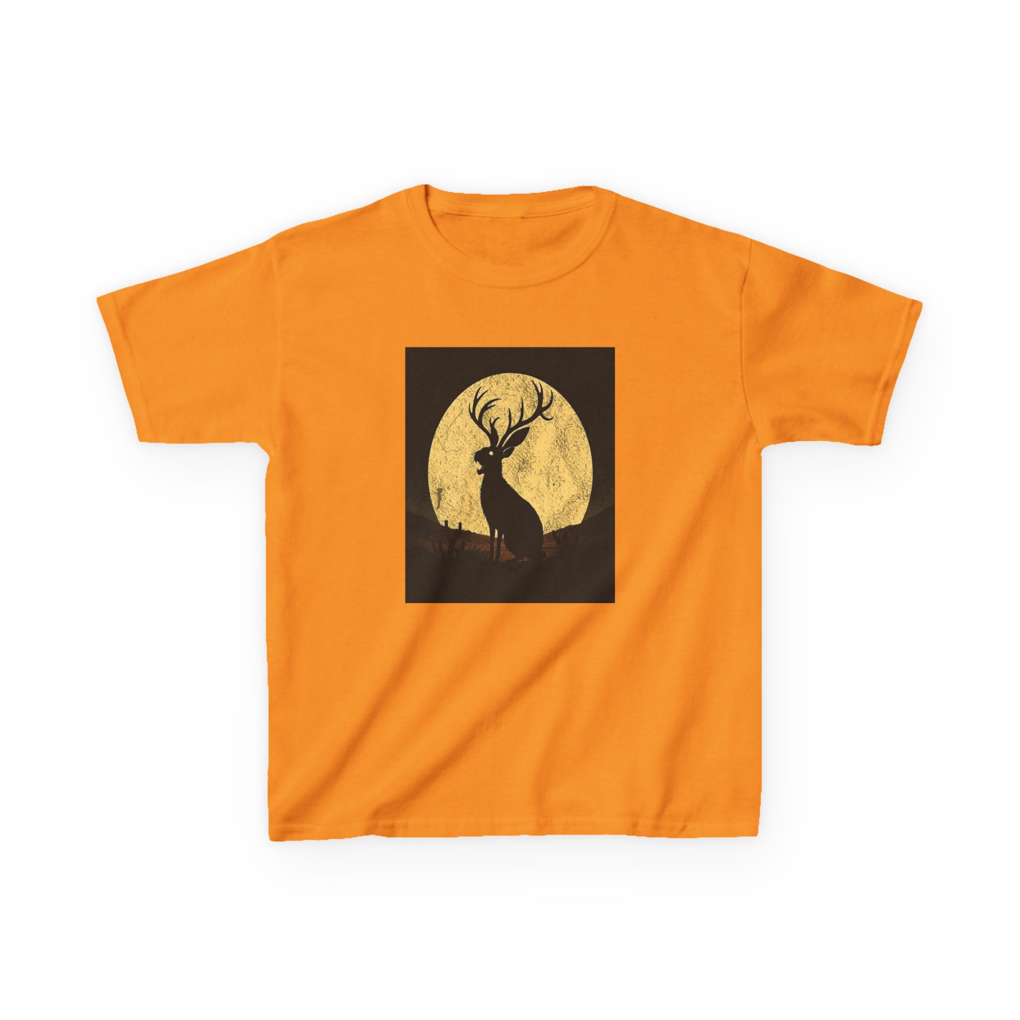 - The Artwork: High-contrast Jackalope silhouette howling against a textured golden full moon in a minimalist nocturnal landscape.
