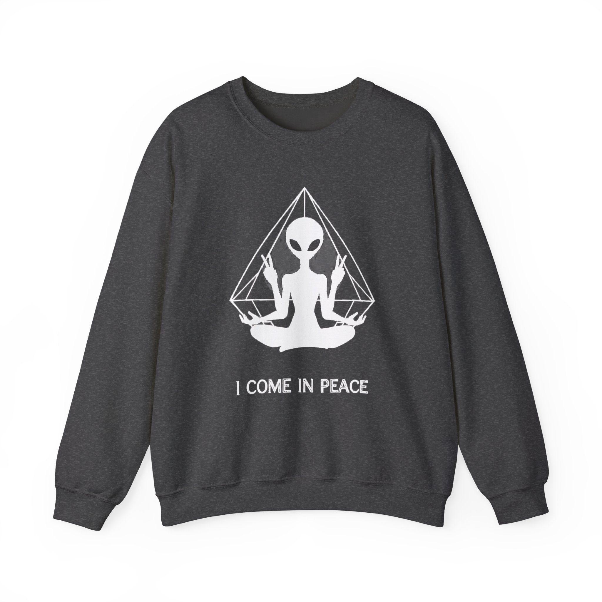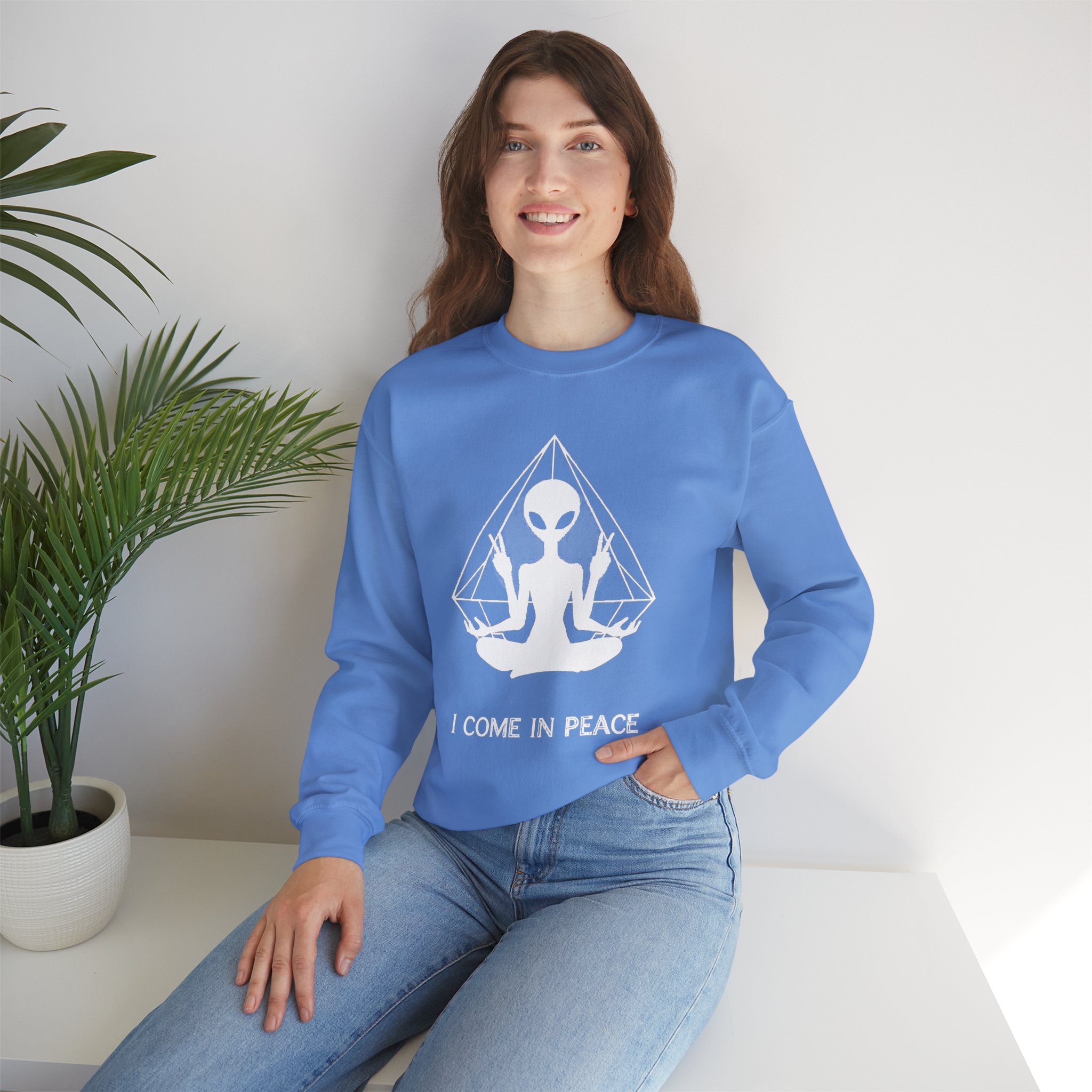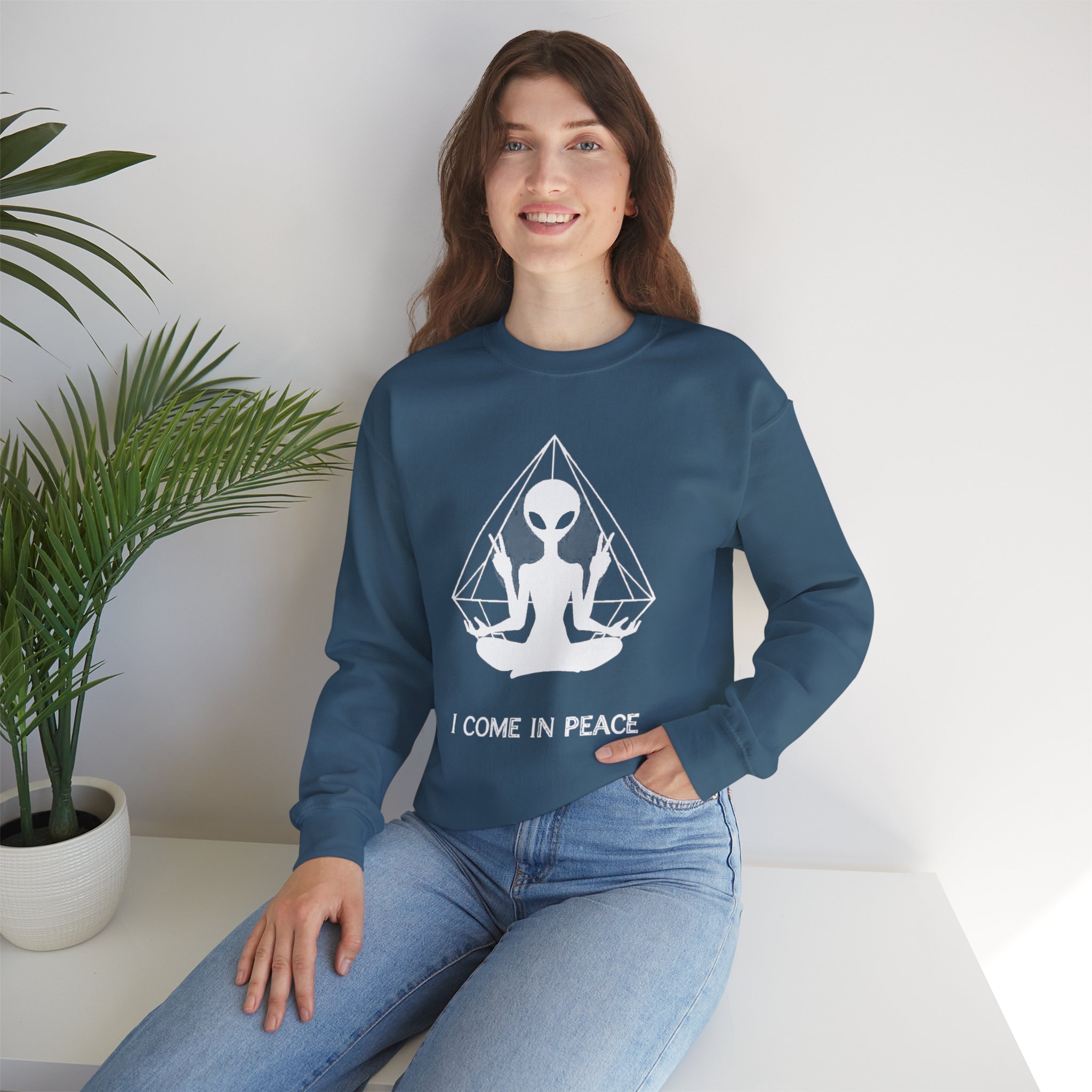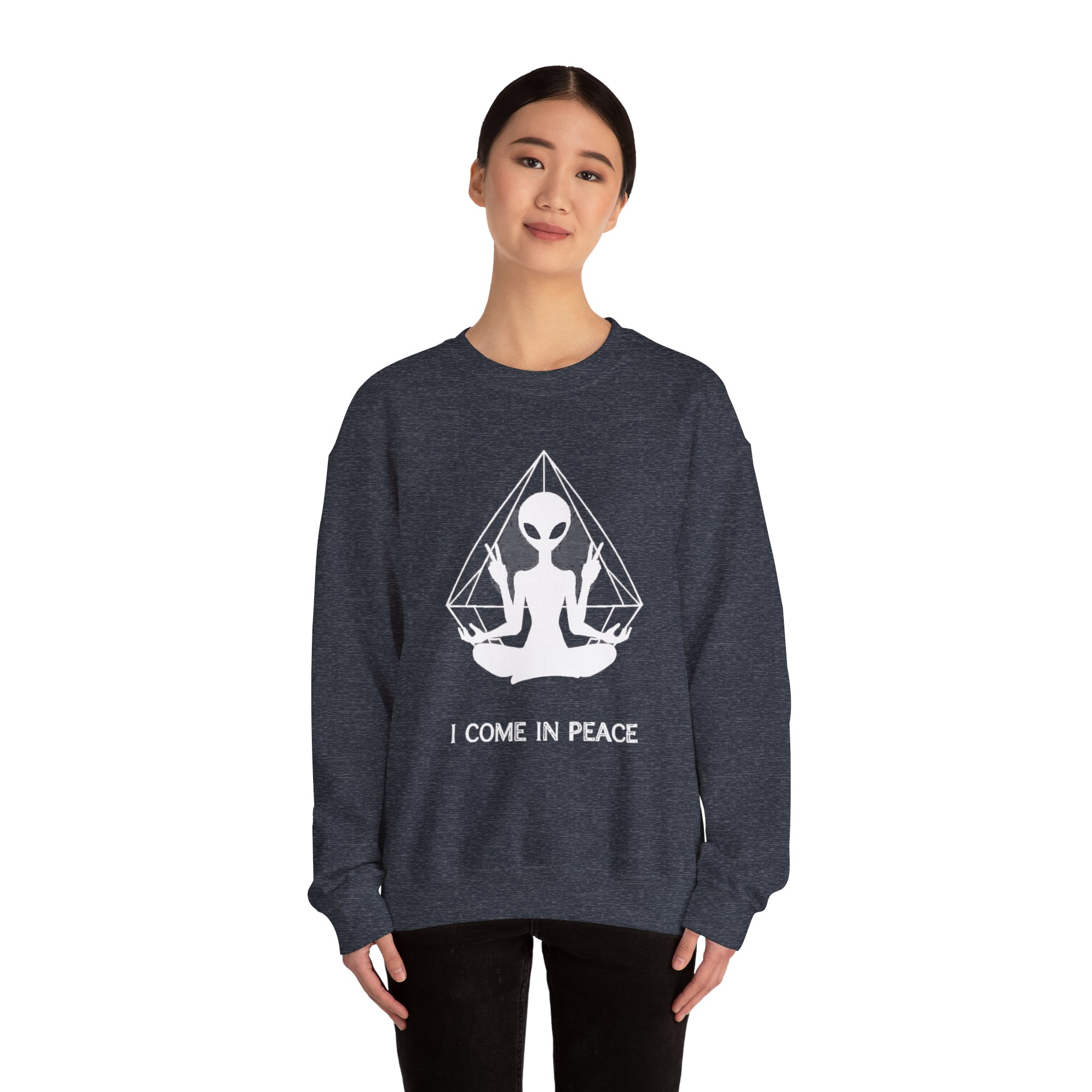This stylized graphic depicts a purple silhouetted alien figure sitting in a meditative lotus position within a light pink geometric pyramid frame. The alien has distinctive large, almond-shaped eyes and is making peace signs with both hands while maintaining a calm, seated posture. The background is a soft yellow-beige color that provides warm contrast to the deep purple alien shape. At the bottom of the image, text reads “I COME IN PEACE” in capital letters, reinforcing the peaceful and non-threatening message of the illustration. The design combines minimalist graphic elements with a playful, contemporary artistic style that blends spiritual imagery with pop culture extraterrestrial iconography.
