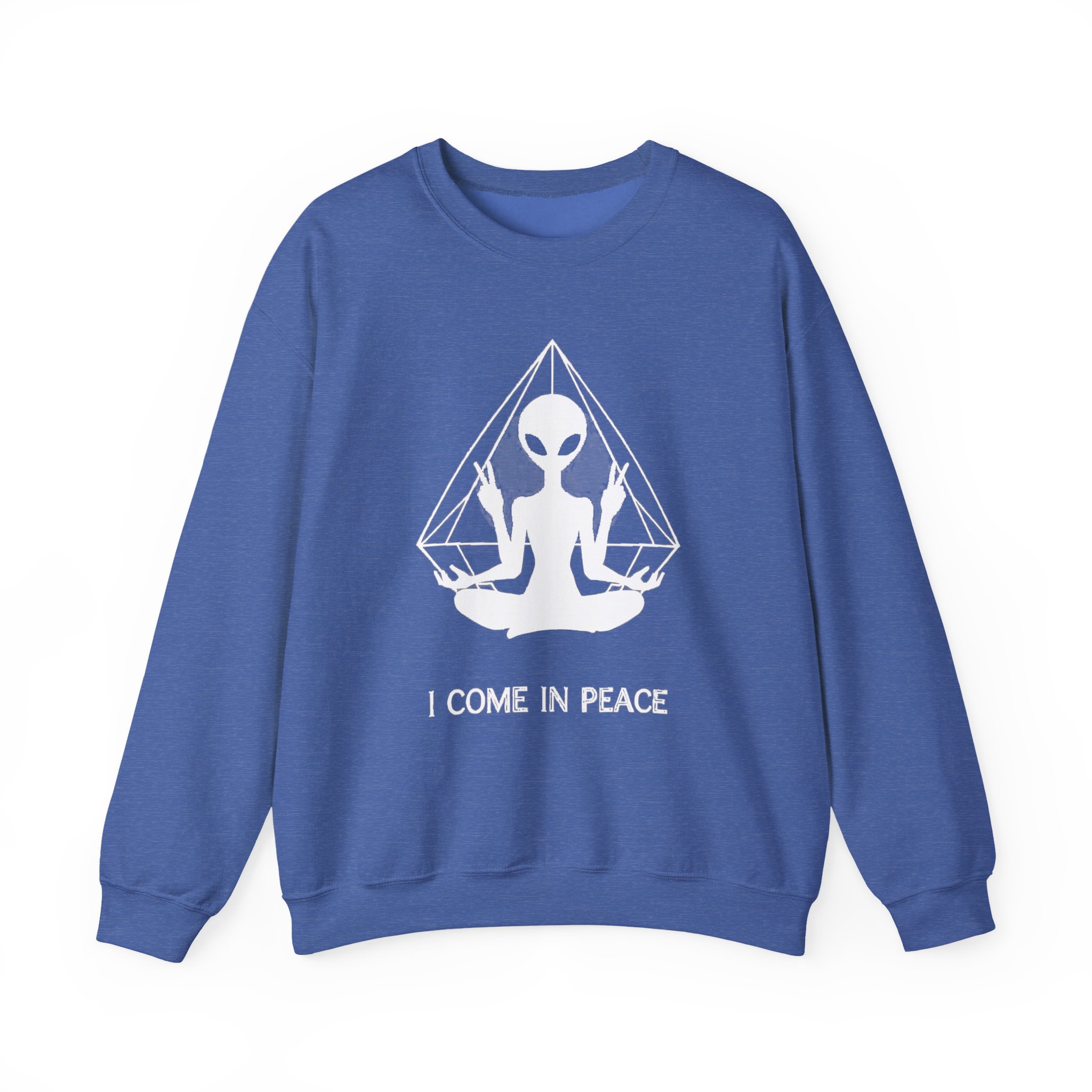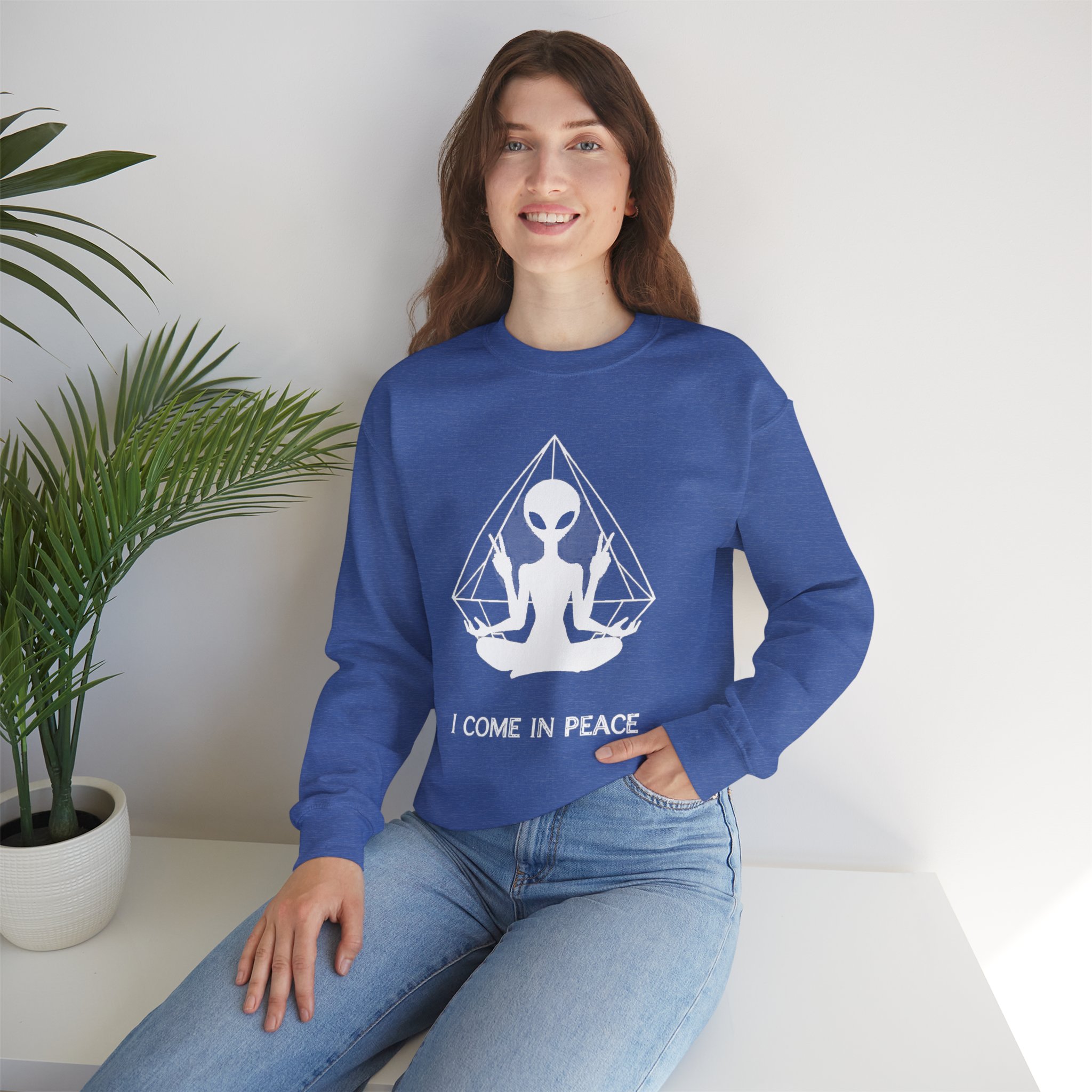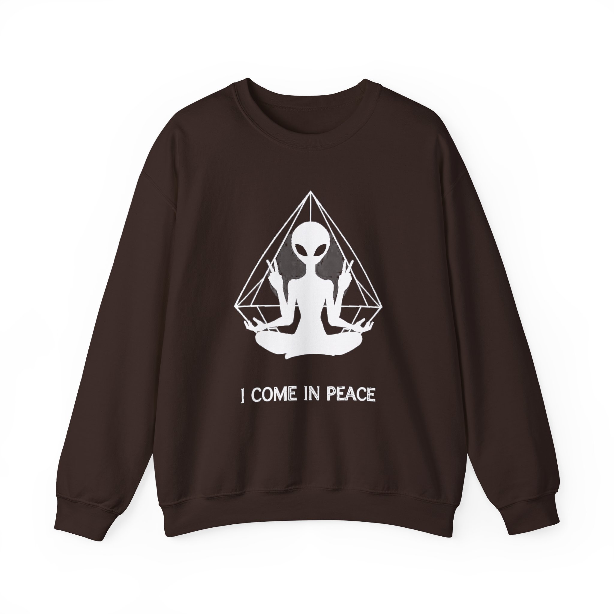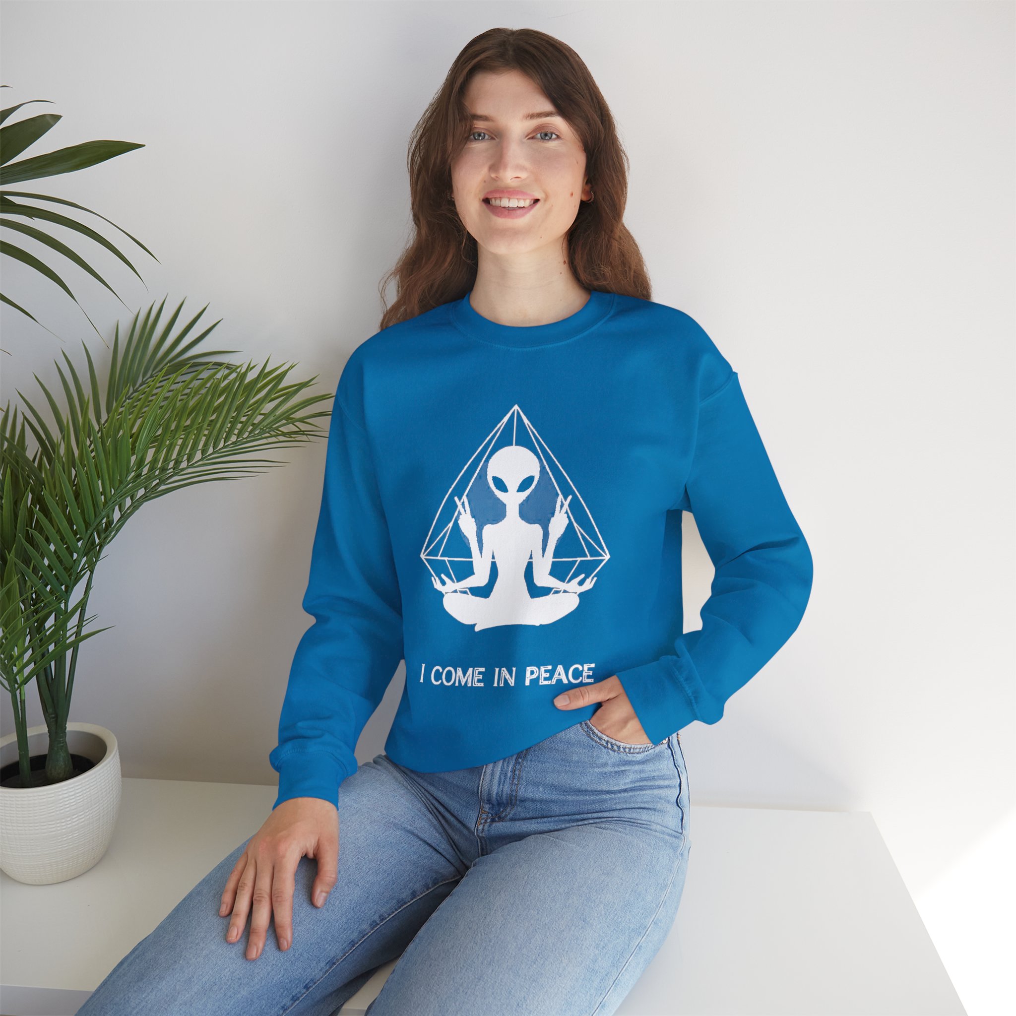 This stylized graphic depicts a purple silhouetted alien figure sitting in a meditative lotus position within a light pink geometric pyramid frame. The alien has distinctive large, almond-shaped eyes and is making peace signs with both hands while maintaining a calm, seated posture. The background is a soft yellow-beige color that provides warm contrast to the deep purple alien shape. At the bottom of the image, text reads “I COME IN PEACE” in capital letters, reinforcing the peaceful and non-threatening message of the illustration. The design combines minimalist graphic elements with a playful, contemporary artistic style that blends spiritual imagery with pop culture extraterrestrial iconography.