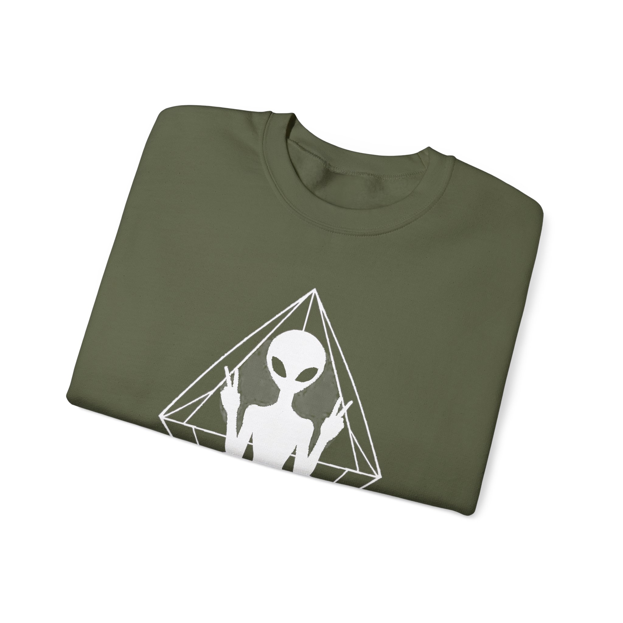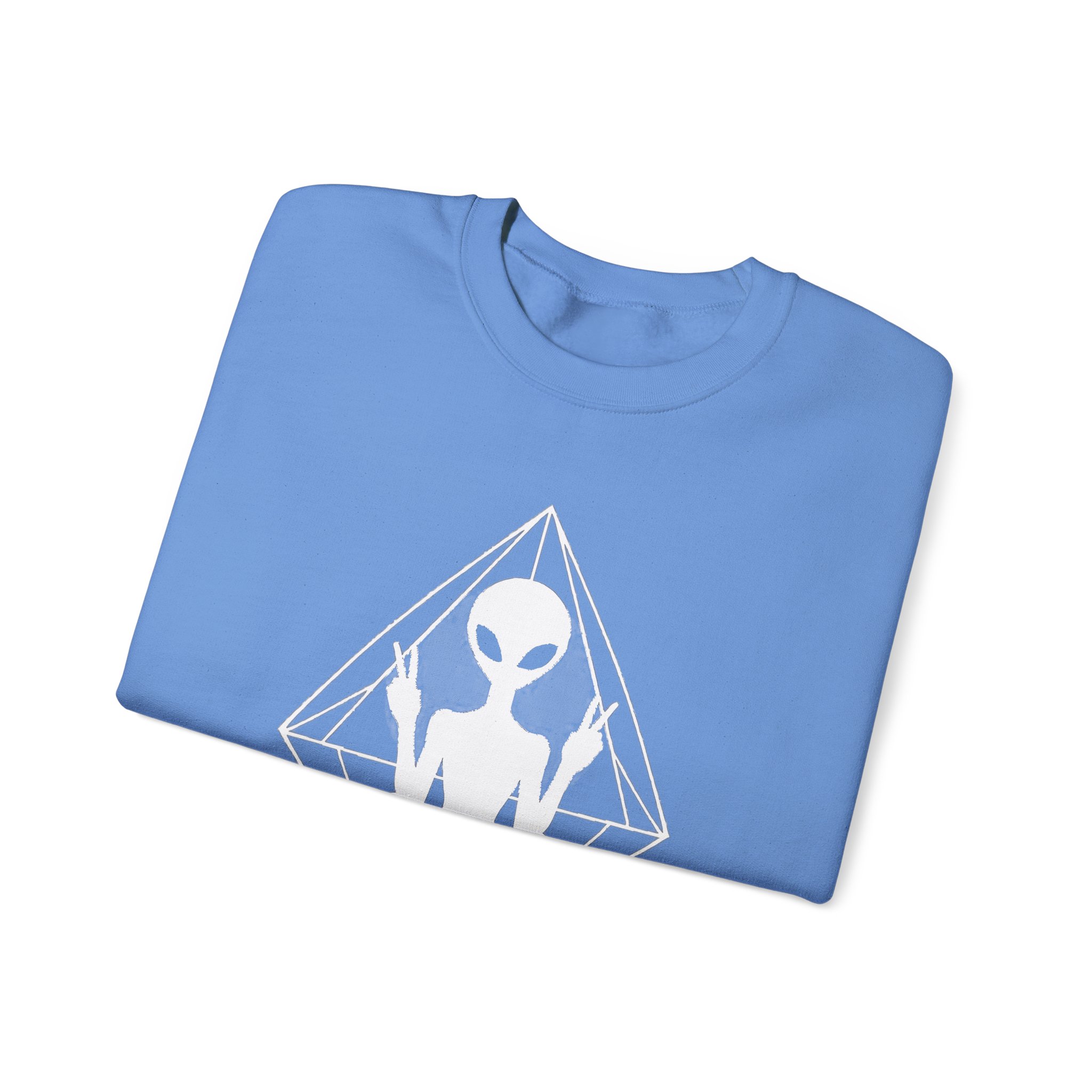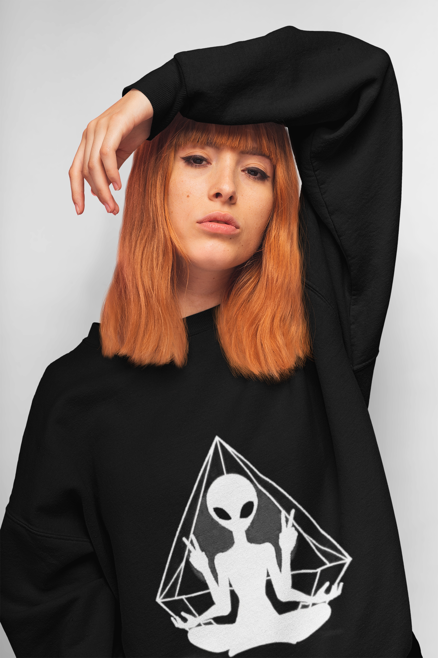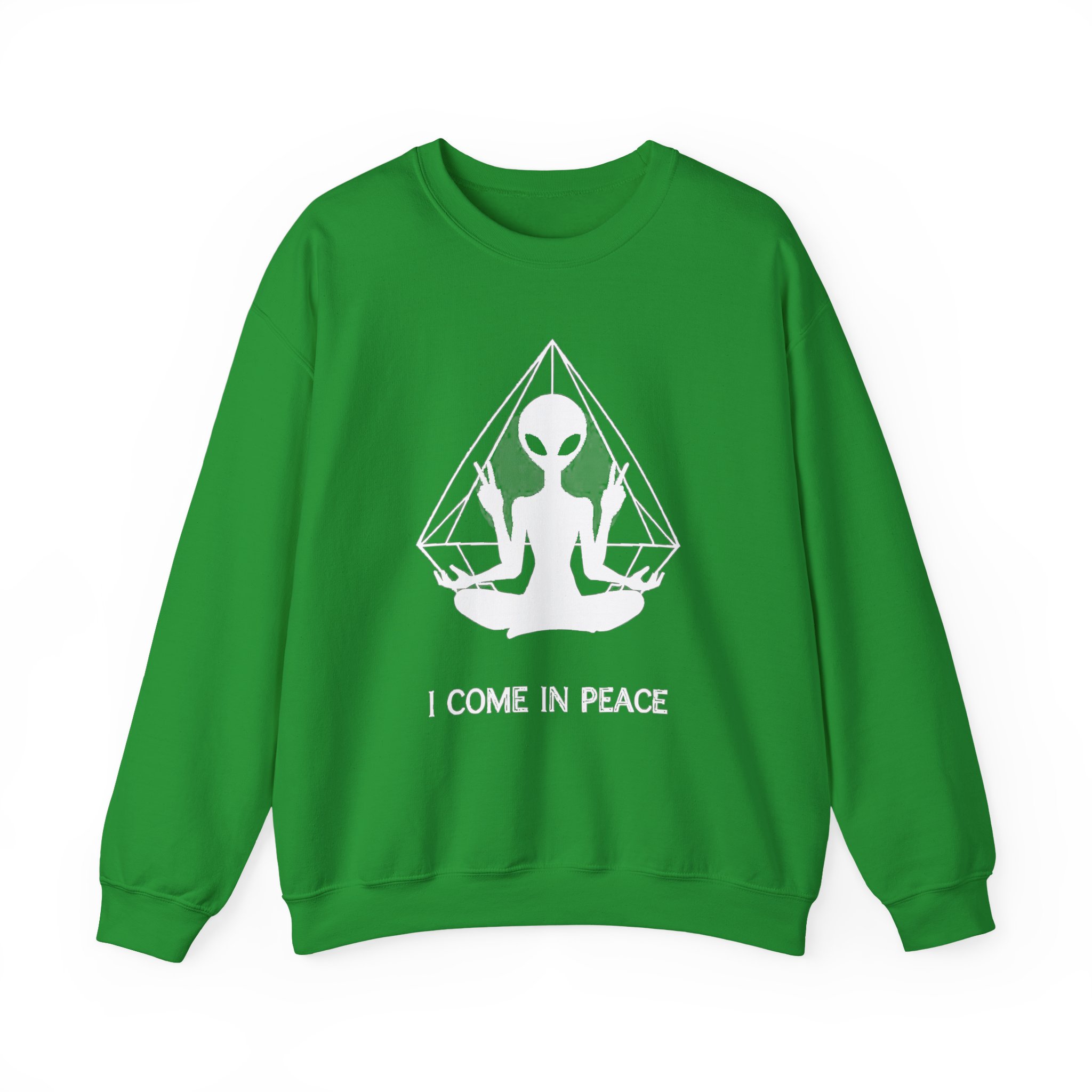 This stylized graphic depicts a purple silhouetted alien figure sitting in a meditative lotus position within a light pink geometric pyramid frame. The alien has distinctive large, almond-shaped eyes and is making peace signs with both hands while maintaining a calm, seated posture. The background is a soft yellow-beige color that provides warm contrast to the deep purple alien shape. At the bottom of the image, text reads “I COME IN PEACE” in capital letters, reinforcing the peaceful and non-threatening message of the illustration. The design combines minimalist graphic elements with a playful, contemporary artistic style that blends spiritual imagery with pop culture extraterrestrial iconography.